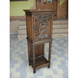 Красива, антикварна, деревяна тумбочка- бар Генрі. Тумбочка виготовлена з масиву натурального дерева, темний дуб, масив, має одну дверку та одну відкриту полицю. Тумба декорована елементами різьби та елементами кованого металу, в хорошому стані, привезена з Бельгії.