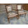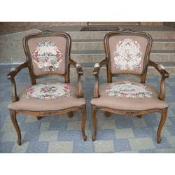 Комплект красивих крісел з підлокотниками в стилі Луї XV, в комплекті дві штуки. Крісла виготовлені з натурального дерева, темний дуб, масив, щедро декоровані елементами різьби ручної роботи, обшиті тканиною світло- коричневого кольору, тканина оздоблена вишивкою ручної роботи та декоративними цвяшками. Крісла великі і масивні, дуже зручні та комфортні, в хорошому стані, привезені з Бельгії.