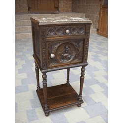 Красива, антикварна, деревяна тумбочка Bretonse. Тумбочка виготовлена з масиву натурального дерева, темний дуб, масив, має одну дверку, одну шухляду та одну відкриту полицю, столешня тумбочки виложена натуральним каменем-мармур коричневого кольору. Тумба щедро декорована елементами різьби та латунними ручками, в хорошому стані, привезена з Бельгії.