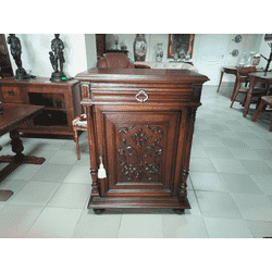 Велика, старовинна, антикварна, деревяна тумба. Тумба виготовлена з масиву натурального дерева, темний дуб, має одну дверку та одну шухляду, всередині є деревяна полиця. Тумба декорована точеними колонами та різьбою ручної роботи, різьба у вигдяді квітів і завитків. Тумба в хорошому стані, привезена з Бельгії.