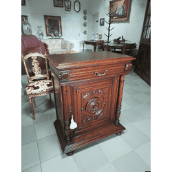 Велика, старовинна, антикварна, деревяна тумба. Тумба виготовлена з масиву натурального дерева, темний дуб, має одну дверку та одну шухляду, всередині є деревяна полиця. Тумба декорована точеними колонами та різьбою ручної роботи, різьба у вигдяді квітів і завитків. Тумба в хорошому стані, привезена з Бельгії.