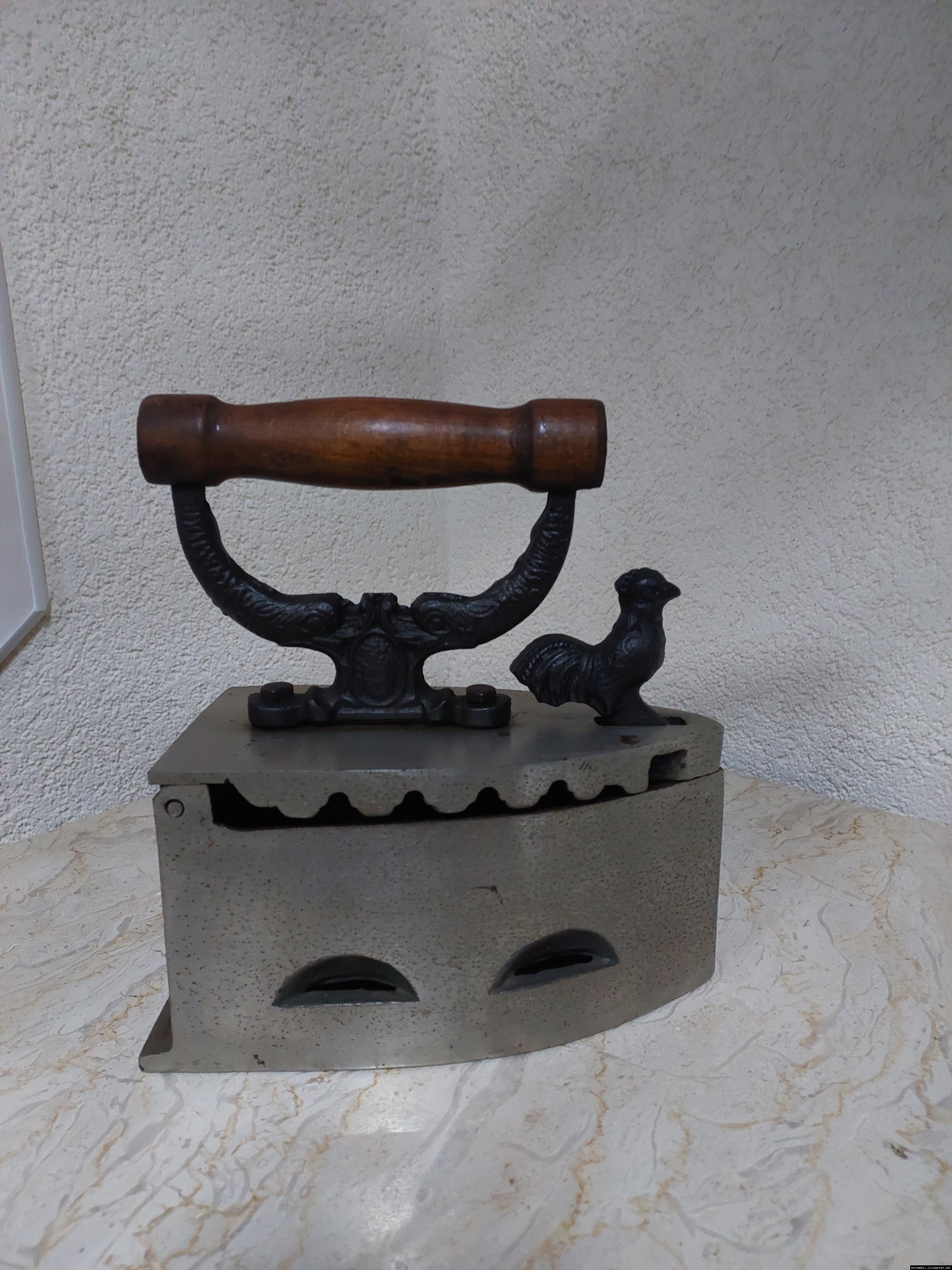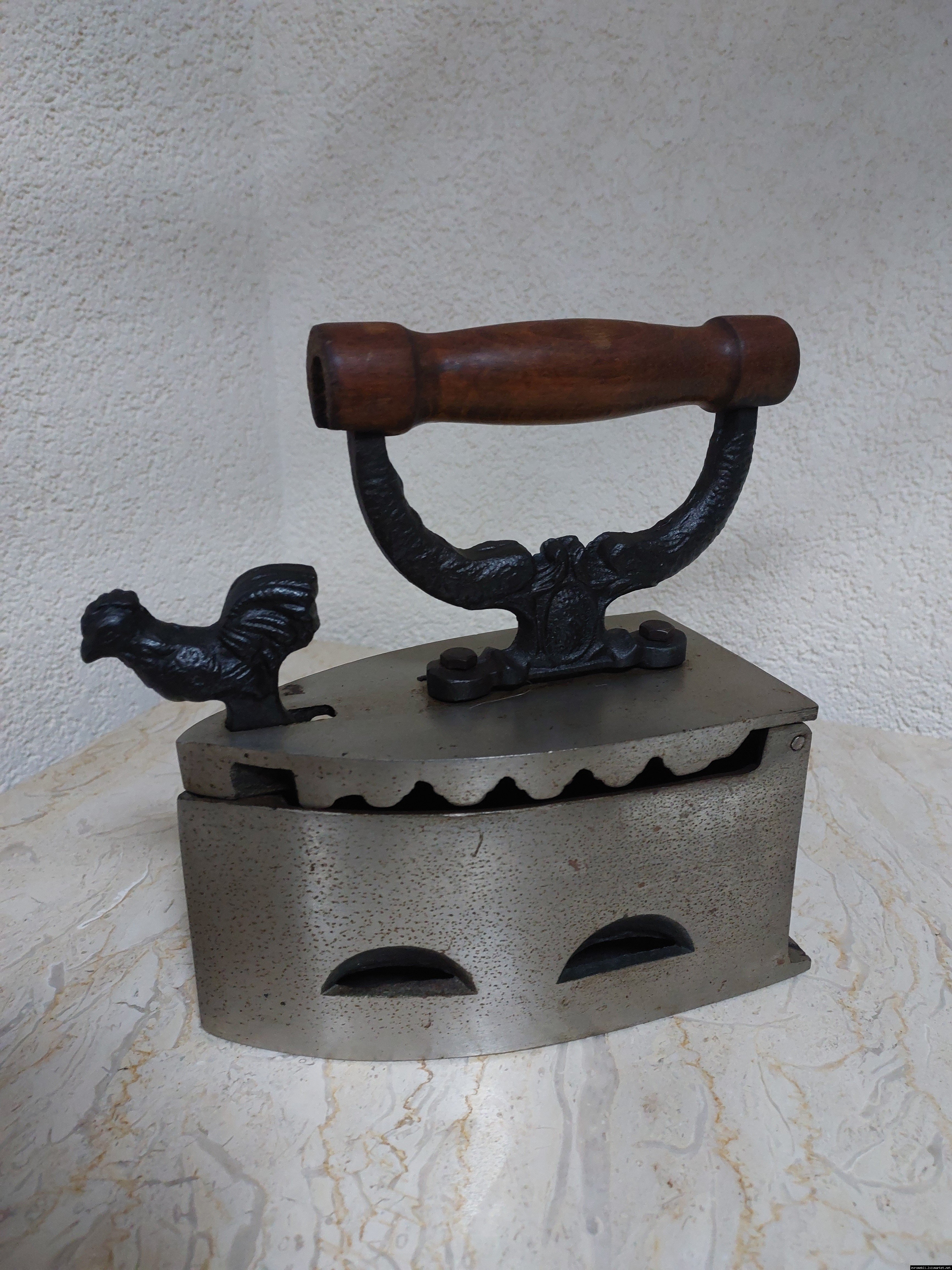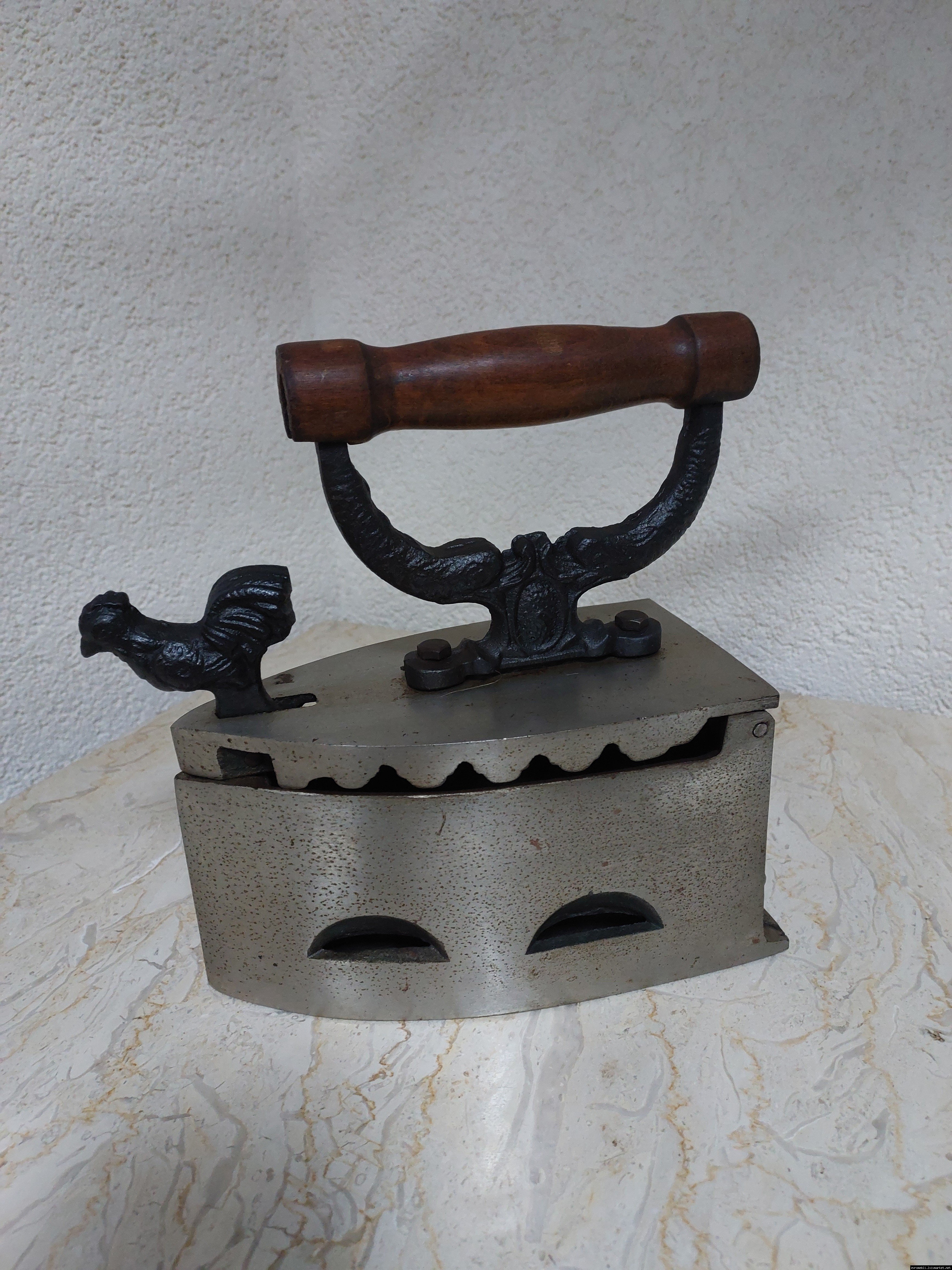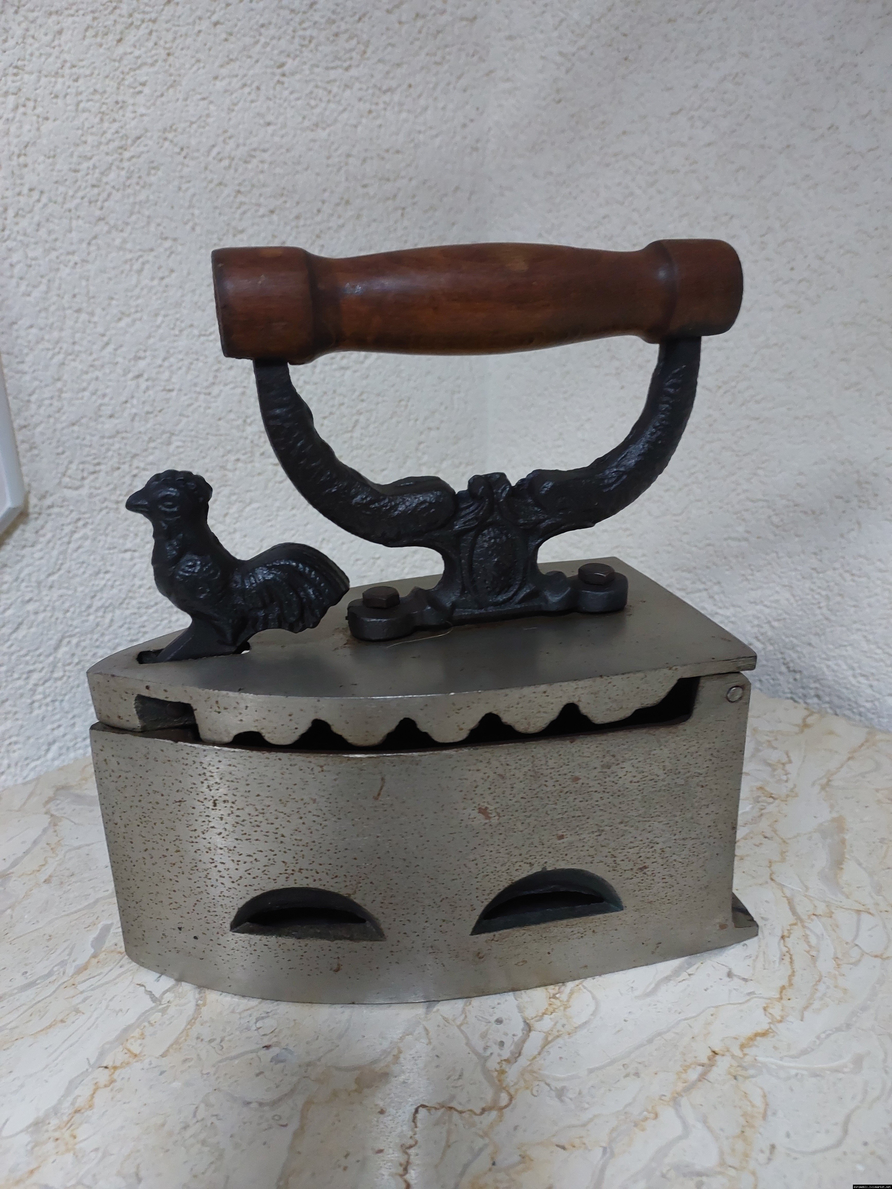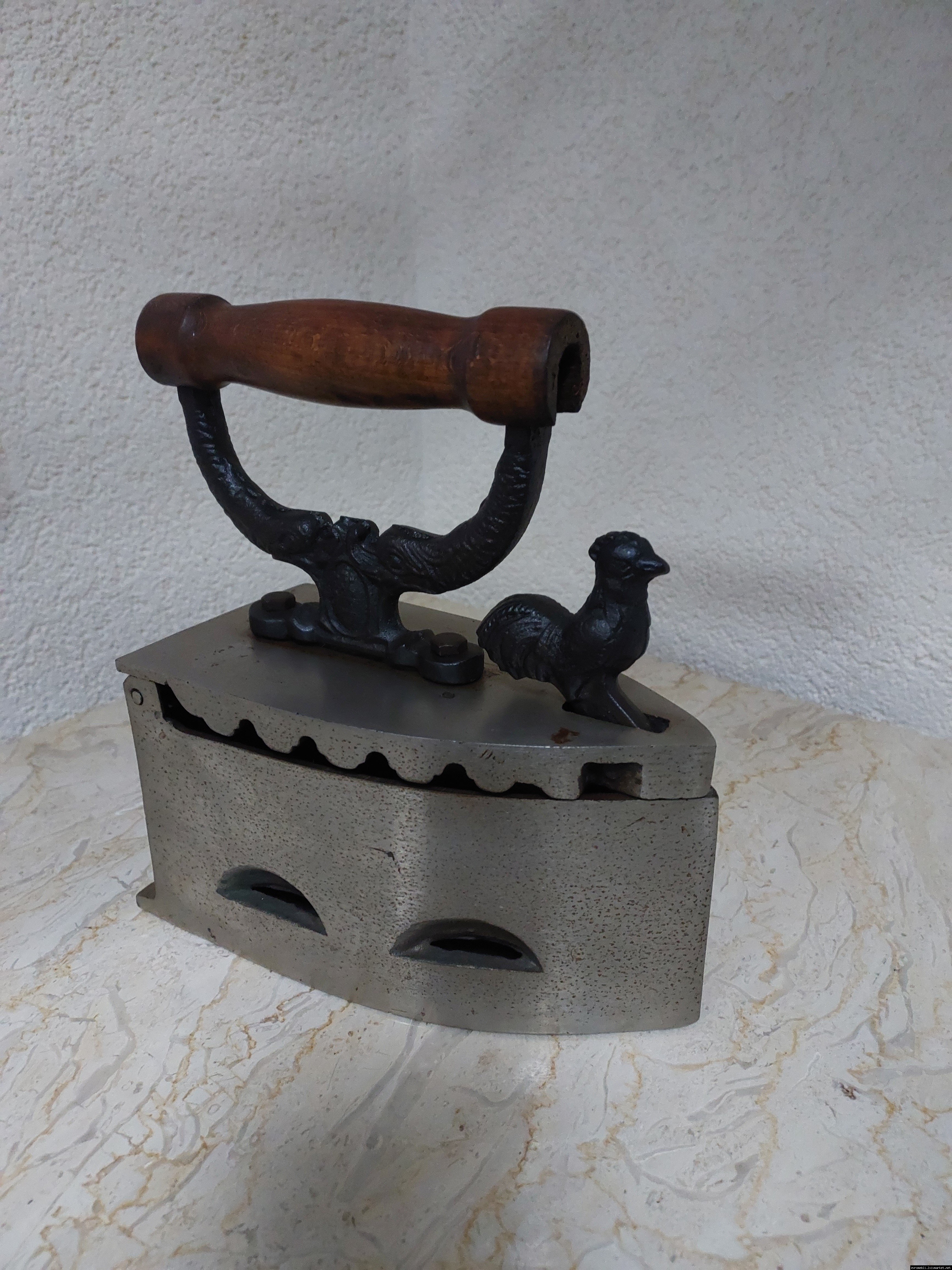 Красива старовинна, антикварна вугільна праска з деревяною ручкою та засувкою у формі півня.