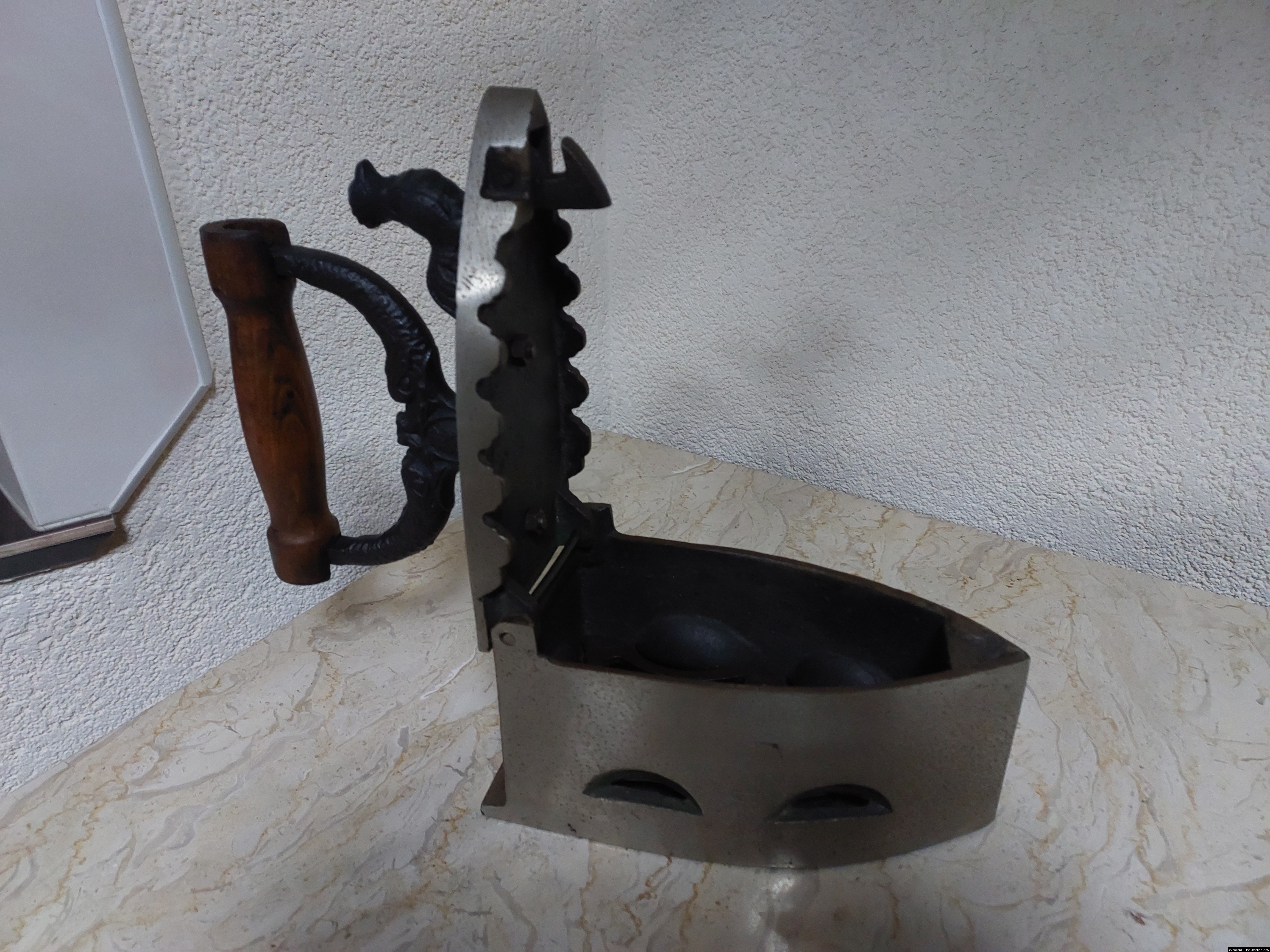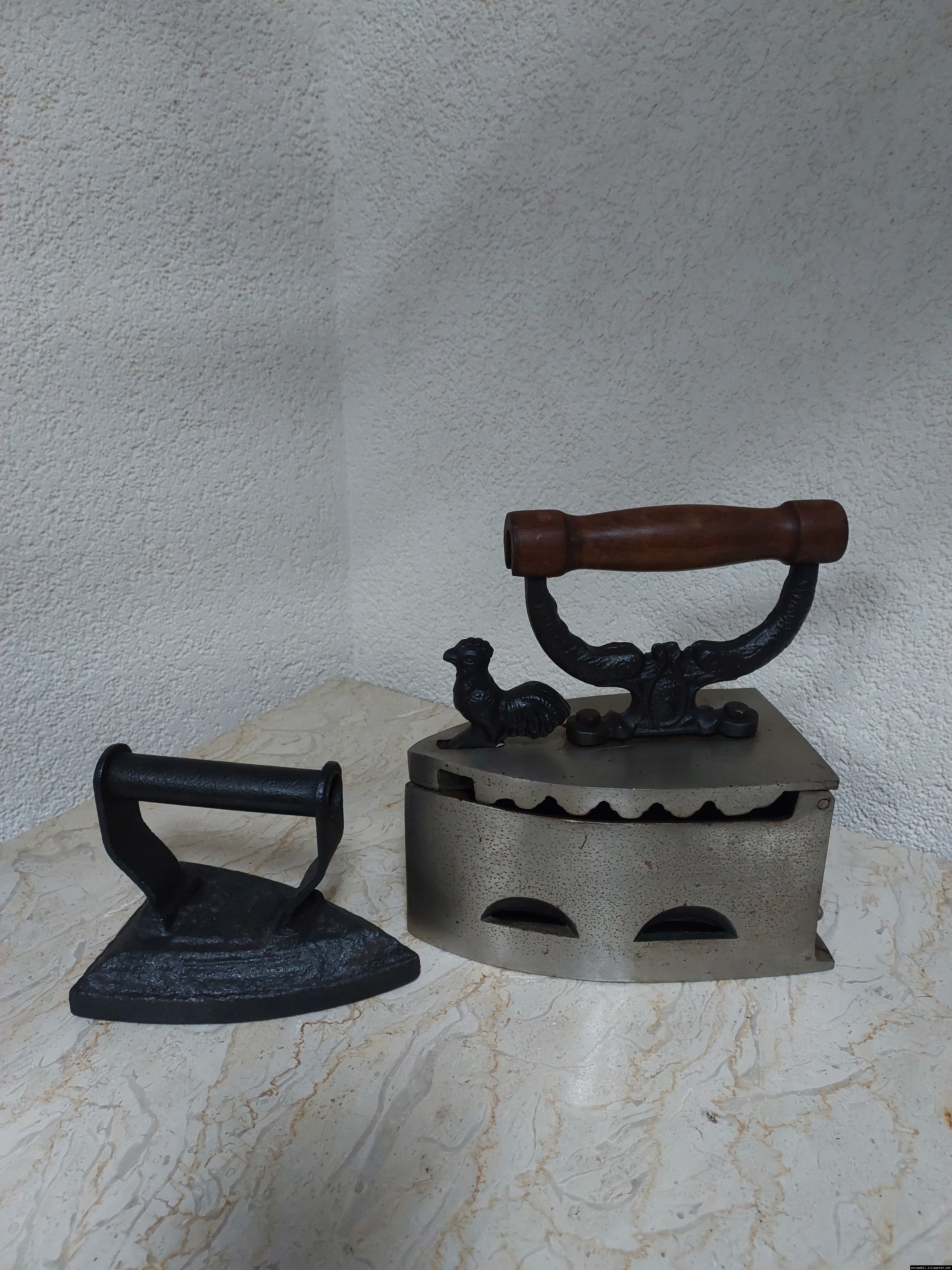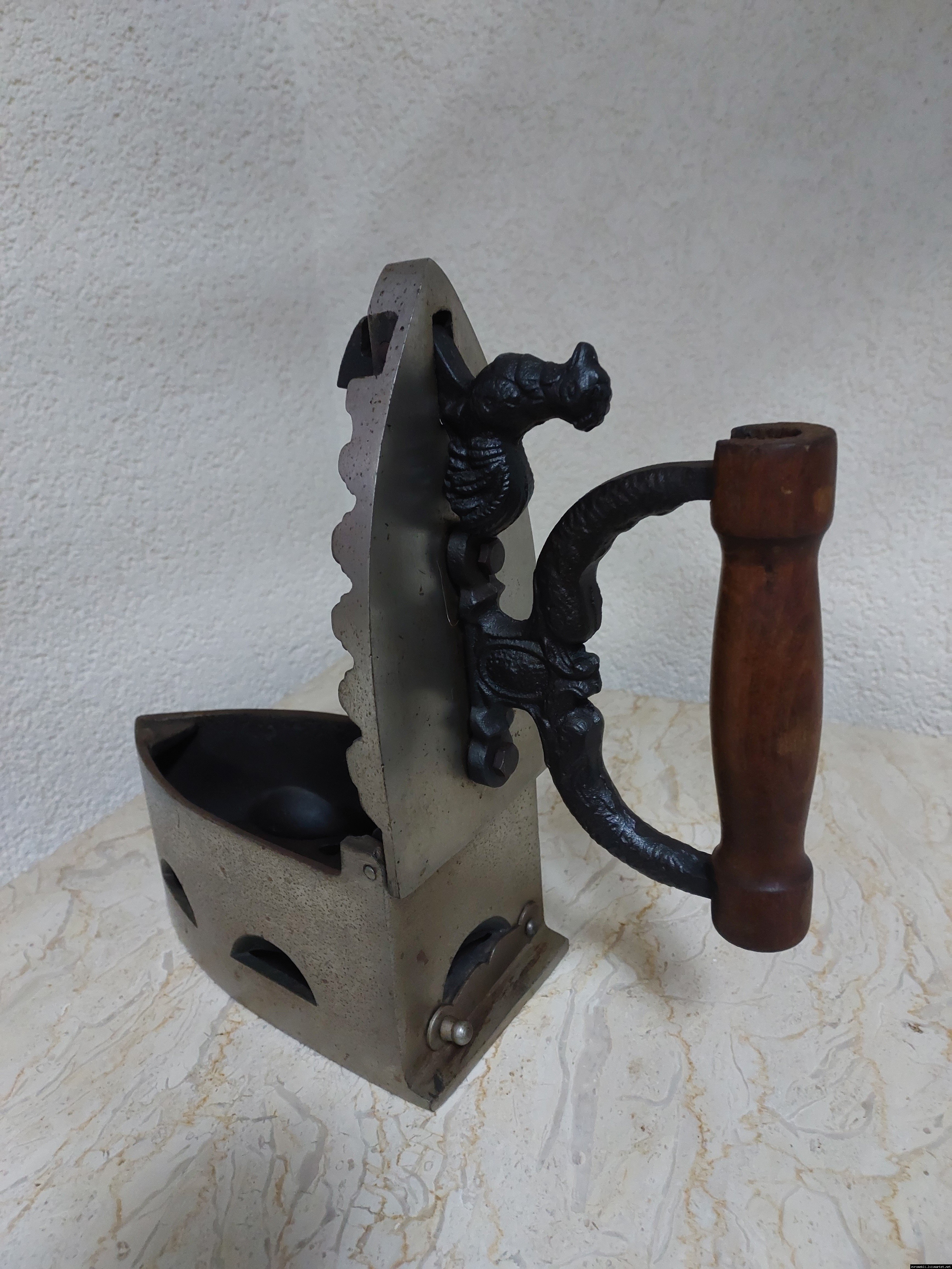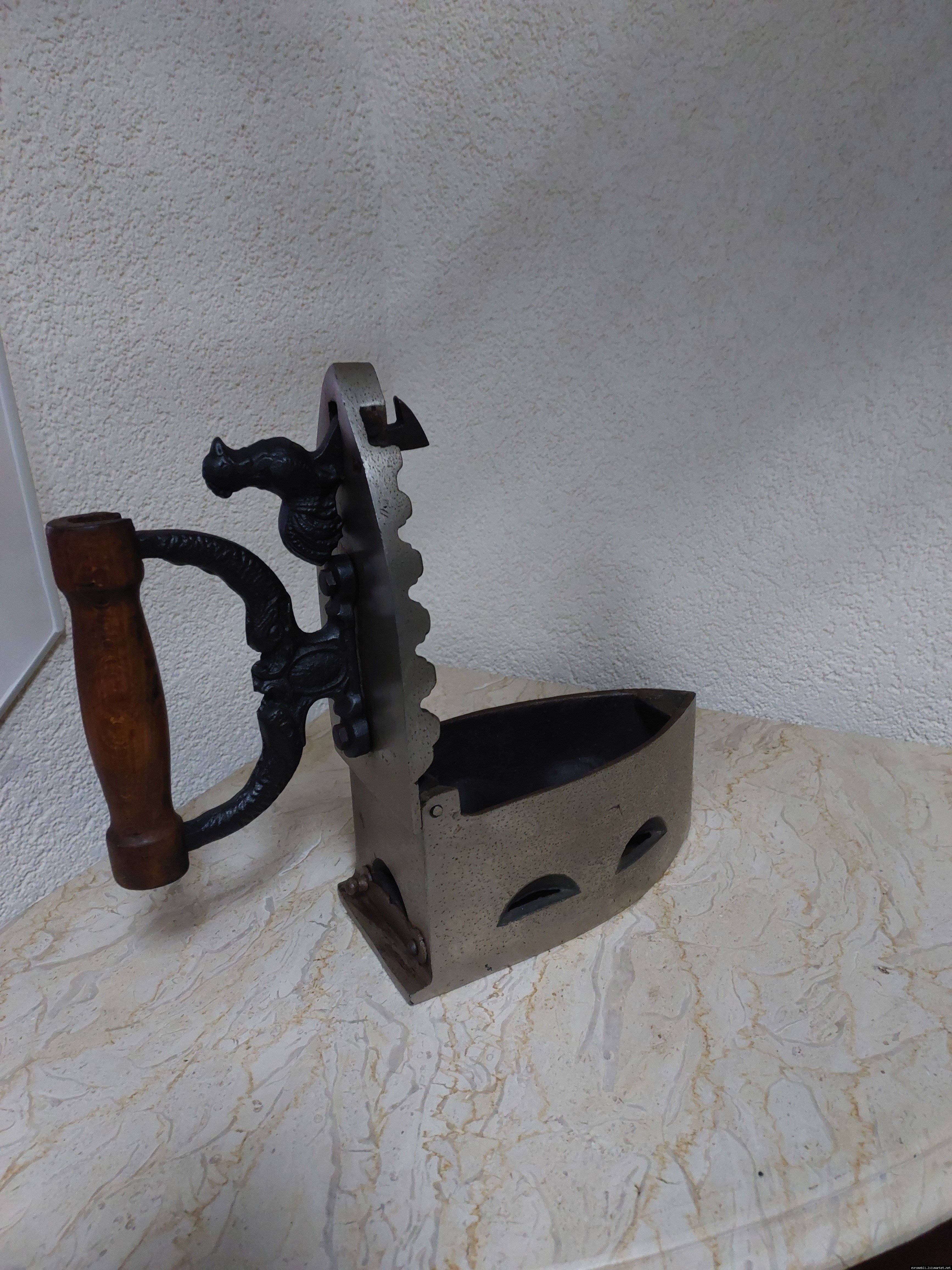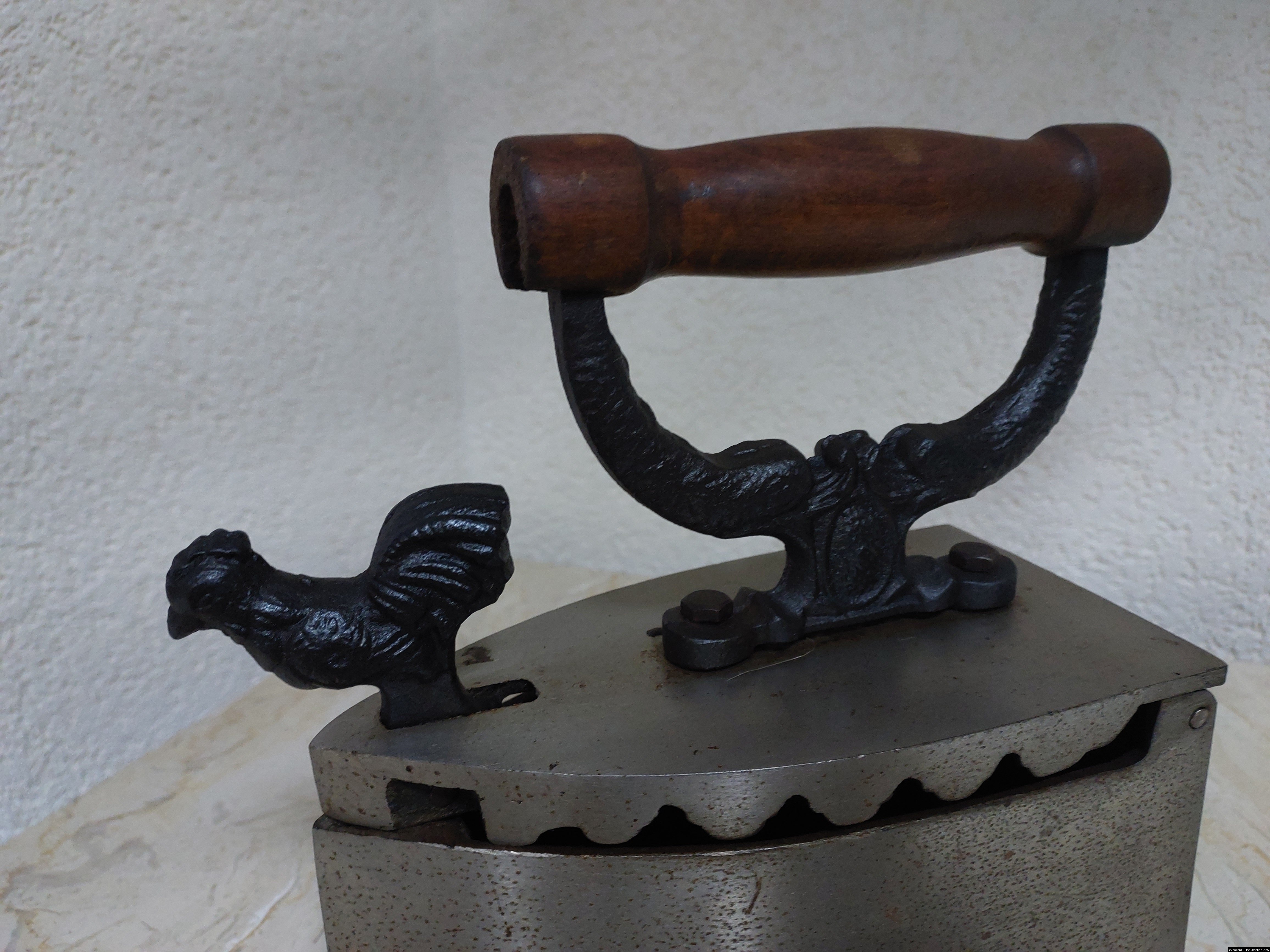 Красива старовинна, антикварна вугільна праска з деревяною ручкою та засувкою у формі півня.