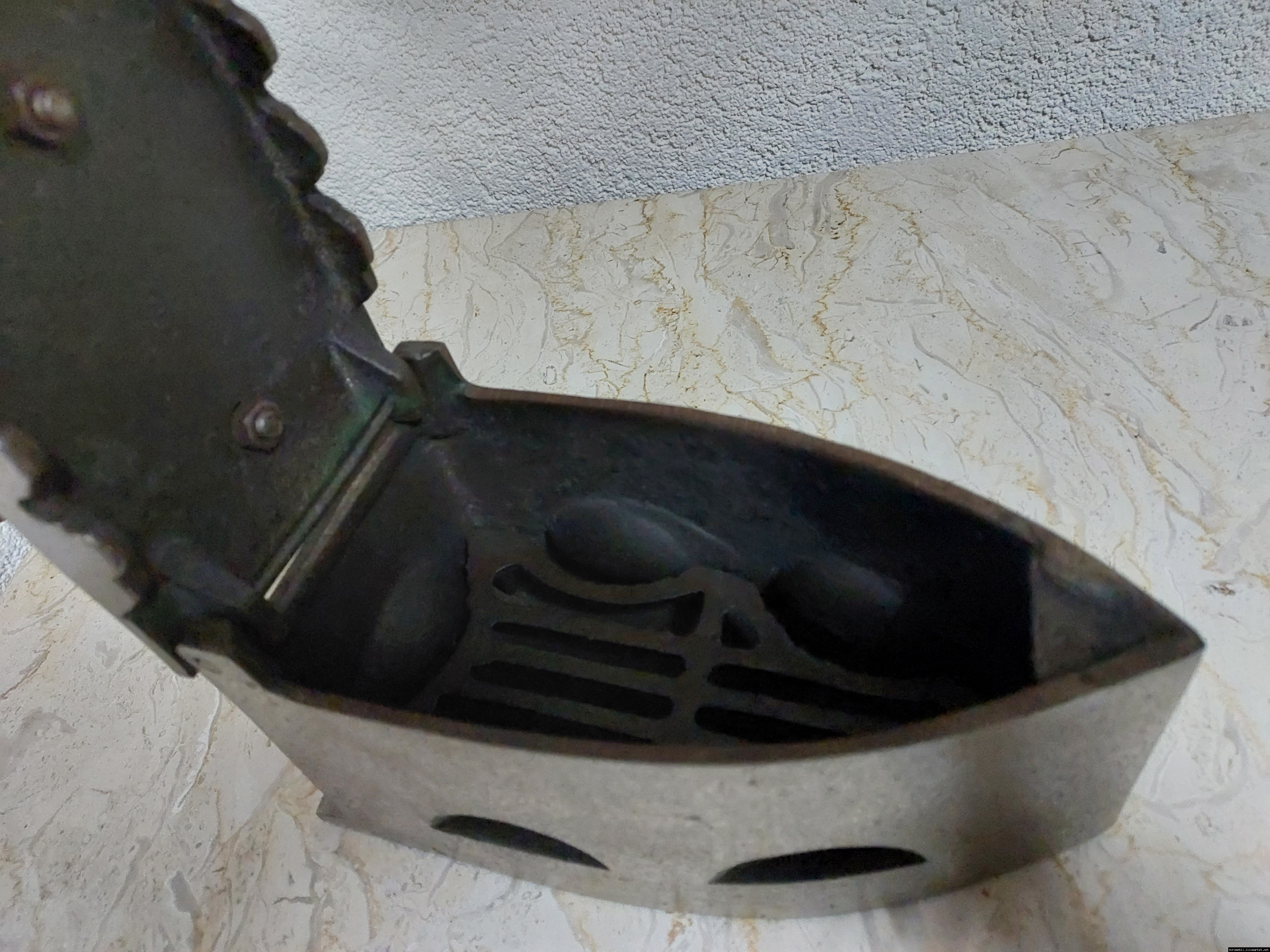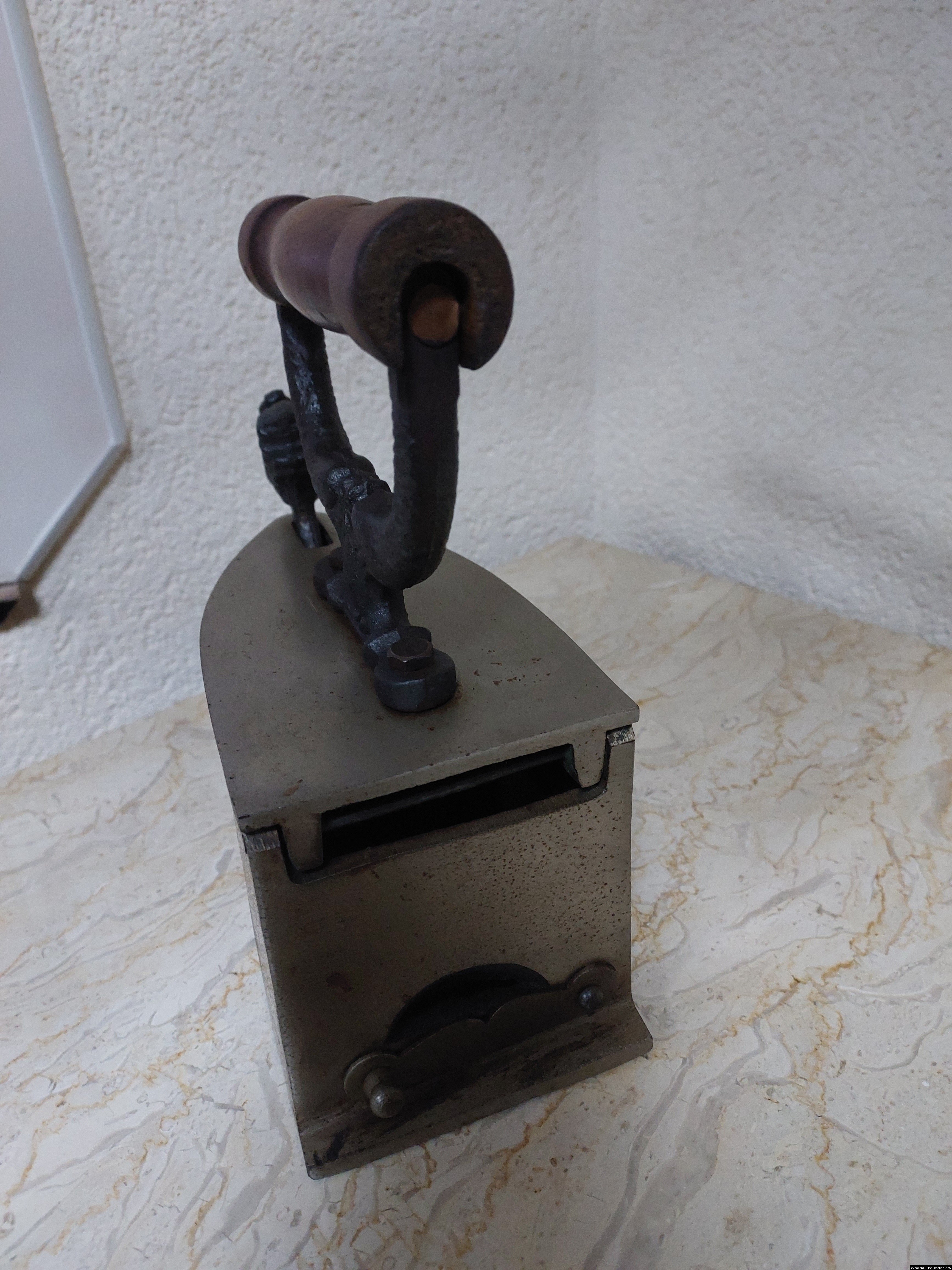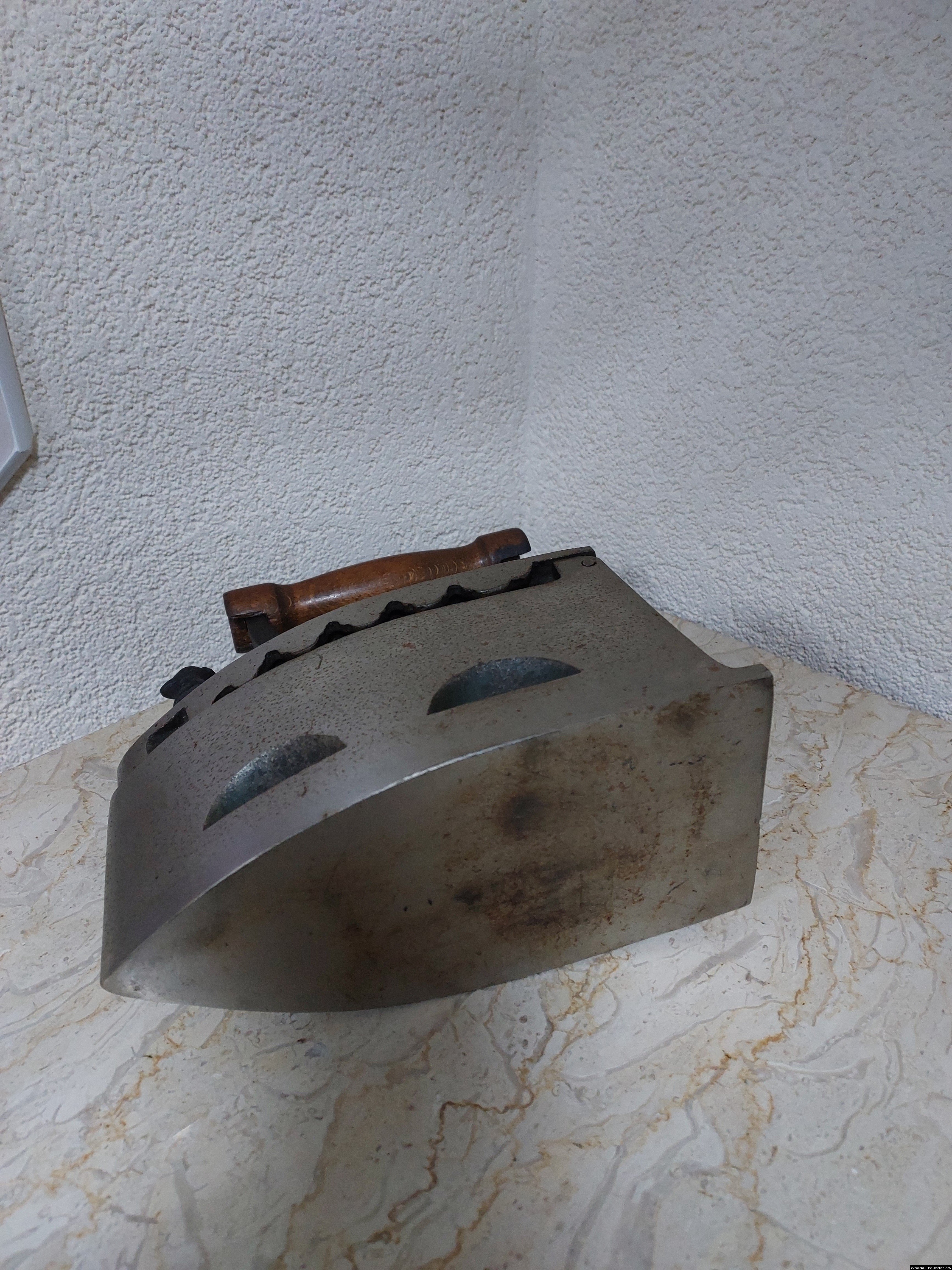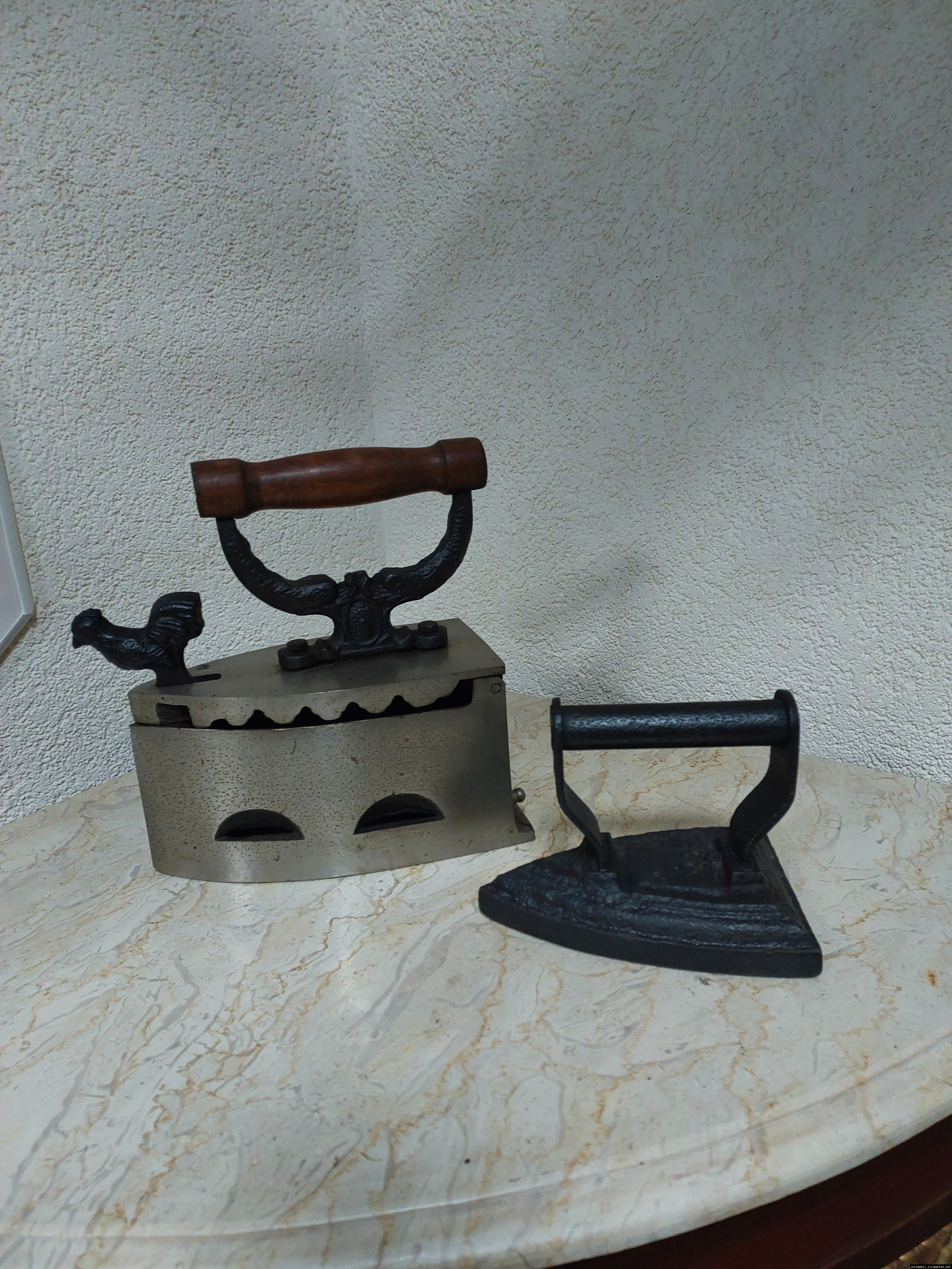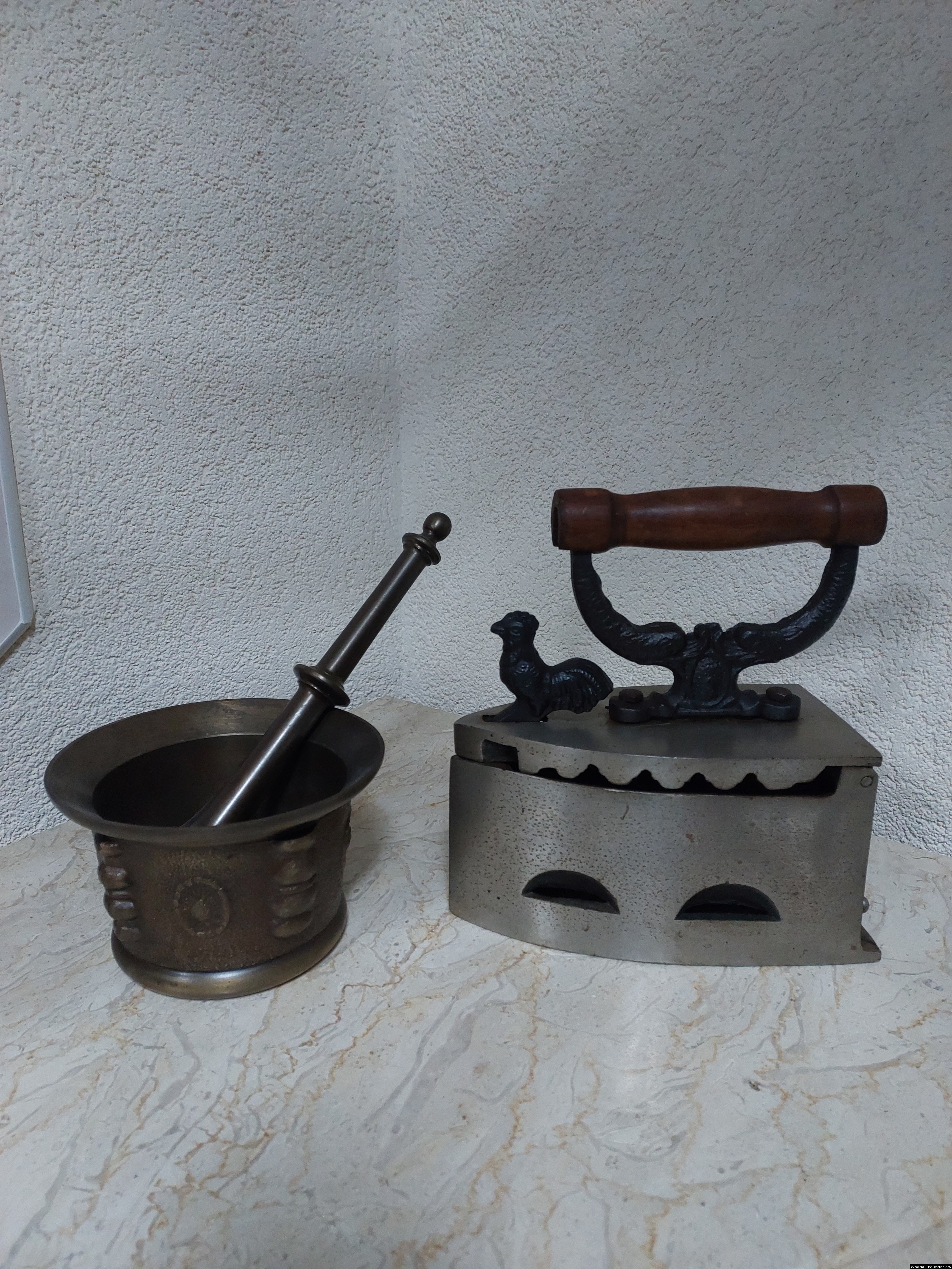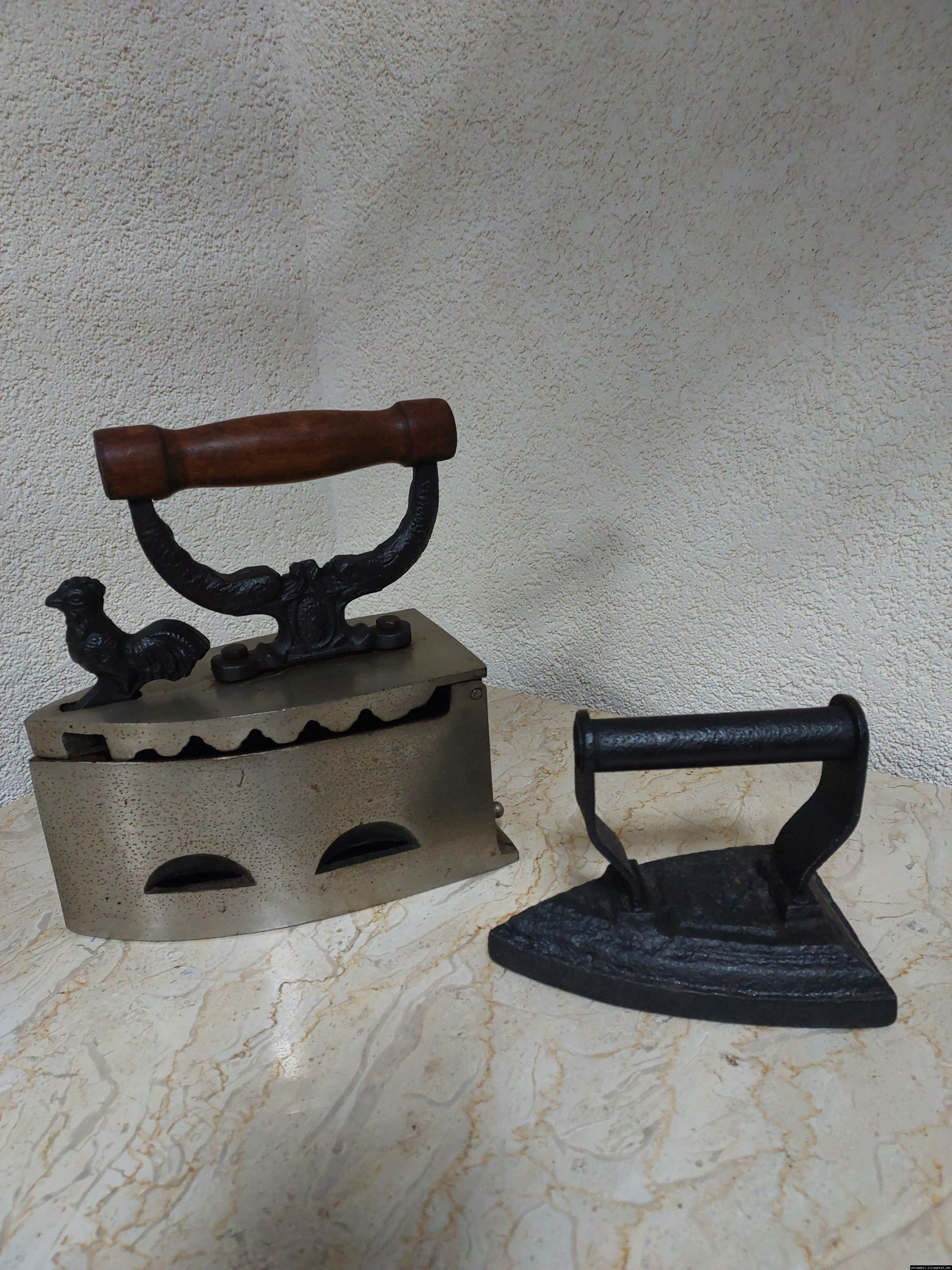 Красива старовинна, антикварна вугільна праска з деревяною ручкою та засувкою у формі півня.