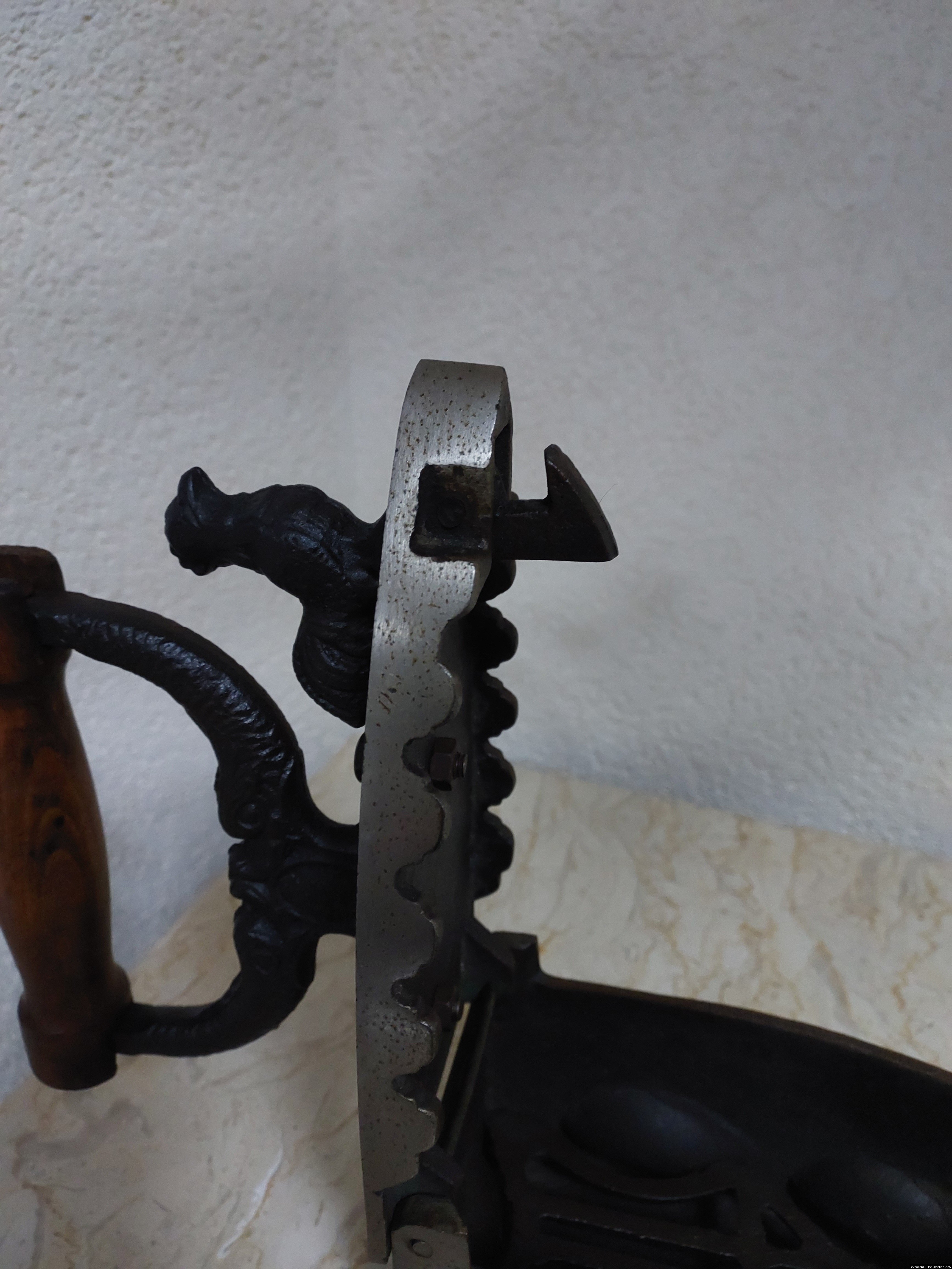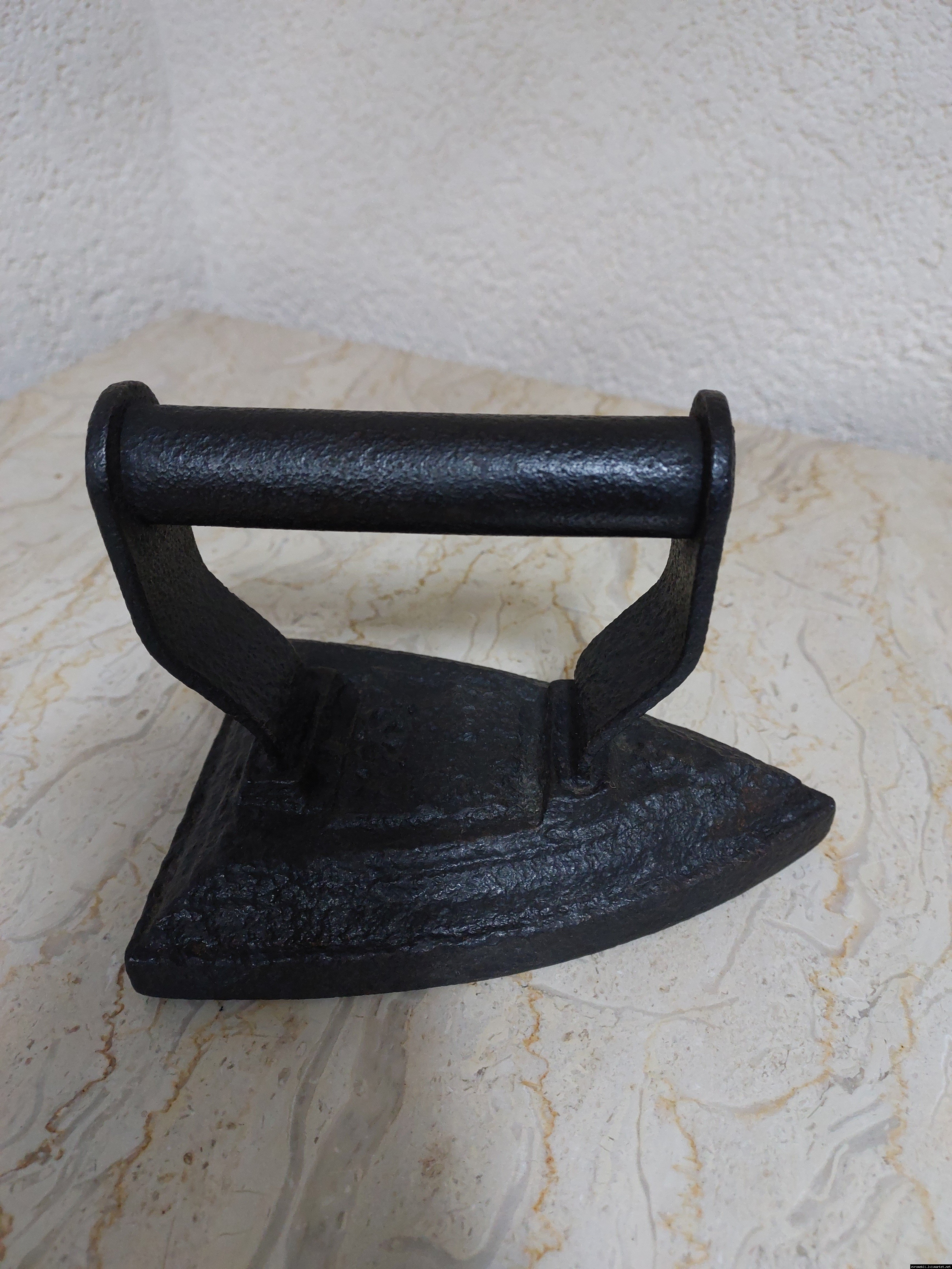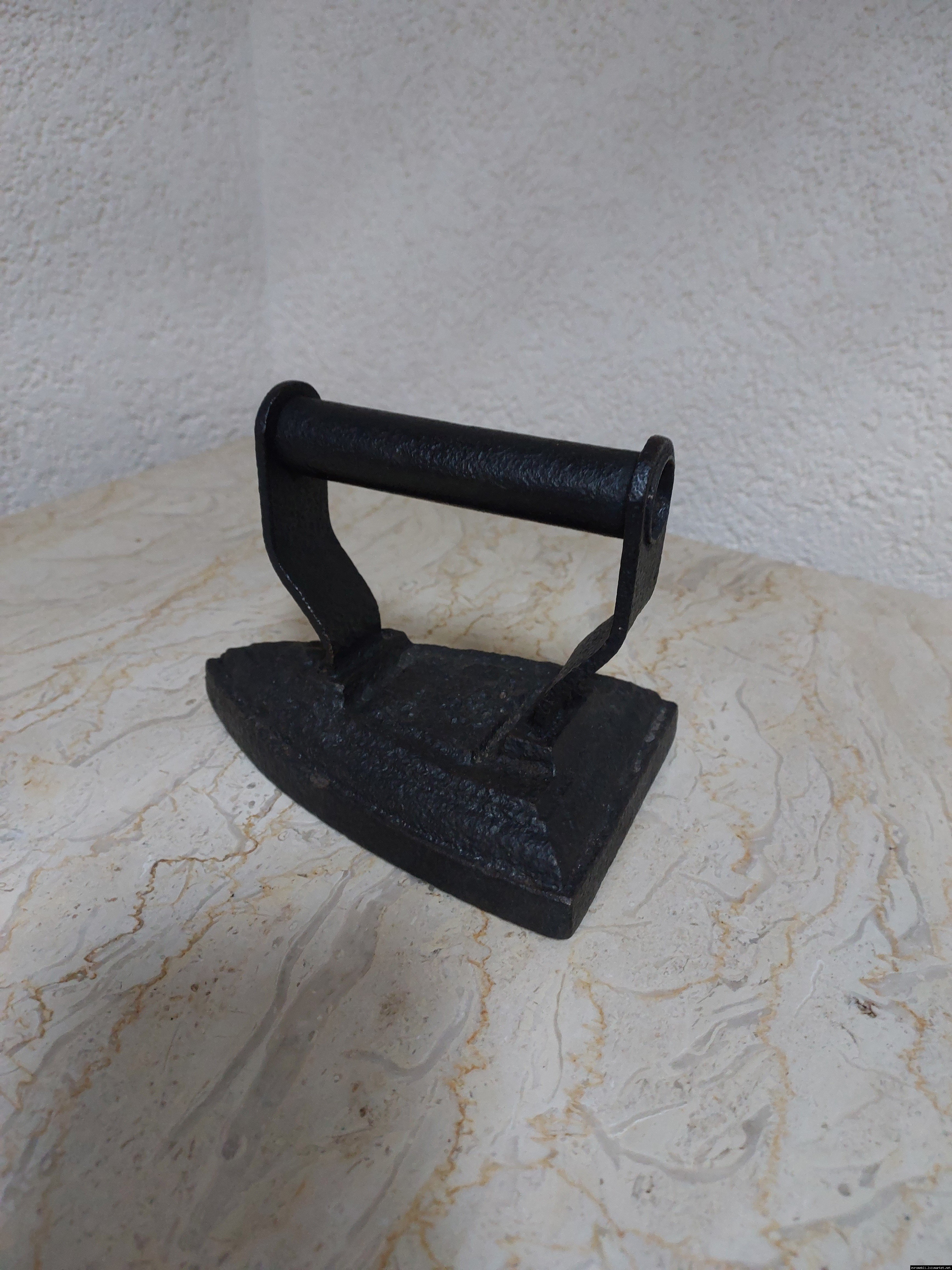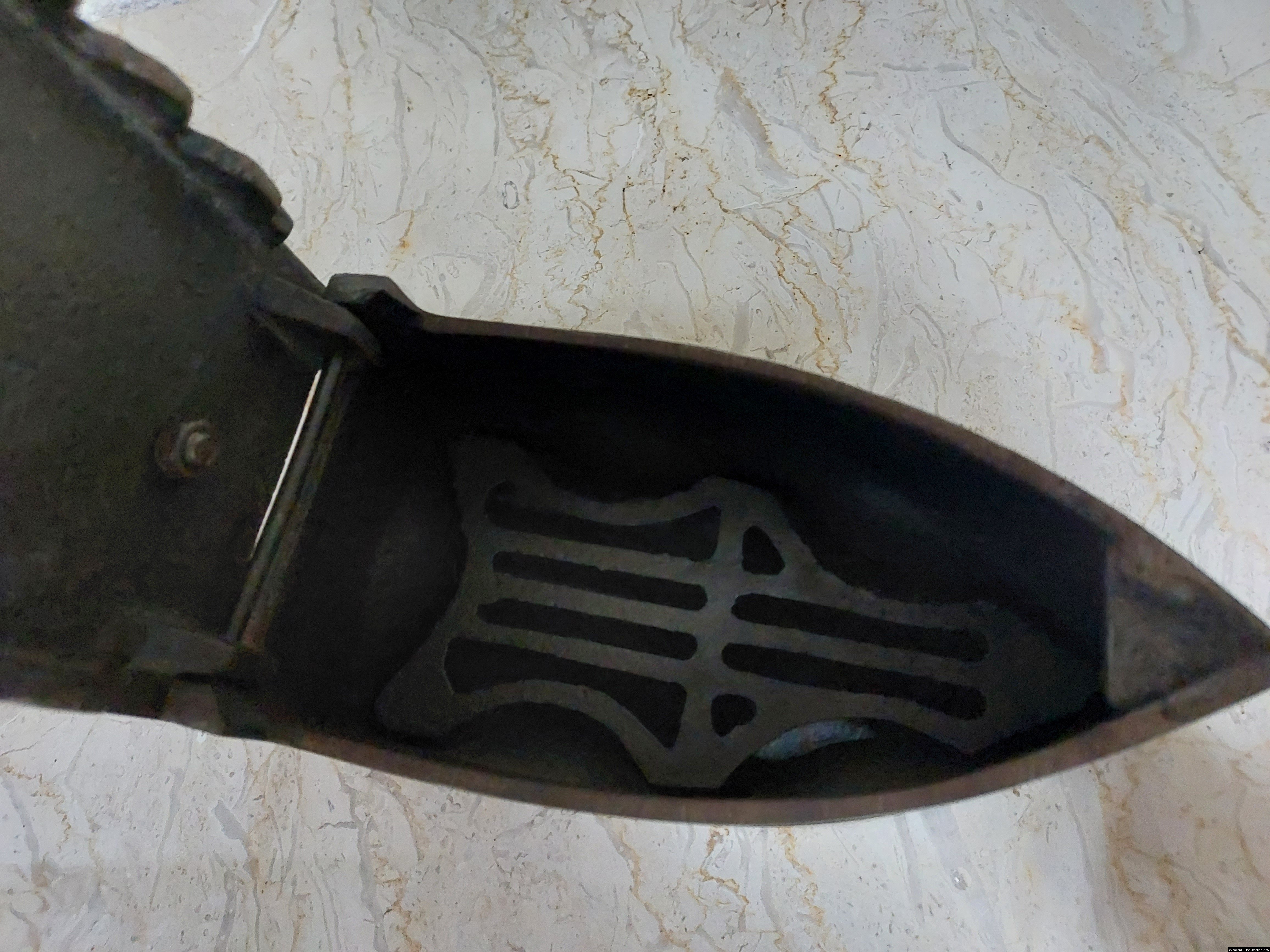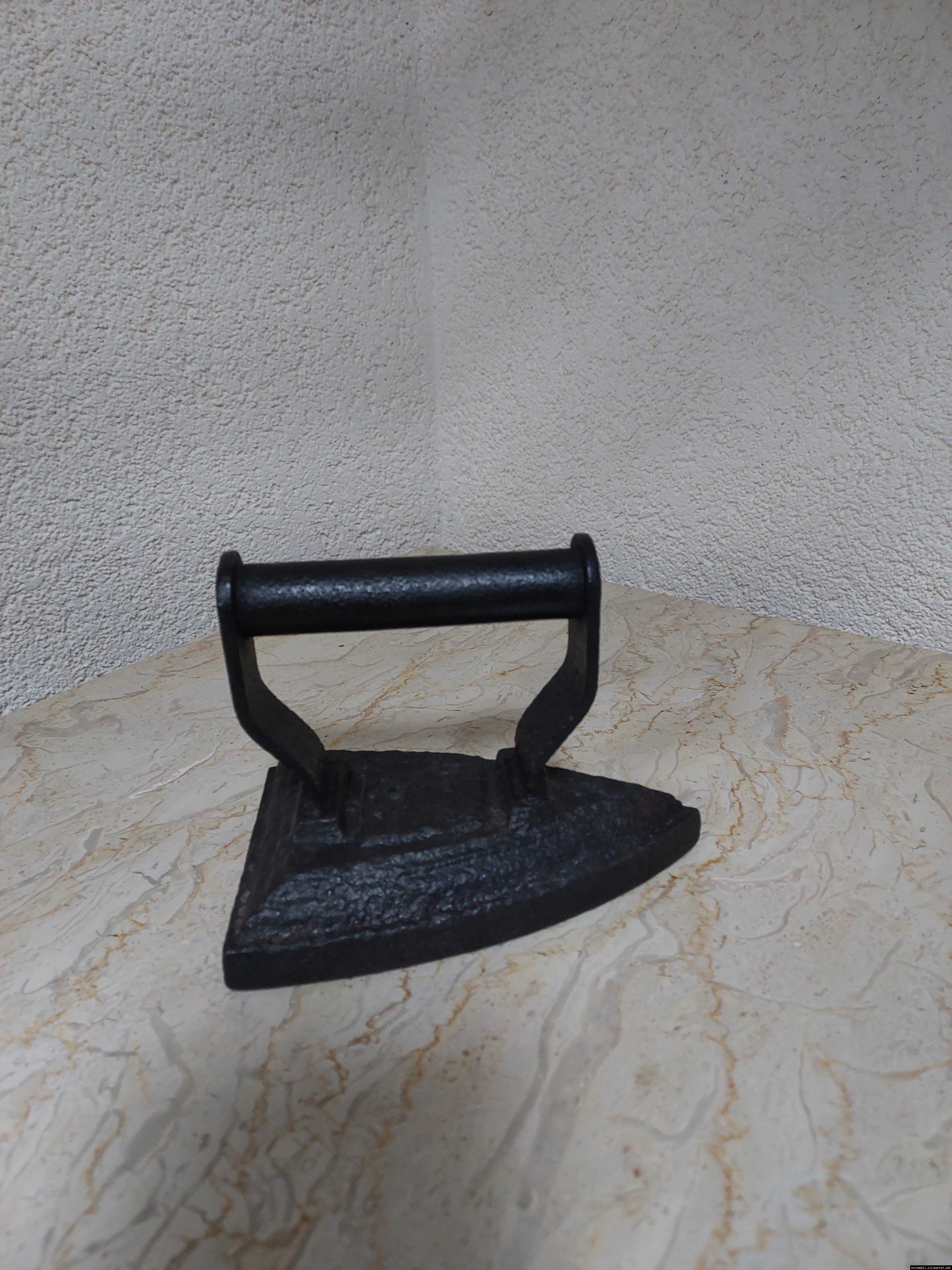 Красива старовинна, антикварна вугільна праска з деревяною ручкою та засувкою у формі півня.