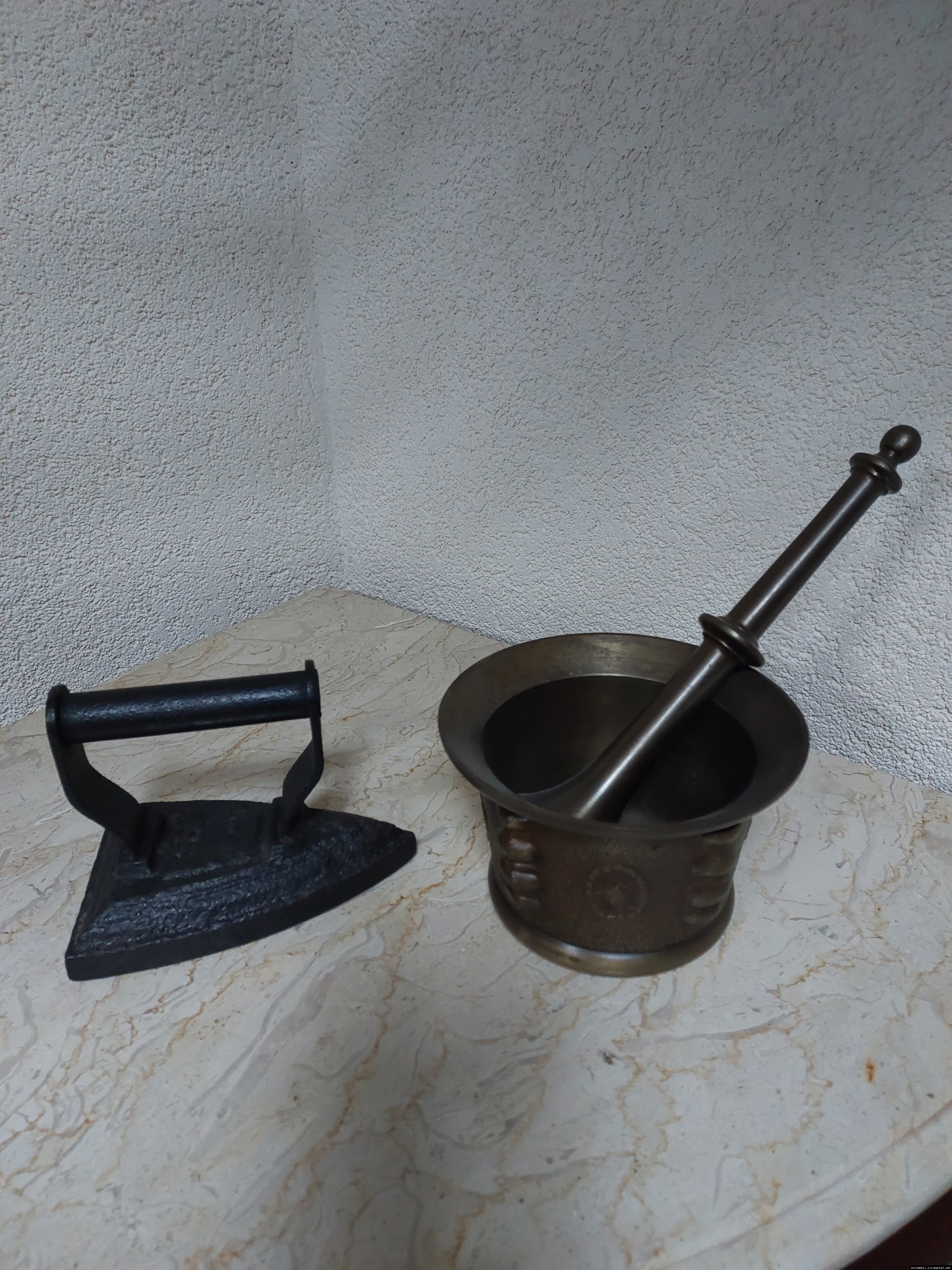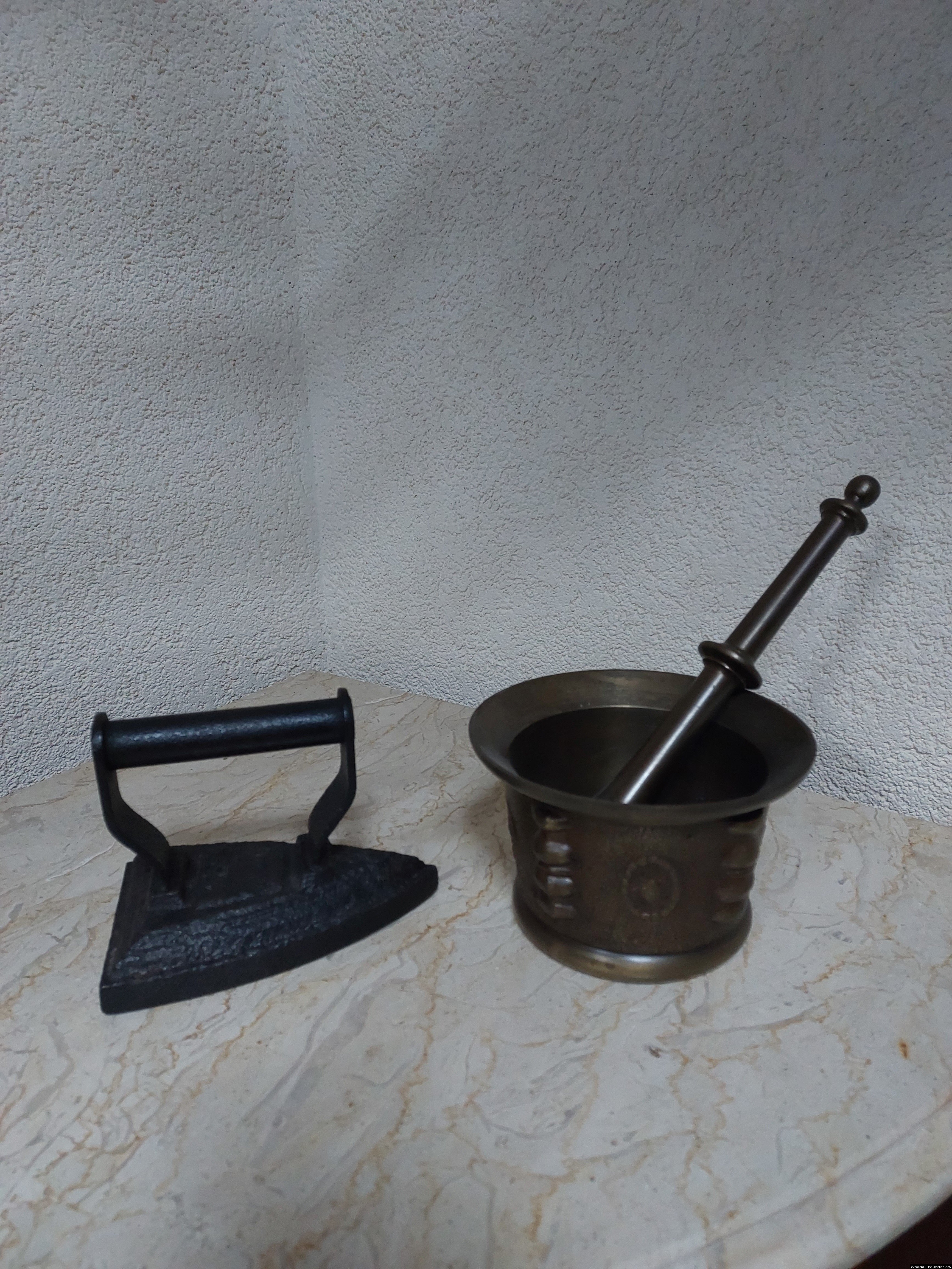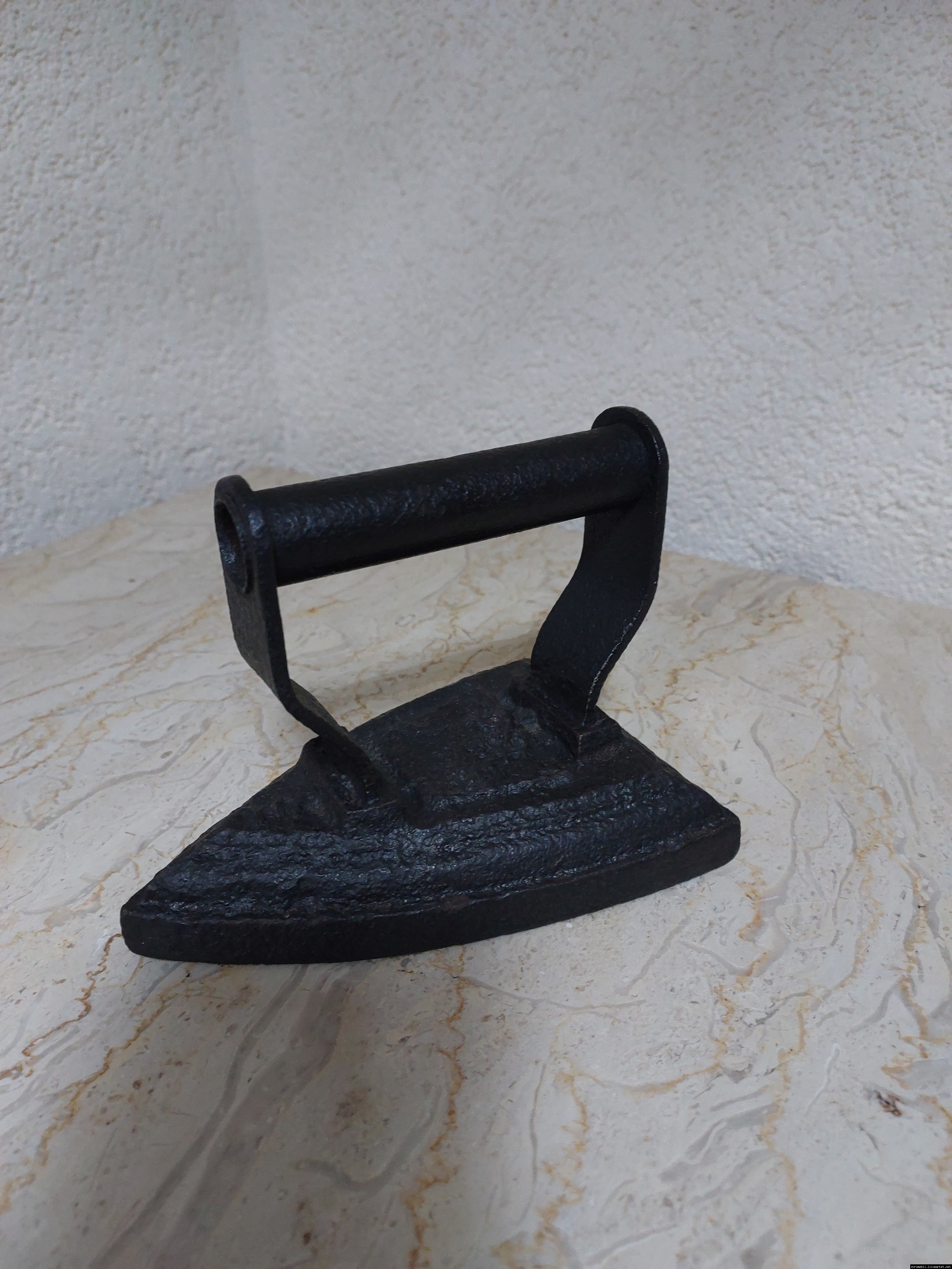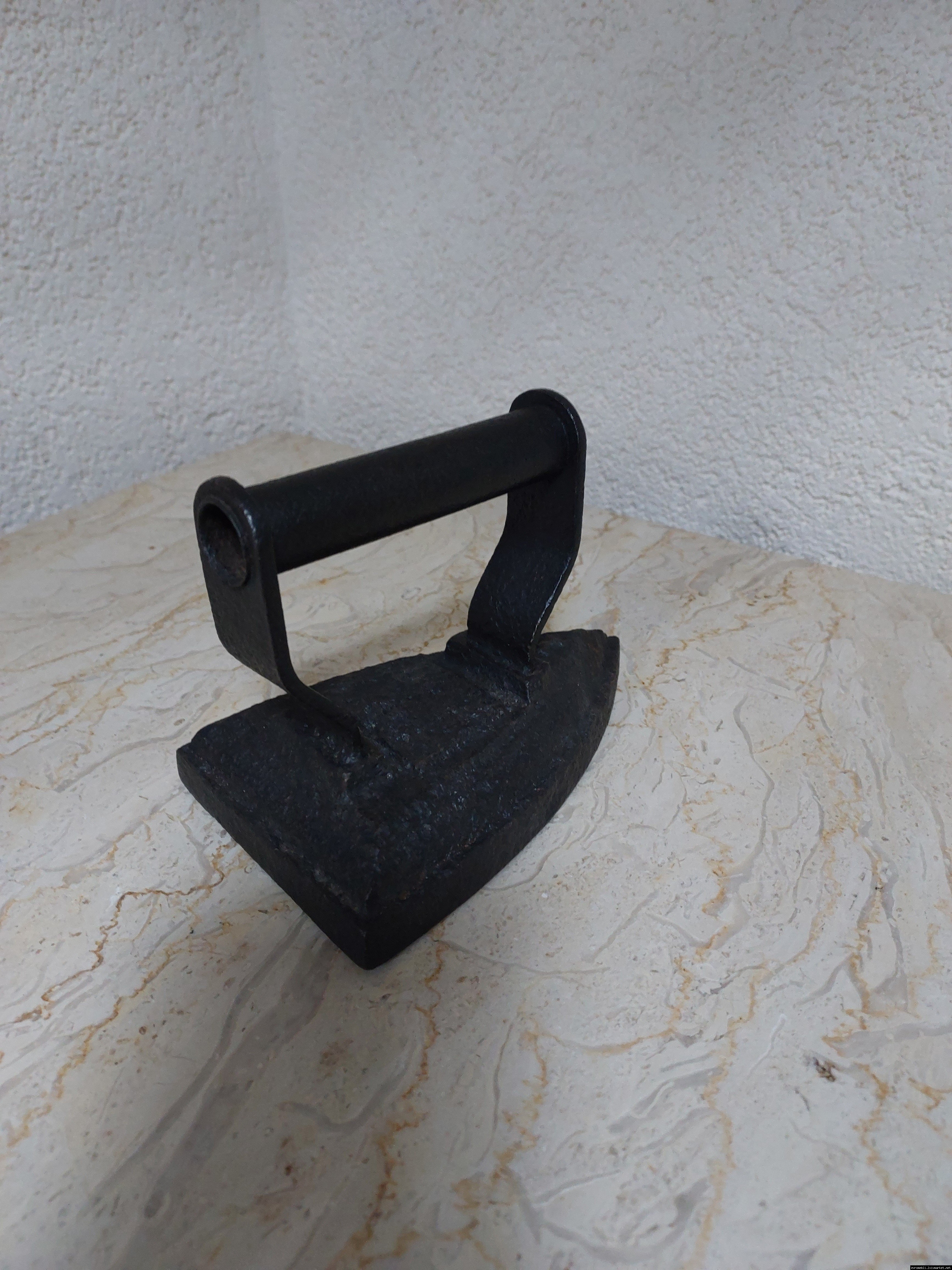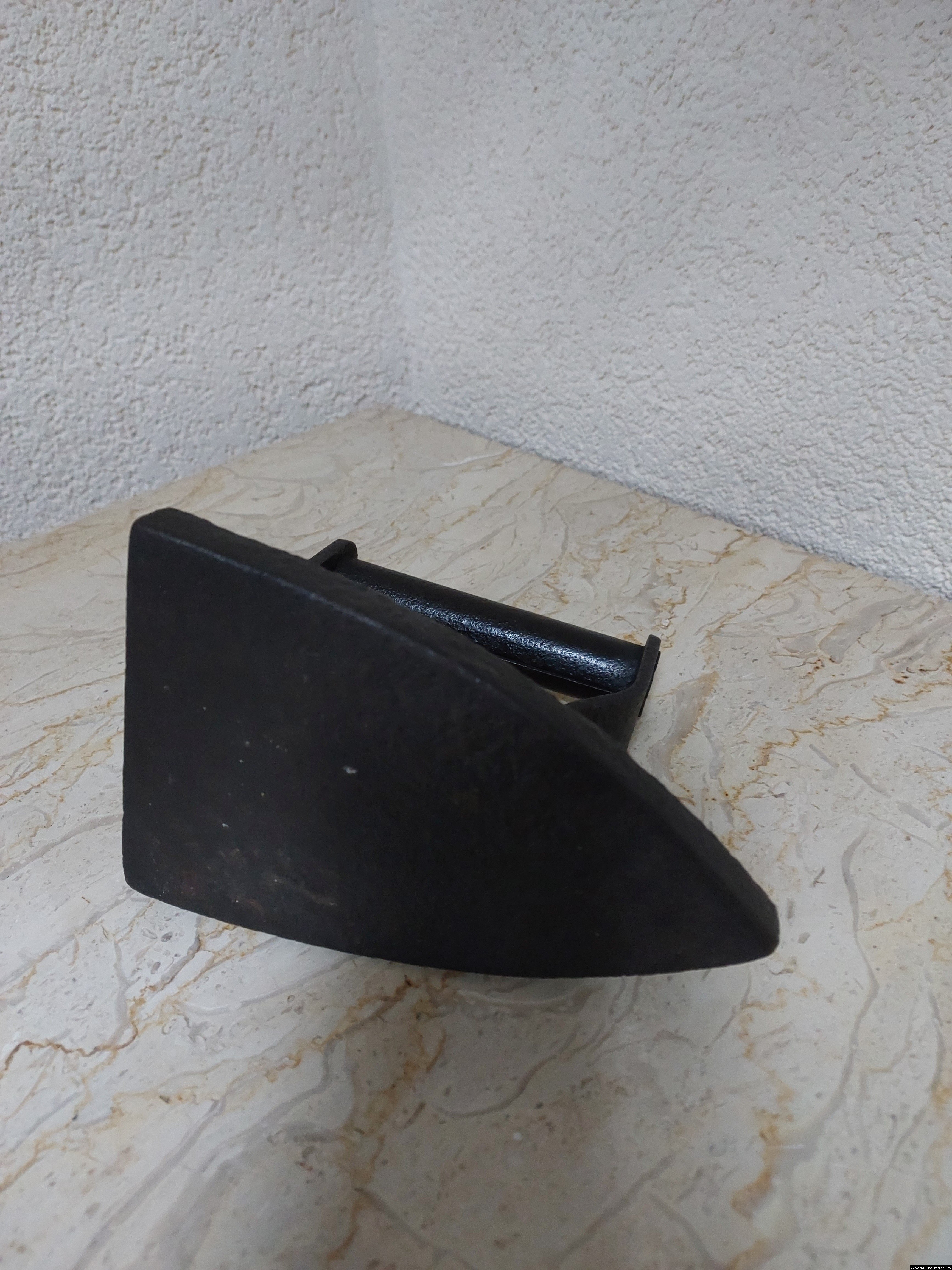 Красива старовинна, антикварна вугільна праска з деревяною ручкою та засувкою у формі півня.
