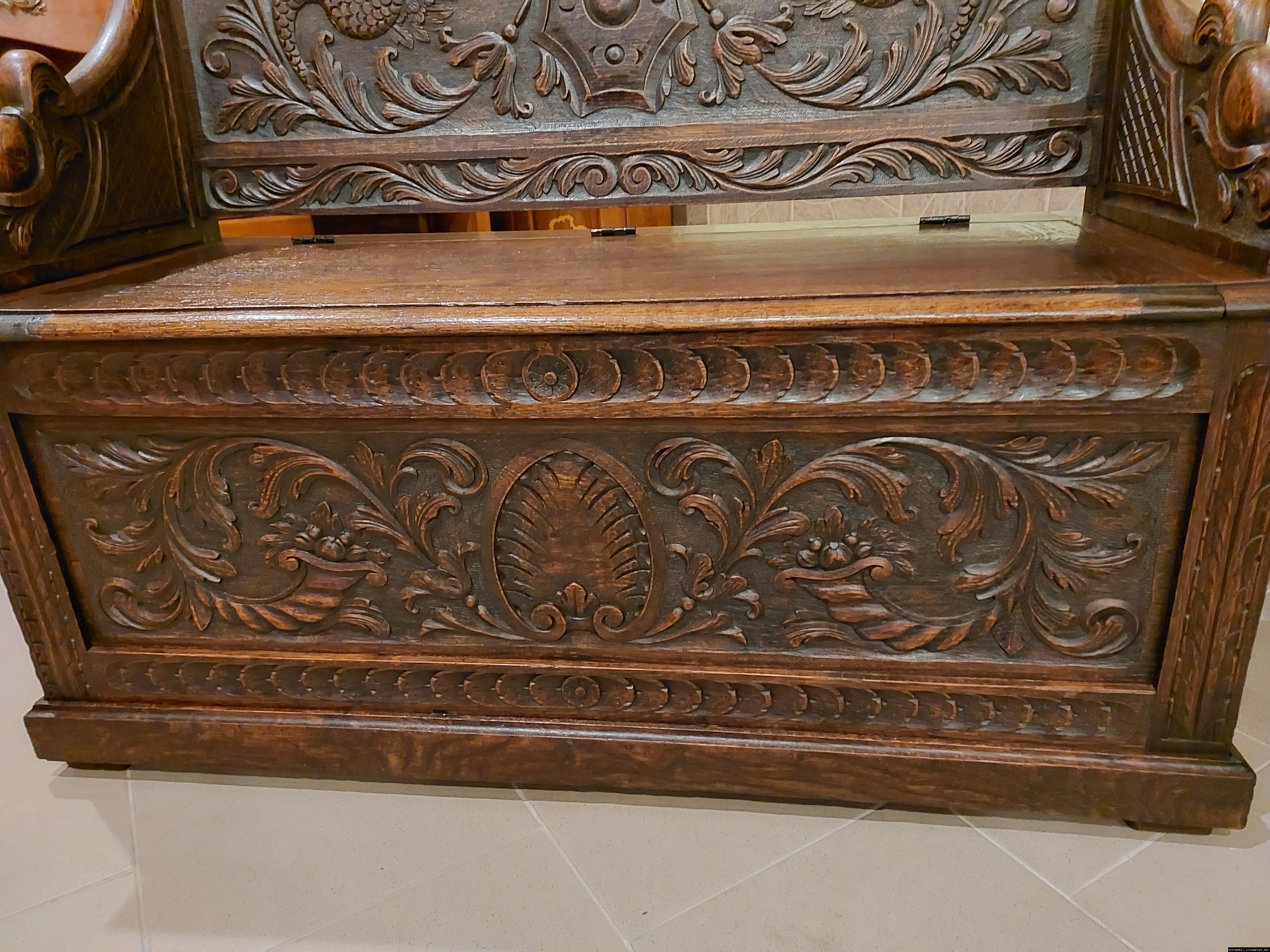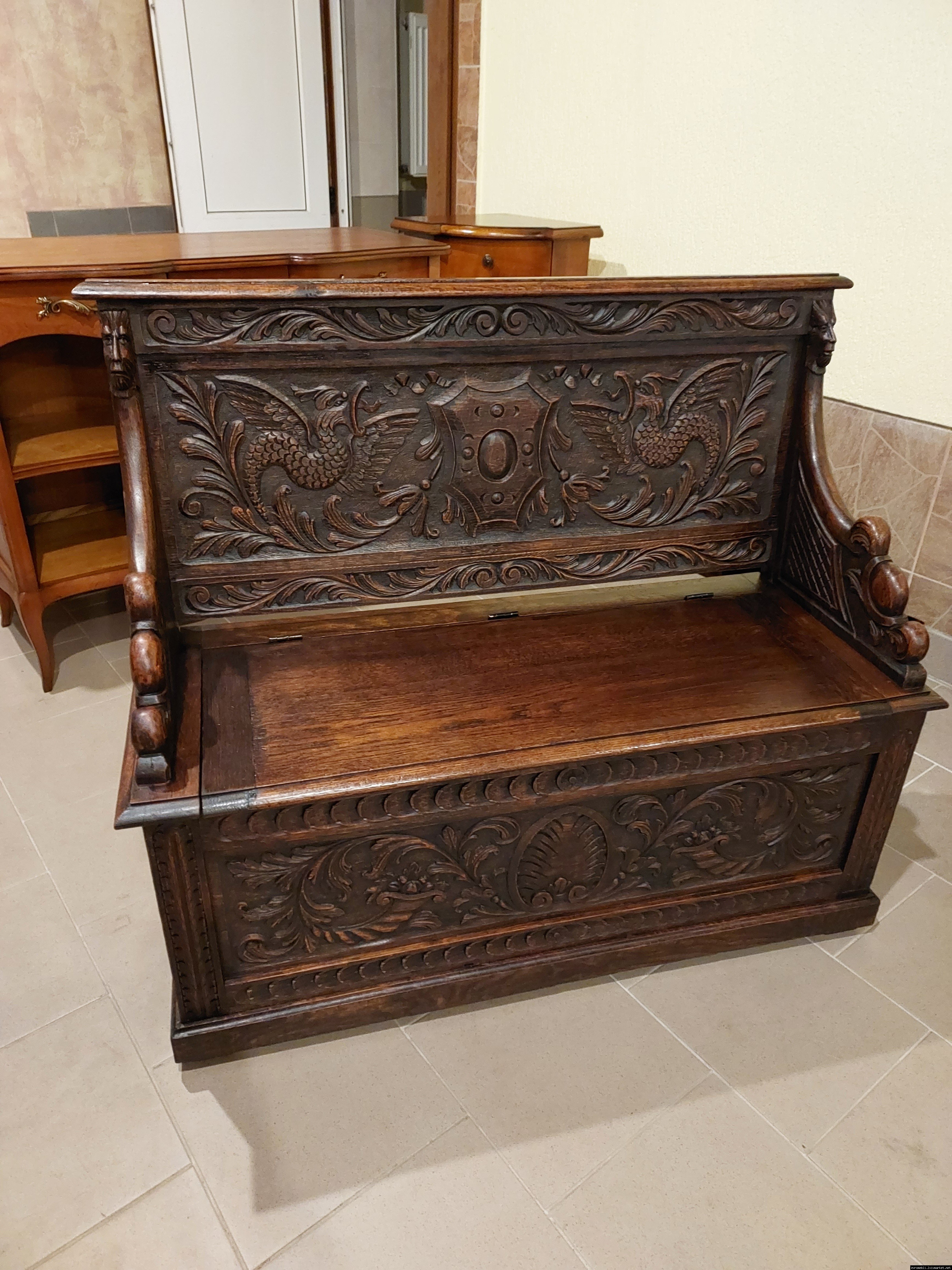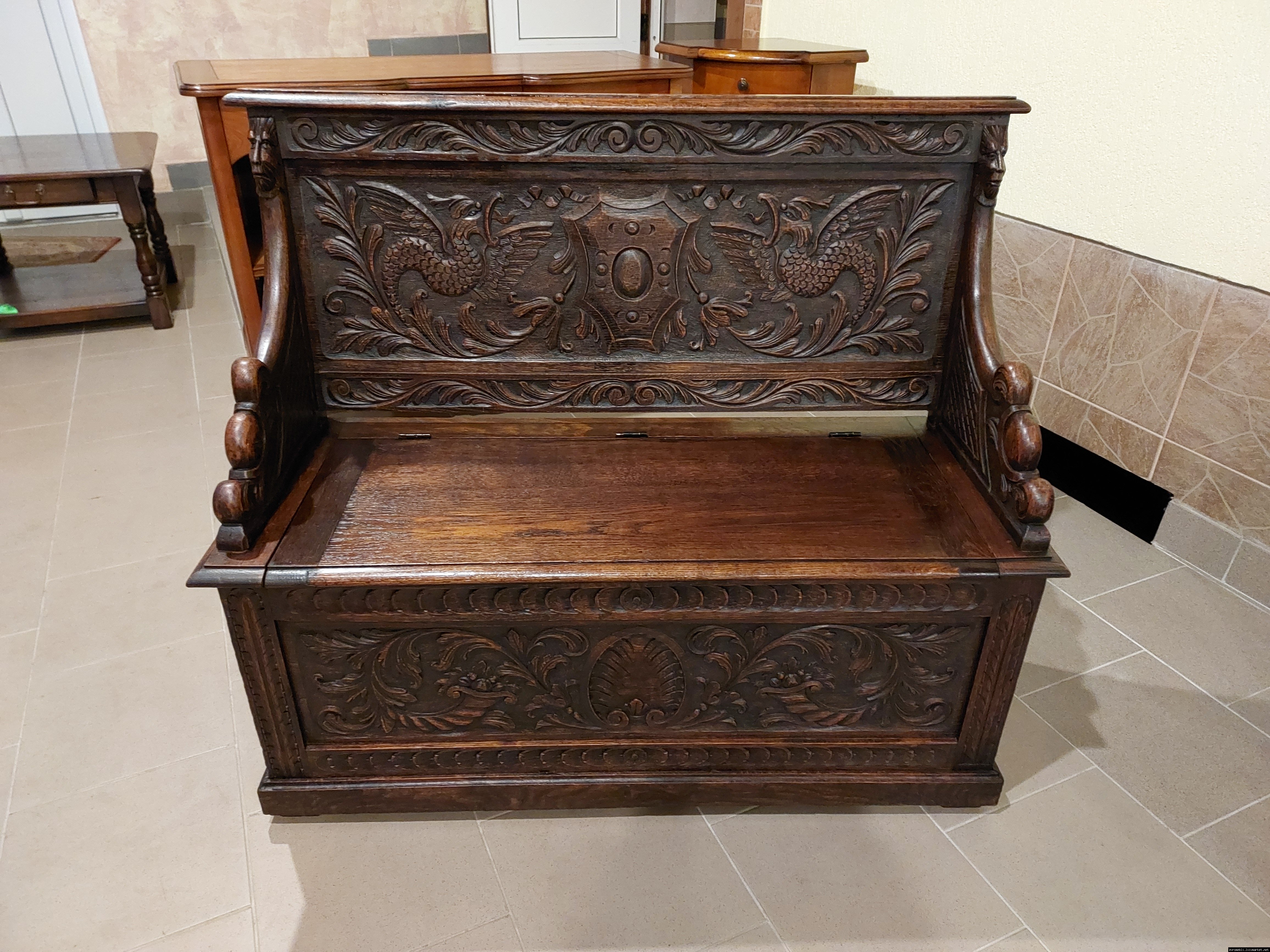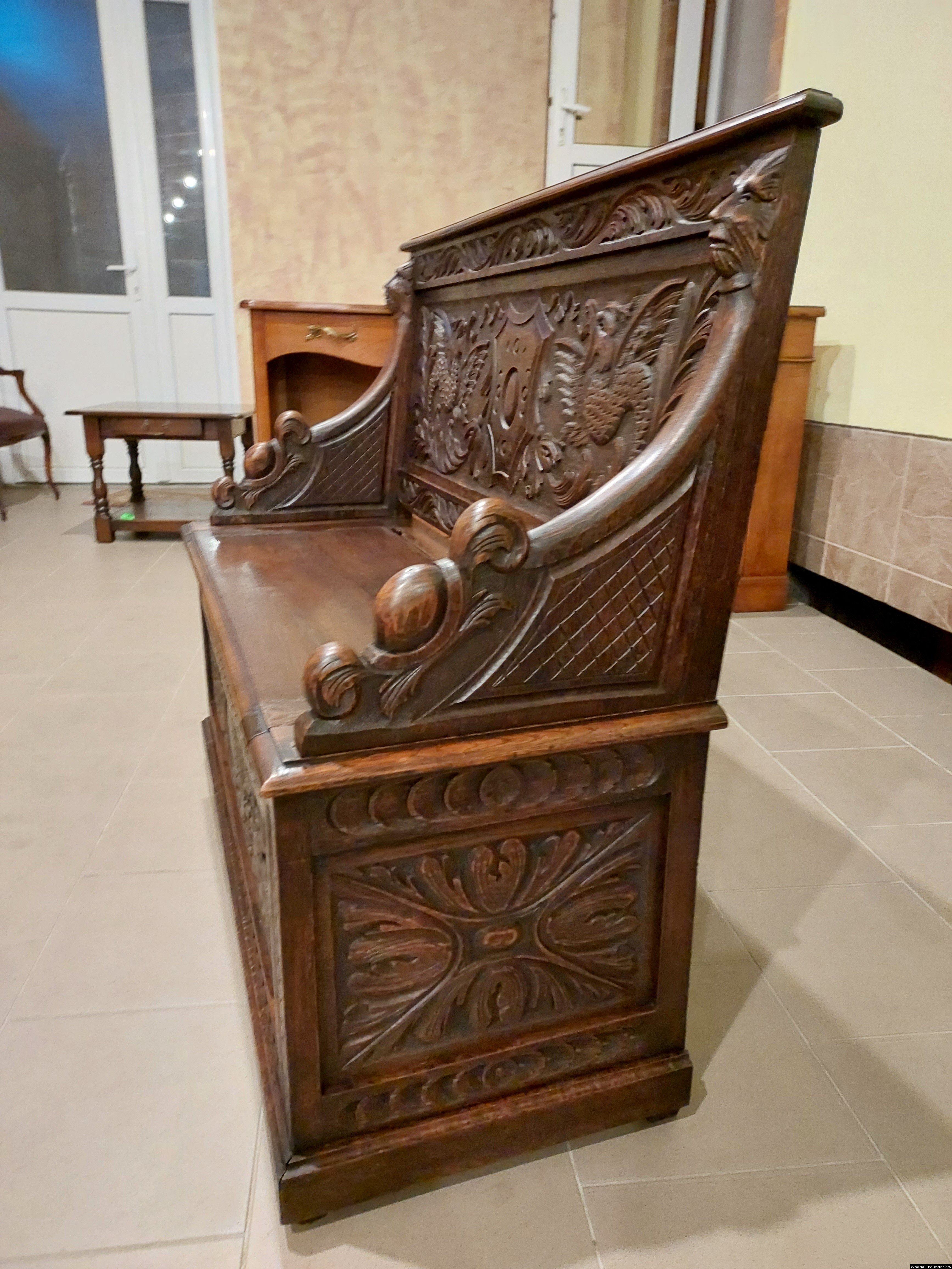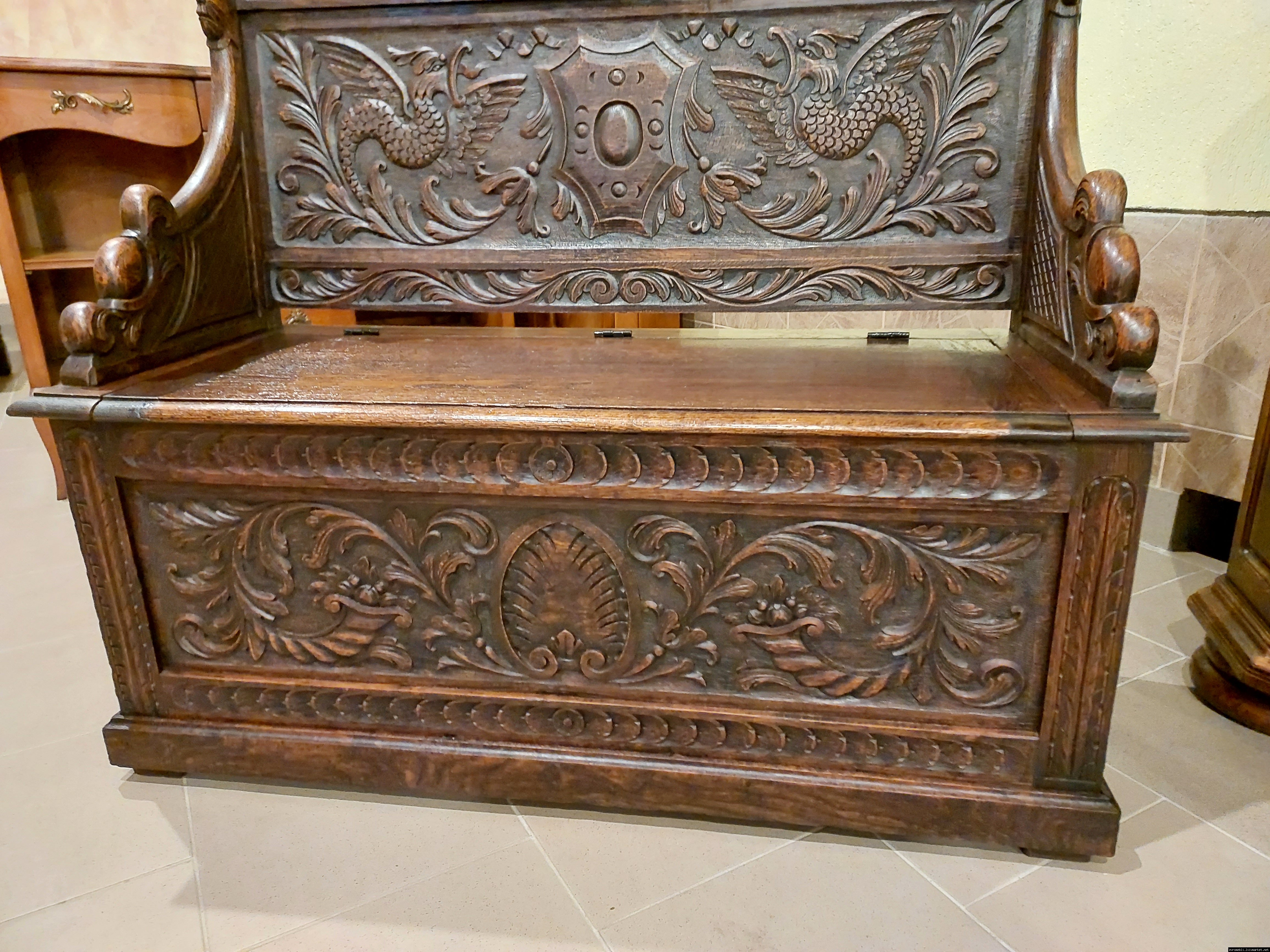 Красивий, антикварний, деревяний бомбетель- лавка. Бомбетель виготовлений з натурального дерева, темний дуб, масив, щедро декорований елементами різьби ручної роботи. Бомбетель- це лавка зі скринею під відкидною кришкою. Подейкують, що це слівце має німецьке походження, в кінці XIX століття так називали лавку- ліжко, яку деколи використовували замість скрині. Бомбетель в хорошому стані, привезений з Бельгії.