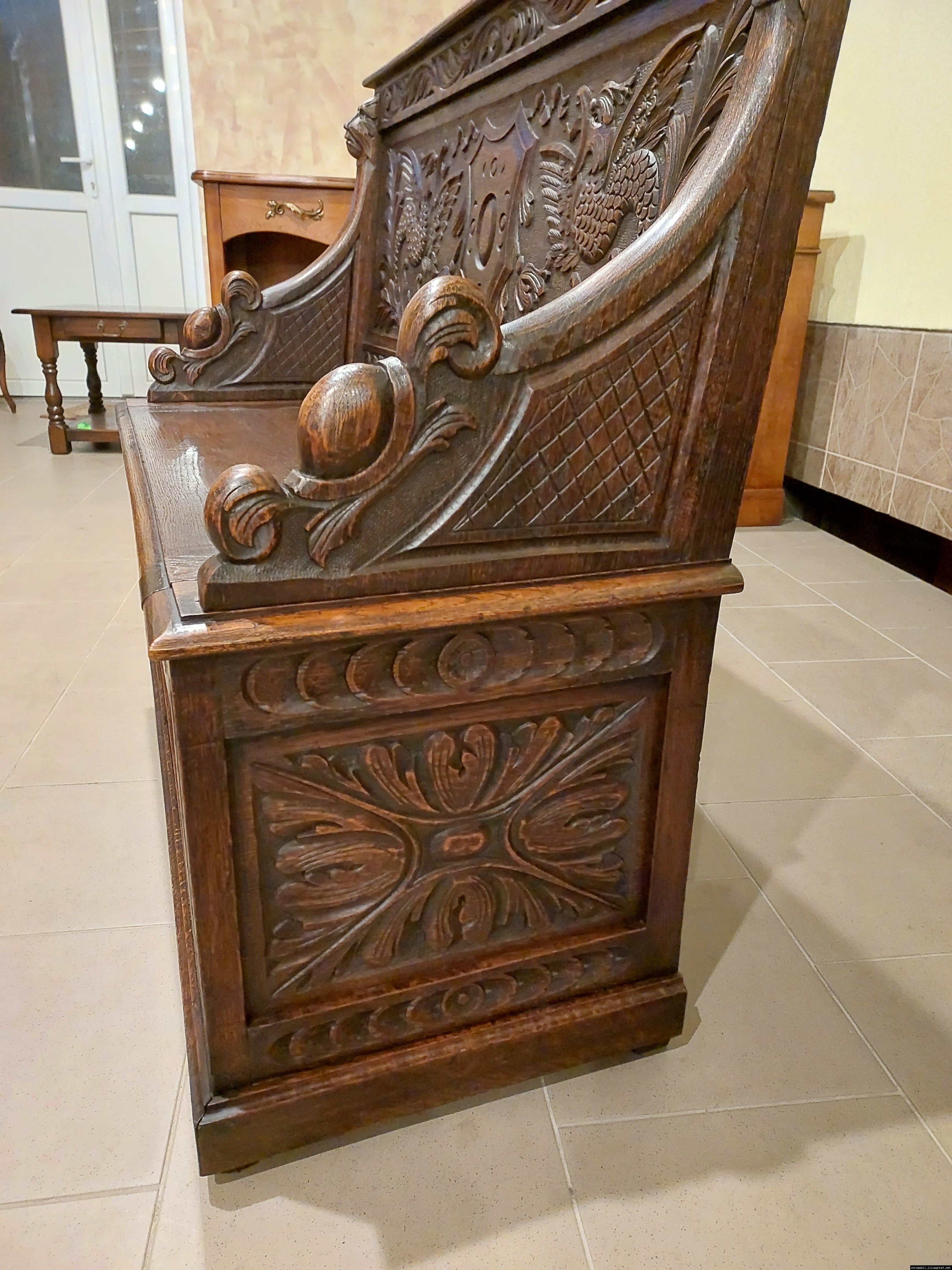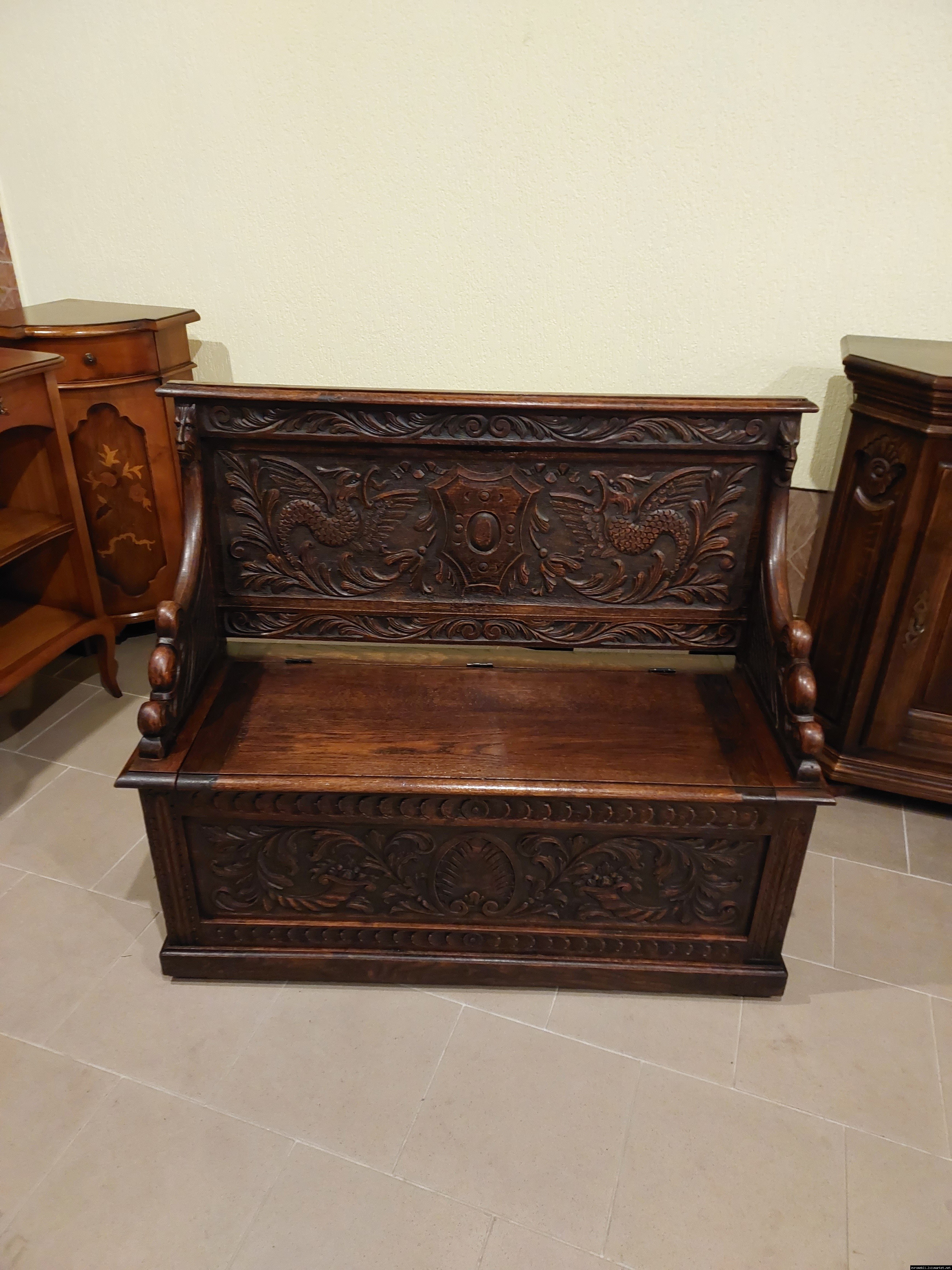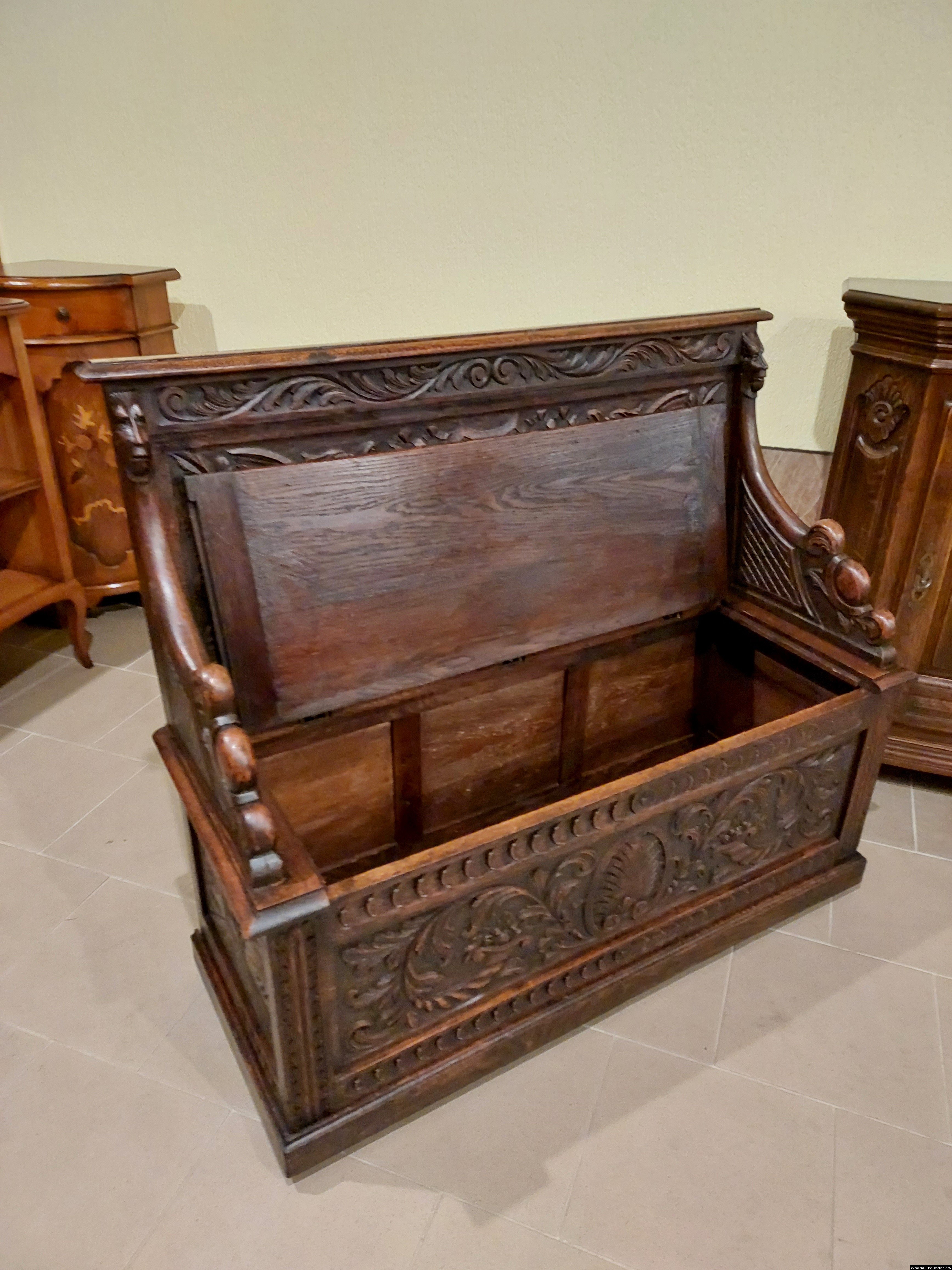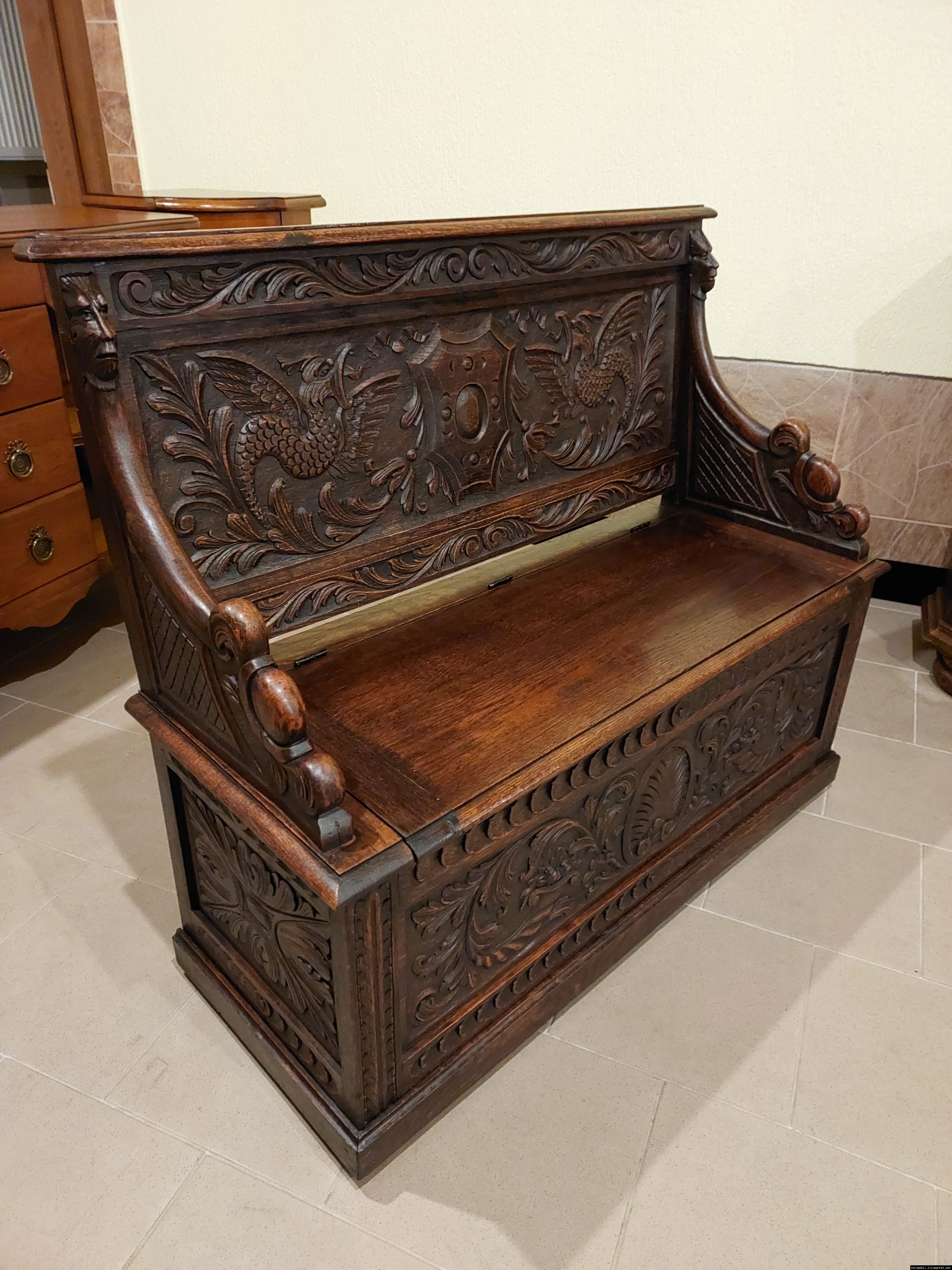 Красивий, антикварний, деревяний бомбетель- лавка. Бомбетель виготовлений з натурального дерева, темний дуб, масив, щедро декорований елементами різьби ручної роботи. Бомбетель- це лавка зі скринею під відкидною кришкою. Подейкують, що це слівце має німецьке походження, в кінці XIX століття так називали лавку- ліжко, яку деколи використовували замість скрині. Бомбетель в хорошому стані, привезений з Бельгії.