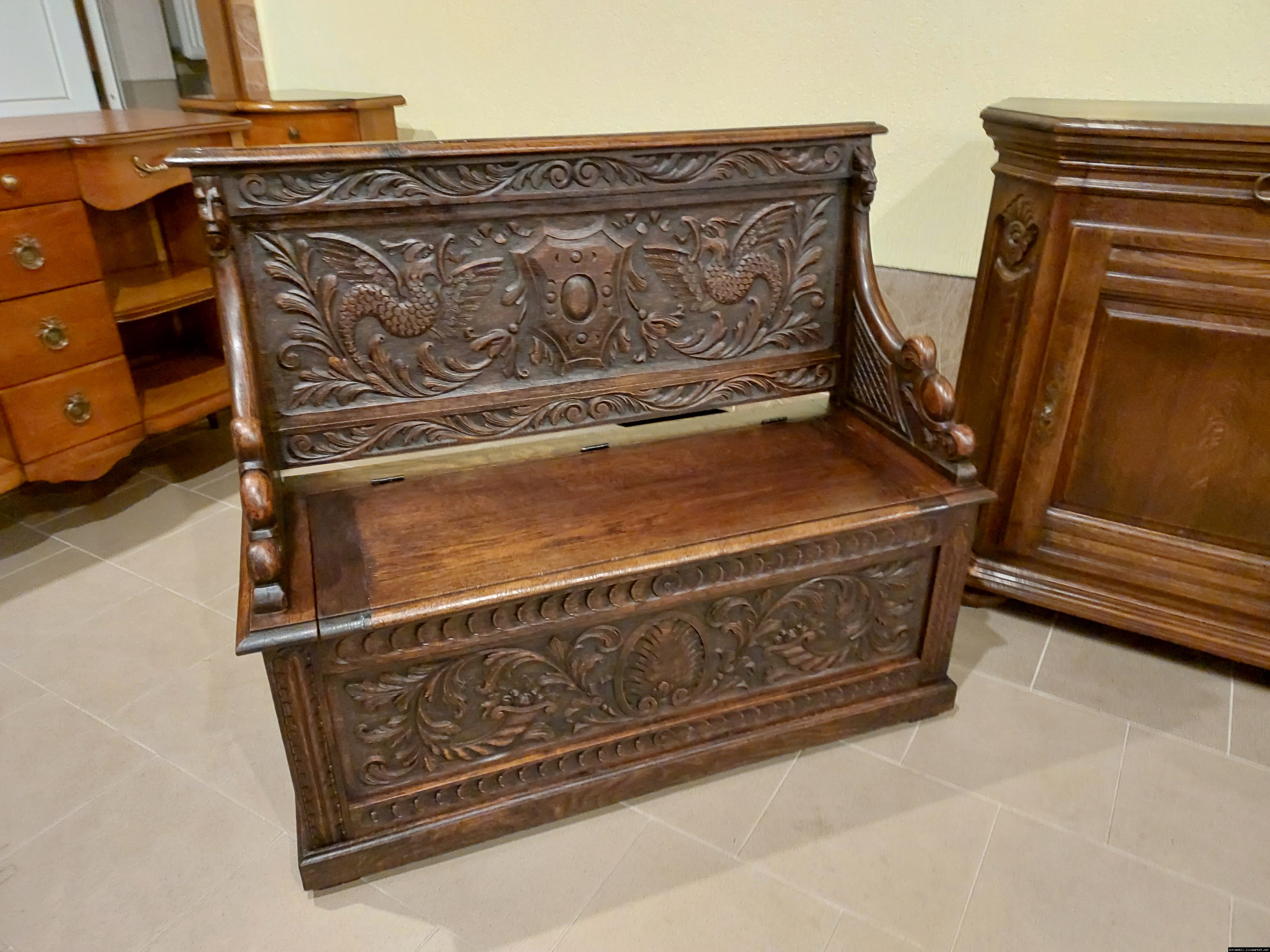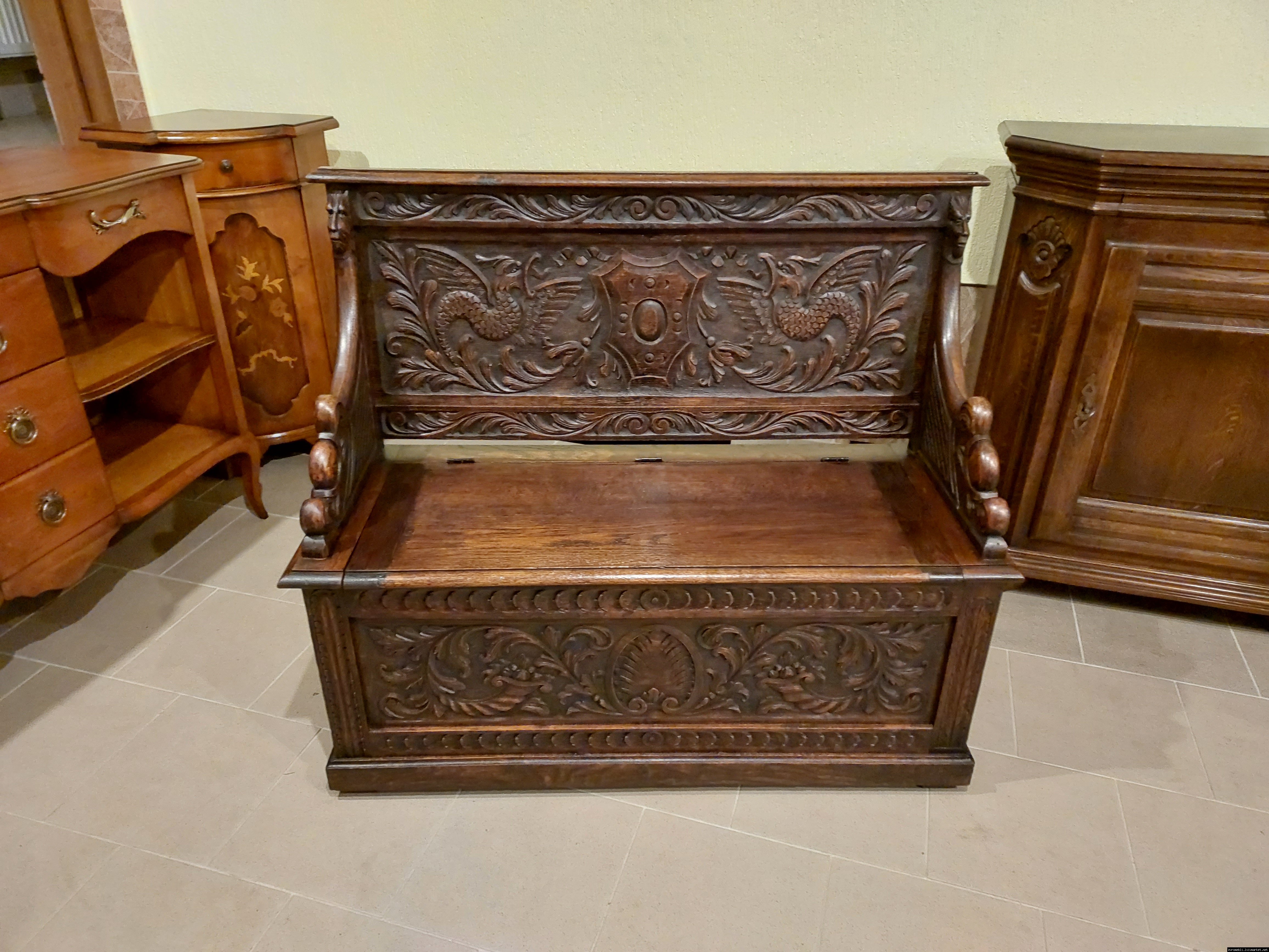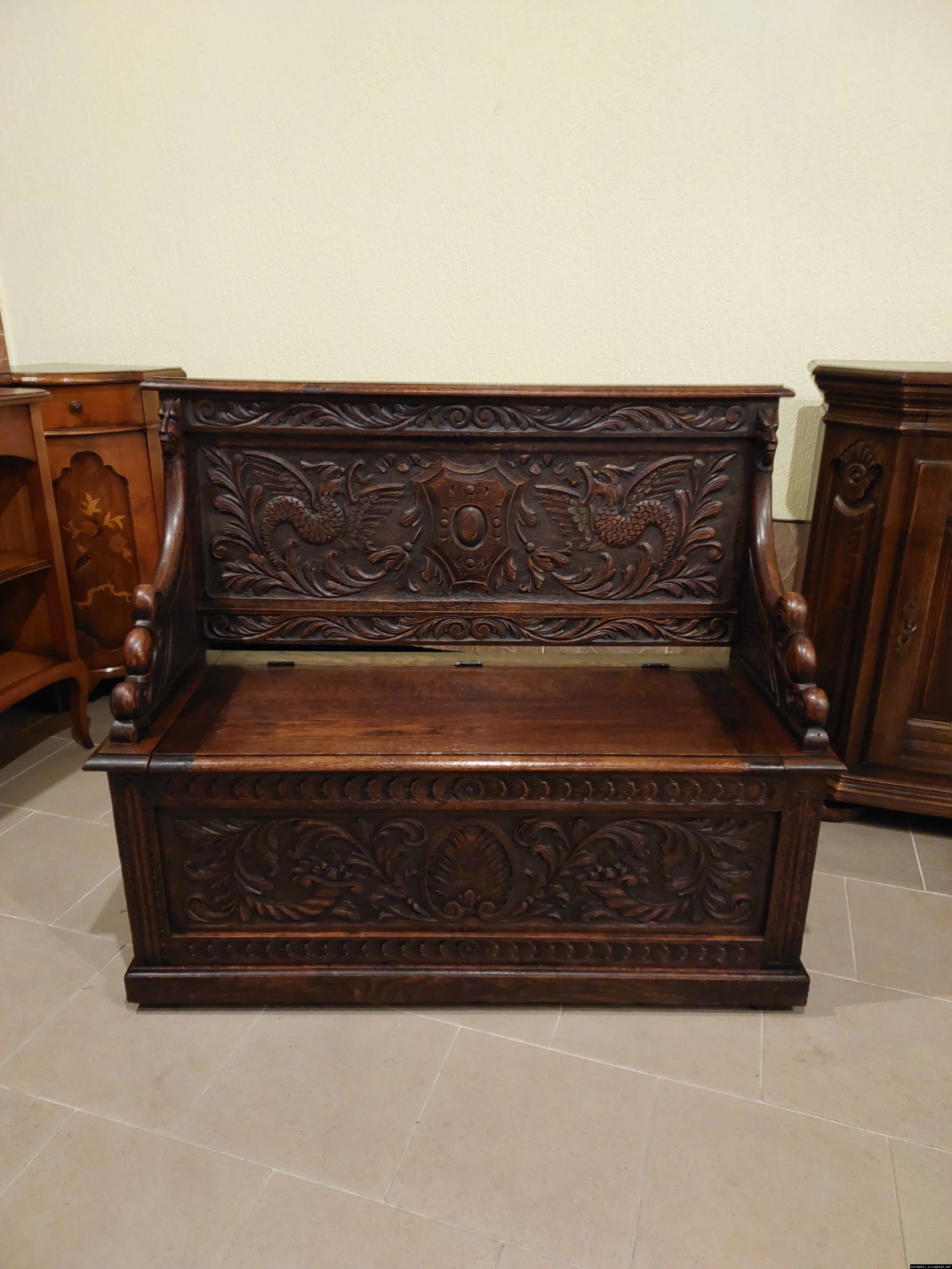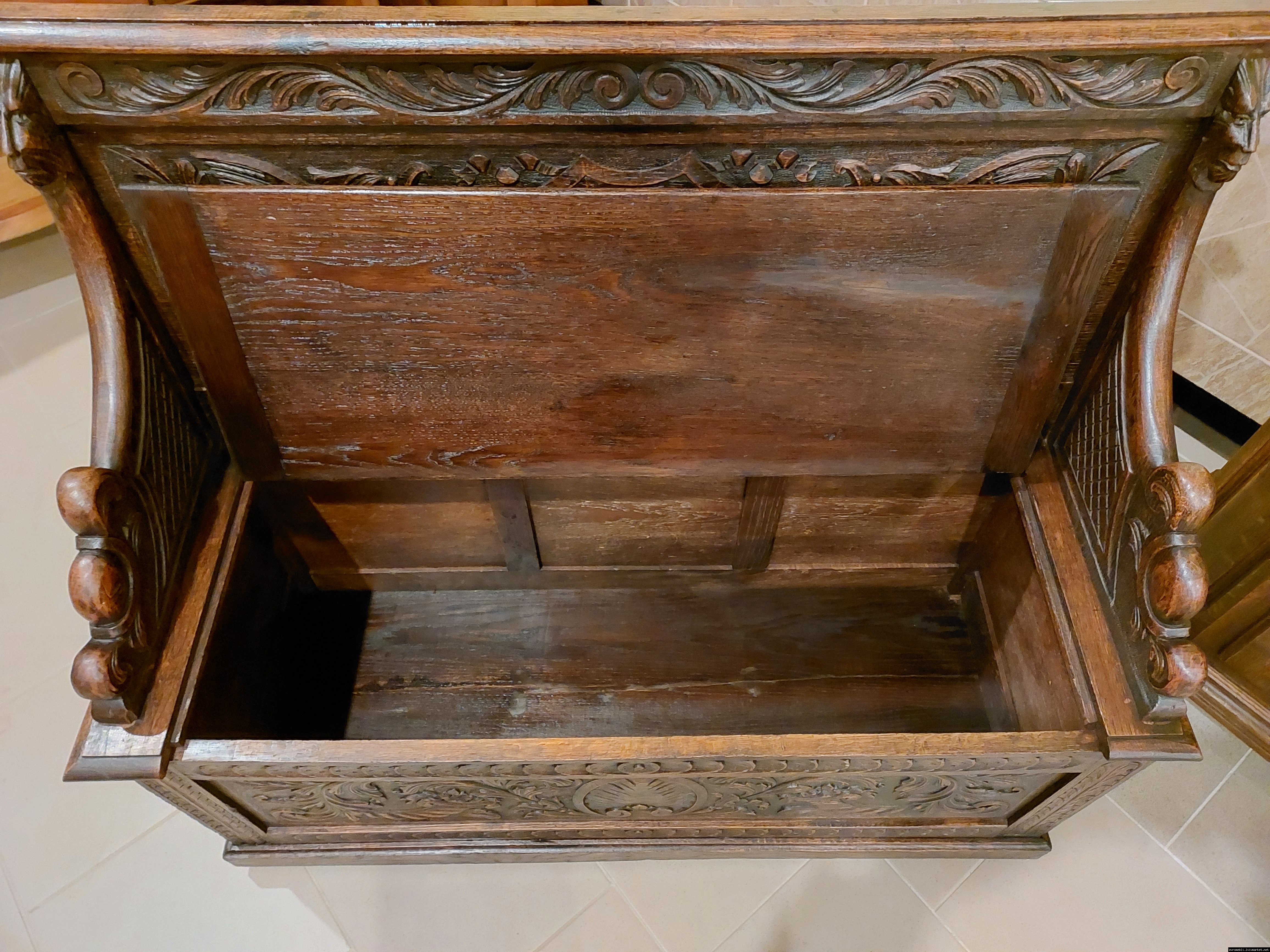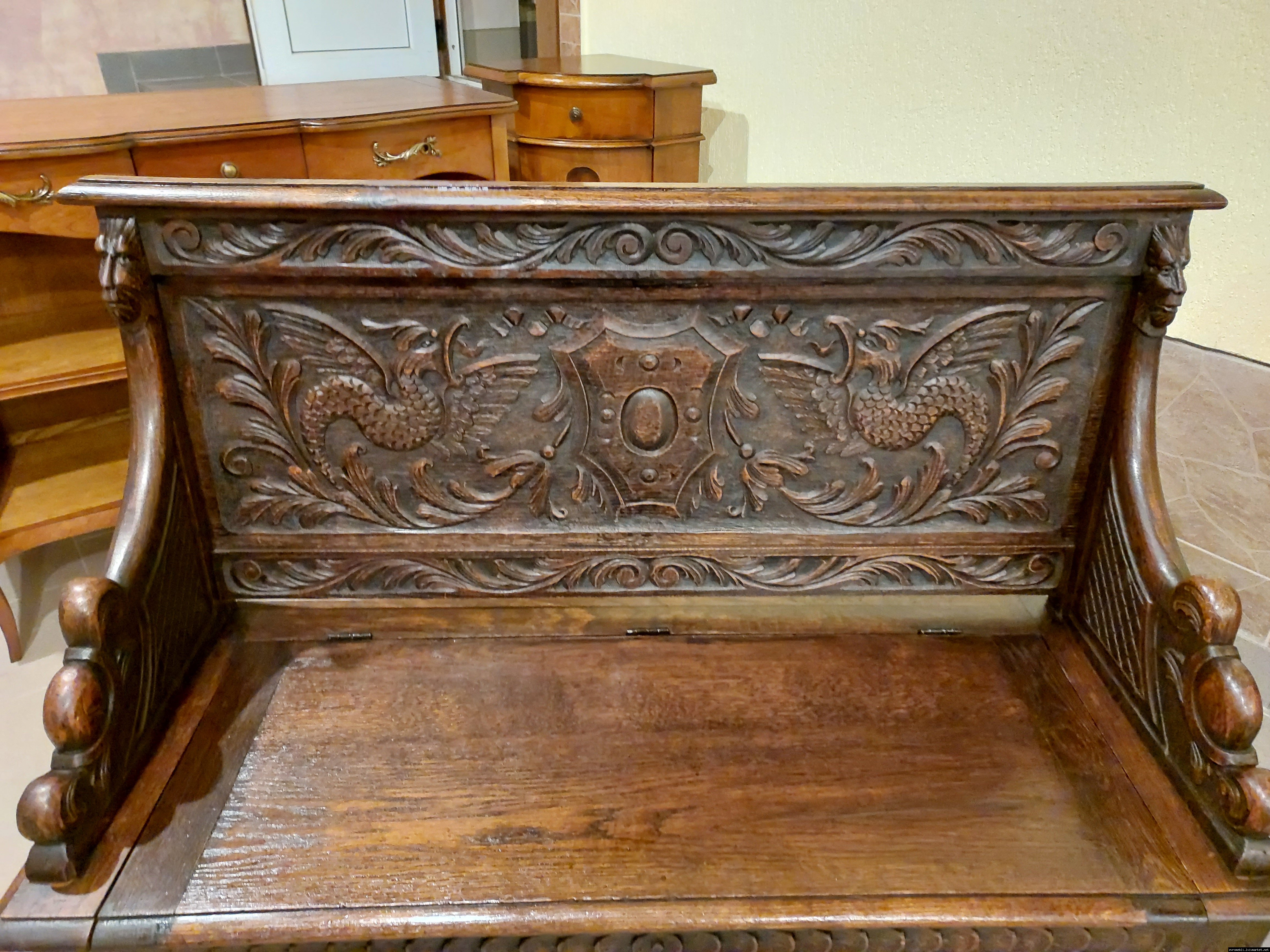 Красивий, антикварний, деревяний бомбетель- лавка. Бомбетель виготовлений з натурального дерева, темний дуб, масив, щедро декорований елементами різьби ручної роботи. Бомбетель- це лавка зі скринею під відкидною кришкою. Подейкують, що це слівце має німецьке походження, в кінці XIX століття так називали лавку- ліжко, яку деколи використовували замість скрині. Бомбетель в хорошому стані, привезений з Бельгії.