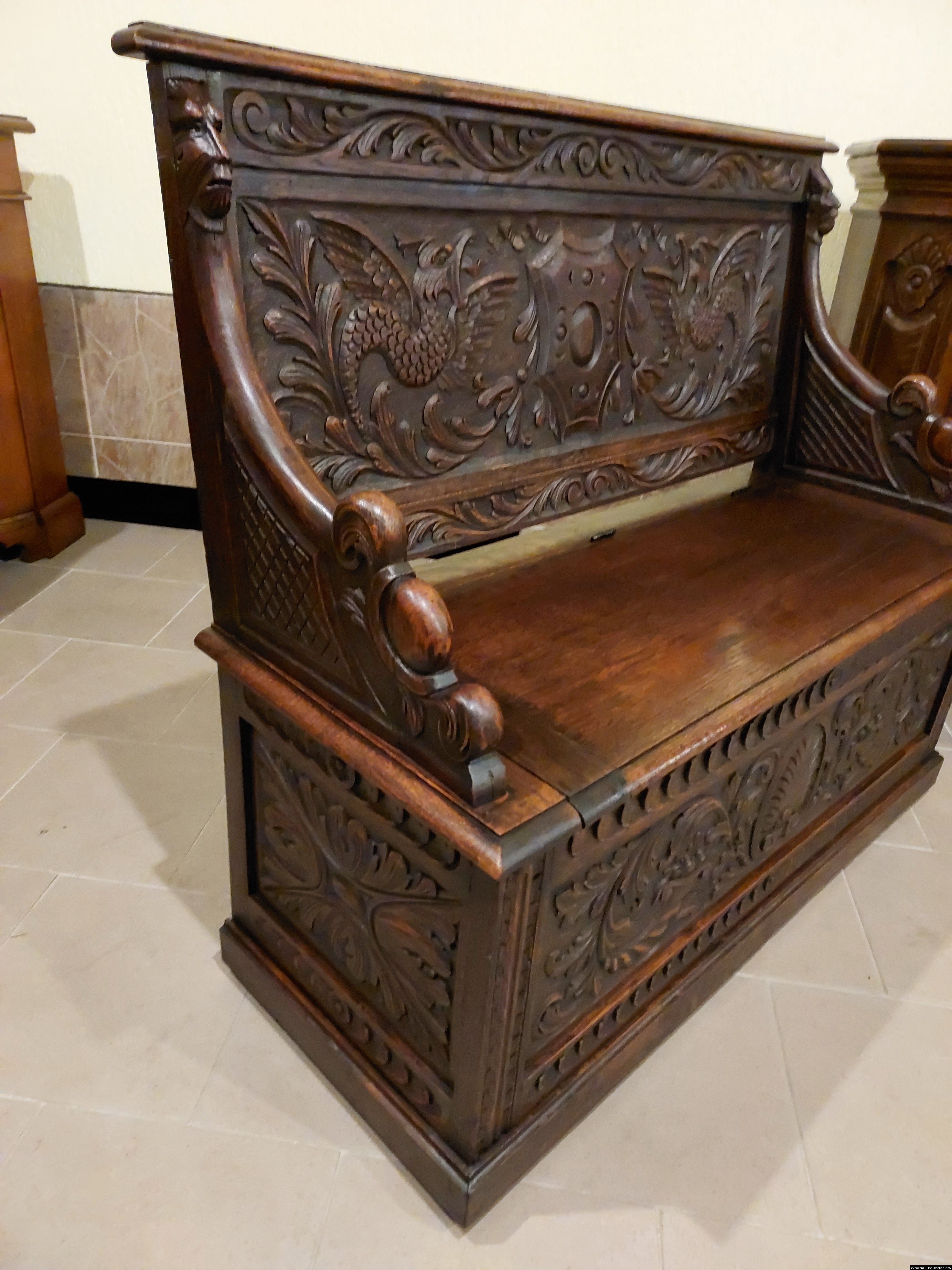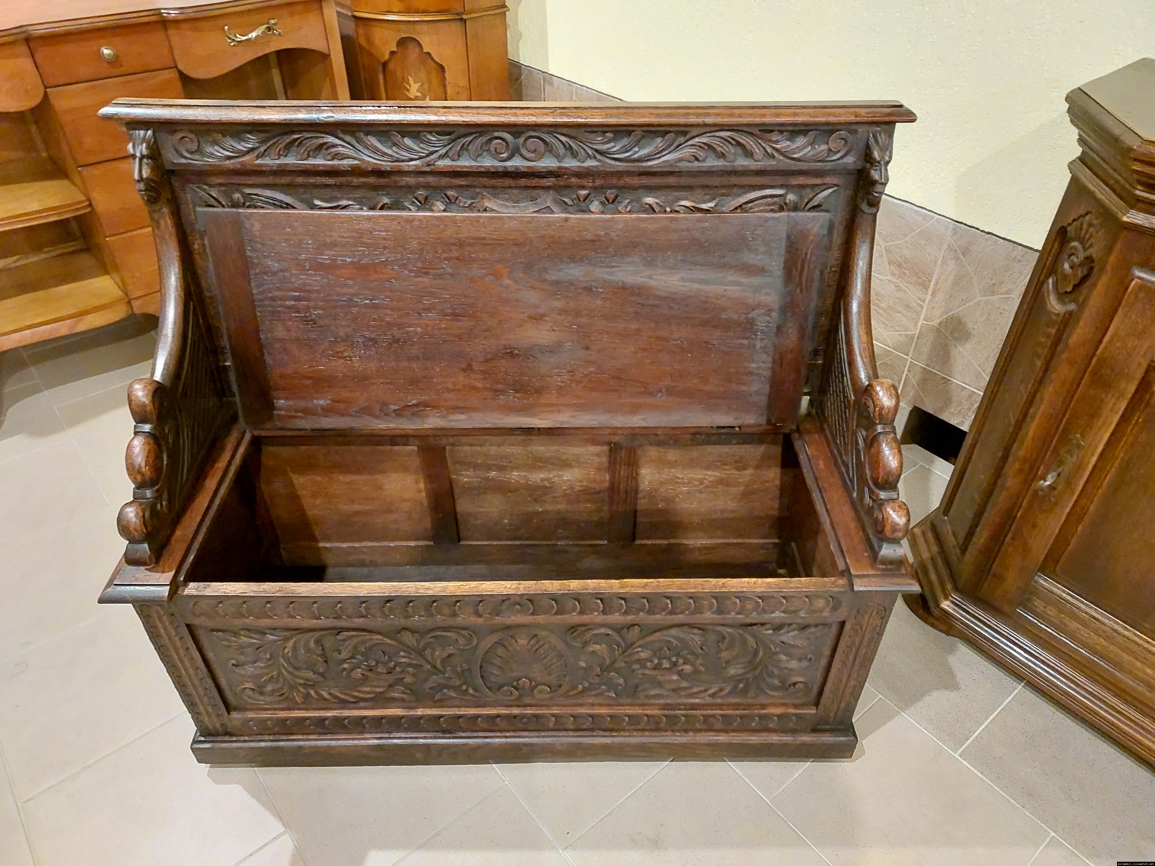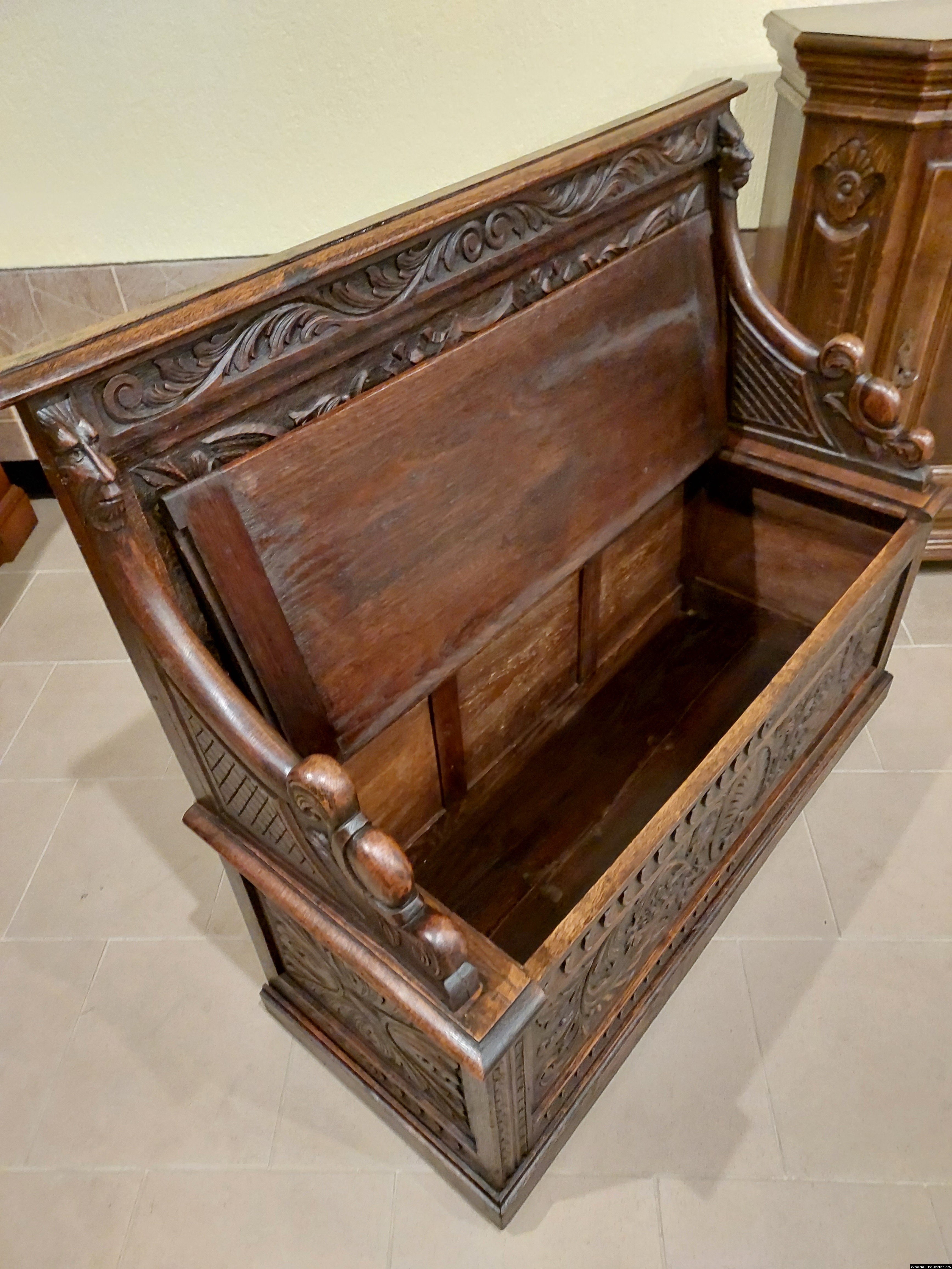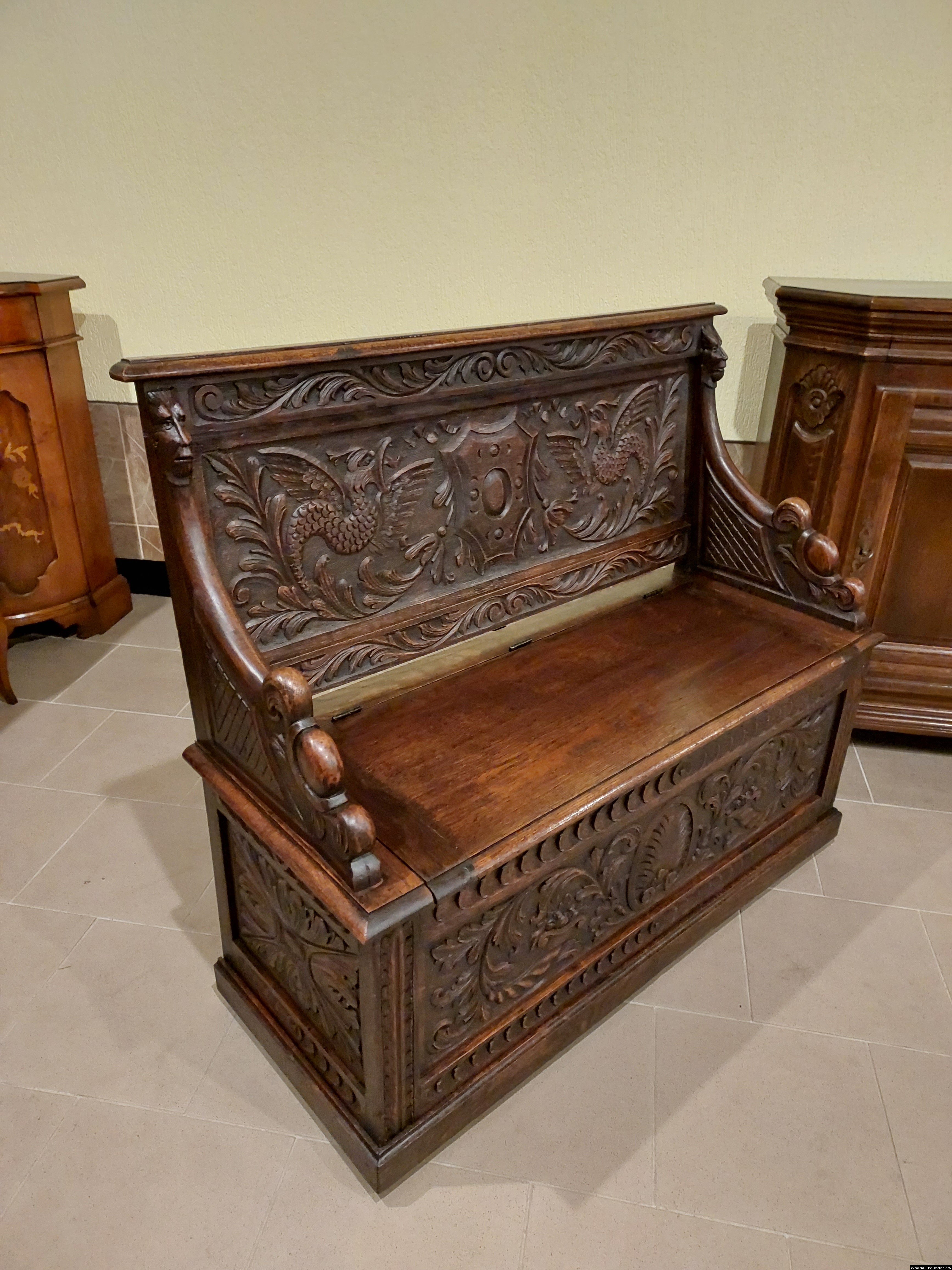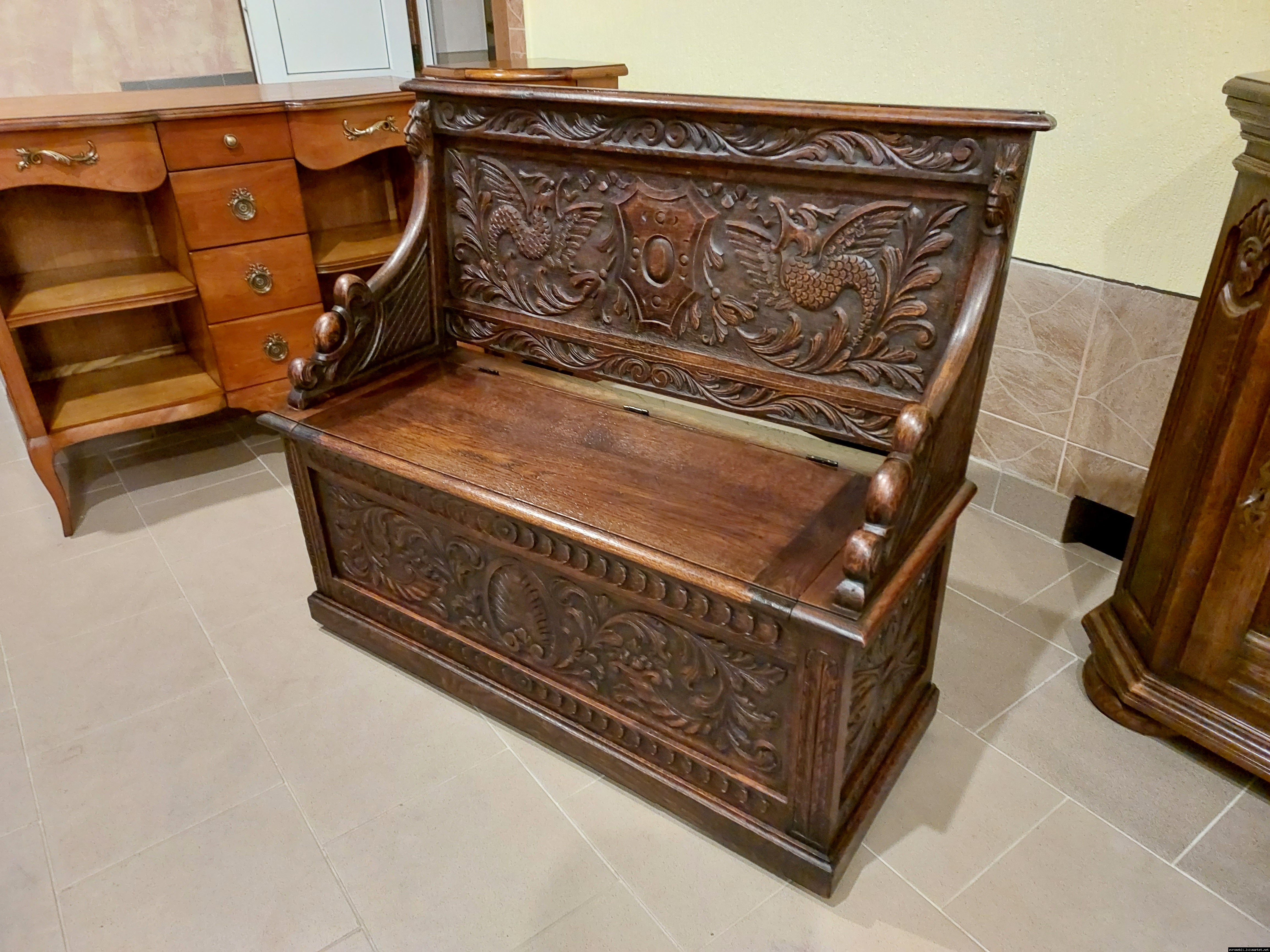 Красивий, антикварний, деревяний бомбетель- лавка. Бомбетель виготовлений з натурального дерева, темний дуб, масив, щедро декорований елементами різьби ручної роботи. Бомбетель- це лавка зі скринею під відкидною кришкою. Подейкують, що це слівце має німецьке походження, в кінці XIX століття так називали лавку- ліжко, яку деколи використовували замість скрині. Бомбетель в хорошому стані, привезений з Бельгії.