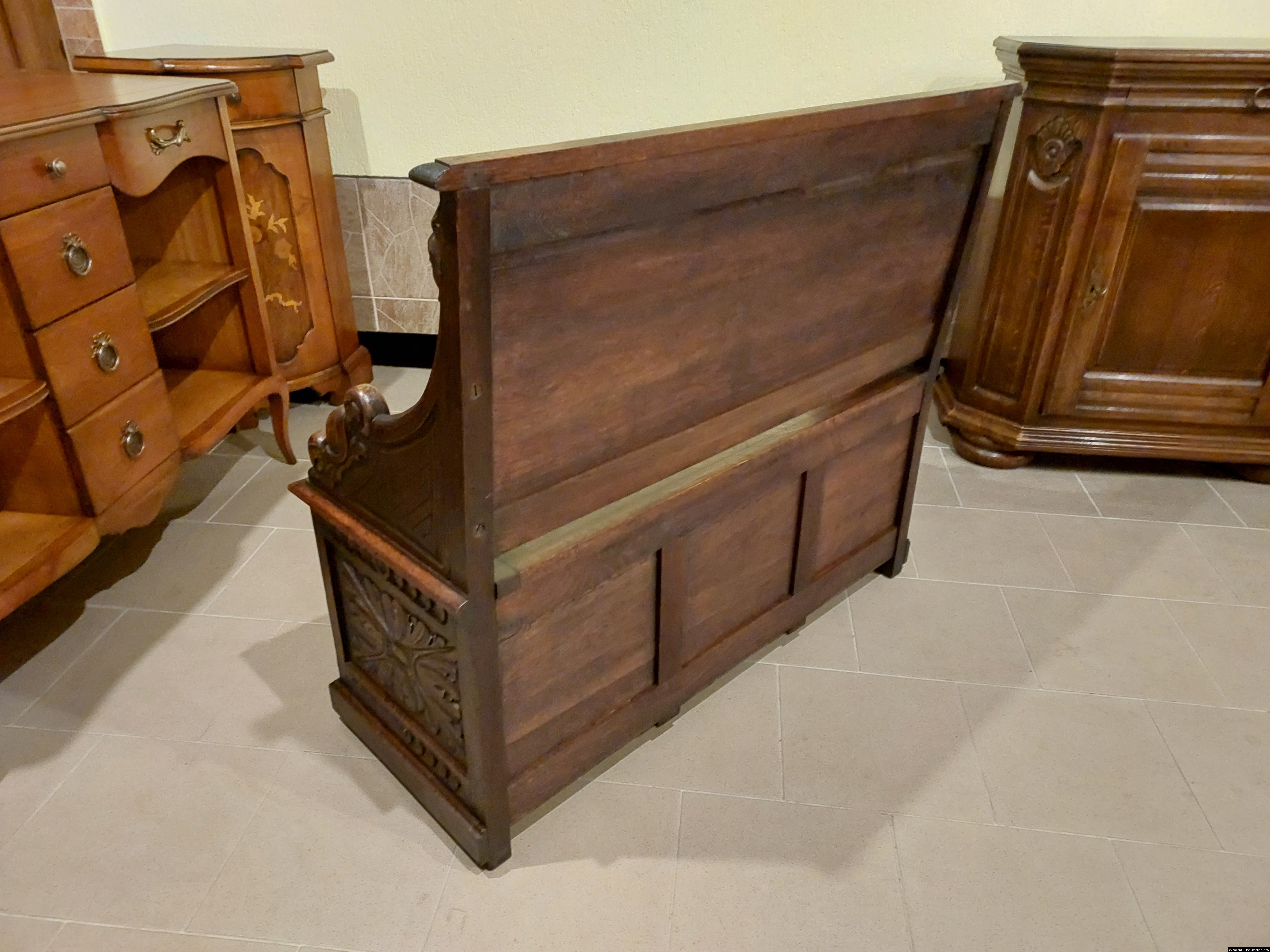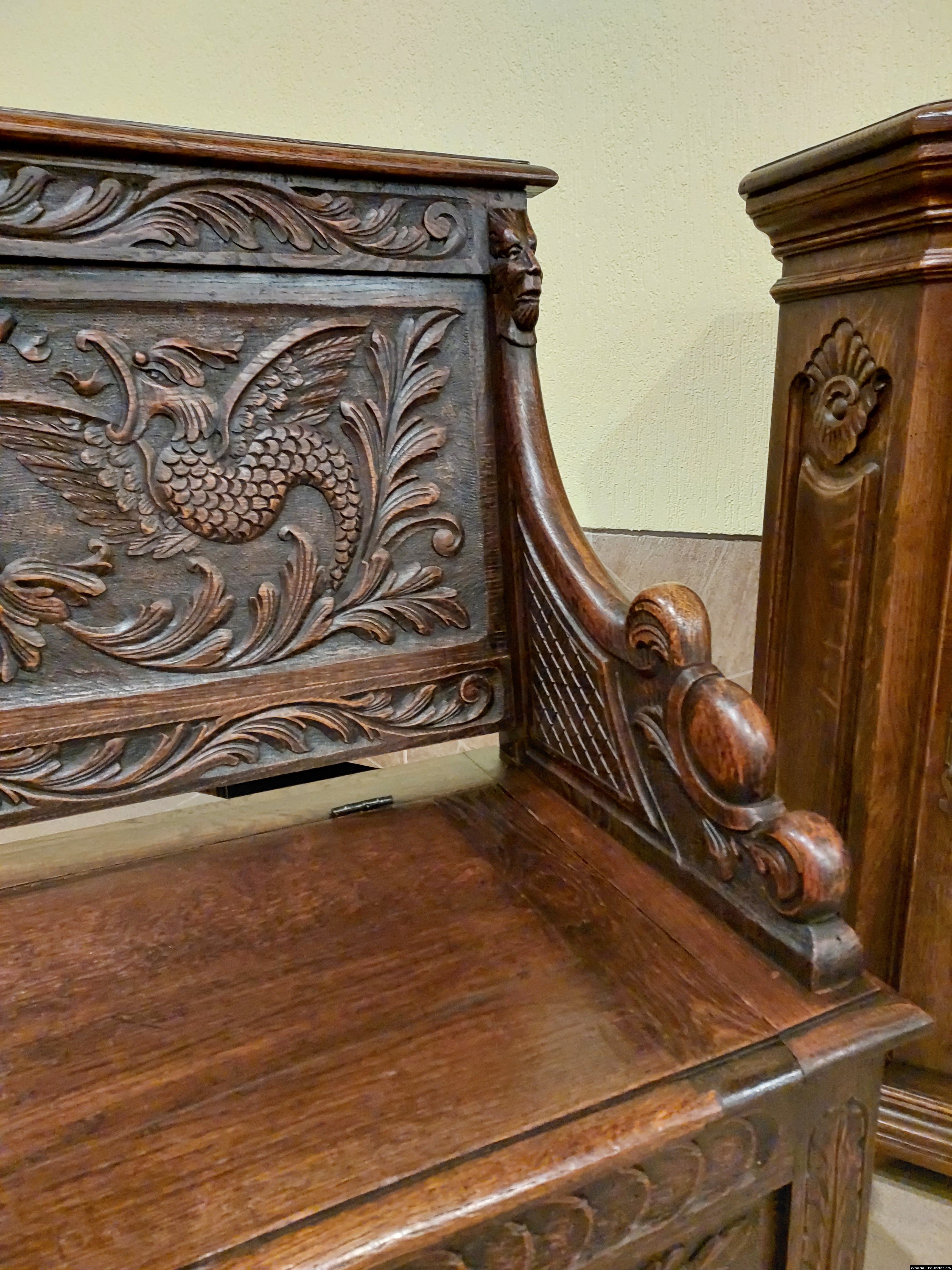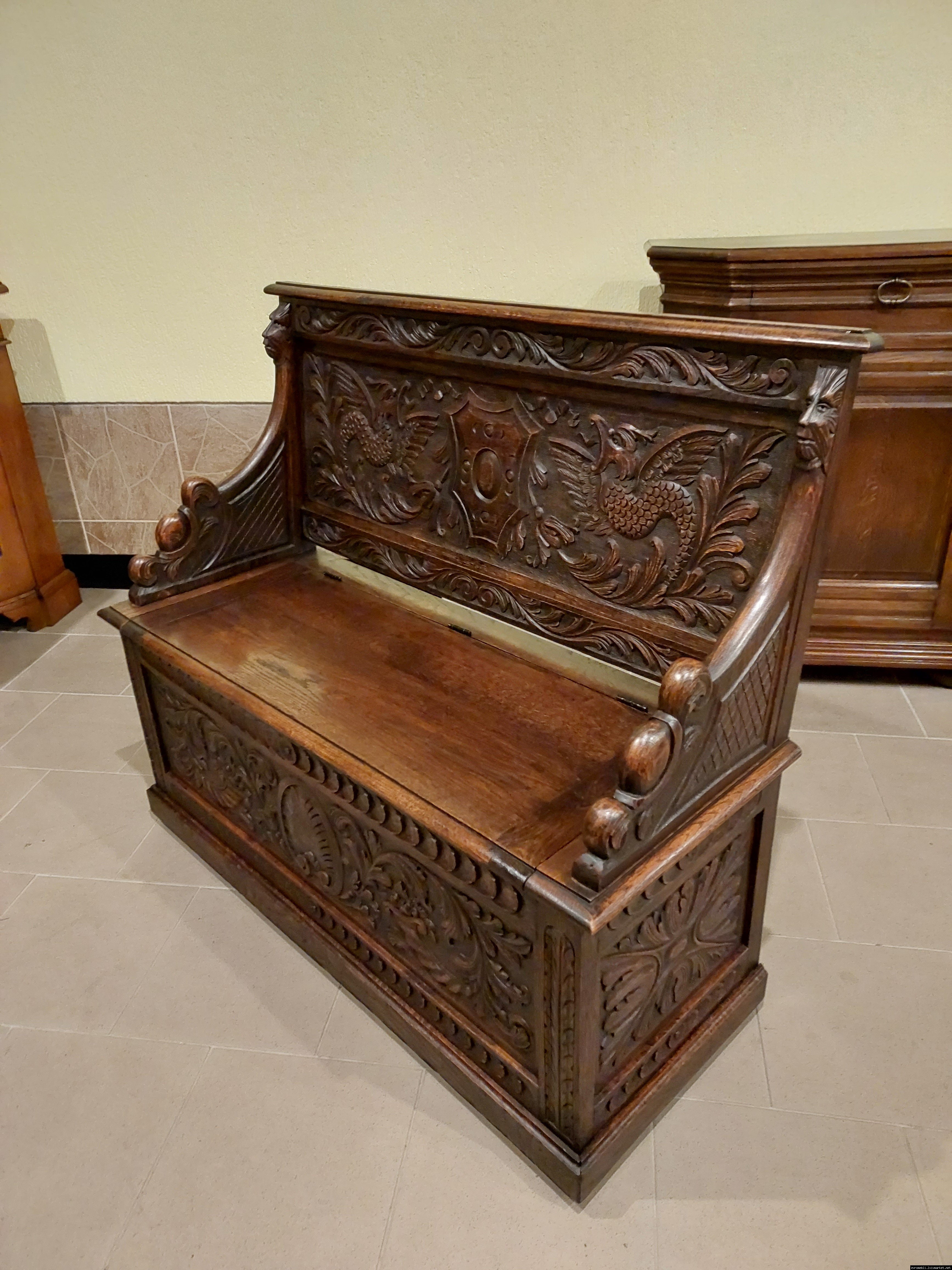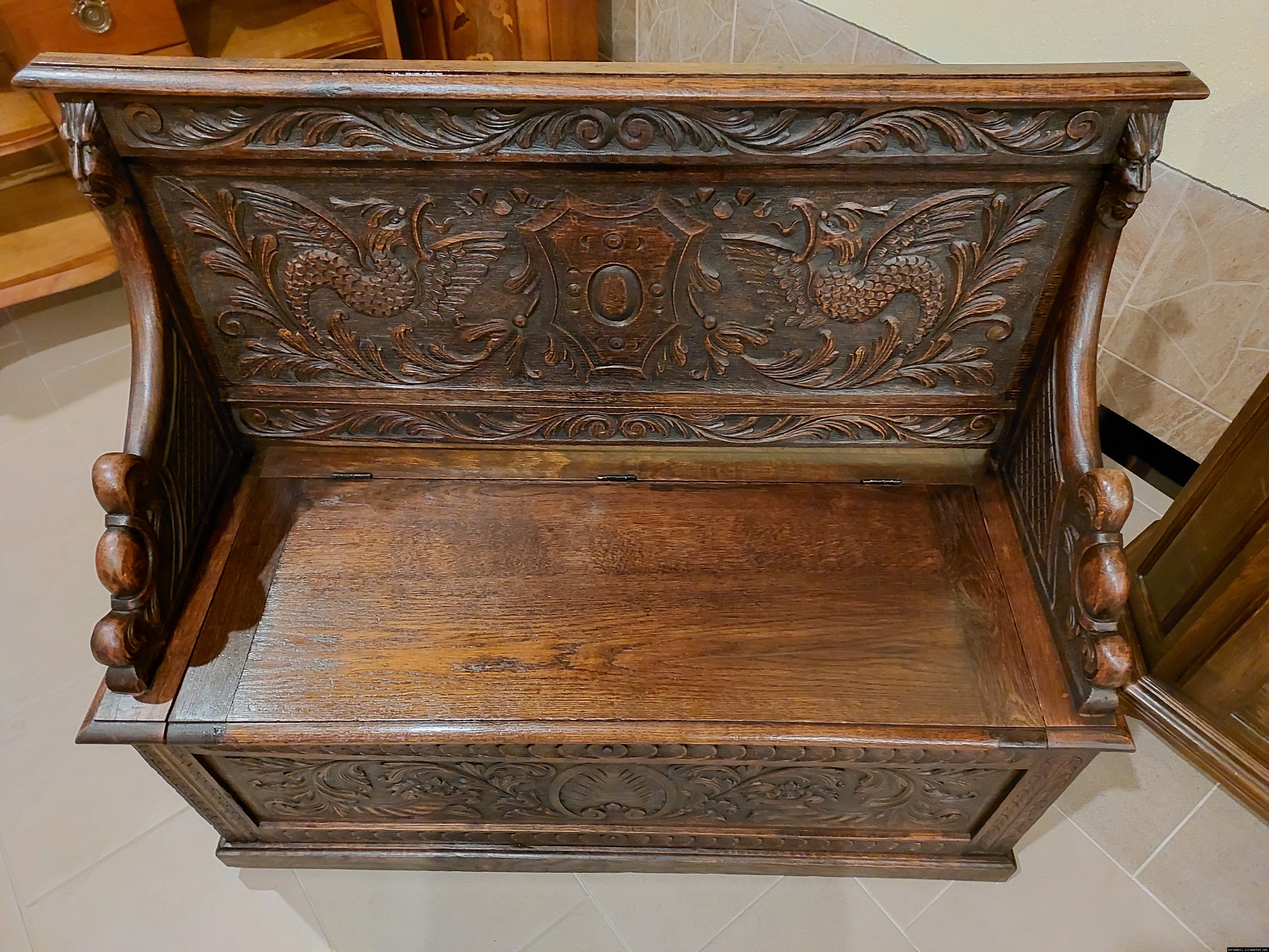 Красивий, антикварний, деревяний бомбетель- лавка. Бомбетель виготовлений з натурального дерева, темний дуб, масив, щедро декорований елементами різьби ручної роботи. Бомбетель- це лавка зі скринею під відкидною кришкою. Подейкують, що це слівце має німецьке походження, в кінці XIX століття так називали лавку- ліжко, яку деколи використовували замість скрині. Бомбетель в хорошому стані, привезений з Бельгії.