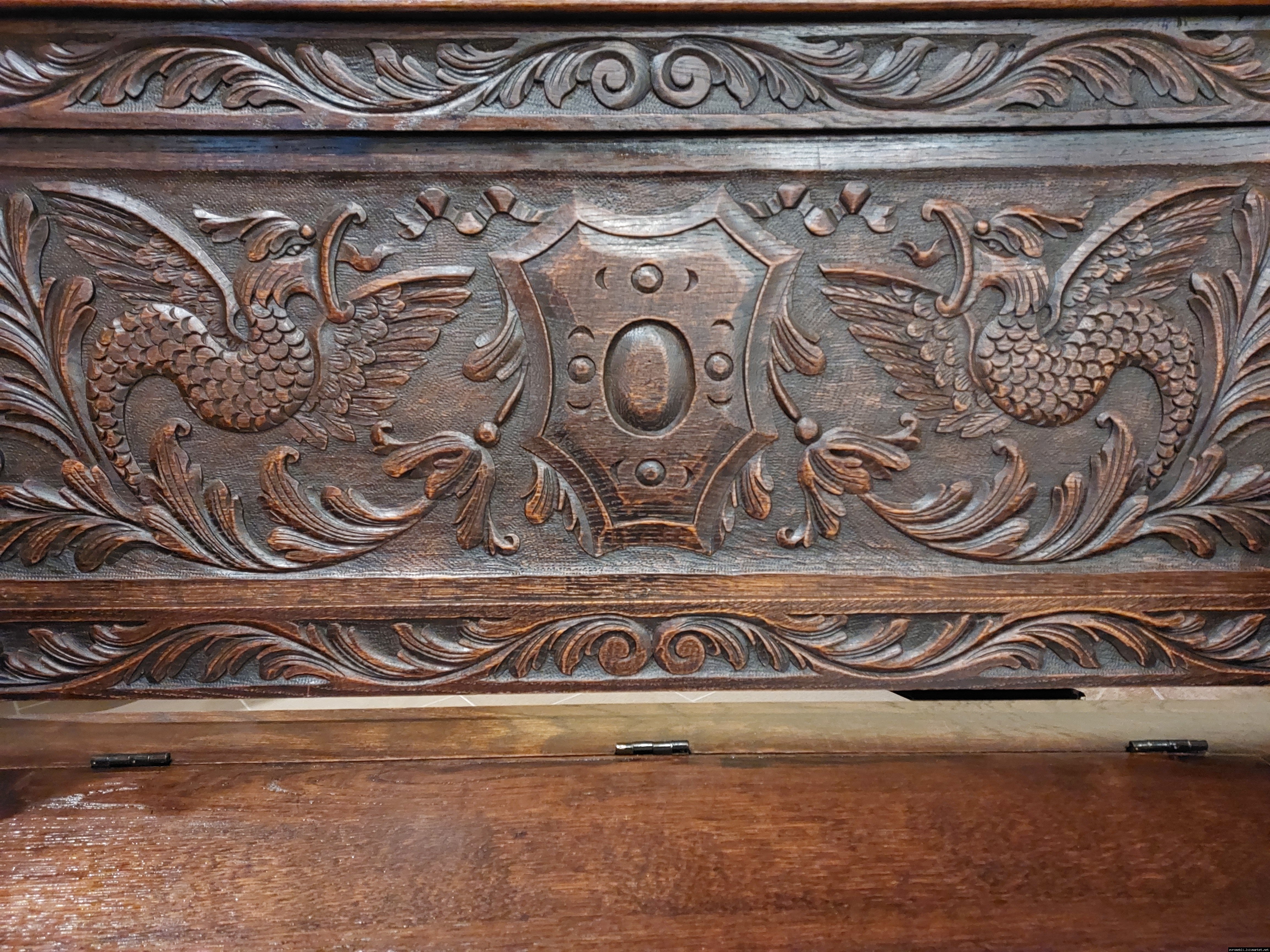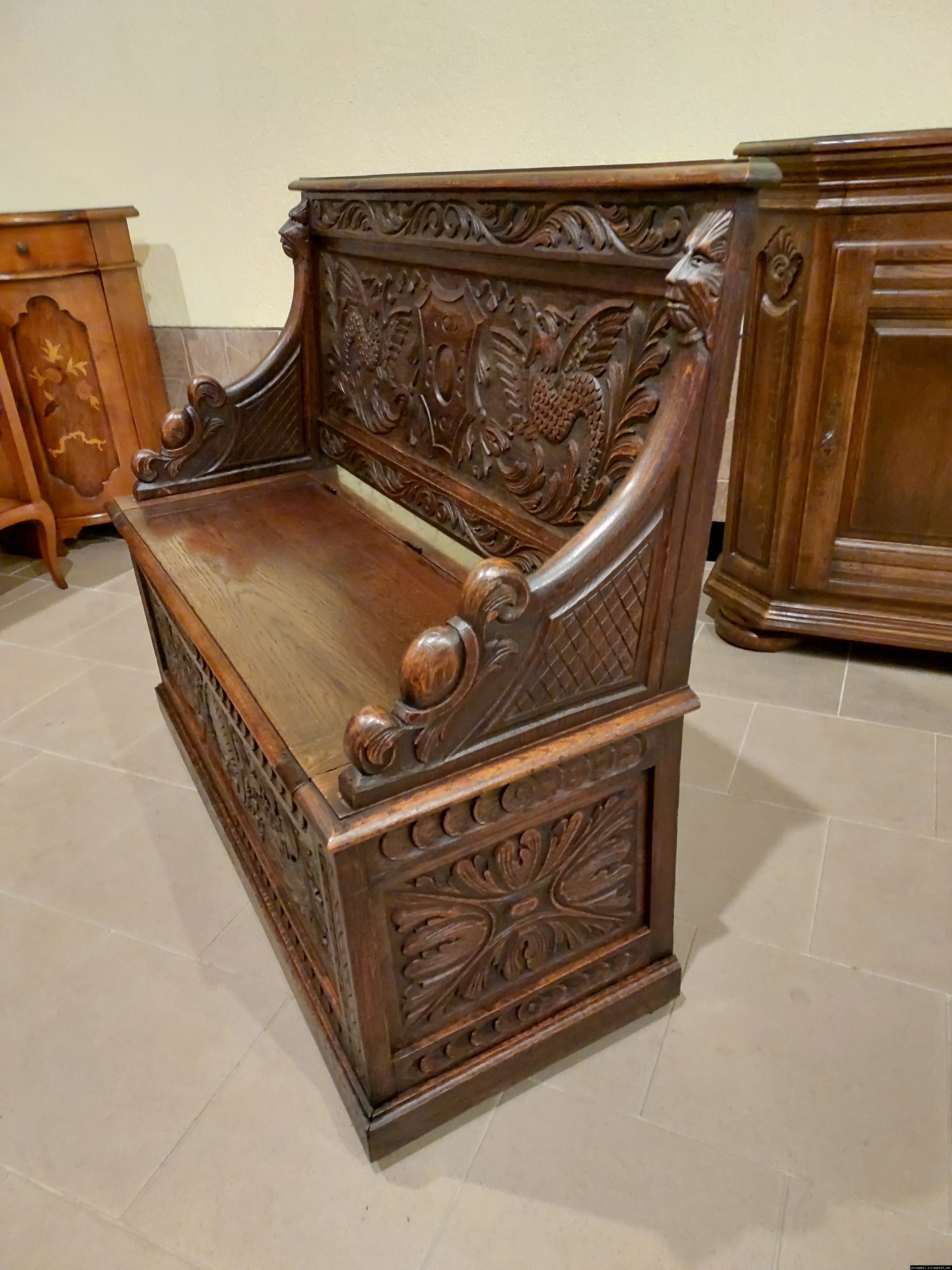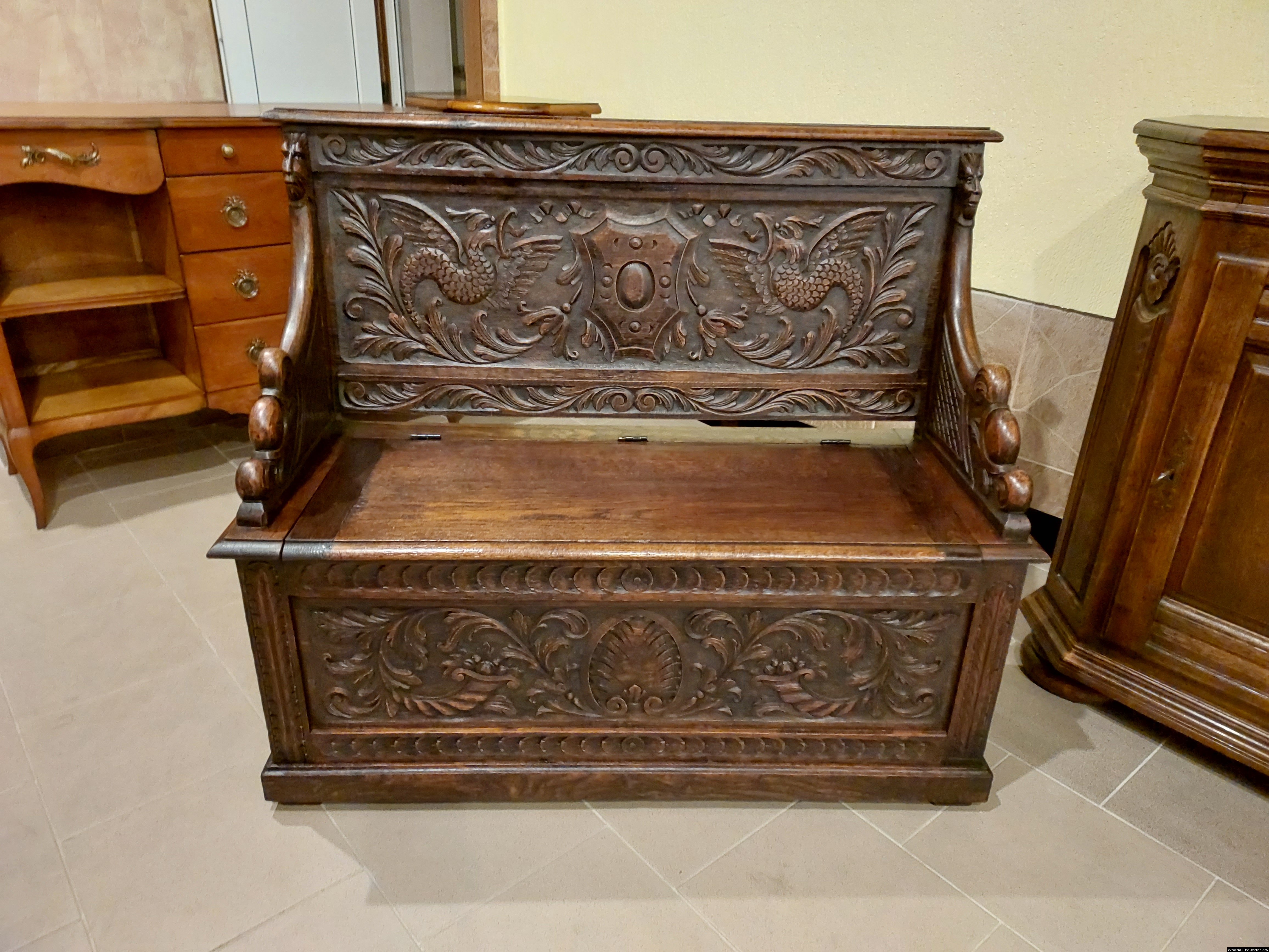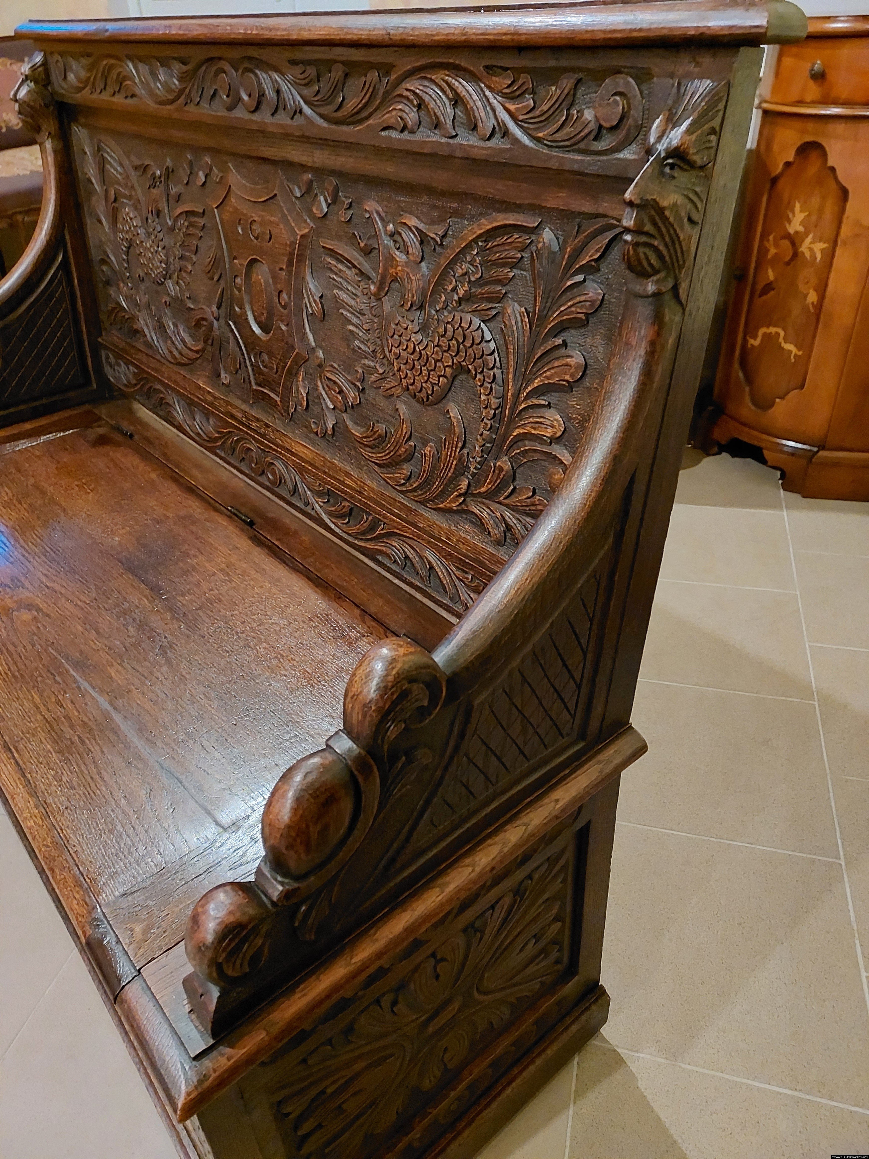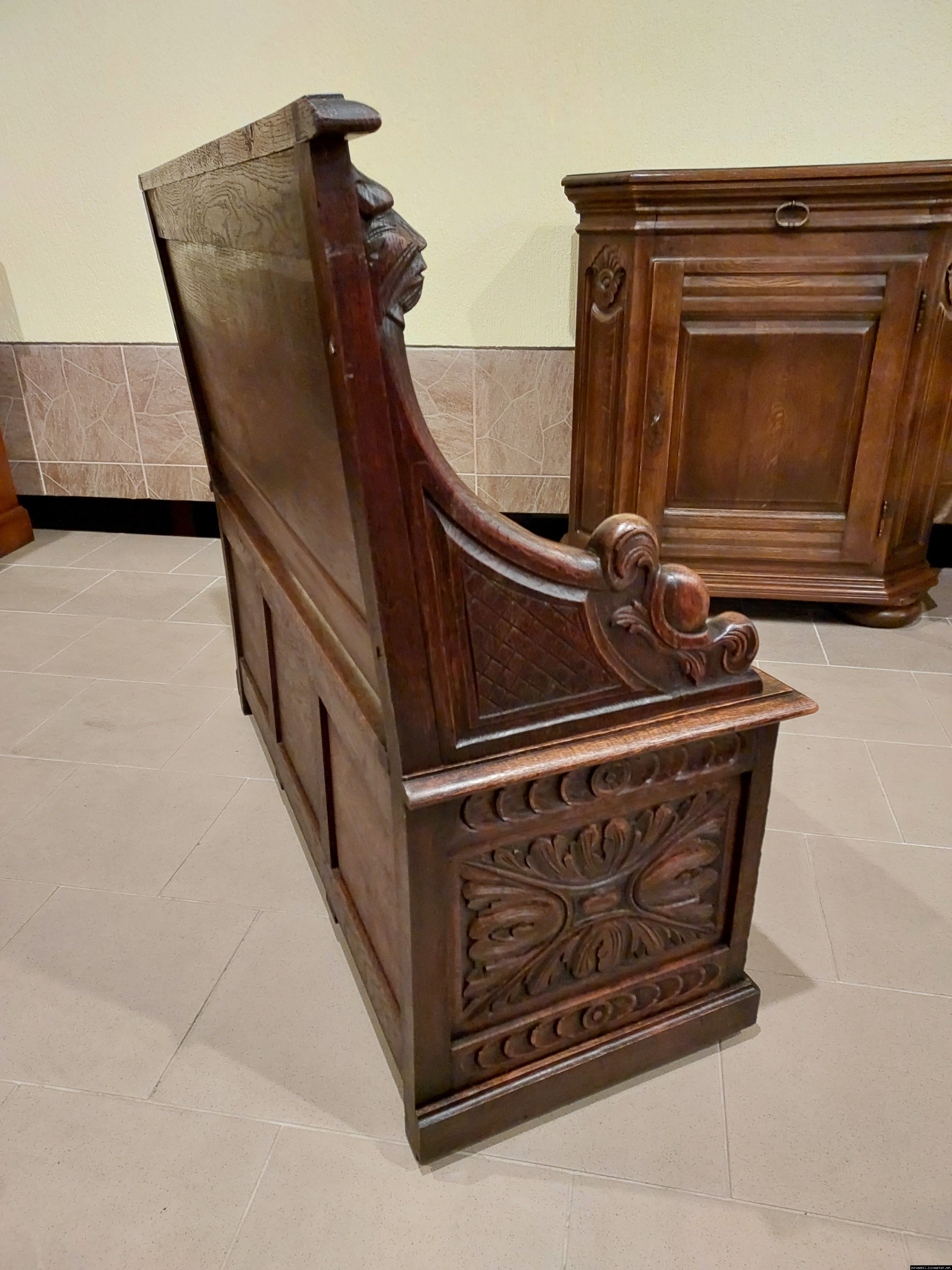 Красивий, антикварний, деревяний бомбетель- лавка. Бомбетель виготовлений з натурального дерева, темний дуб, масив, щедро декорований елементами різьби ручної роботи. Бомбетель- це лавка зі скринею під відкидною кришкою. Подейкують, що це слівце має німецьке походження, в кінці XIX століття так називали лавку- ліжко, яку деколи використовували замість скрині. Бомбетель в хорошому стані, привезений з Бельгії.