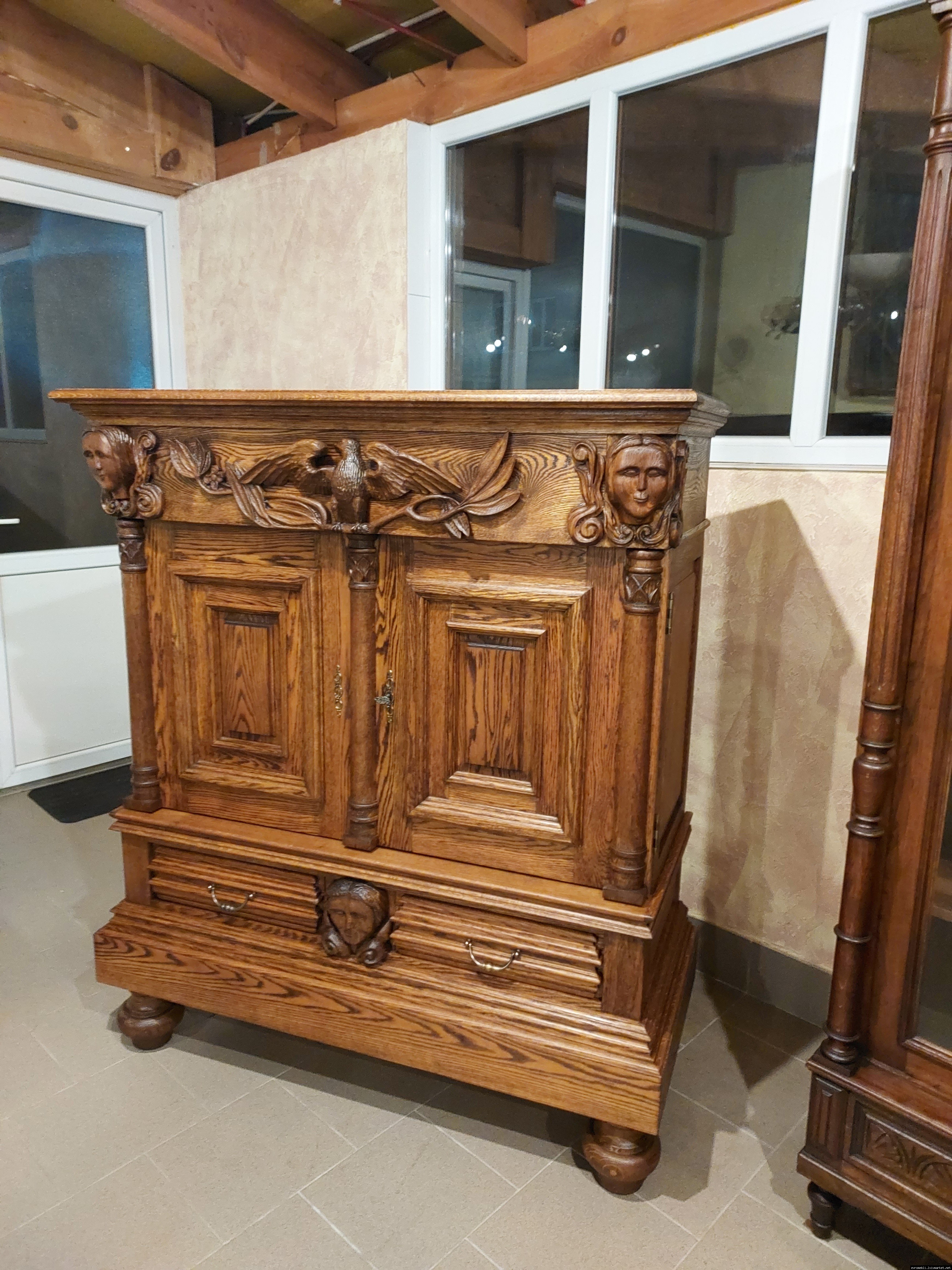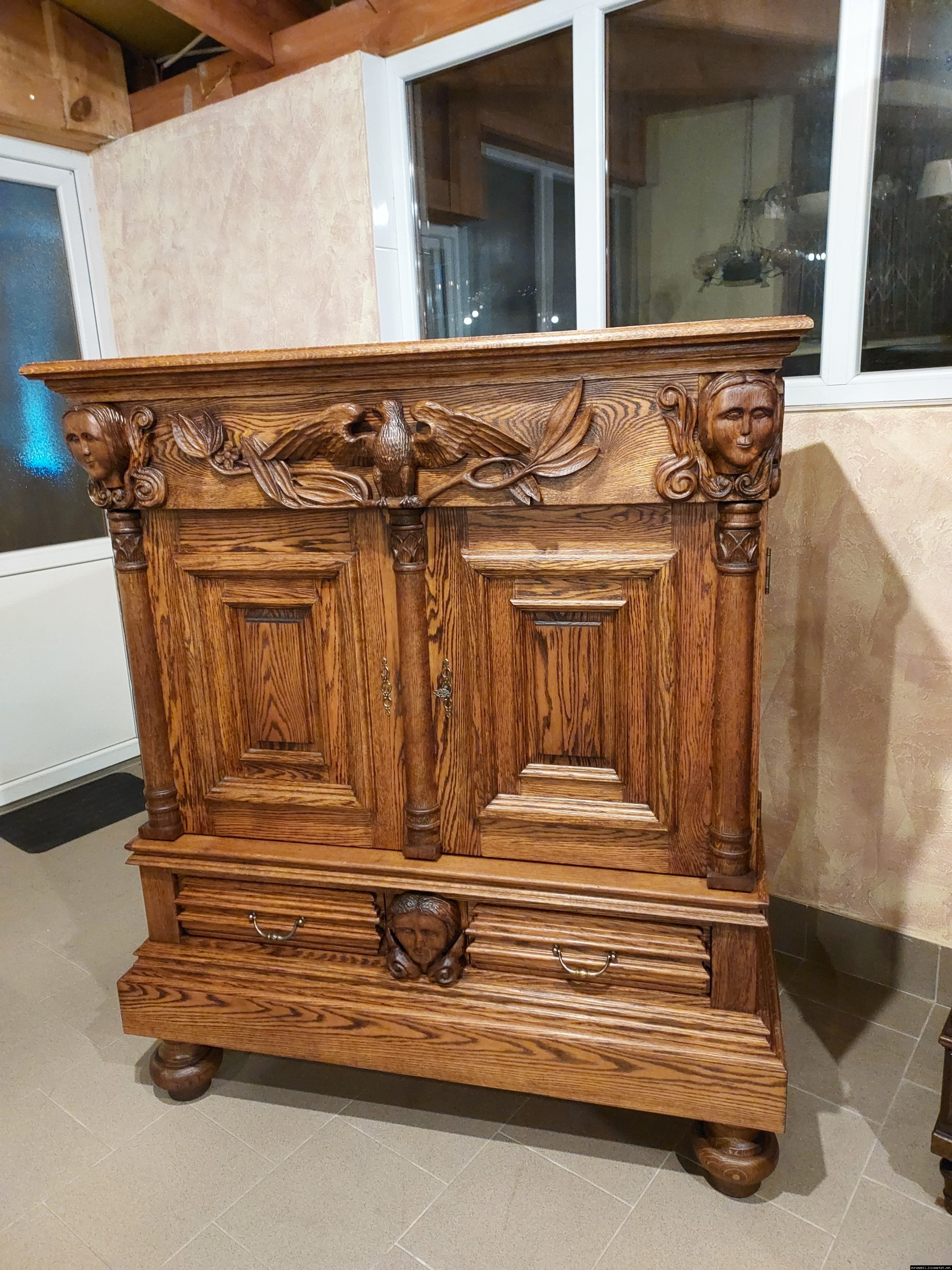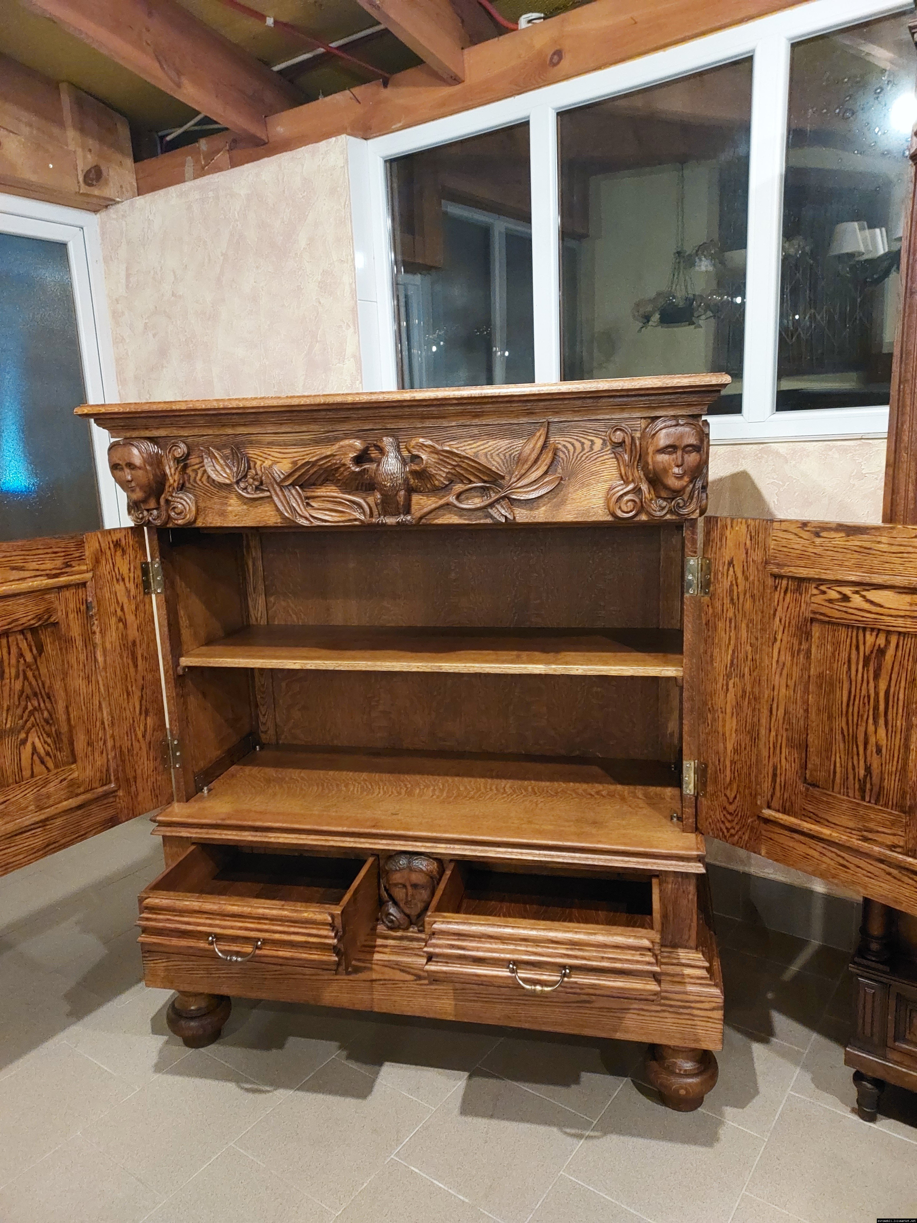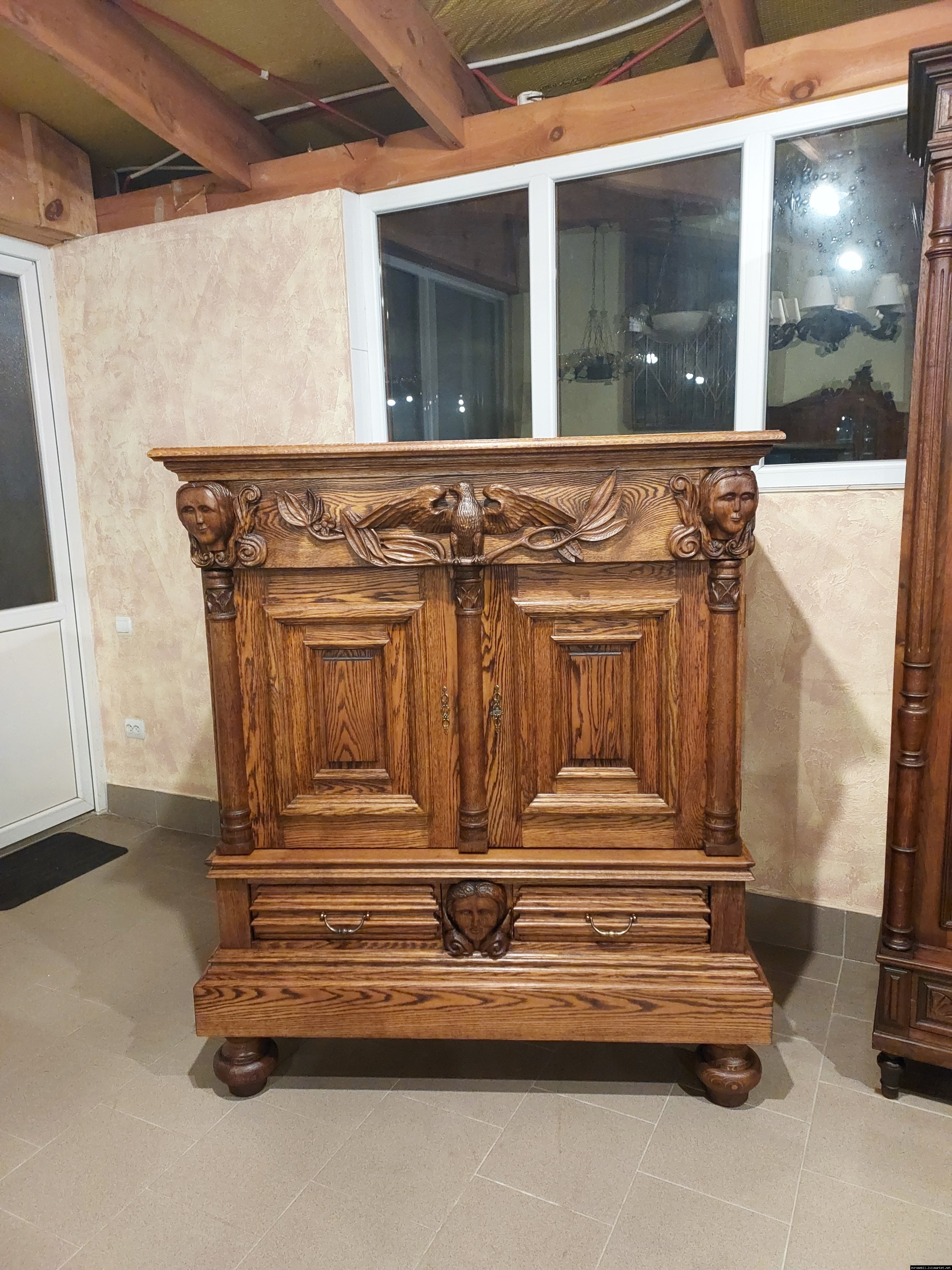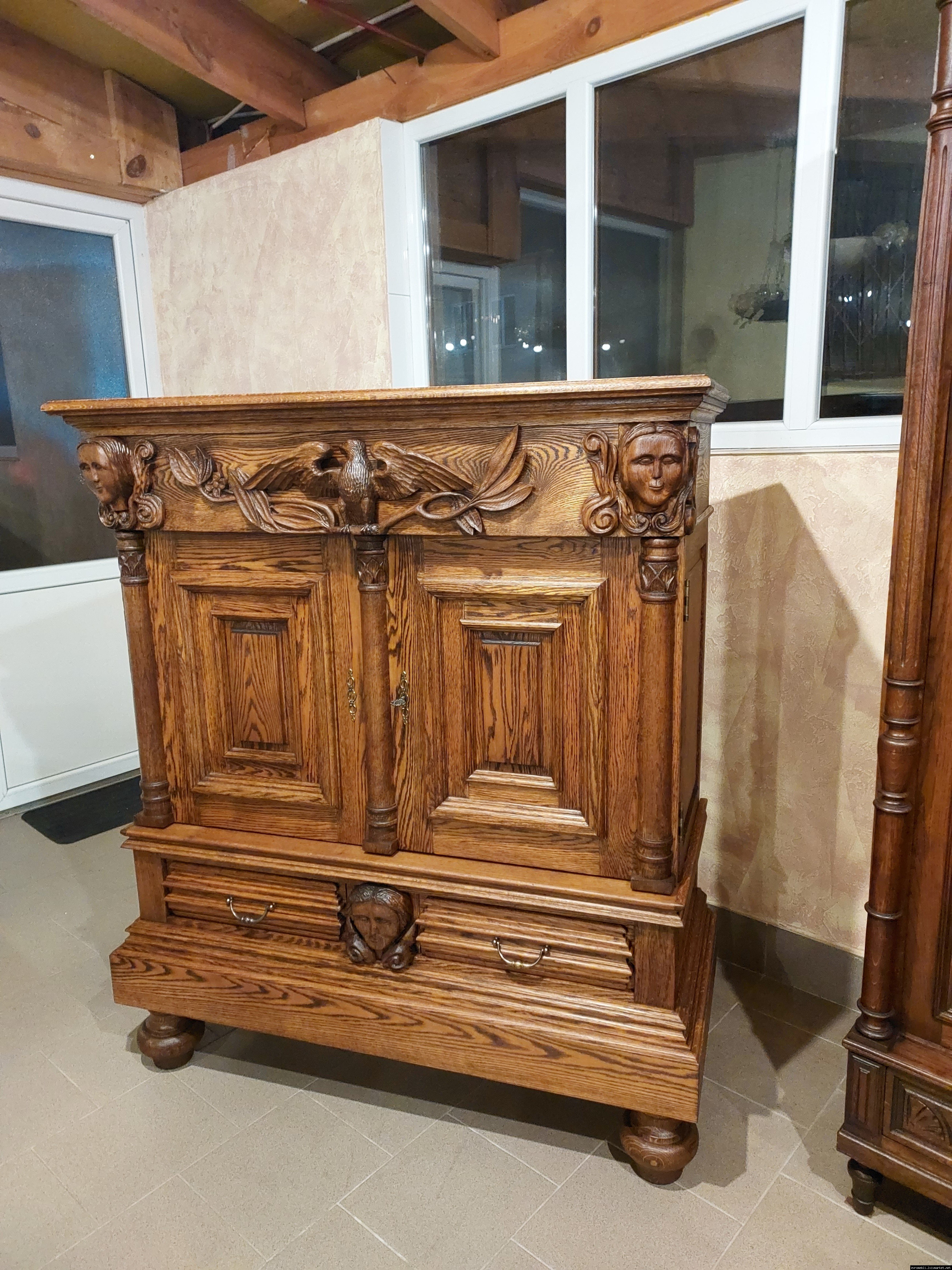 Неймовірно красивий антикварний швейцарський різьблений комод (шафа). Комод виготовлений з натурального дерева, темно- золотистий дуб, масив, з елементами масивної, ілюстраційної різьби ручної роботи, має дві дверки та дві шухляди, дверки зачиняються на ключ, всередині є деревяні полиці. Комод масивний, великий та вмістимий, в хорошому стані, привезений з Бельгії.