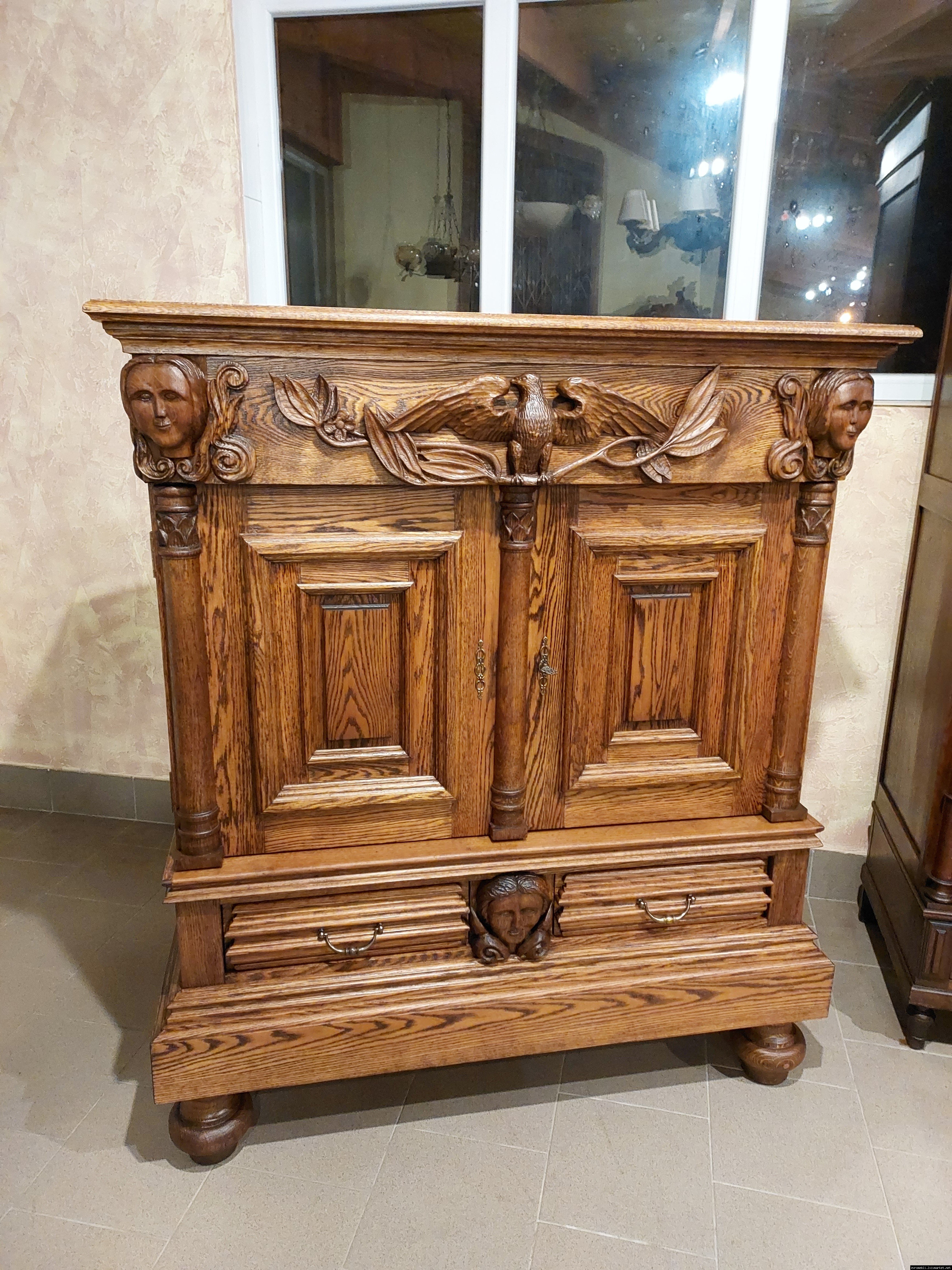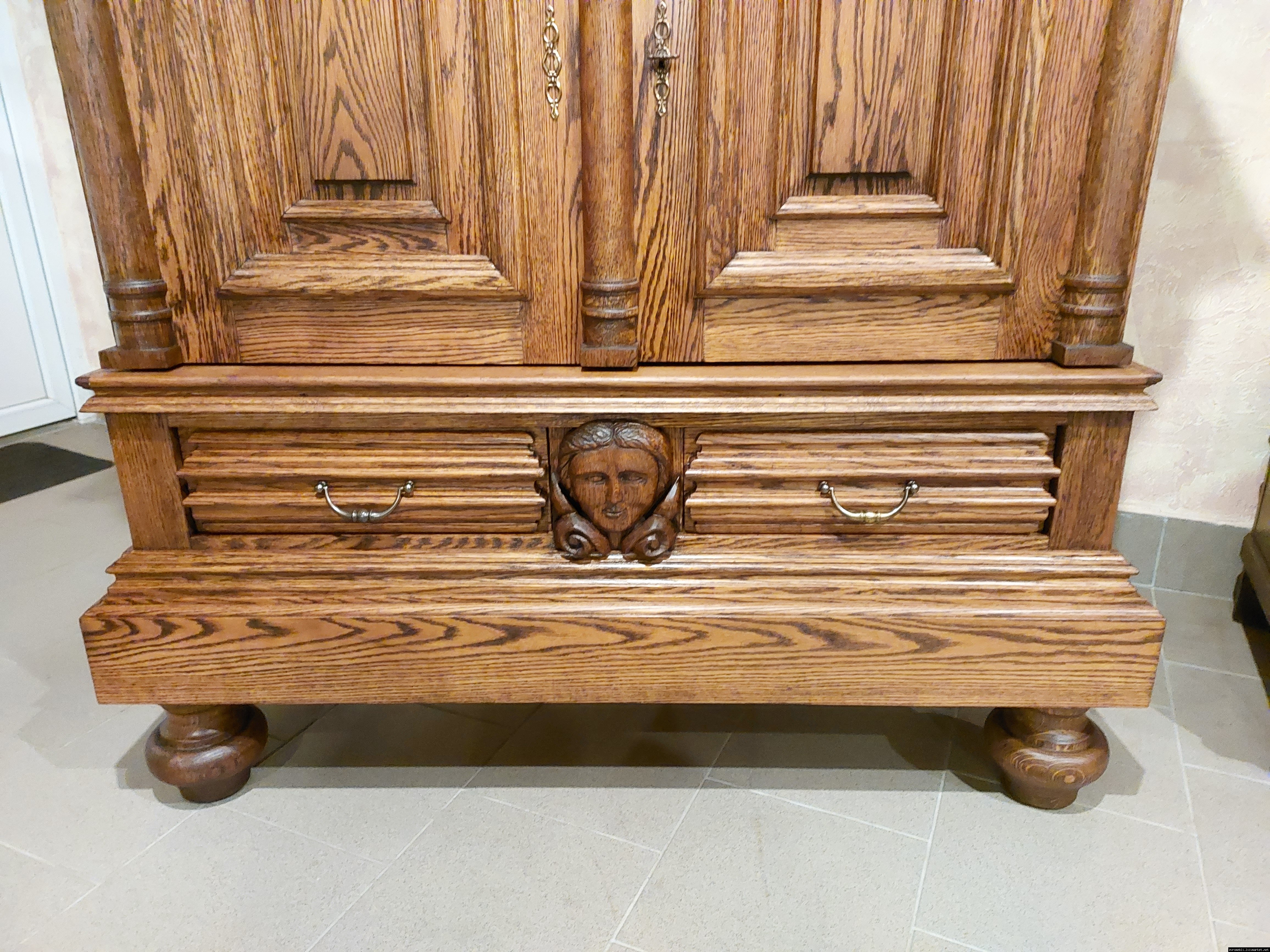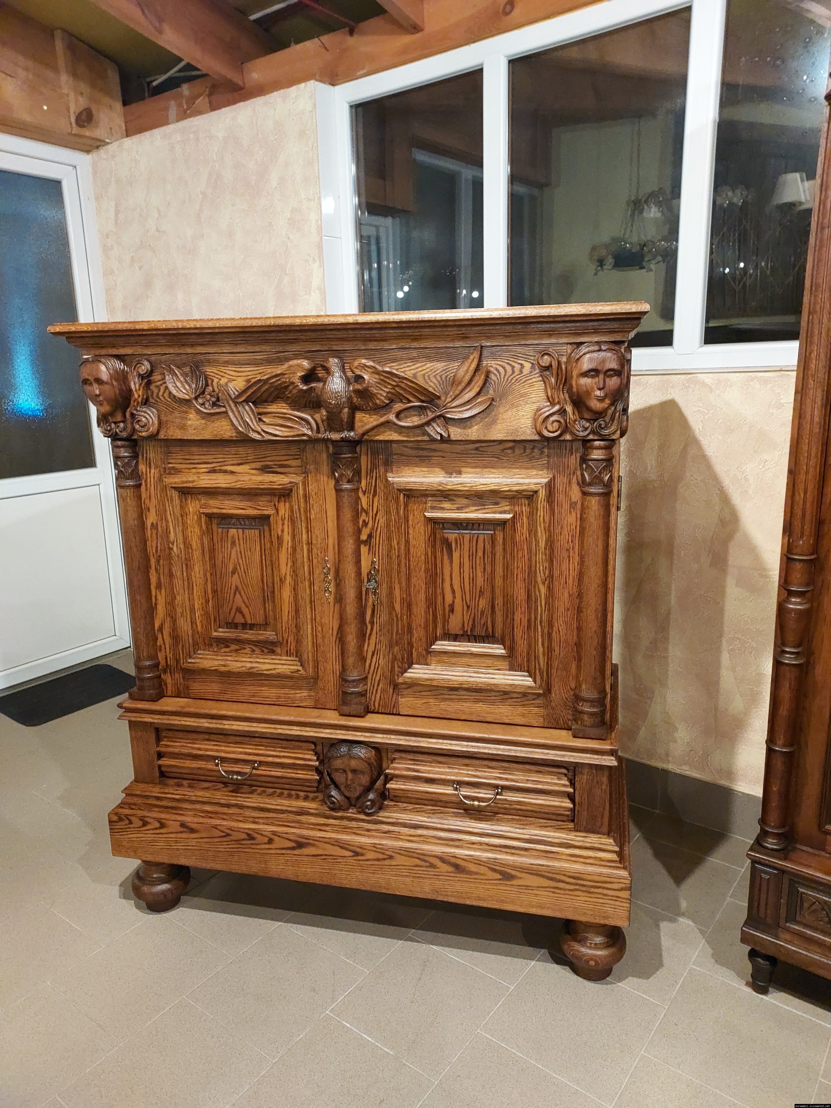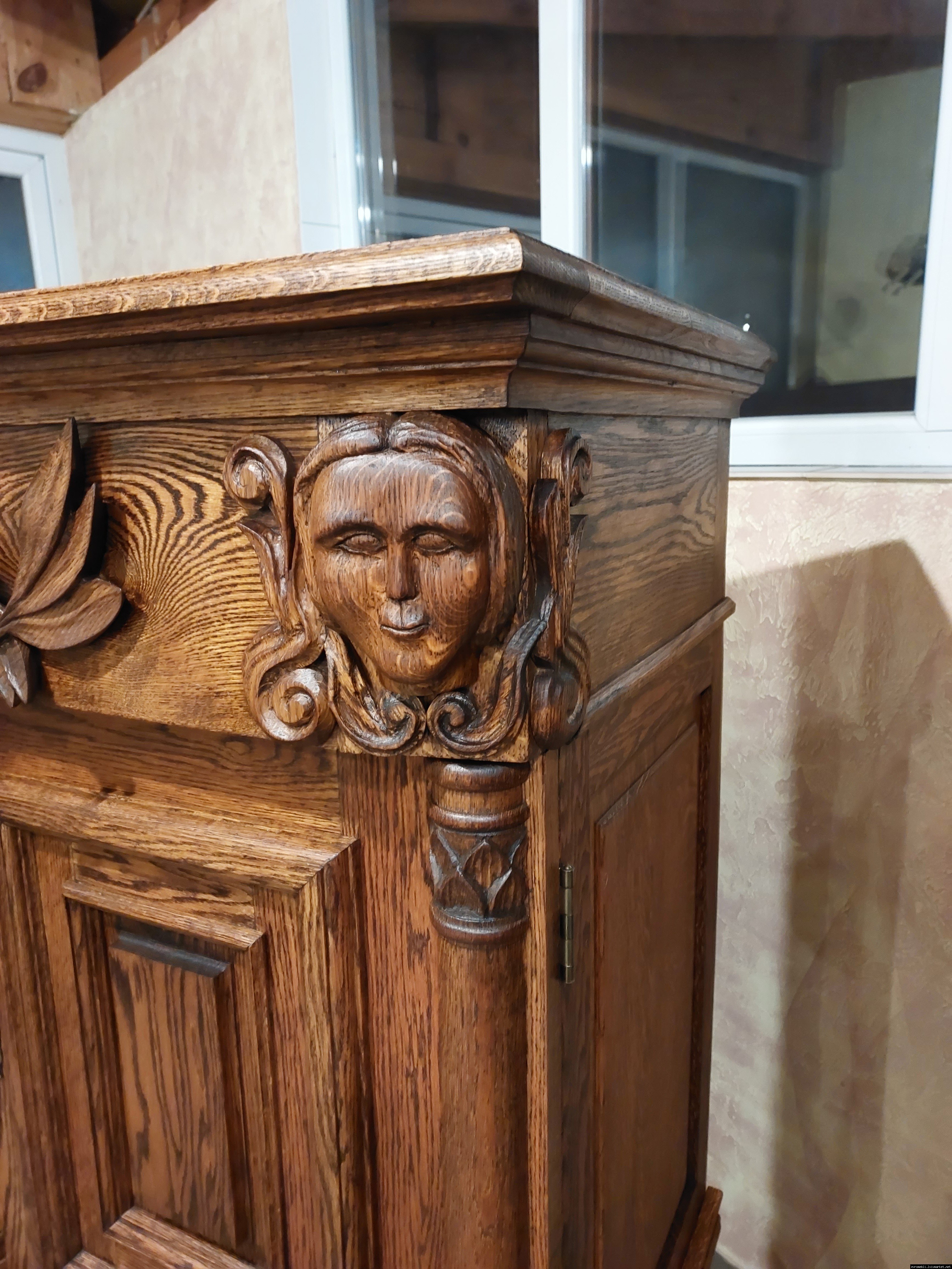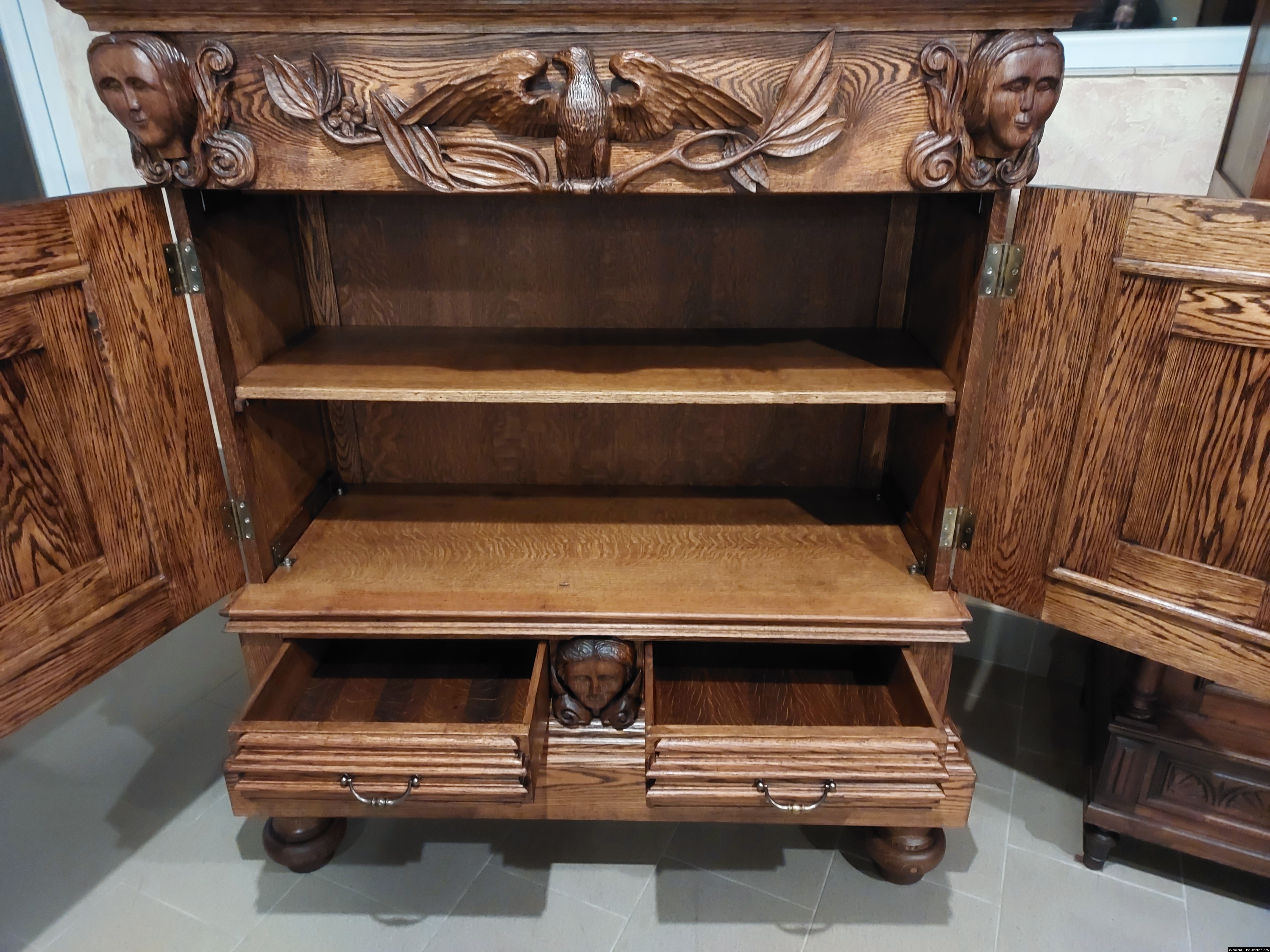 Неймовірно красивий антикварний швейцарський різьблений комод (шафа). Комод виготовлений з натурального дерева, темно- золотистий дуб, масив, з елементами масивної, ілюстраційної різьби ручної роботи, має дві дверки та дві шухляди, дверки зачиняються на ключ, всередині є деревяні полиці. Комод масивний, великий та вмістимий, в хорошому стані, привезений з Бельгії.