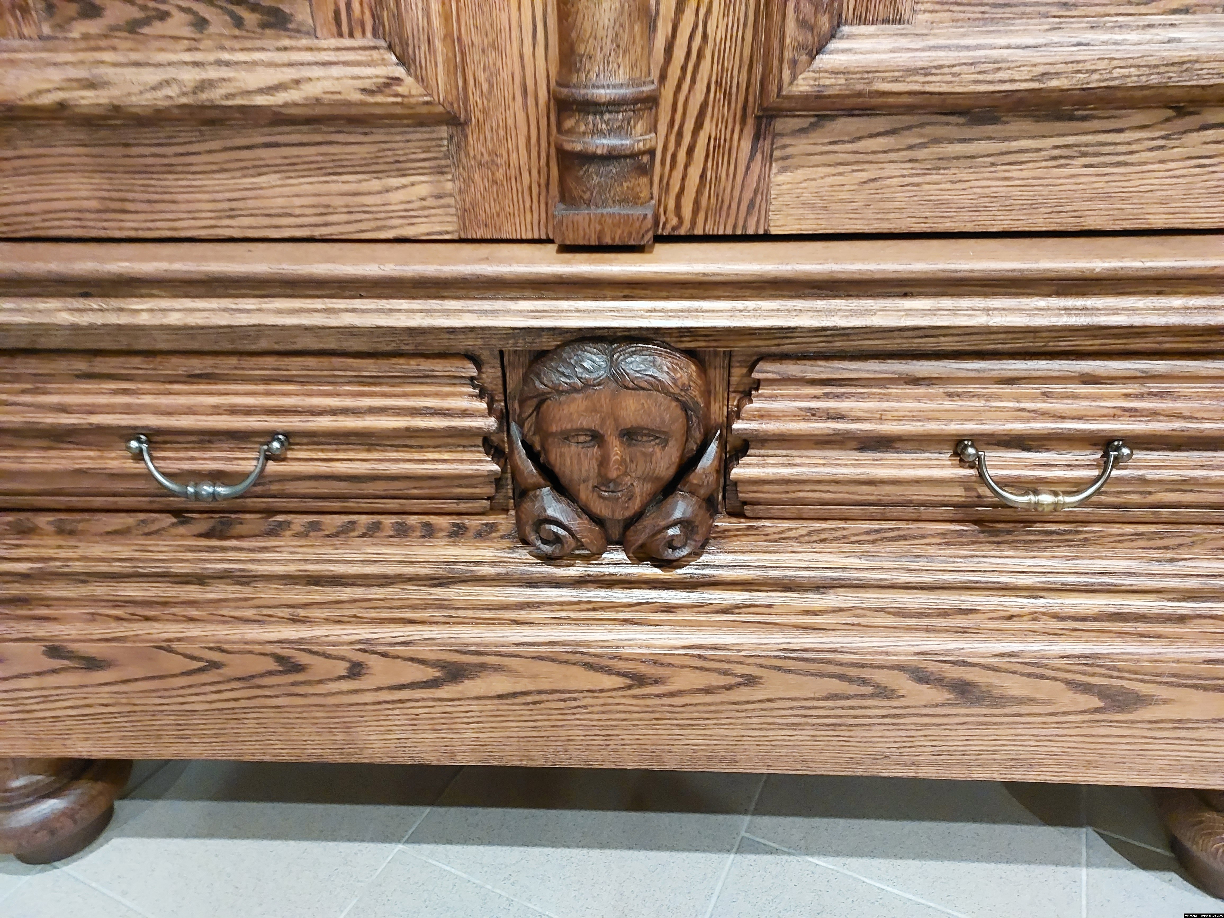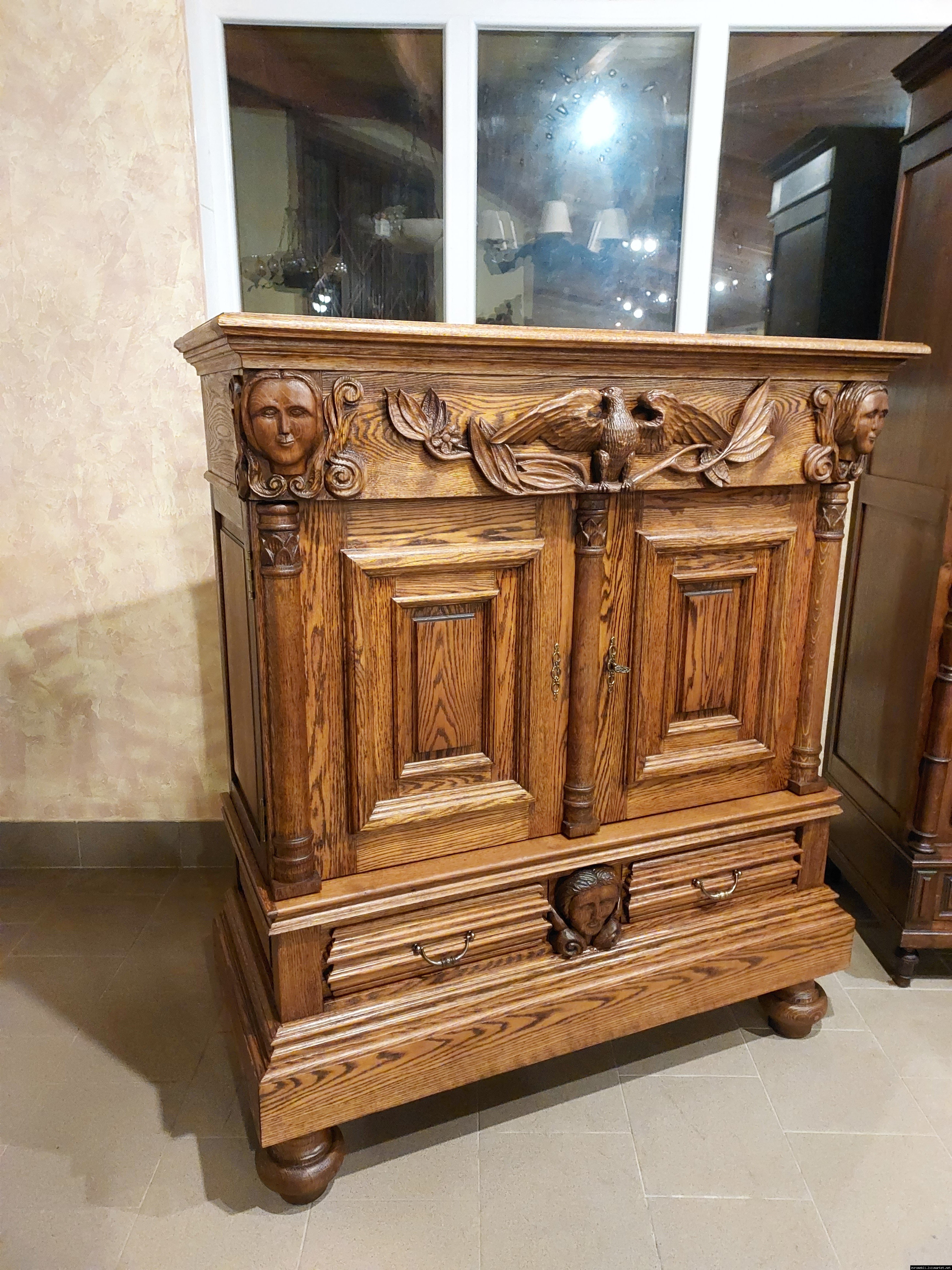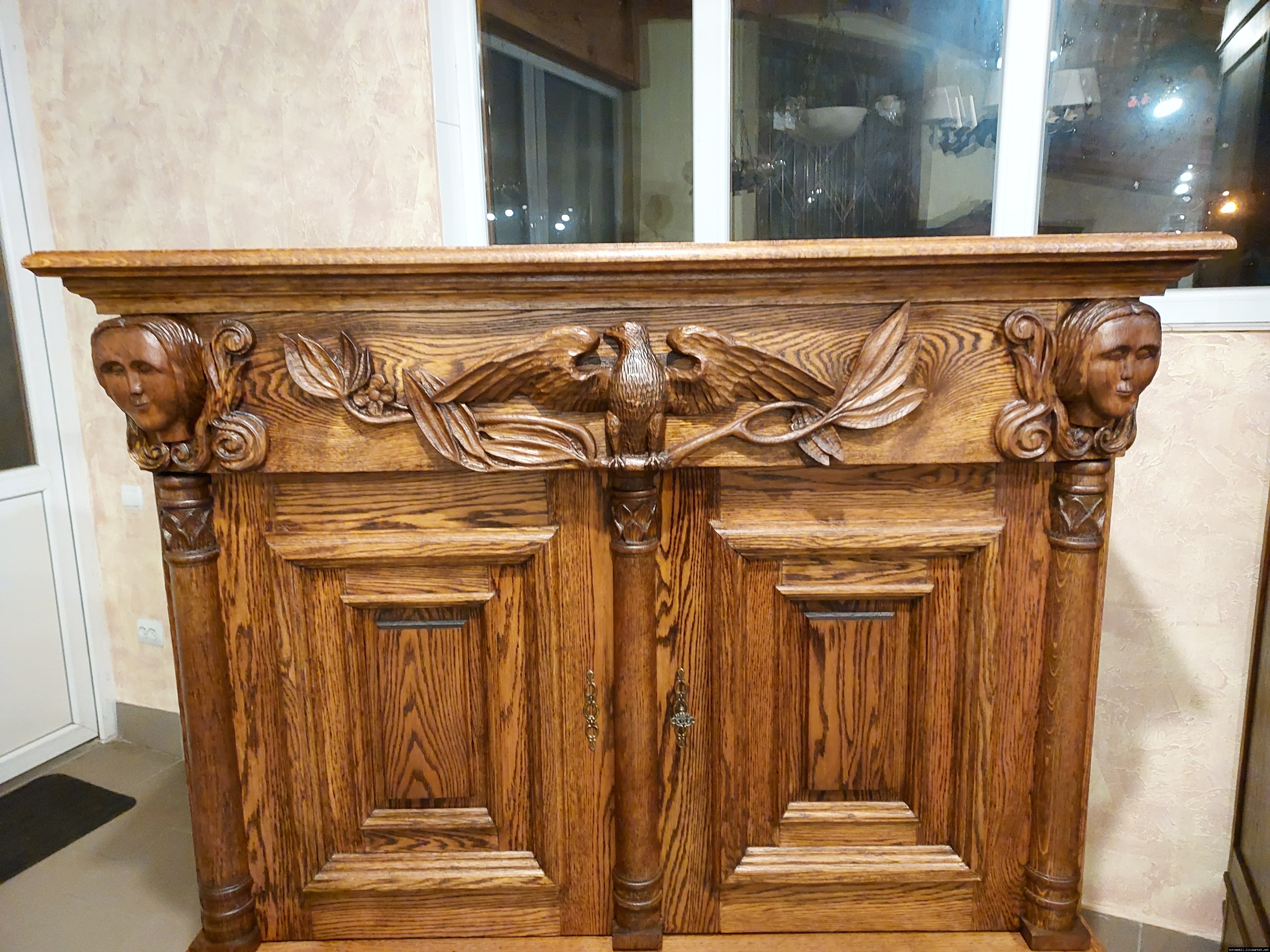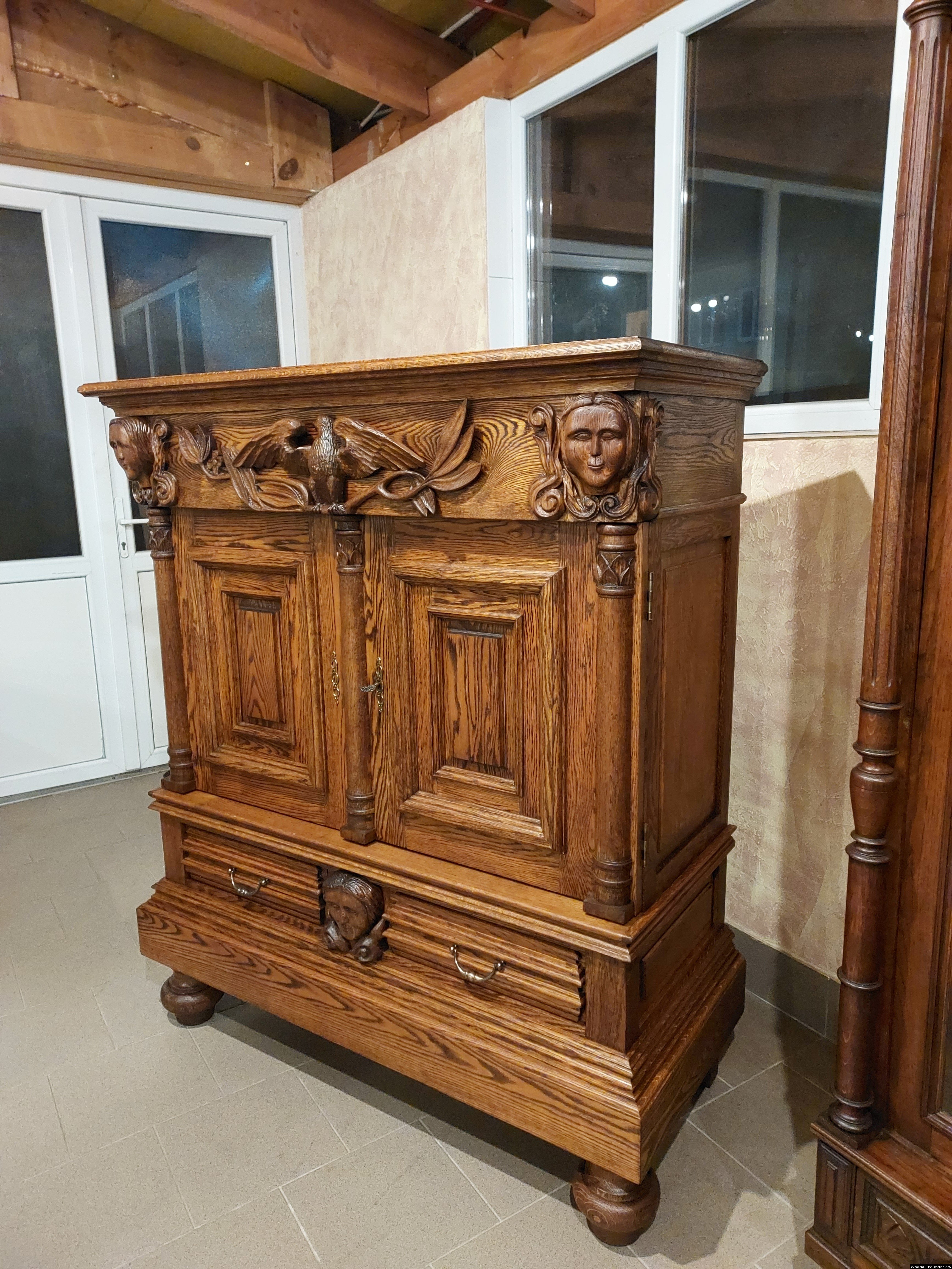 Неймовірно красивий антикварний швейцарський різьблений комод (шафа). Комод виготовлений з натурального дерева, темно- золотистий дуб, масив, з елементами масивної, ілюстраційної різьби ручної роботи, має дві дверки та дві шухляди, дверки зачиняються на ключ, всередині є деревяні полиці. Комод масивний, великий та вмістимий, в хорошому стані, привезений з Бельгії.