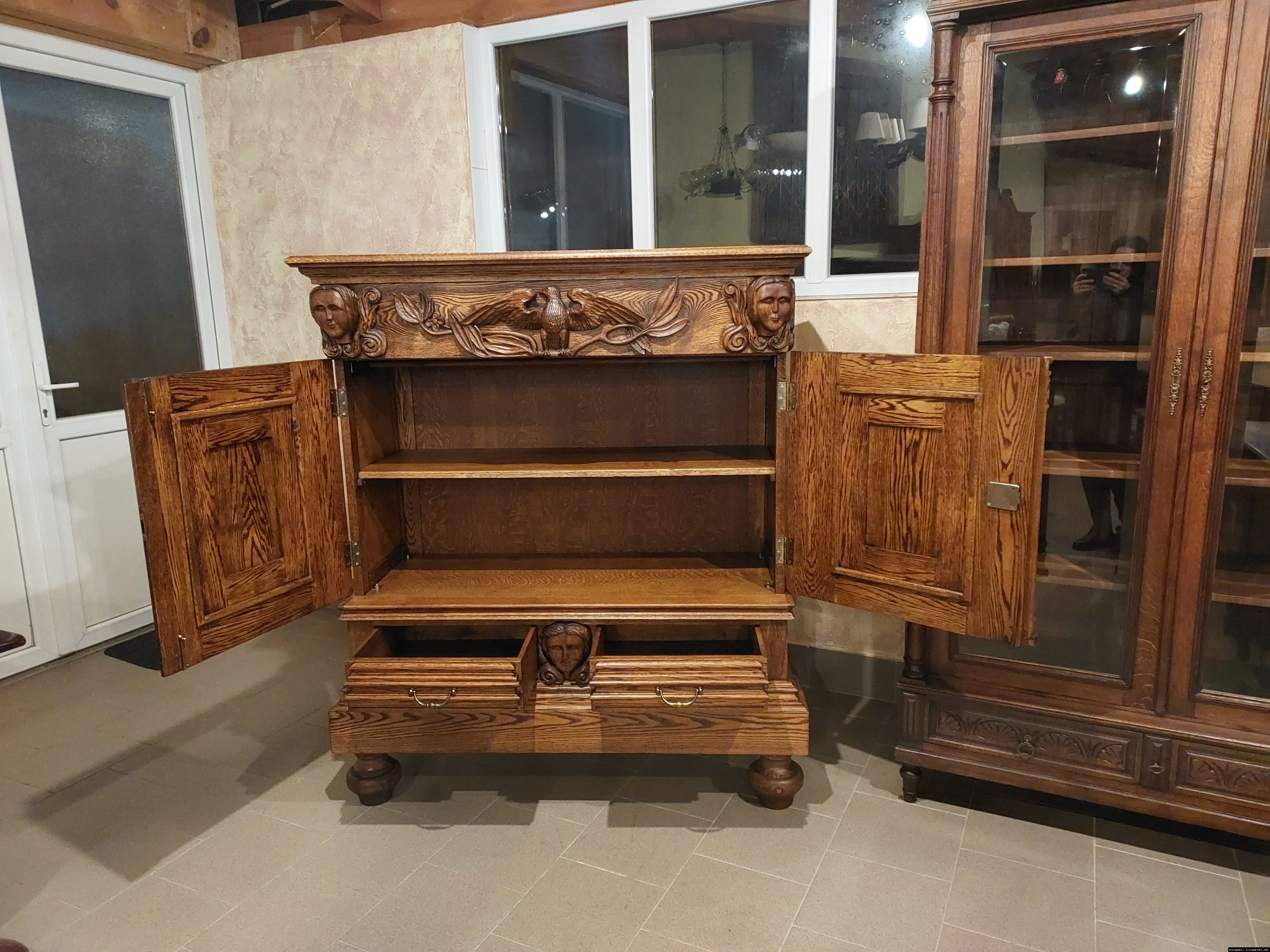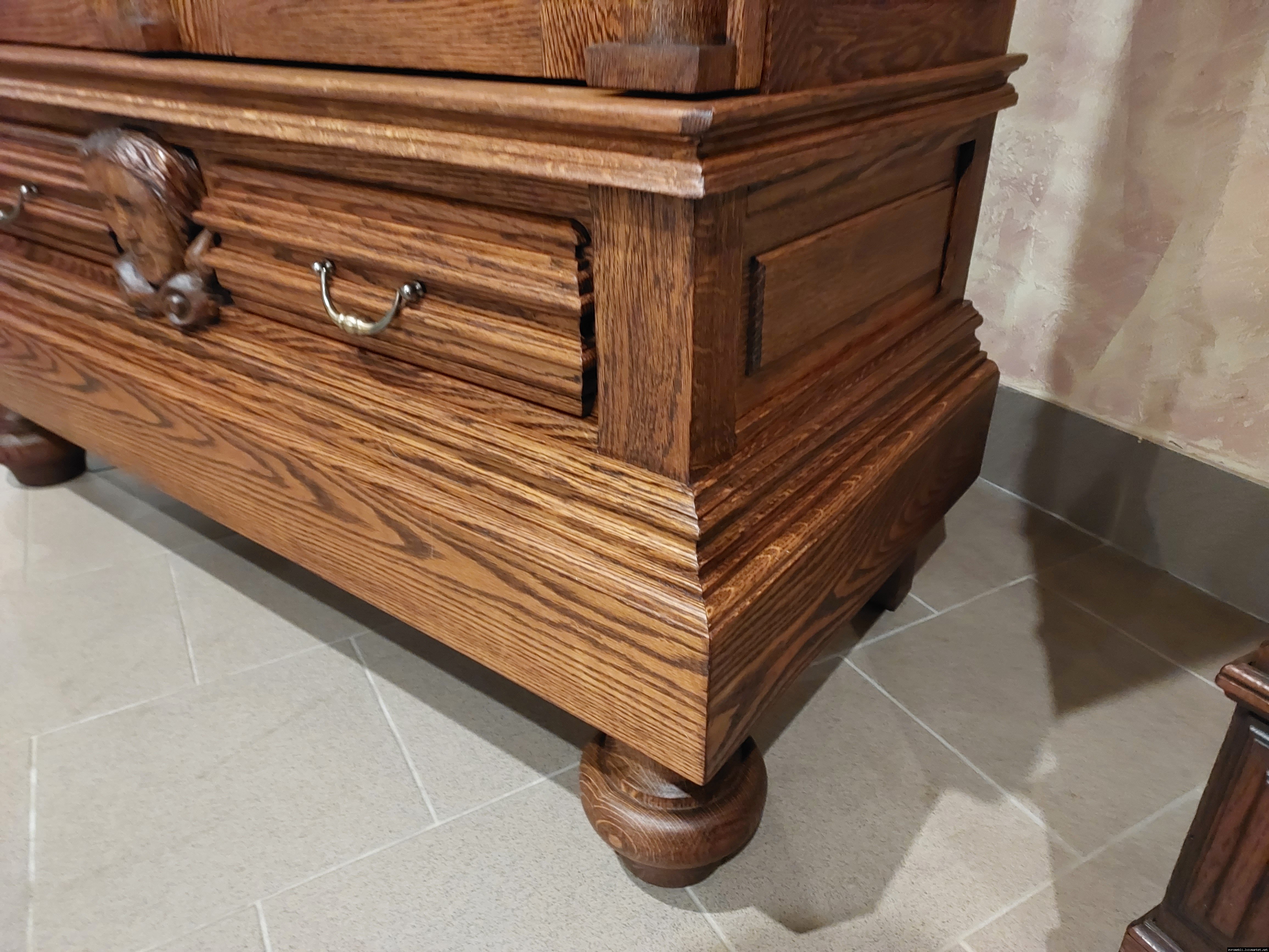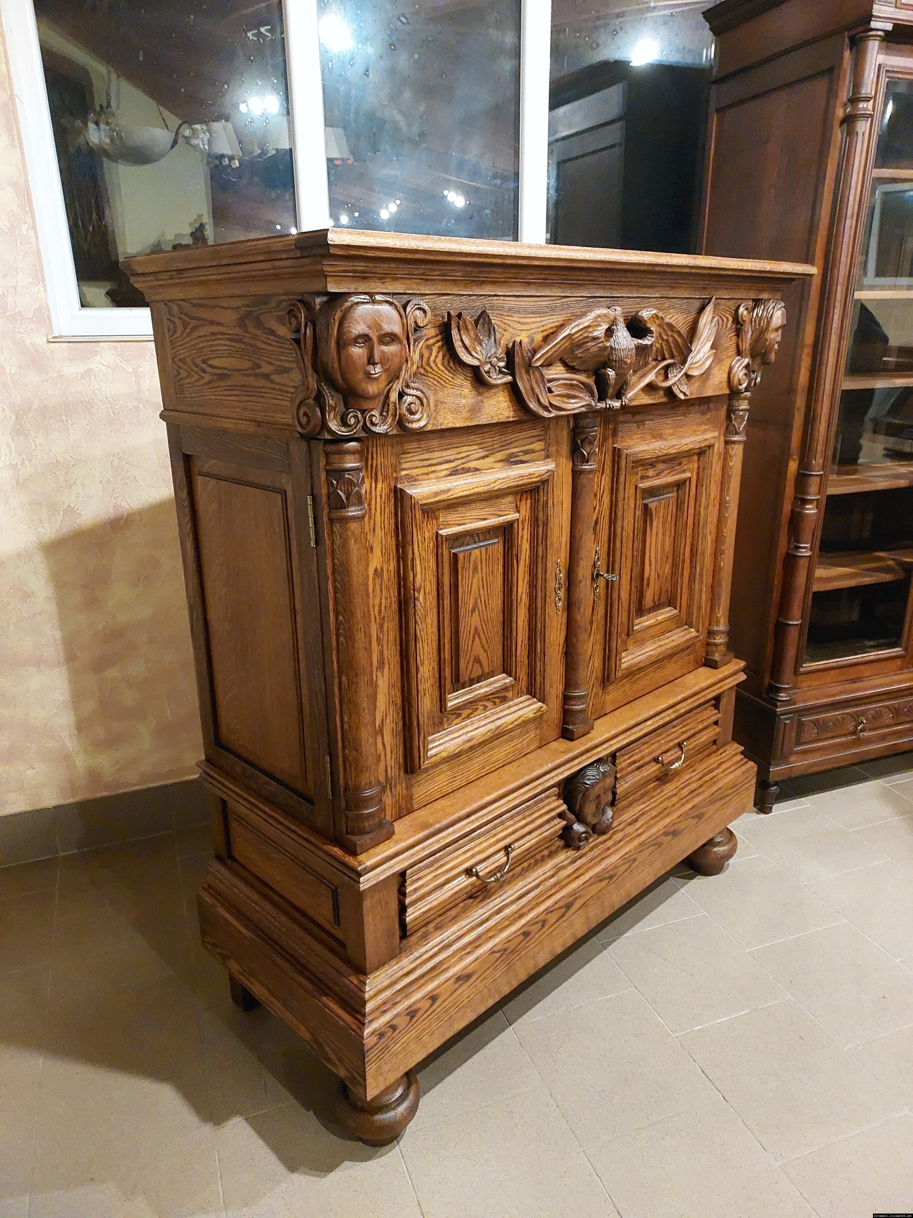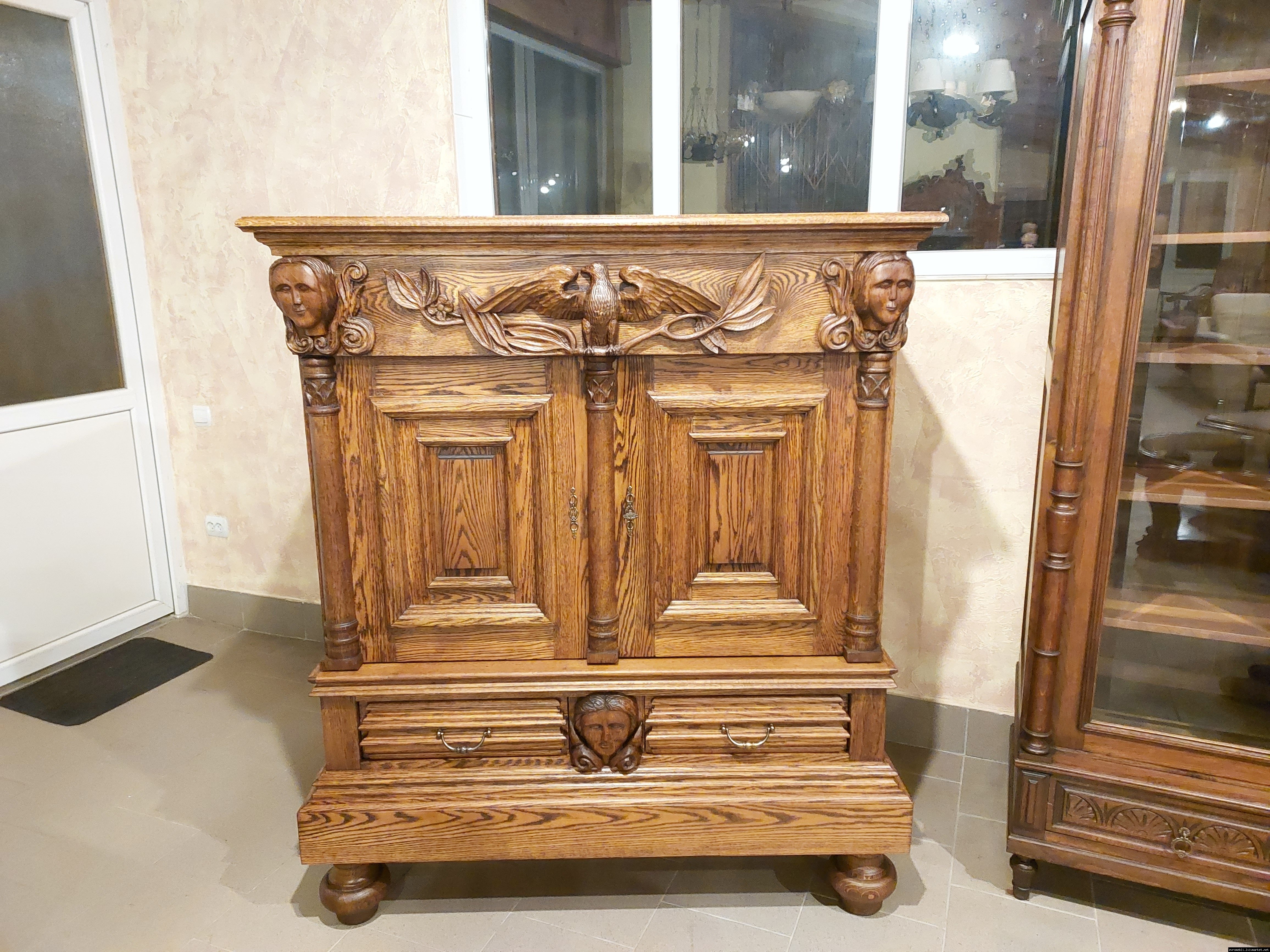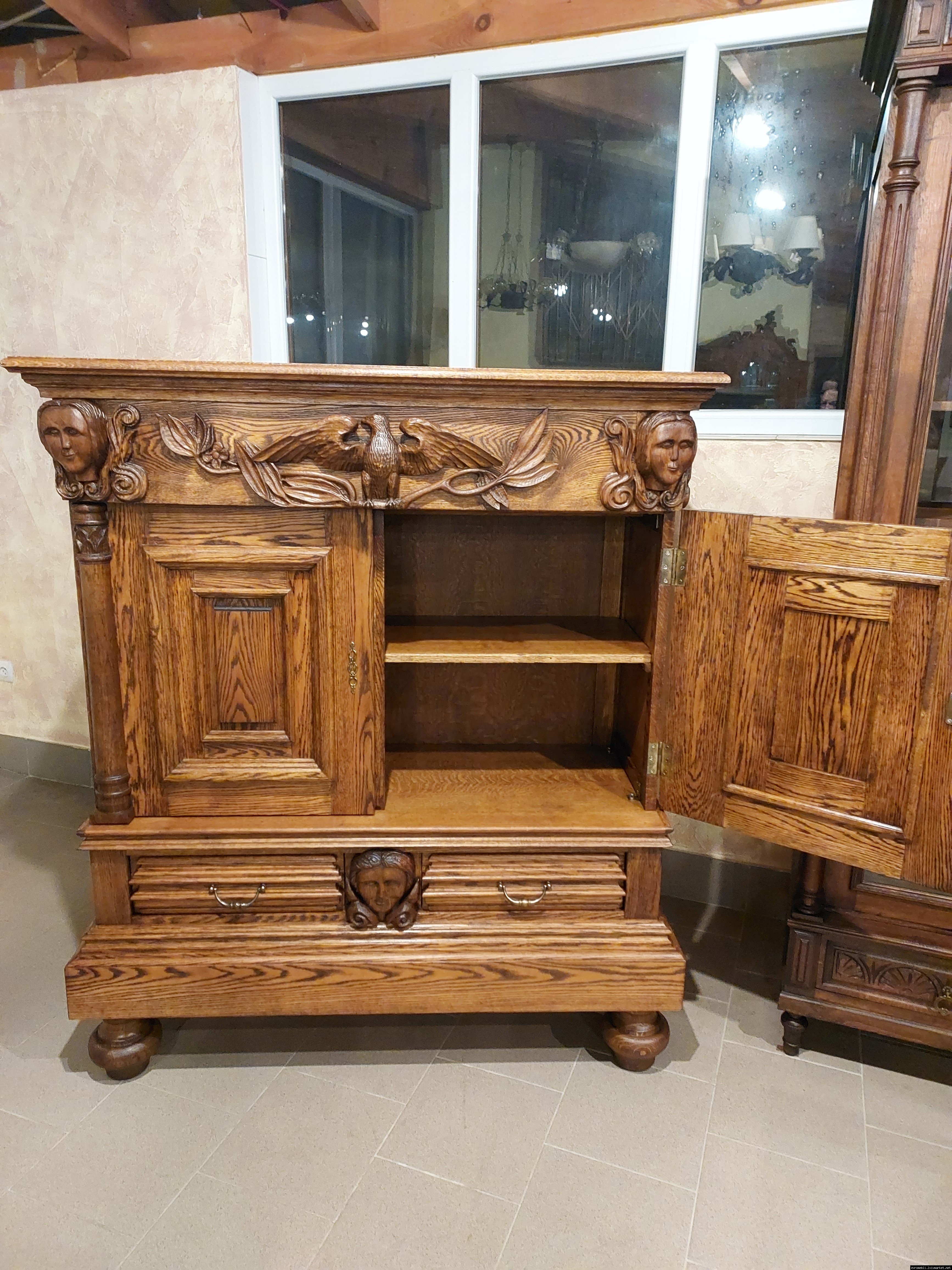 Неймовірно красивий антикварний швейцарський різьблений комод (шафа). Комод виготовлений з натурального дерева, темно- золотистий дуб, масив, з елементами масивної, ілюстраційної різьби ручної роботи, має дві дверки та дві шухляди, дверки зачиняються на ключ, всередині є деревяні полиці. Комод масивний, великий та вмістимий, в хорошому стані, привезений з Бельгії.