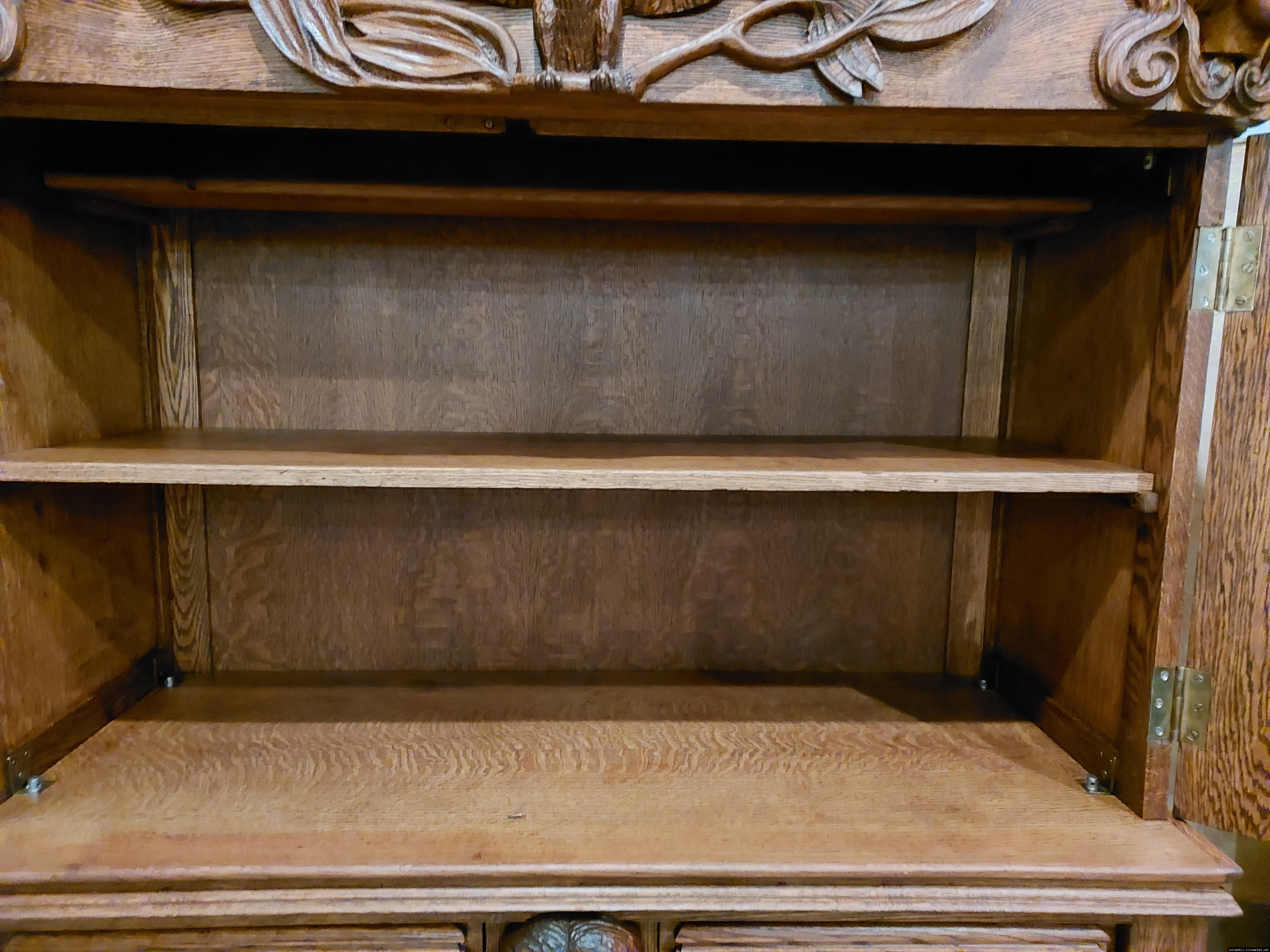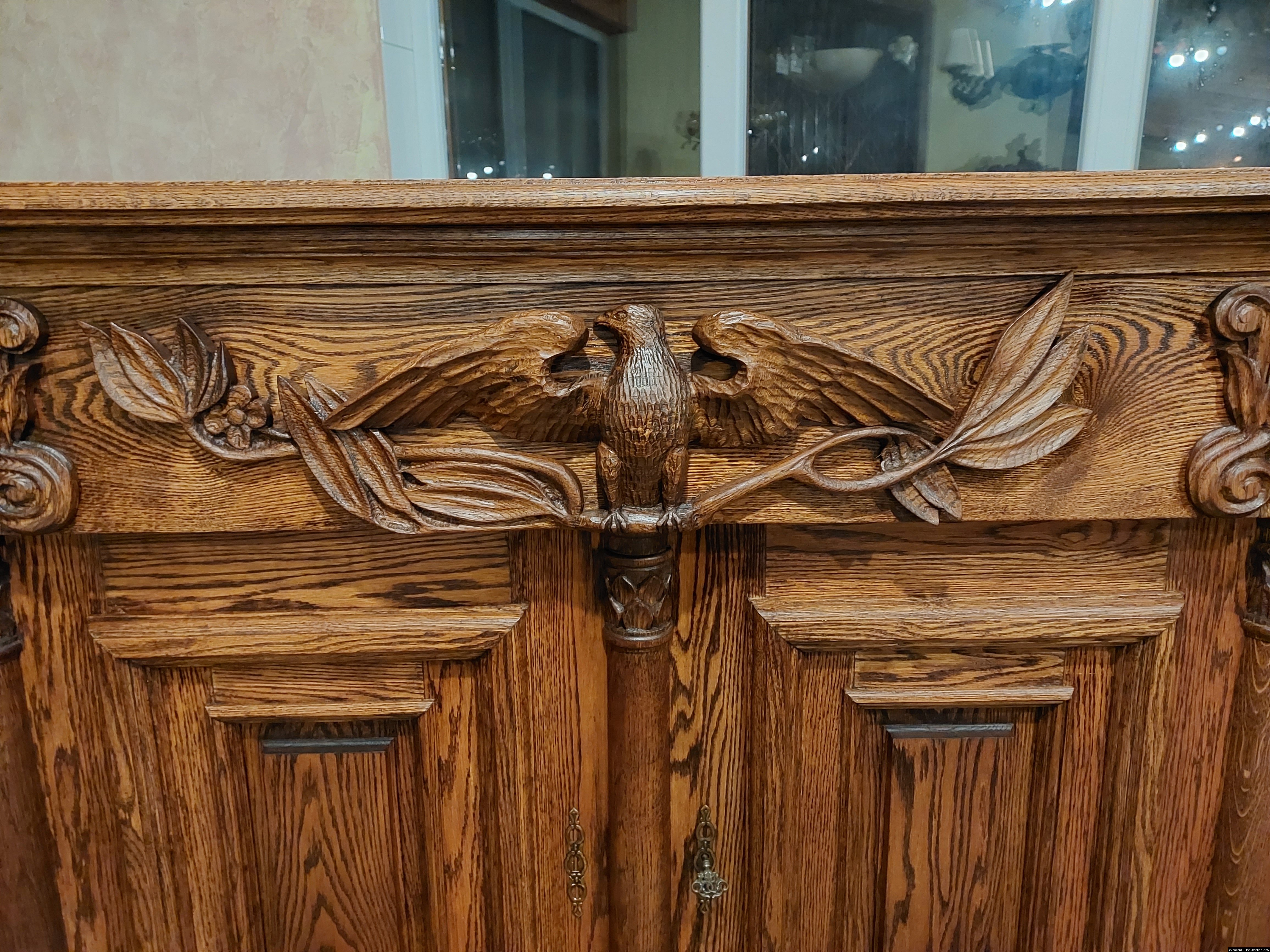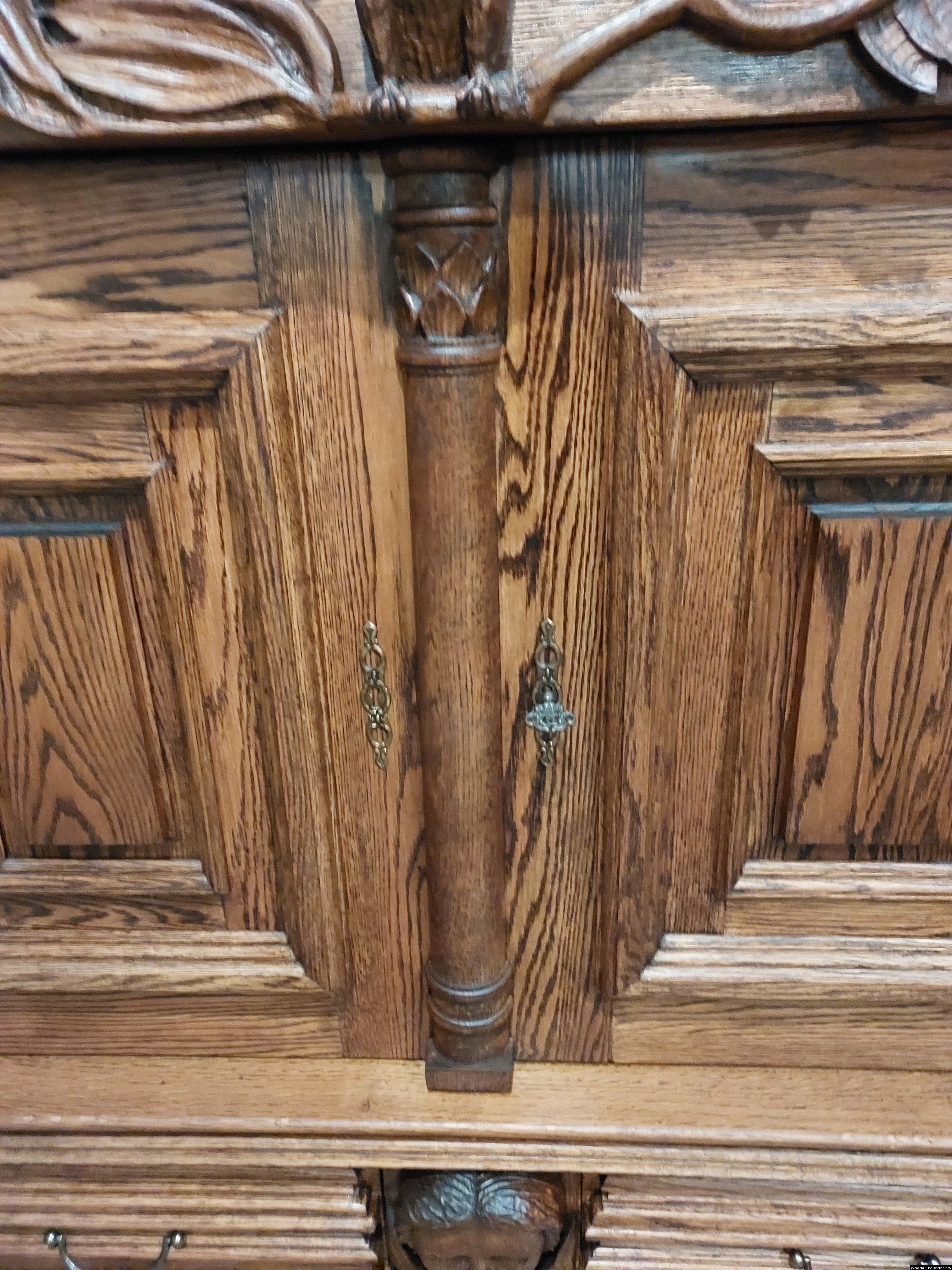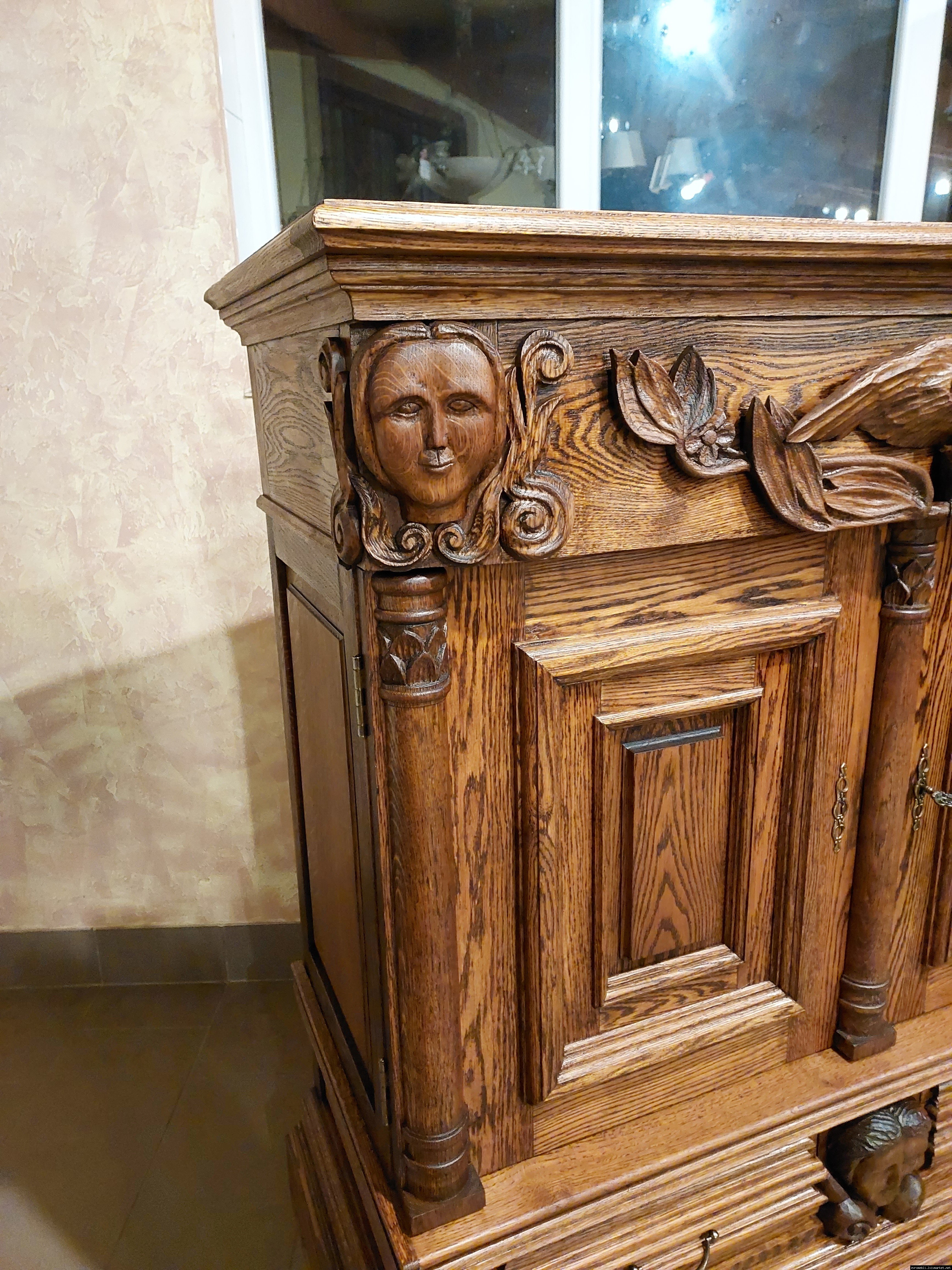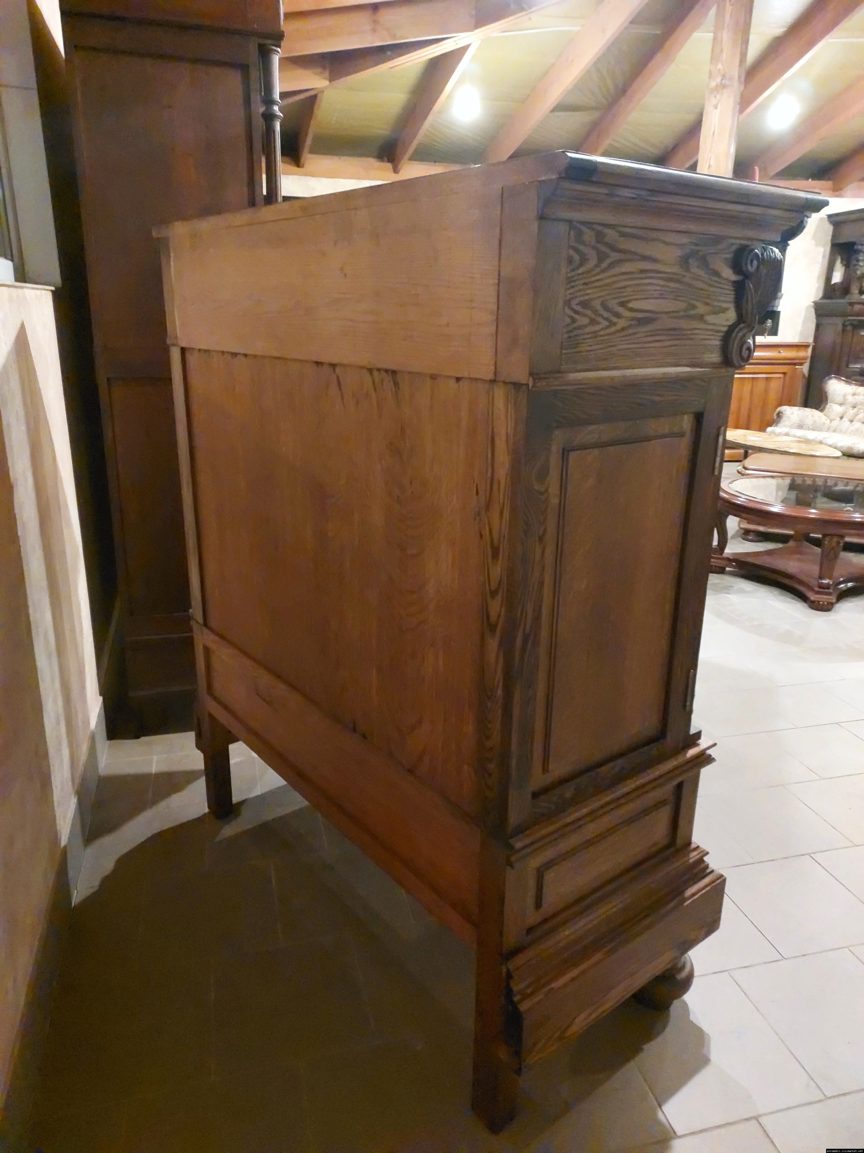 Неймовірно красивий антикварний швейцарський різьблений комод (шафа). Комод виготовлений з натурального дерева, темно- золотистий дуб, масив, з елементами масивної, ілюстраційної різьби ручної роботи, має дві дверки та дві шухляди, дверки зачиняються на ключ, всередині є деревяні полиці. Комод масивний, великий та вмістимий, в хорошому стані, привезений з Бельгії.