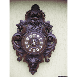 декорований елементами різьби ручної роботи. Годинник механічний, з маятником, заводиться на ключ, з