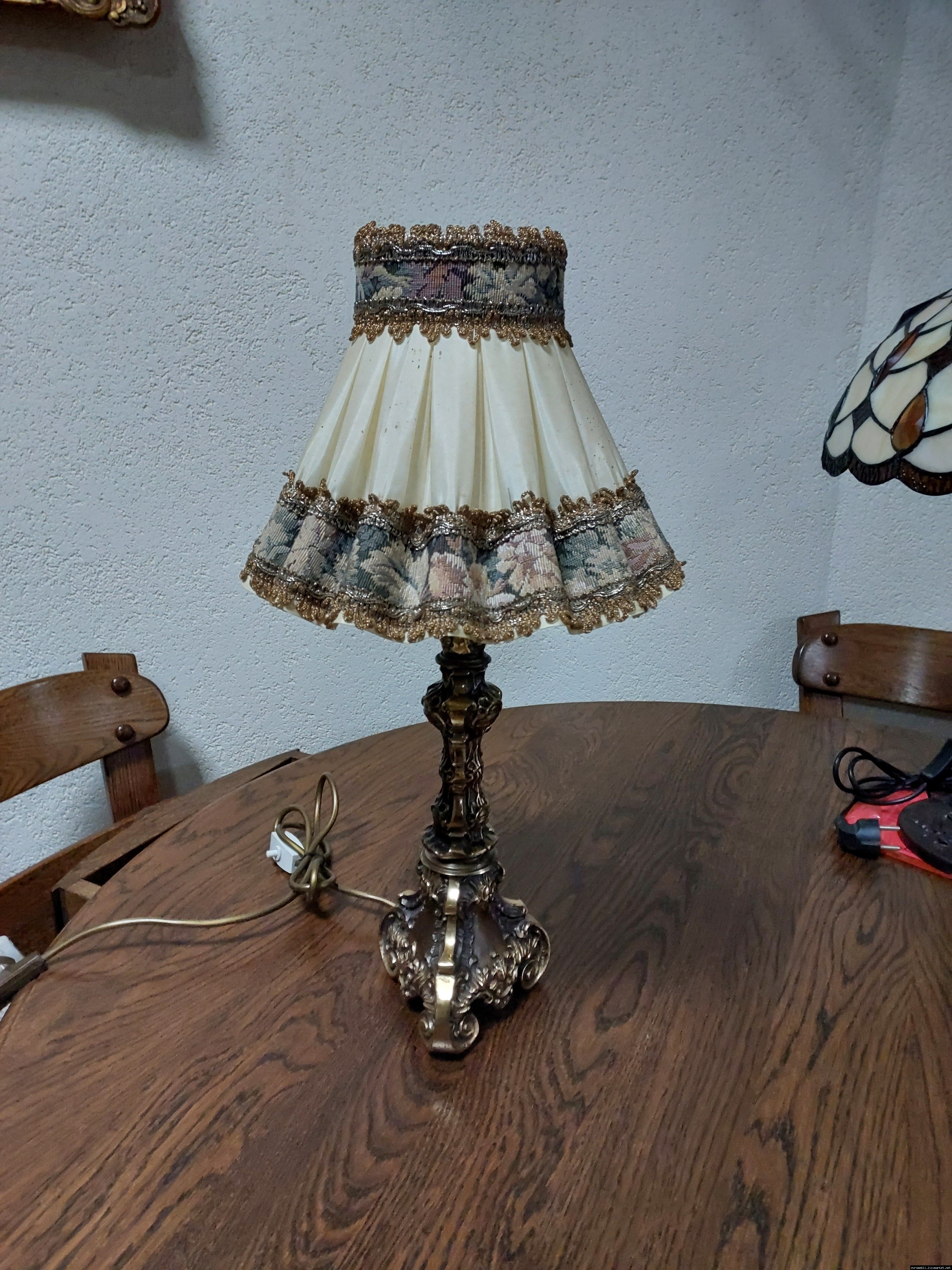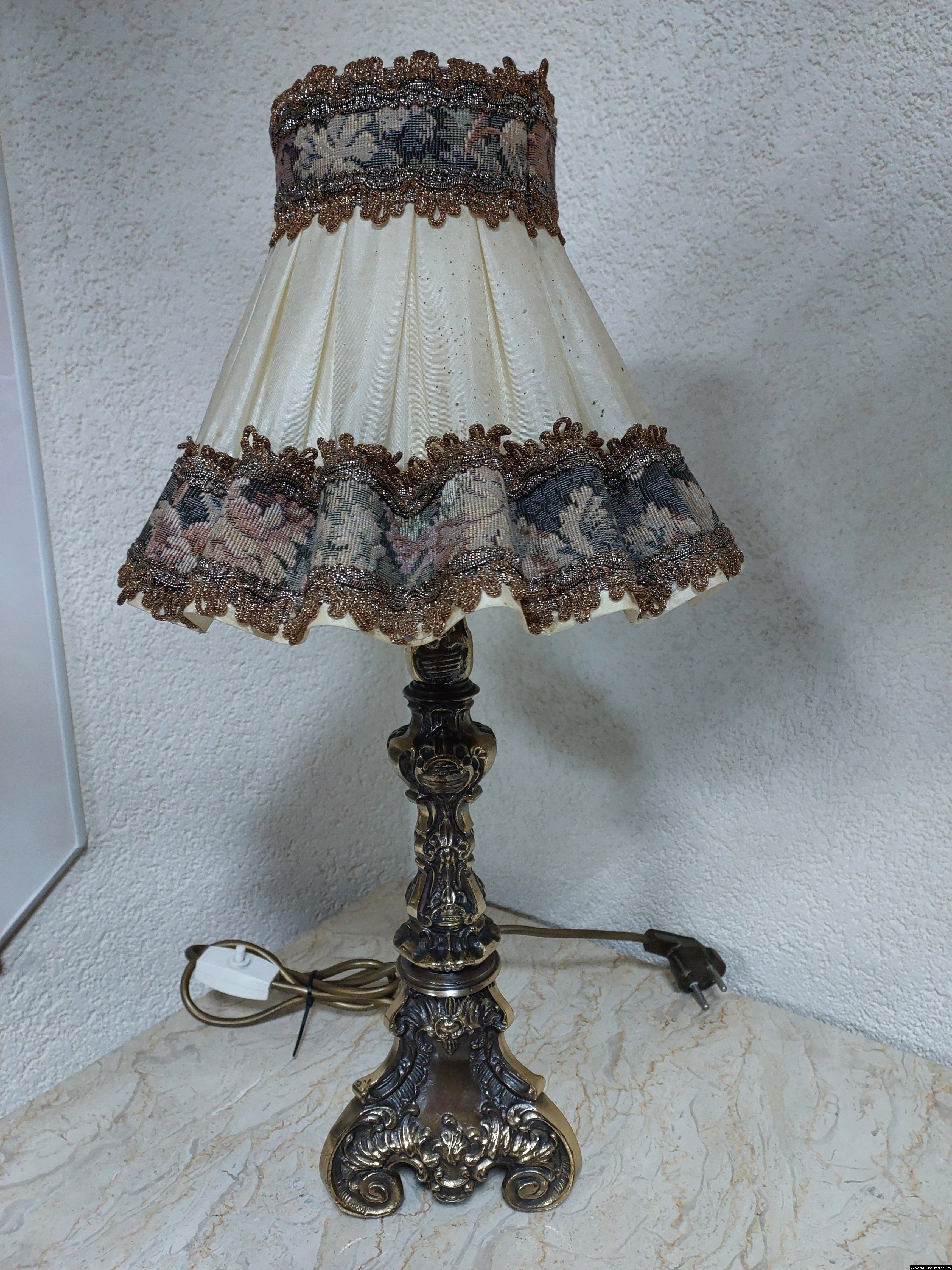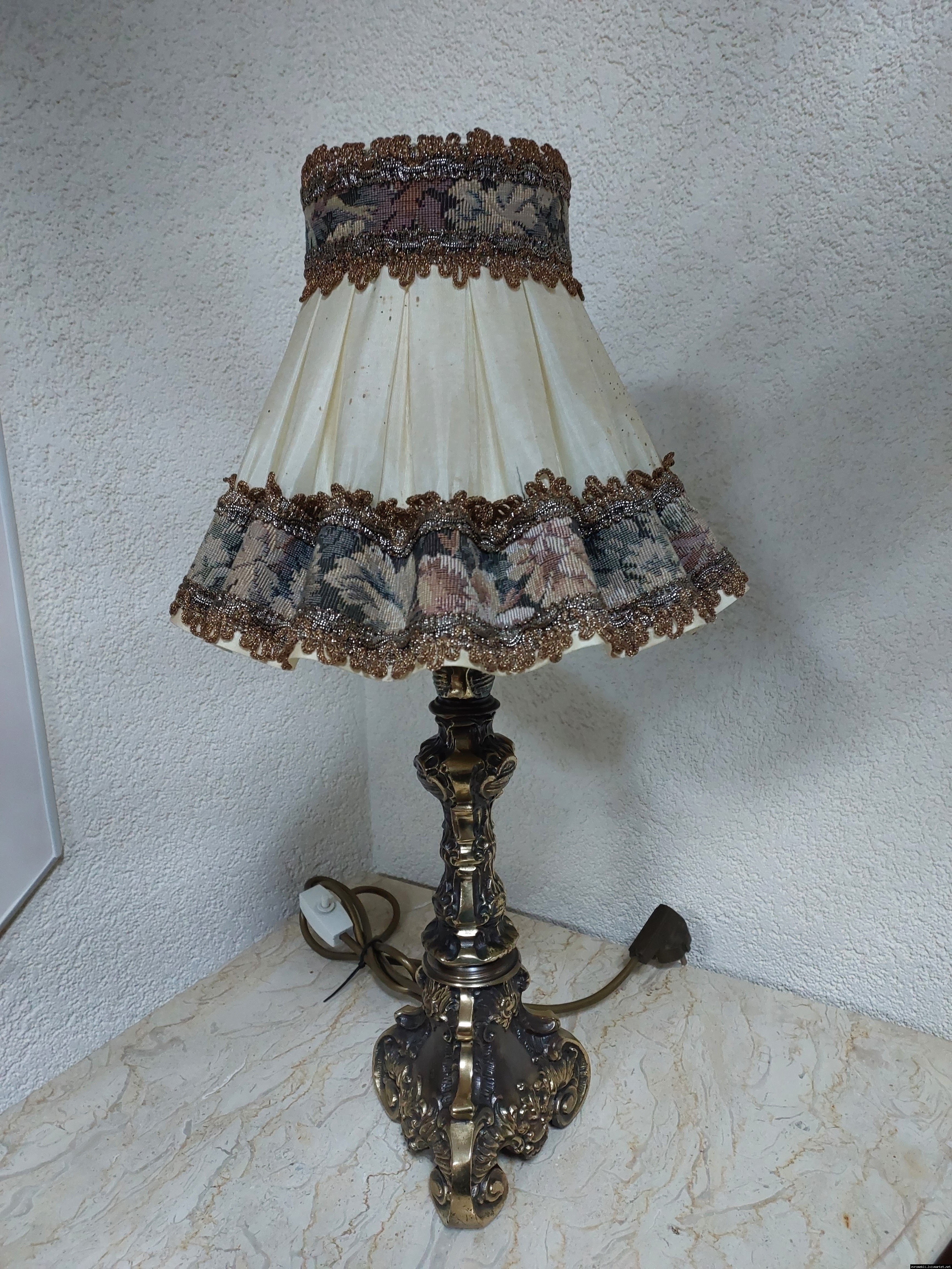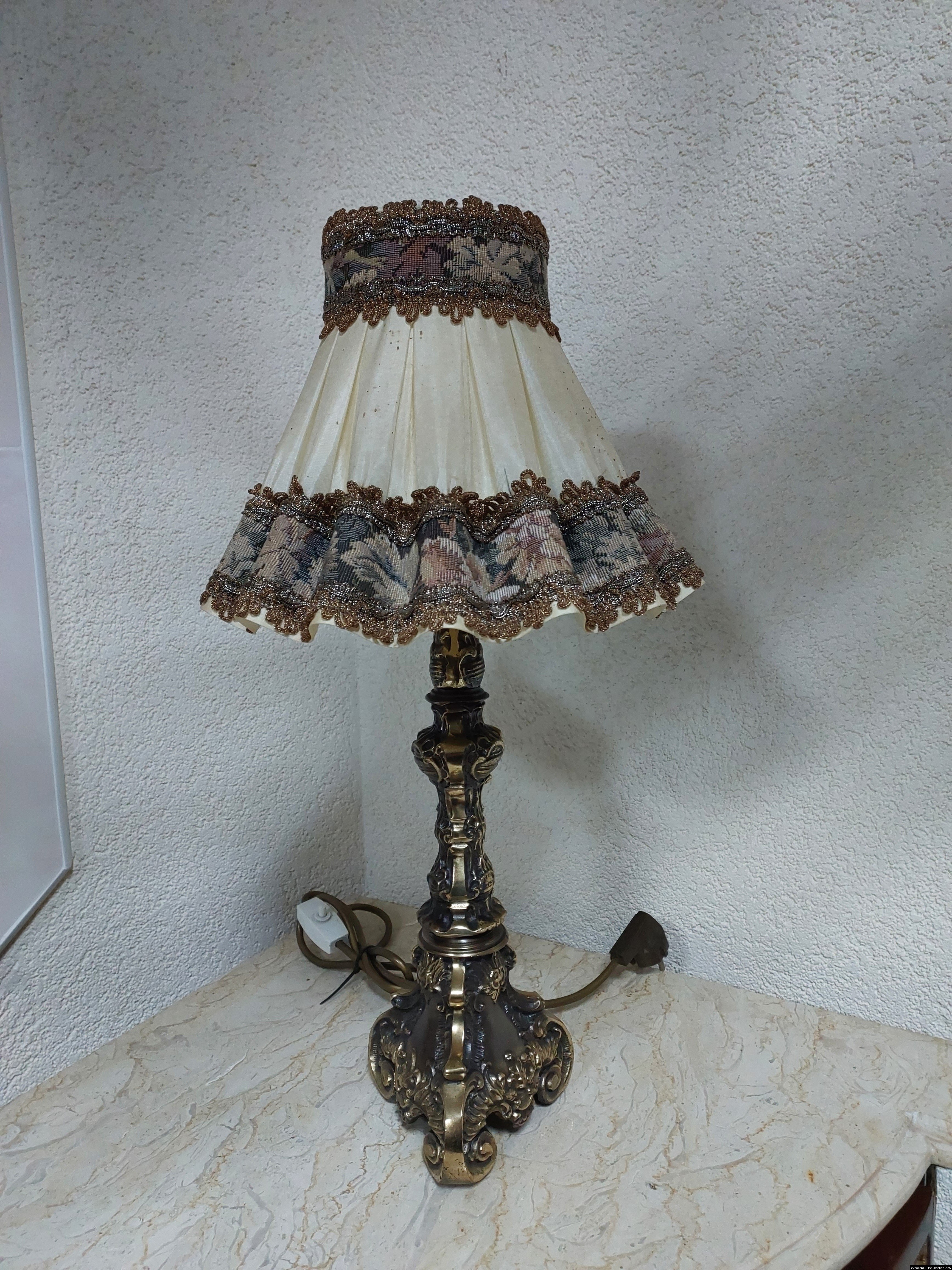 Неймовірно красива і мила погляду вінтажна настільна лампа. Ніжка лампи велика і масивна, на металевій основі, виготовлена з бронзи та декорована литтям, тканинний абажур. Лампа в хорошому, робочому стані, привезена з Бельгії.