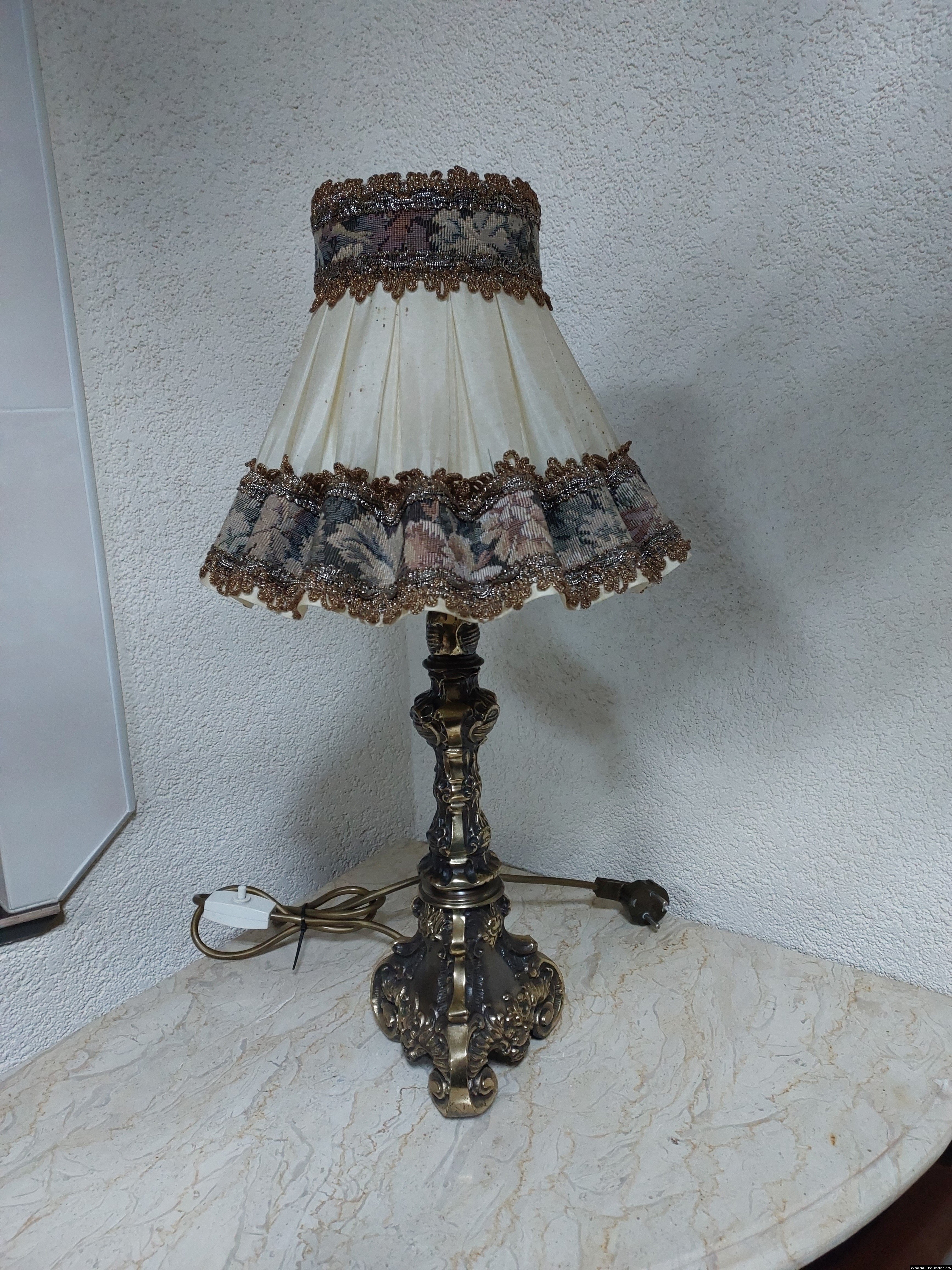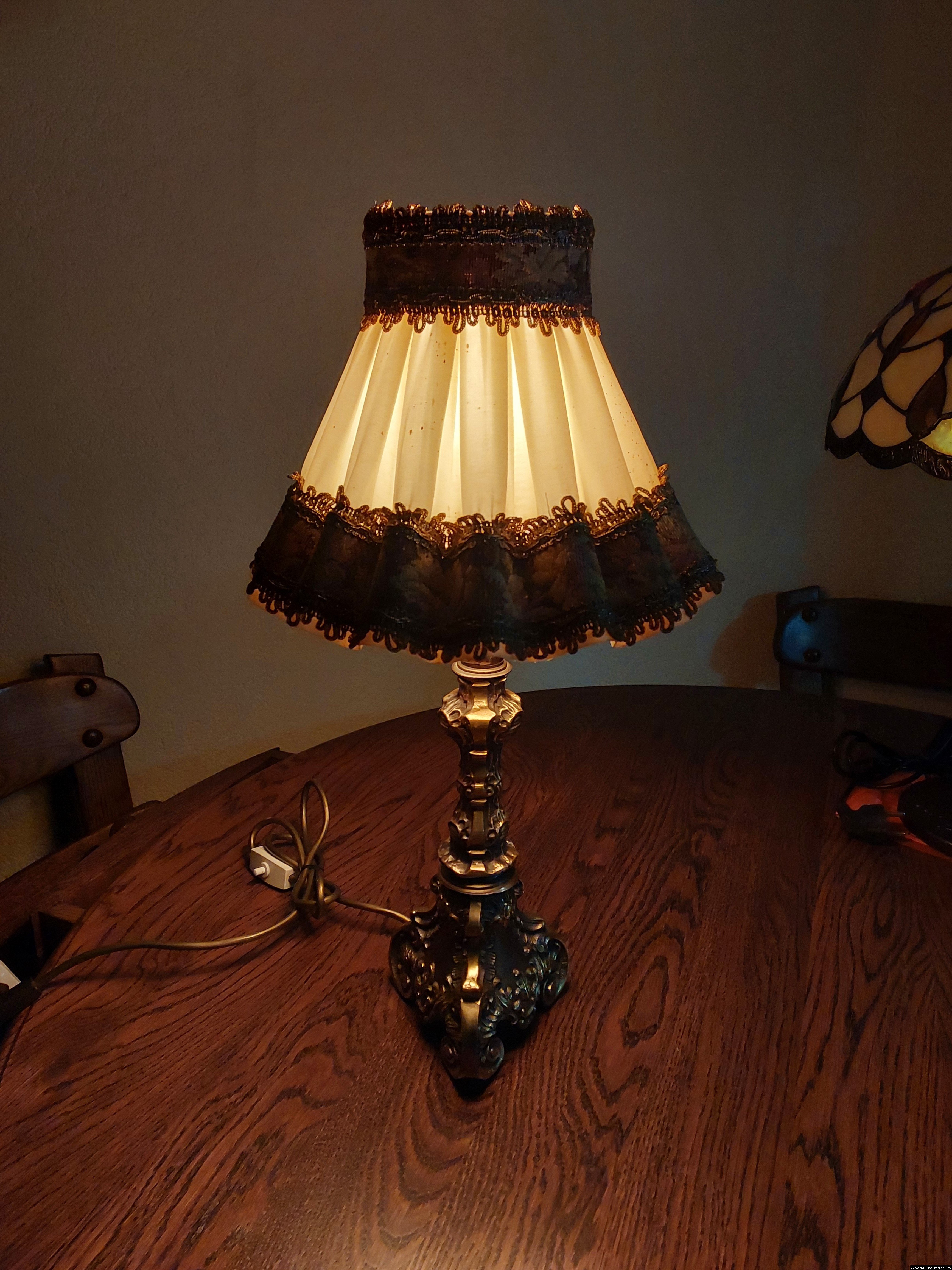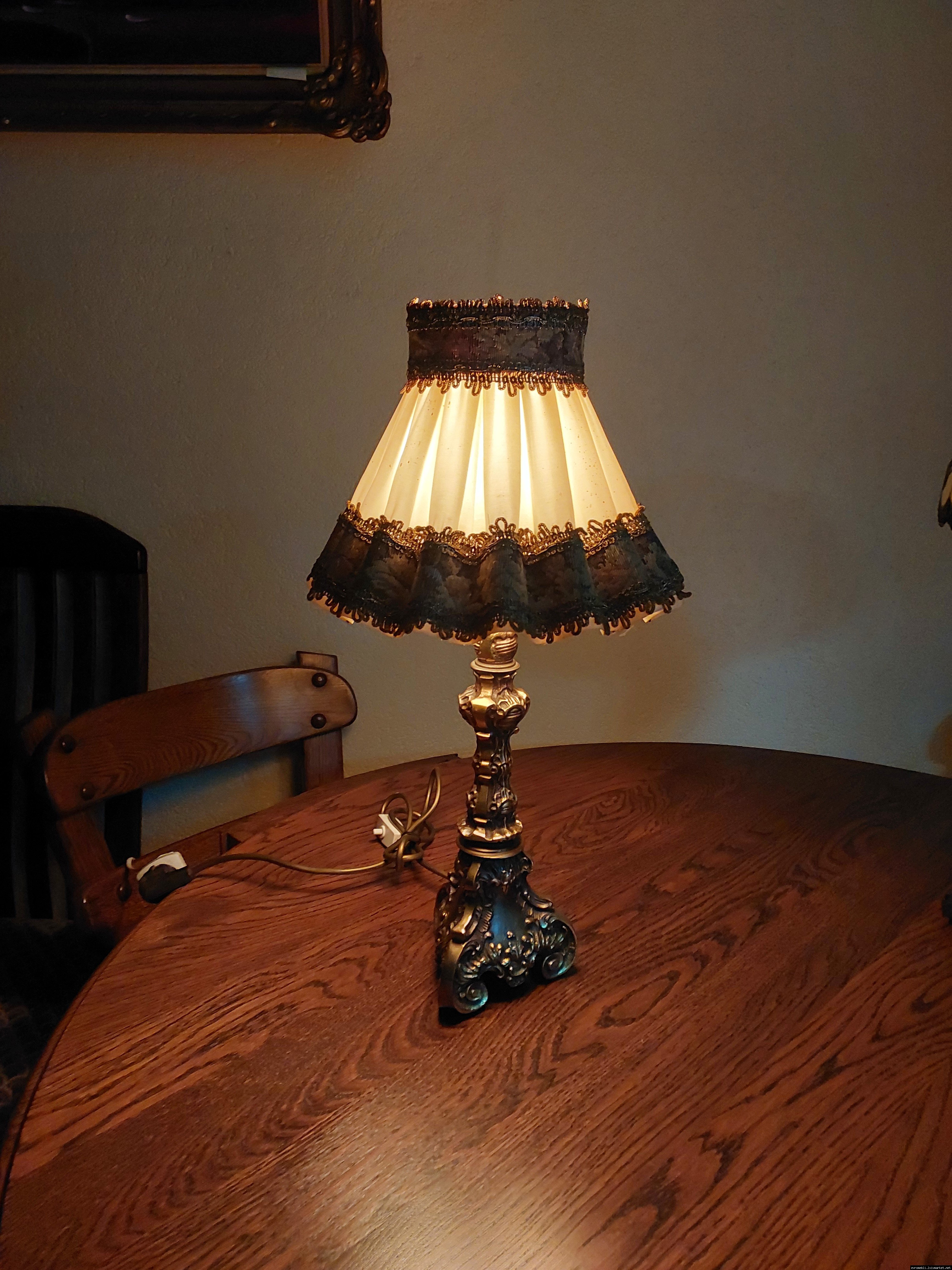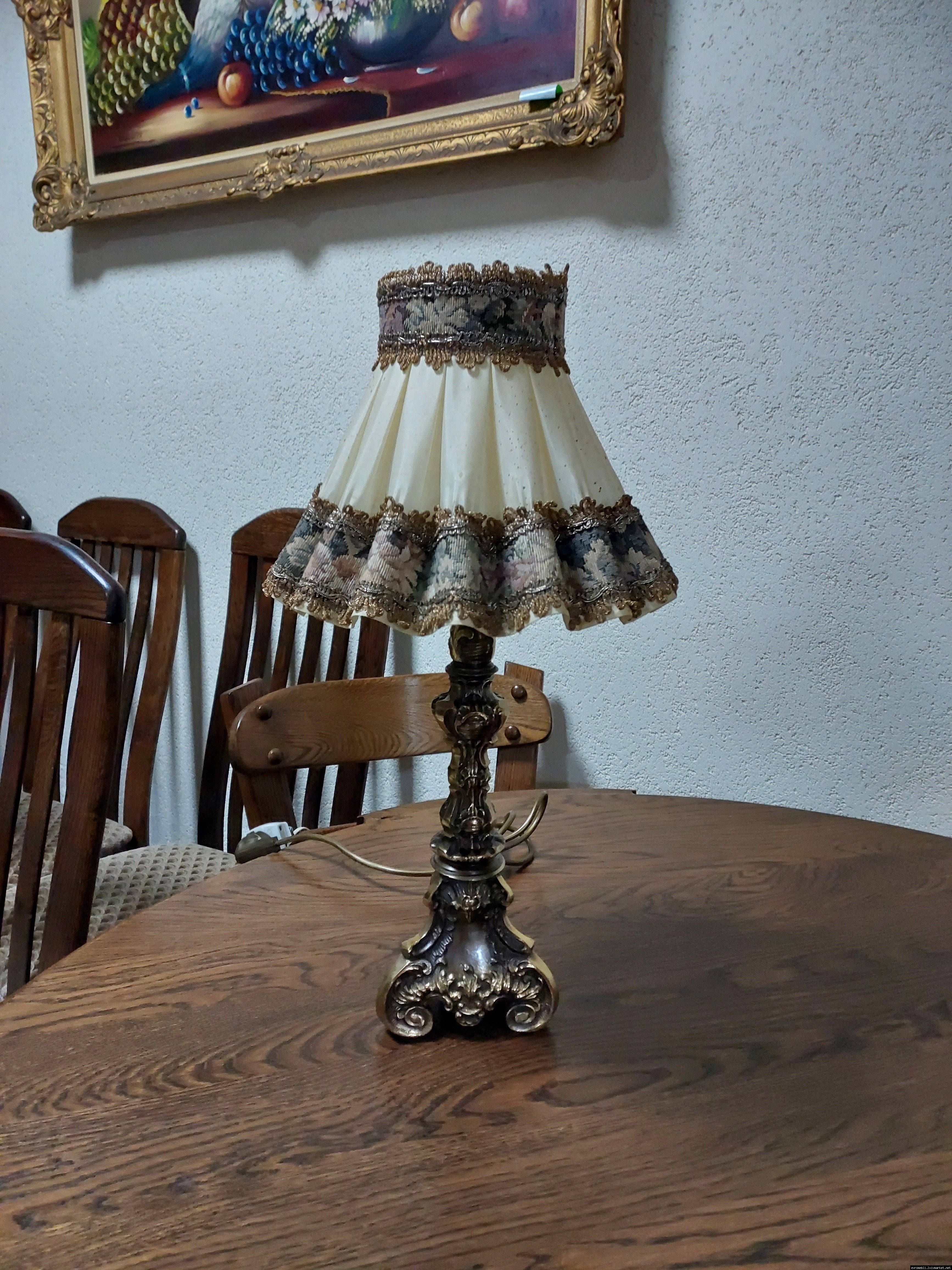 Неймовірно красива і мила погляду вінтажна настільна лампа. Ніжка лампи велика і масивна, на металевій основі, виготовлена з бронзи та декорована литтям, тканинний абажур. Лампа в хорошому, робочому стані, привезена з Бельгії.