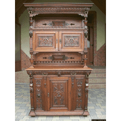 Буфет антикварний, в стилі Mechelens, в оригіналі, без втручання реставраційних робіт.Буфет виготовлений з натурального дерева, темно-золотистий дуб, масив, з елементами різьби ручної роботи, має три дверки та дві шухляди, всередині є деревяні полиці, дверки зачиняються на ключ. Буфет великий та масивний, вмістимий, декорований різьбою у вигляді голови лева з кільцем. Буфет в хорошому стані, привезений з Бельгії.