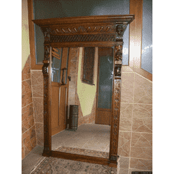 Дзеркало Mechelens, настінне, деревяне. Дзеркало підвісне, в старовинній деревяній рамі виготовленій з натурального дерева, темний дуб, масив, оздоблене декоративною різьбою ручної роботи, різьба у вигляді голови лева. Дзеркало замінено на нове, рама в хорошому стані, без пошкоджень чи дефектів, привезене з Бельгії.