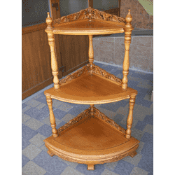 Напольна деревяна етажерка в тайському стилі. Етажерка з трьома поличками, виготовлена з масиву тикового дерева, світло- медового кольору, декорована елементами різьби ручної роботи. Етажерка в хорошому стані, привезена з Бельгії.