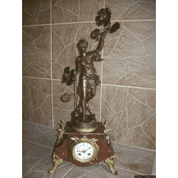 Годинник- скульптура з маятником та великим циферблатом з арабськими цифрами, циферблат з натурального каменю в обрамленні з латуні, бій в половині години та щогодини, матеріал скульптури, ніжок та декорацій- шпіатр. Унікальний, рідкісний механічний годинник з маятником, заводиться ключем (оригінальний ключ в комплекті). Годинник дуже красивий, масивний і дуже важкий, в хорошому технічно-справному стані, привезений з Бельгії.