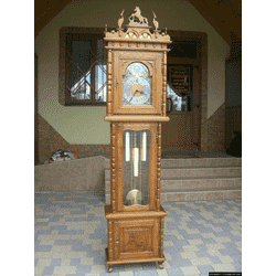 Годинник напольний, інтерєрний, вісьмиструнний. Корпус годинника виготовлений з натурального дерева, золотистий дуб, масив, декорований різьбою, механізм німецький з ланцюговою підвіскою гирь, годинник заводиться підтягуванням гирі за свобідний кінець ланцюга. Циферблат годинника декорований латунним литтям. Гирі та маятник покриті полірованою матовою латунню. Кожні 15 хвилин годинник відіграє мелодію та щогодини відбиває кількість годин. Годинник великий і масивний, в хорошому, технічно-справному стані, як по корпусу так і по механізму, привезений з Бельгії.
