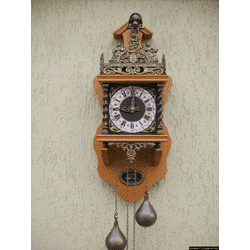 Годинник настінний, в деревяному корпусі, золотистий дуб, багато бронзових деталей, по боках корпусу кручені колони, бронзова корона з написом на голландській мові «Nu Elck Syn Sin» , що в перекладі означає «Кожен гідний того, про що мріє». Над дзвоном, по якому відбиває годинник - фігура атланта, який тримає над головою небосхил. Гирі грушеподібної форми, виготовлені з латуні. Маятник у вигляді вершника на коні. Посріблений циферблат з римськими та арабськими цифрами на чорній оксамитовій основі. Годинник відбиває один раз кожні пів години і щогодини, кількість годин. Годинник в хорошому технічно-справному стані, як по корпусу так і по механізму, країна виробник- Нідерланди, механізм- Німеччина.