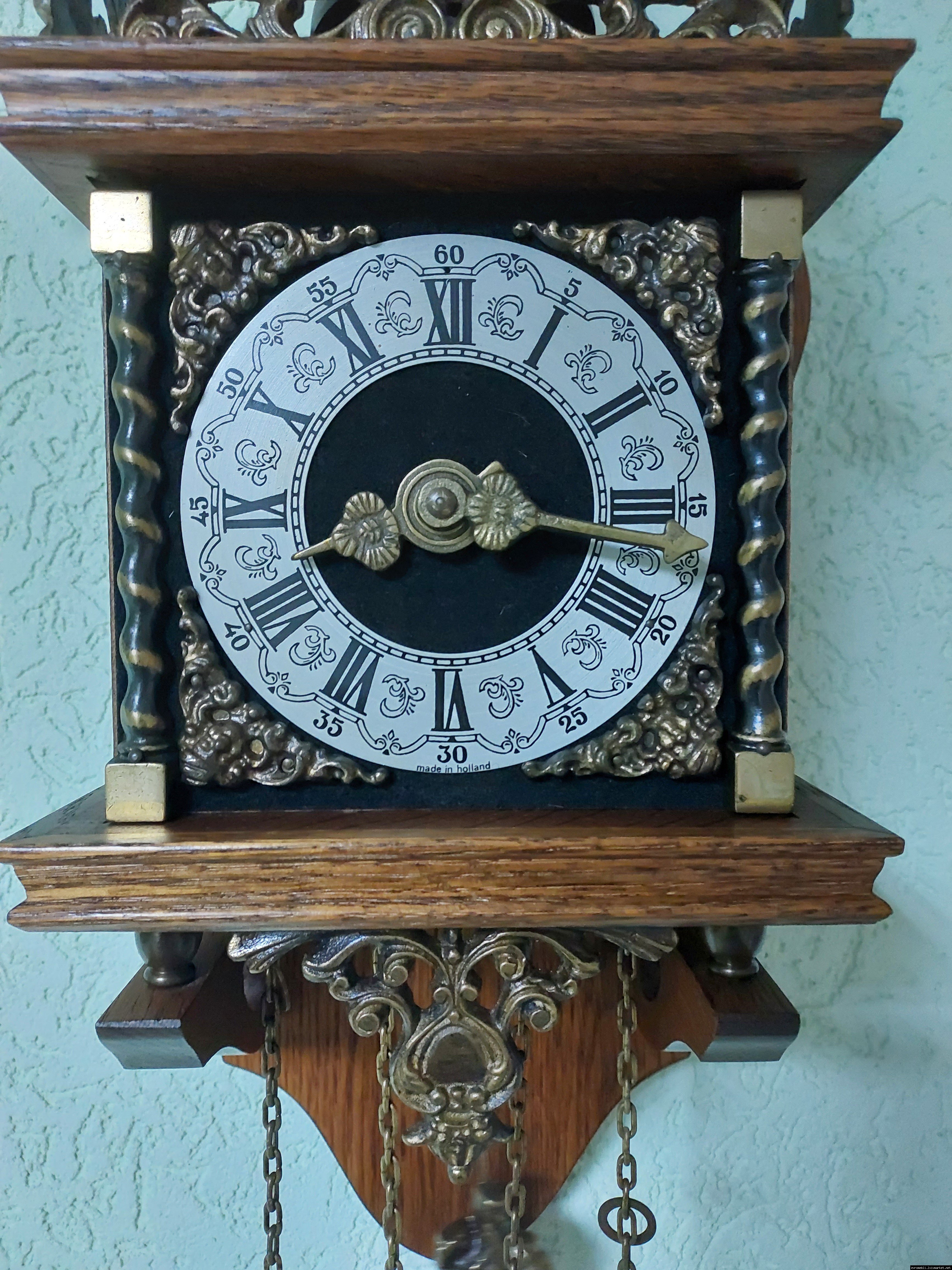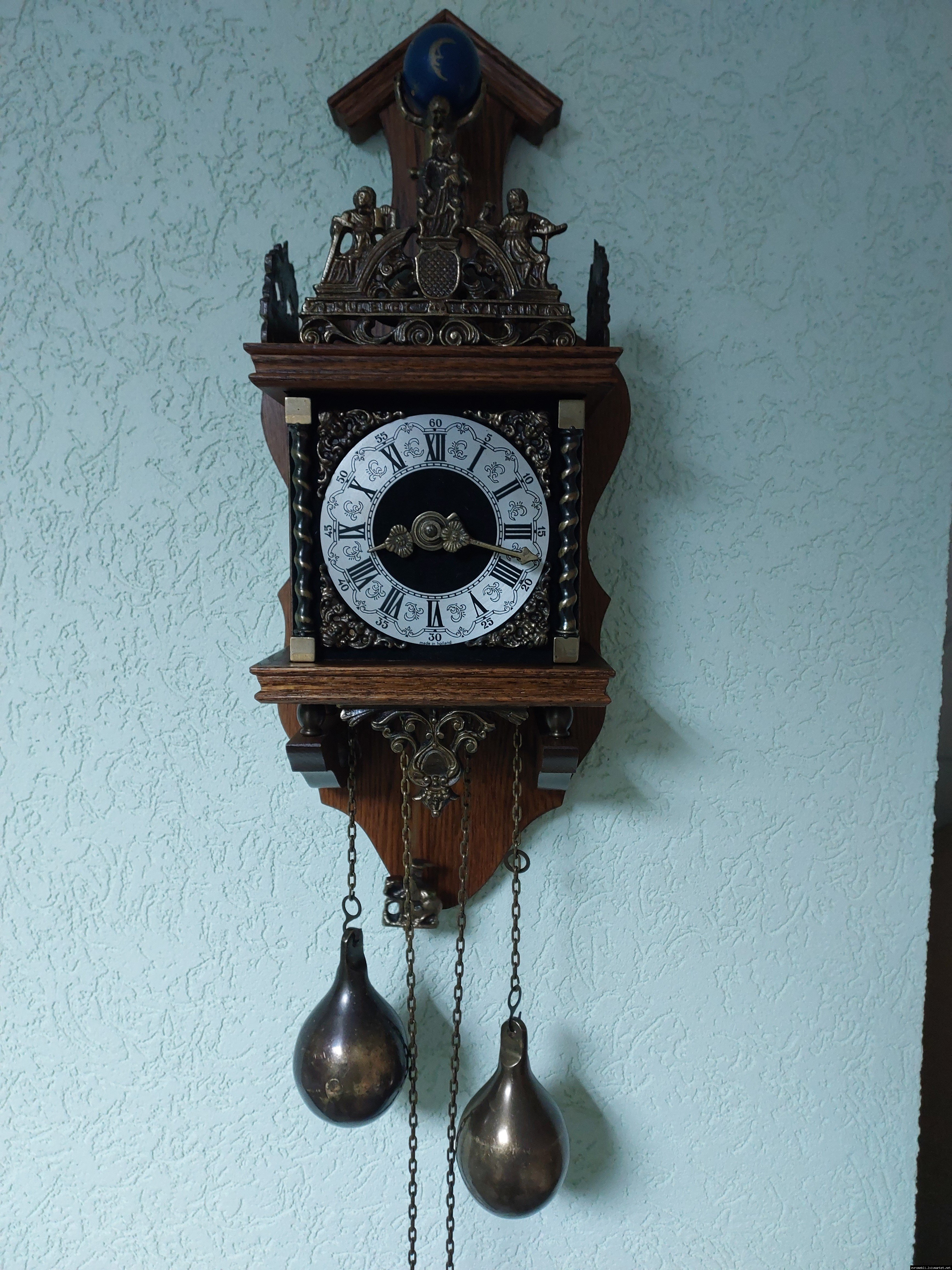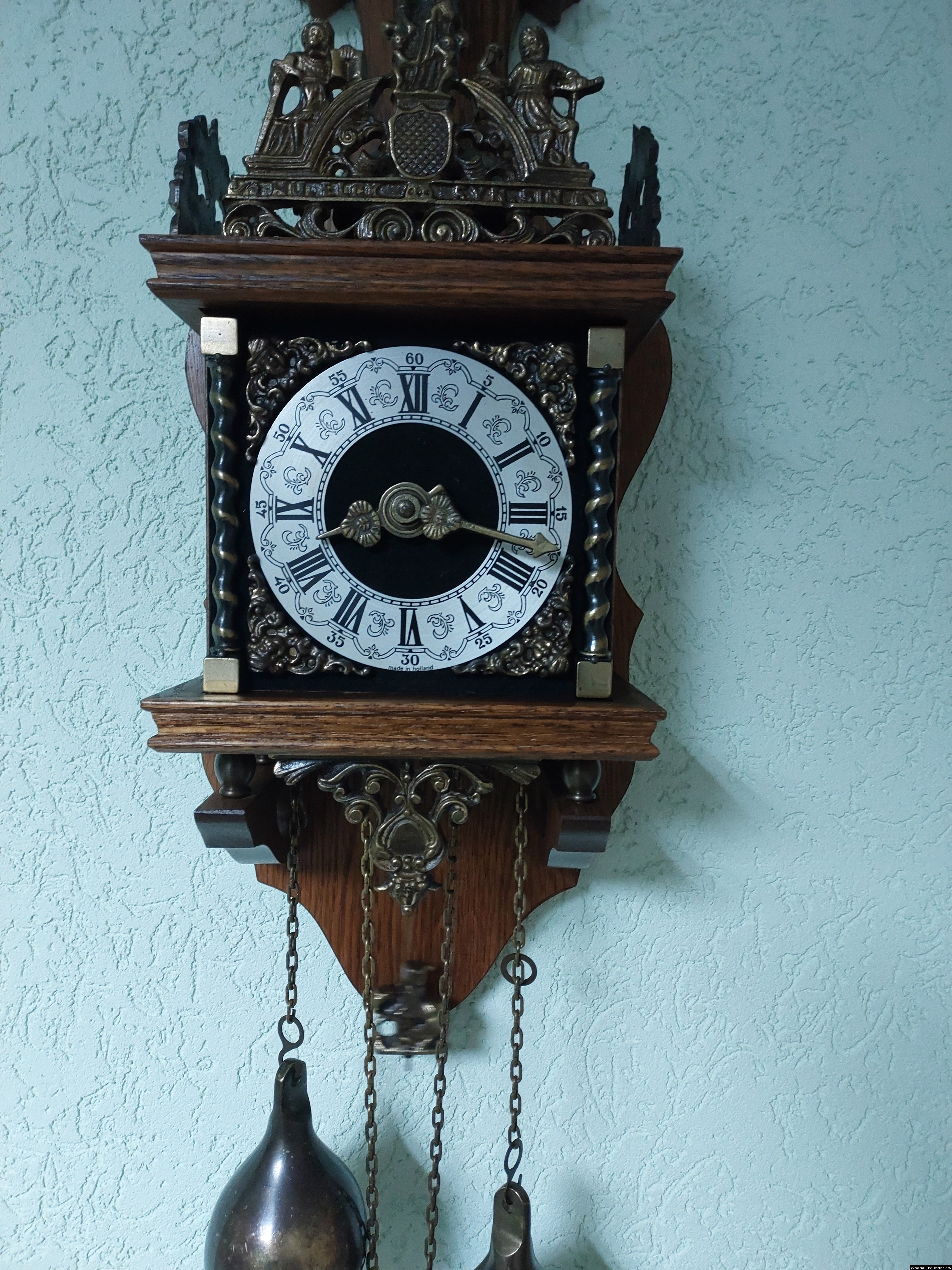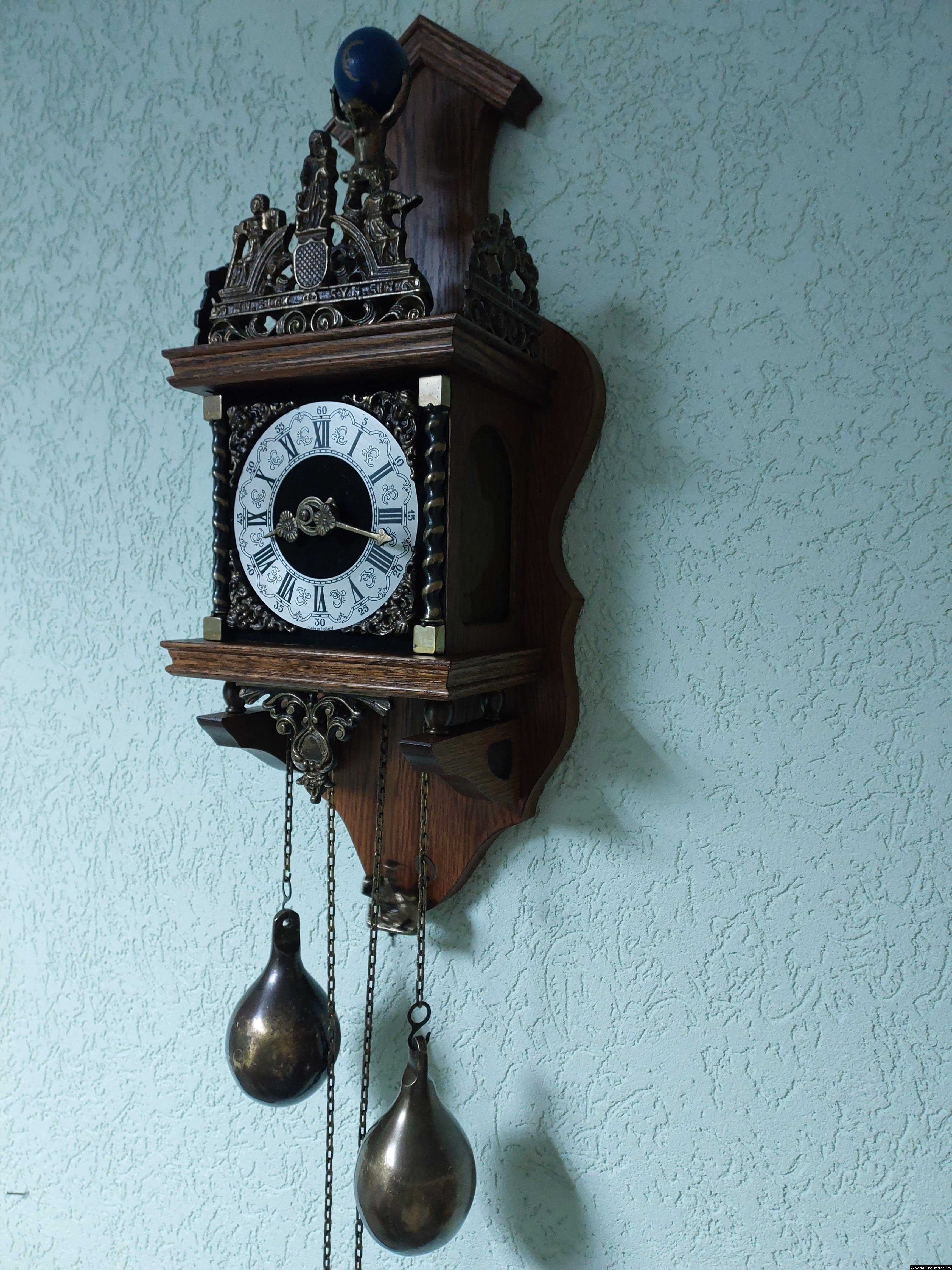 Годинник настінний, в деревяному корпусі, темний дуб, багато бронзових деталей, по боках корпусу кручені колони, бронзова корона з написом на голландській мові «Nu Elck Syn Sin» , що в перекладі означає «Кожен гідний того, про що мріє». Над дзвоном, по якому відбиває годинник - фігура атланта, який тримає над головою небосхил. Гирі грушеподібної форми, виготовлені з латуні. Маятник у вигляді вершника на коні. Посріблений циферблат з римськими та арабськими цифрами на чорній оксамитовій основі. Годинник відбиває один раз кожні пів години і щогодини, кількість годин. Годинник в хорошому технічно-справному стані, як по корпусу так і по механізму, країна виробник- Нідерланди, механізм- Німеччина.