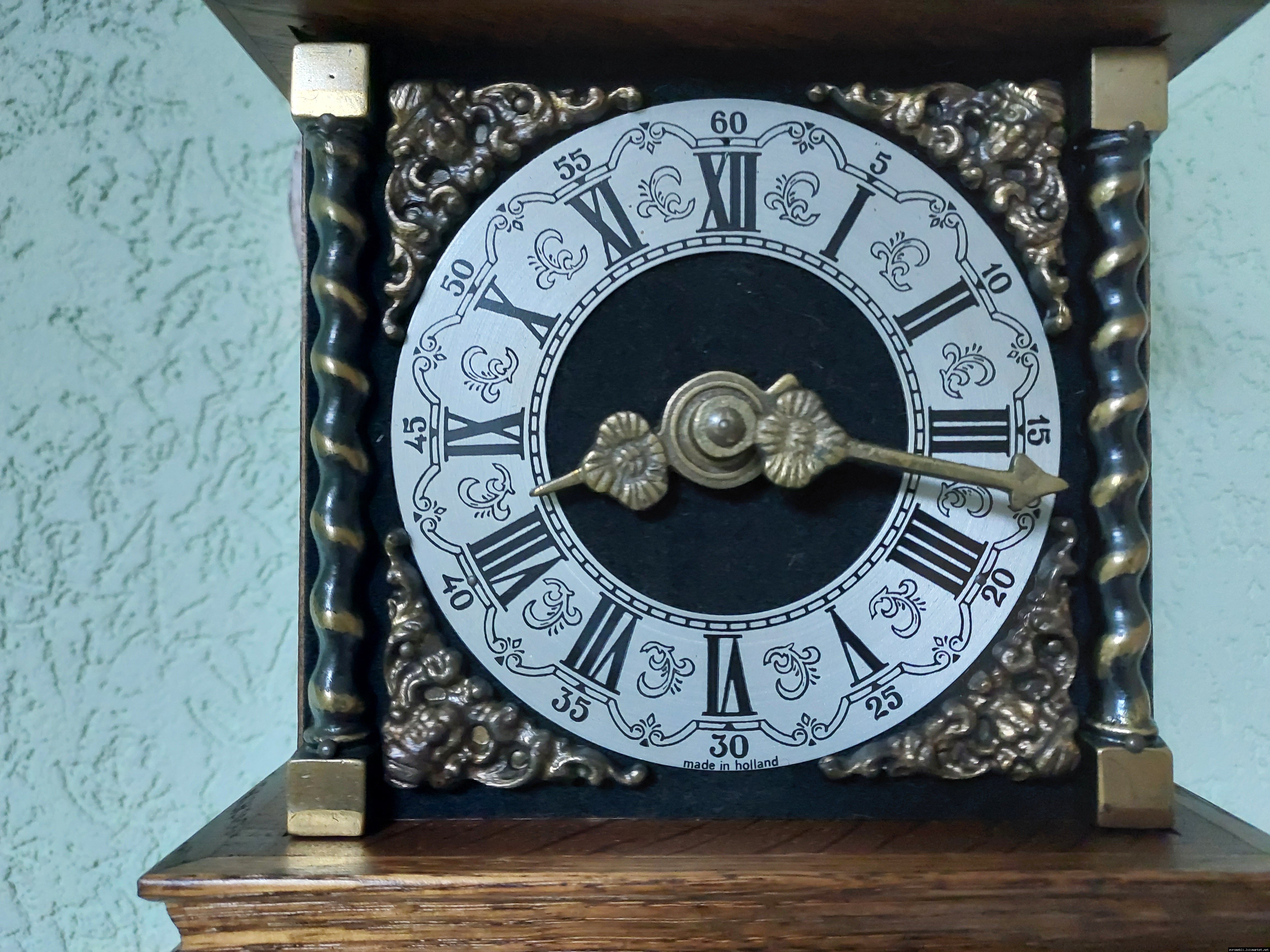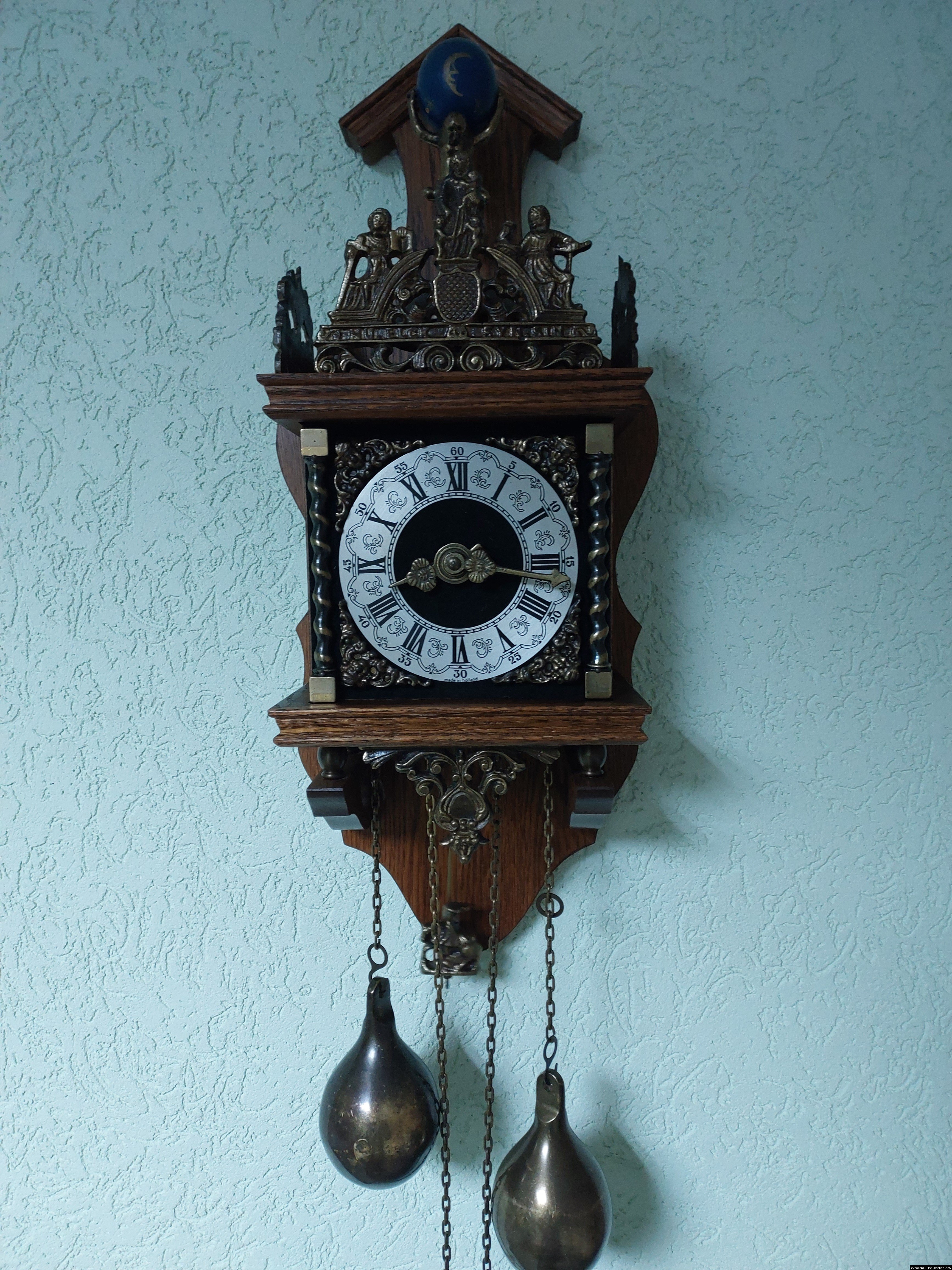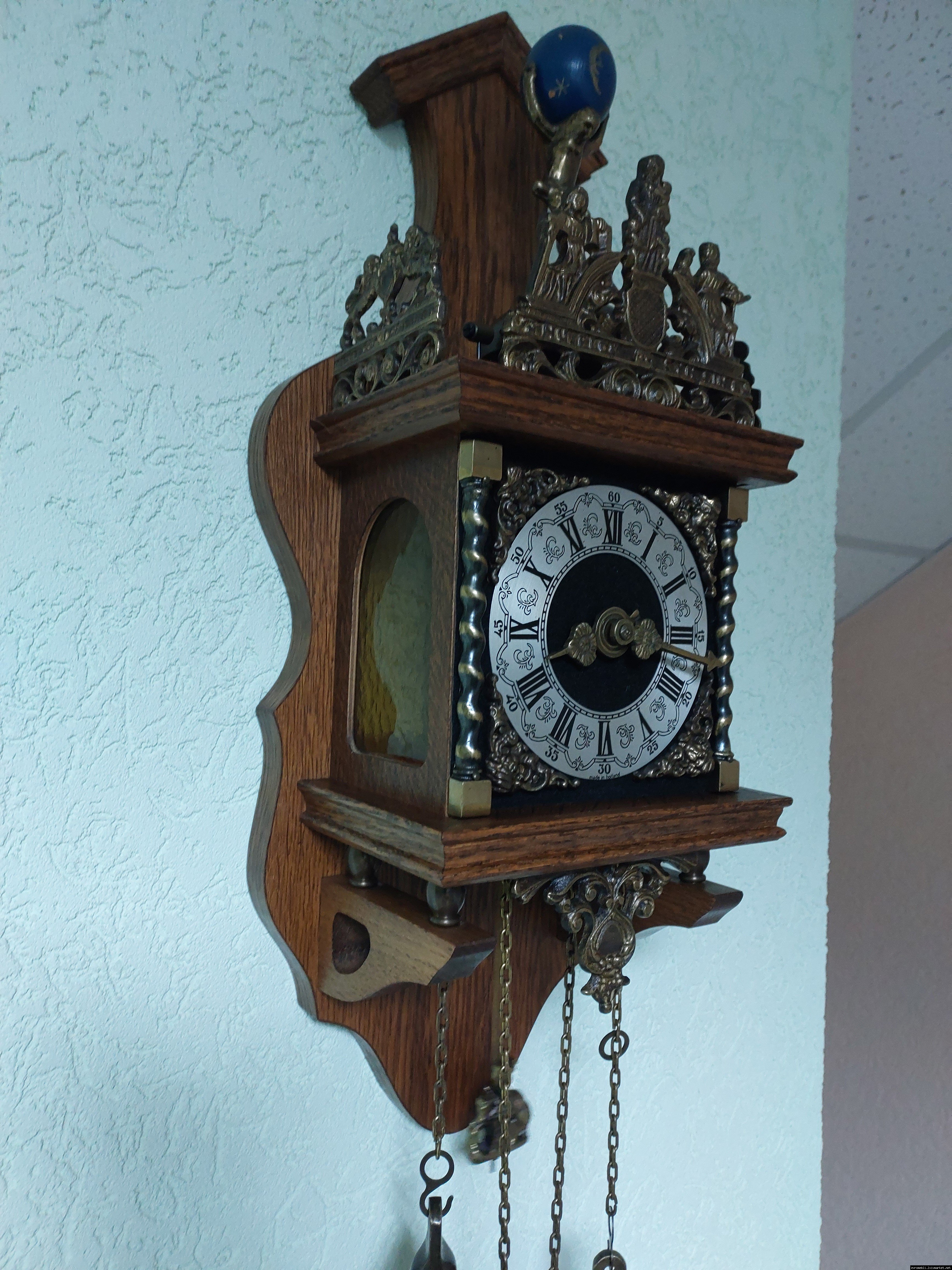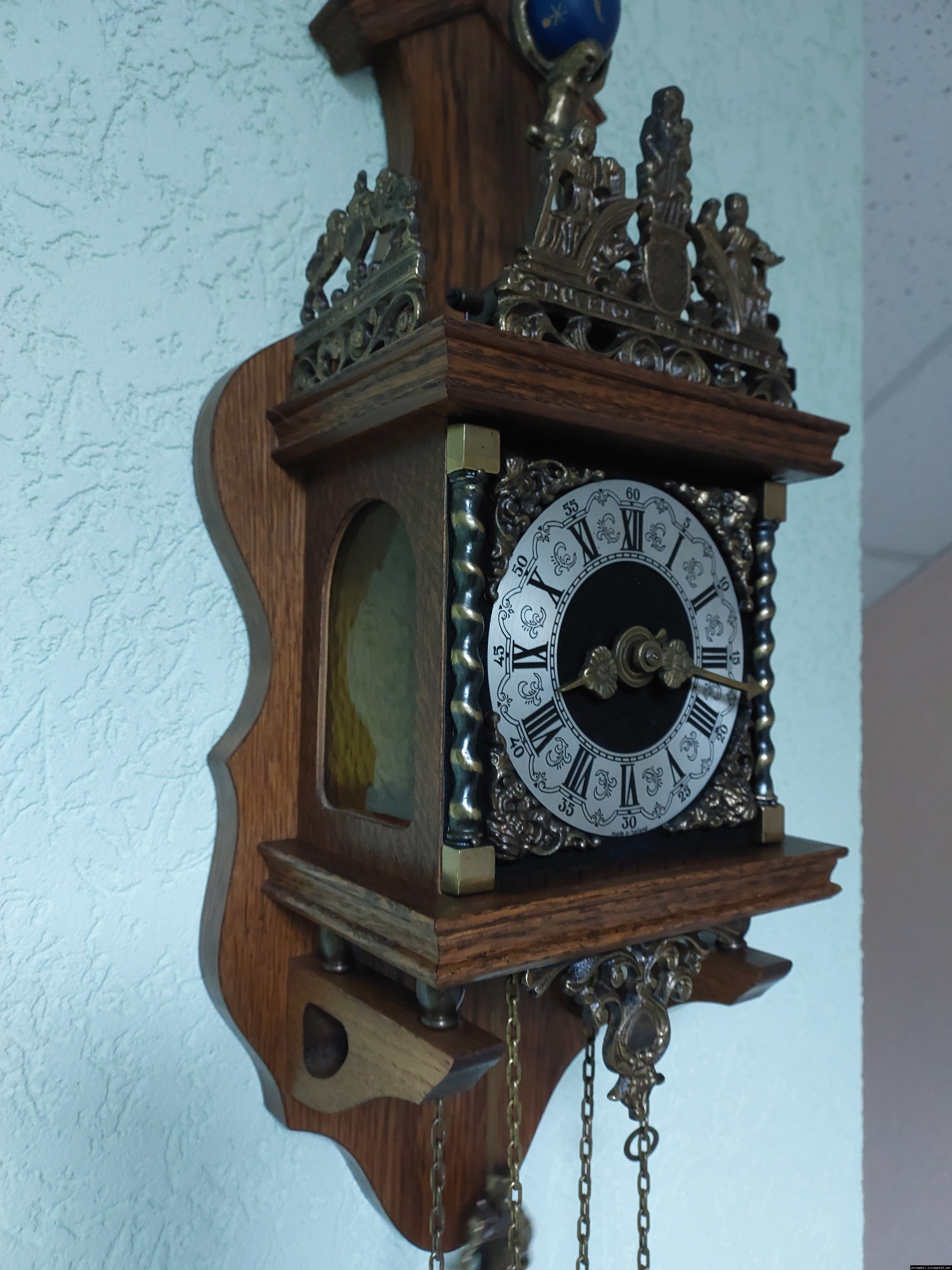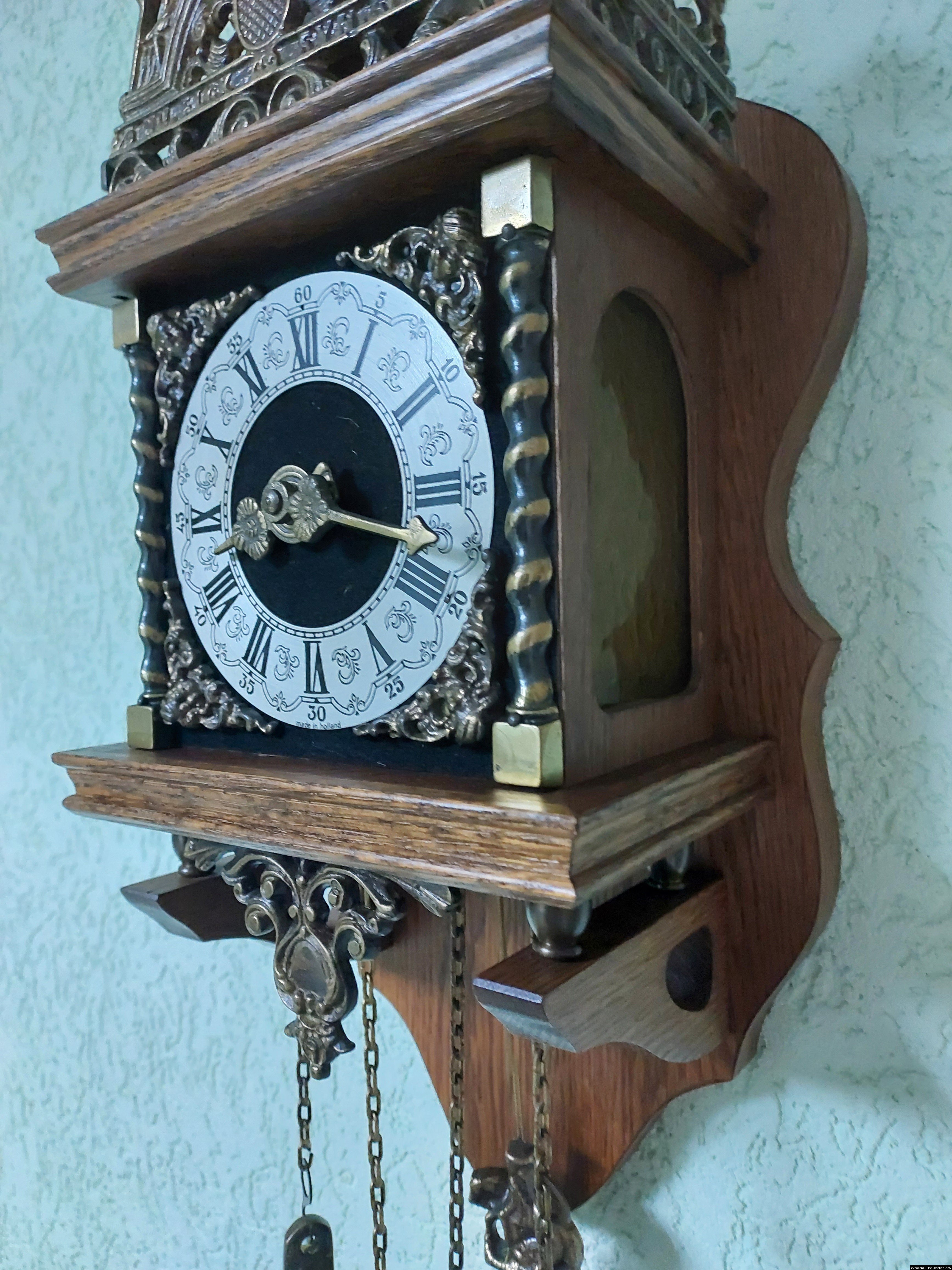 Годинник настінний, в деревяному корпусі, темний дуб, багато бронзових деталей, по боках корпусу кручені колони, бронзова корона з написом на голландській мові «Nu Elck Syn Sin» , що в перекладі означає «Кожен гідний того, про що мріє». Над дзвоном, по якому відбиває годинник - фігура атланта, який тримає над головою небосхил. Гирі грушеподібної форми, виготовлені з латуні. Маятник у вигляді вершника на коні. Посріблений циферблат з римськими та арабськими цифрами на чорній оксамитовій основі. Годинник відбиває один раз кожні пів години і щогодини, кількість годин. Годинник в хорошому технічно-справному стані, як по корпусу так і по механізму, країна виробник- Нідерланди, механізм- Німеччина.