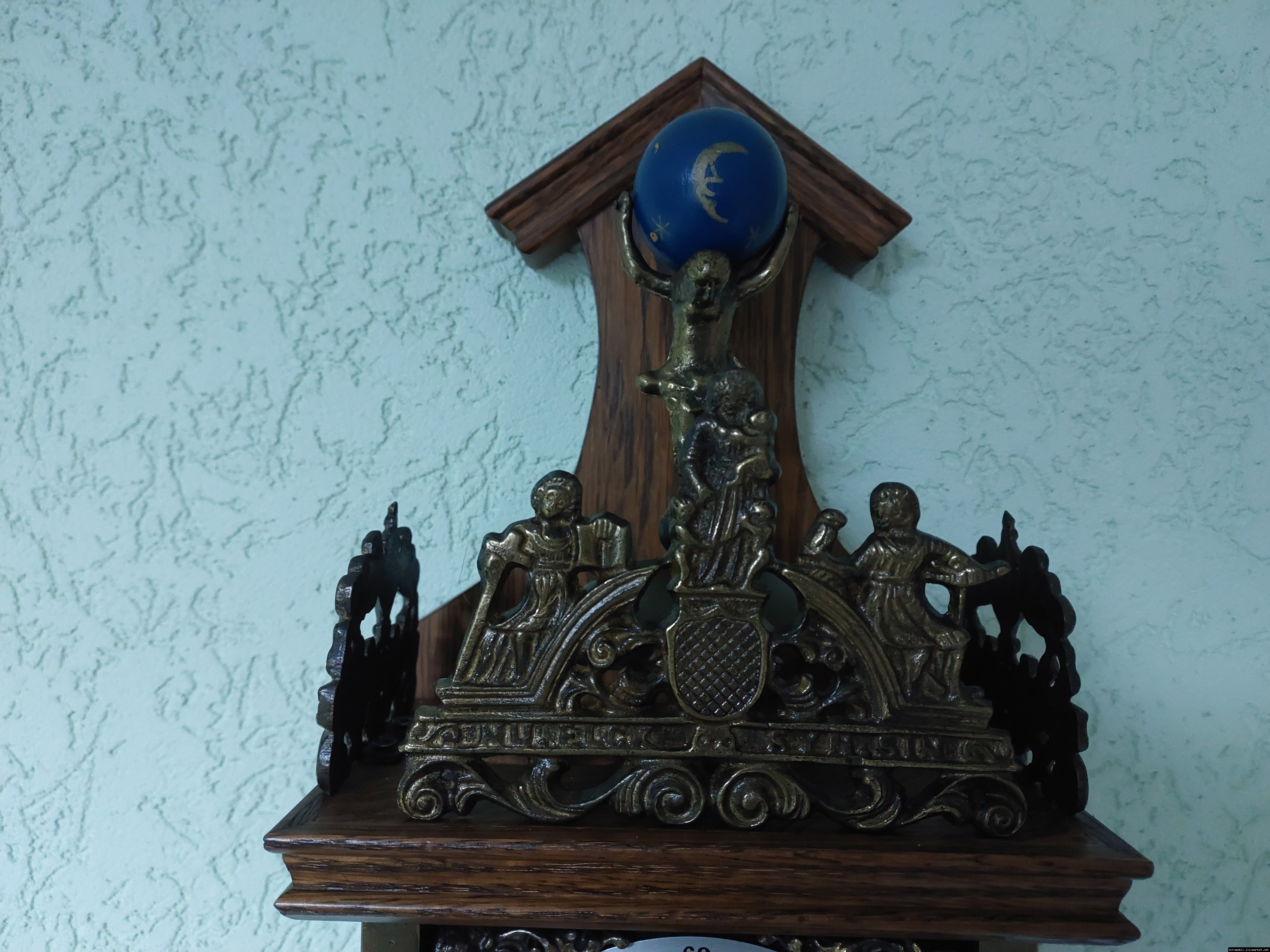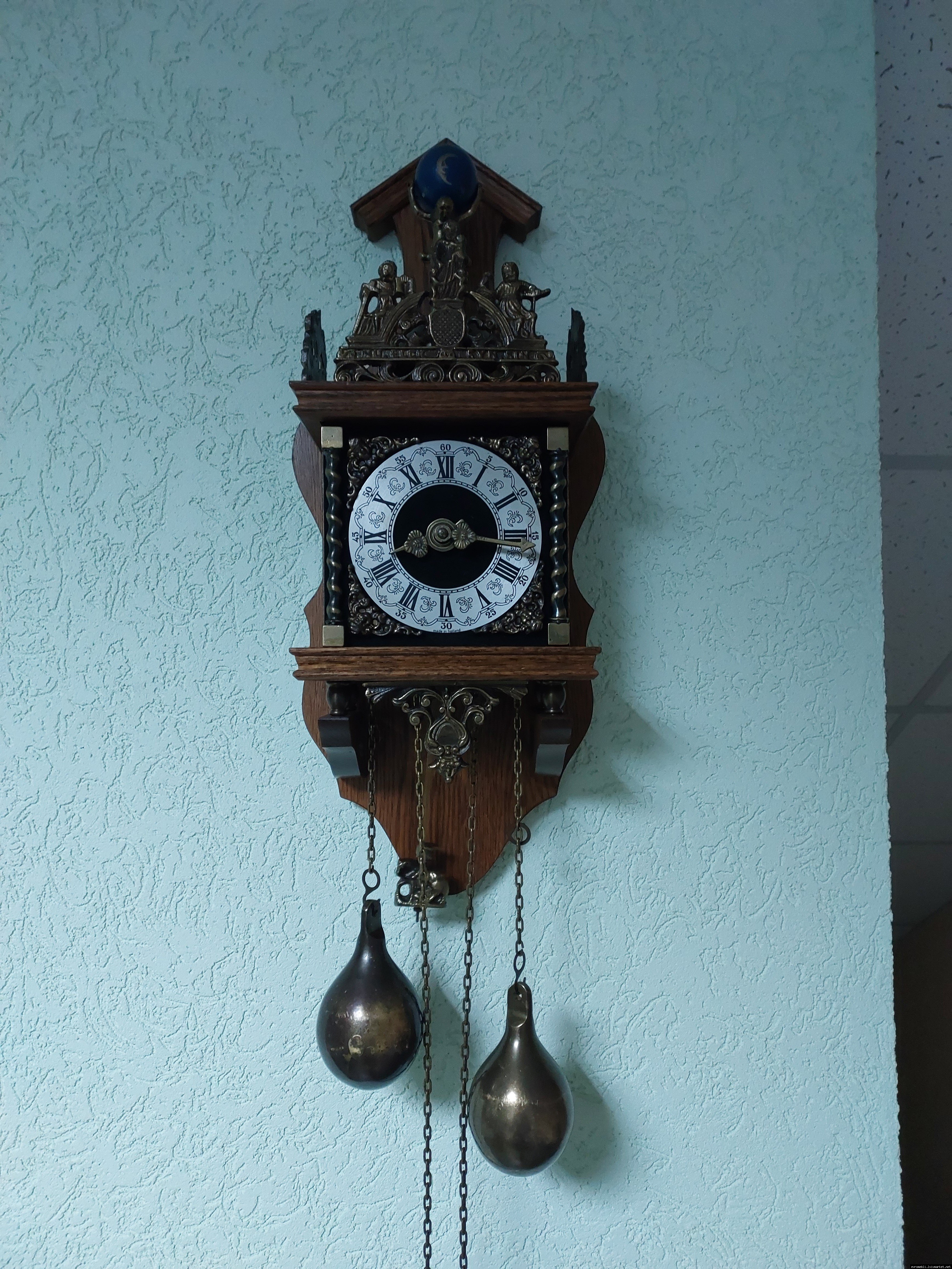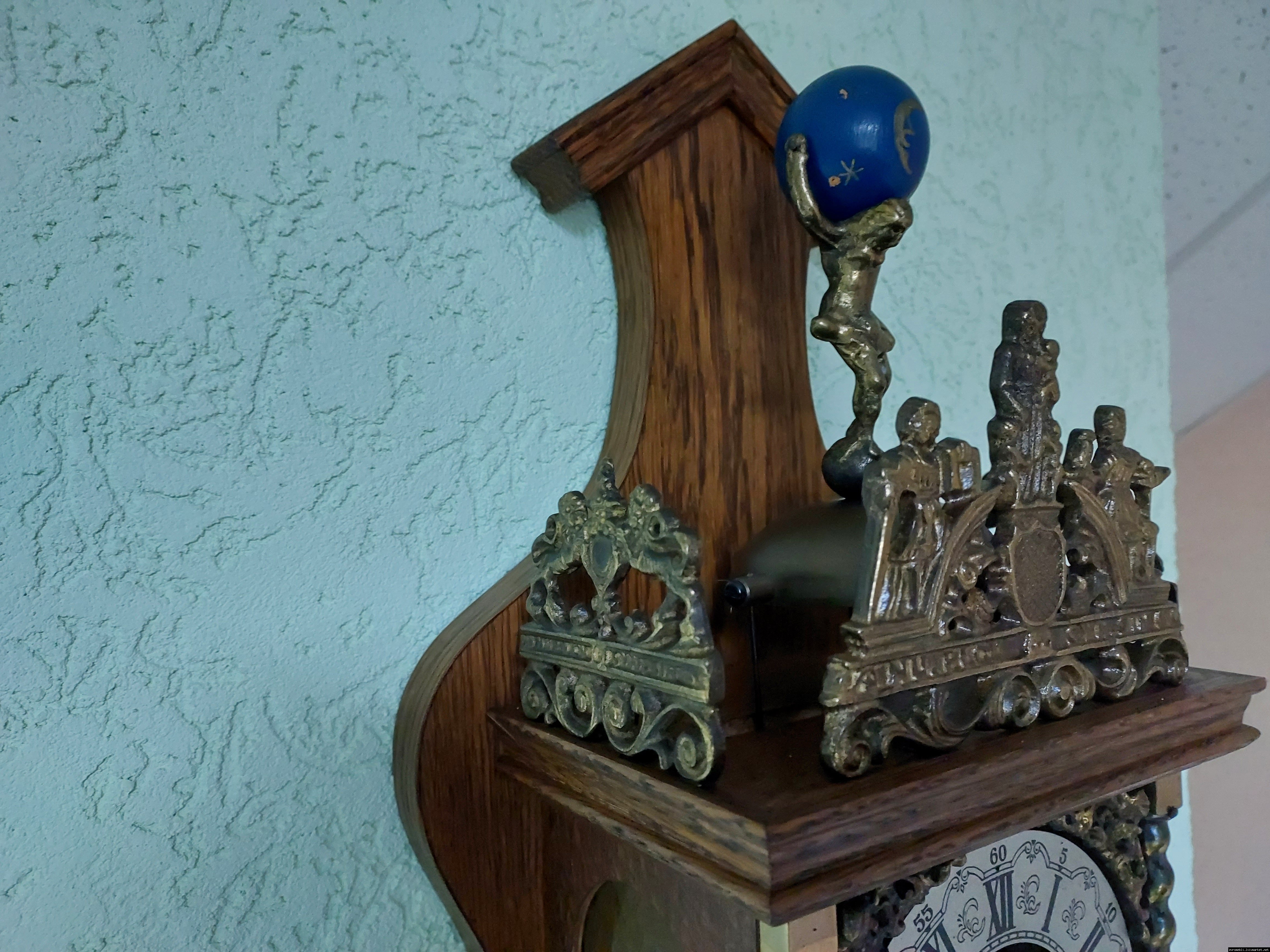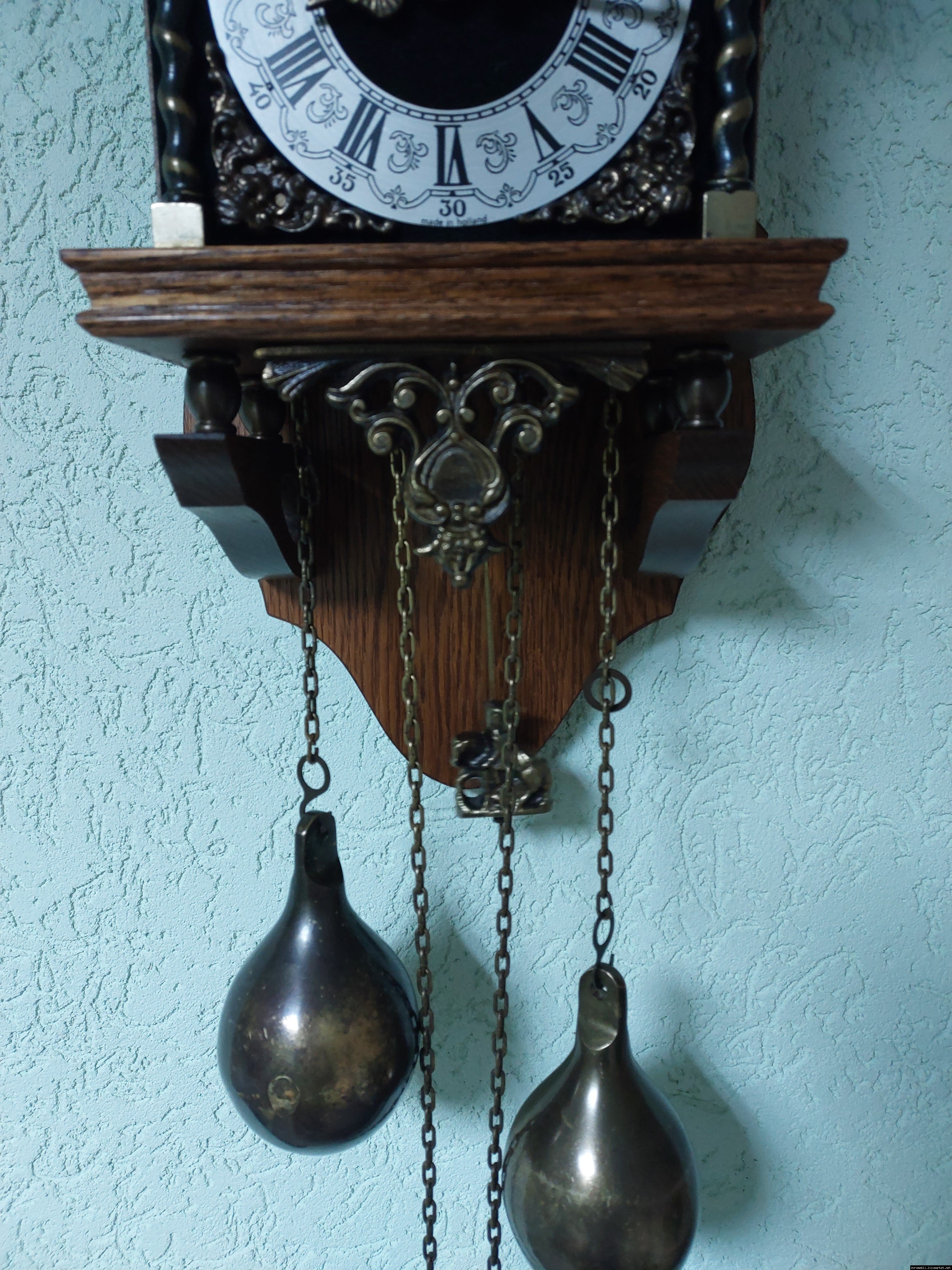Годинник настінний, в деревяному корпусі, темний дуб, багато бронзових деталей, по боках корпусу кручені колони, бронзова корона з написом на голландській мові «Nu Elck Syn Sin» , що в перекладі означає «Кожен гідний того, про що мріє». Над дзвоном, по якому відбиває годинник - фігура атланта, який тримає над головою небосхил. Гирі грушеподібної форми, виготовлені з латуні. Маятник у вигляді вершника на коні. Посріблений циферблат з римськими та арабськими цифрами на чорній оксамитовій основі. Годинник відбиває один раз кожні пів години і щогодини, кількість годин. Годинник в хорошому технічно-справному стані, як по корпусу так і по механізму, країна виробник- Нідерланди, механізм- Німеччина.