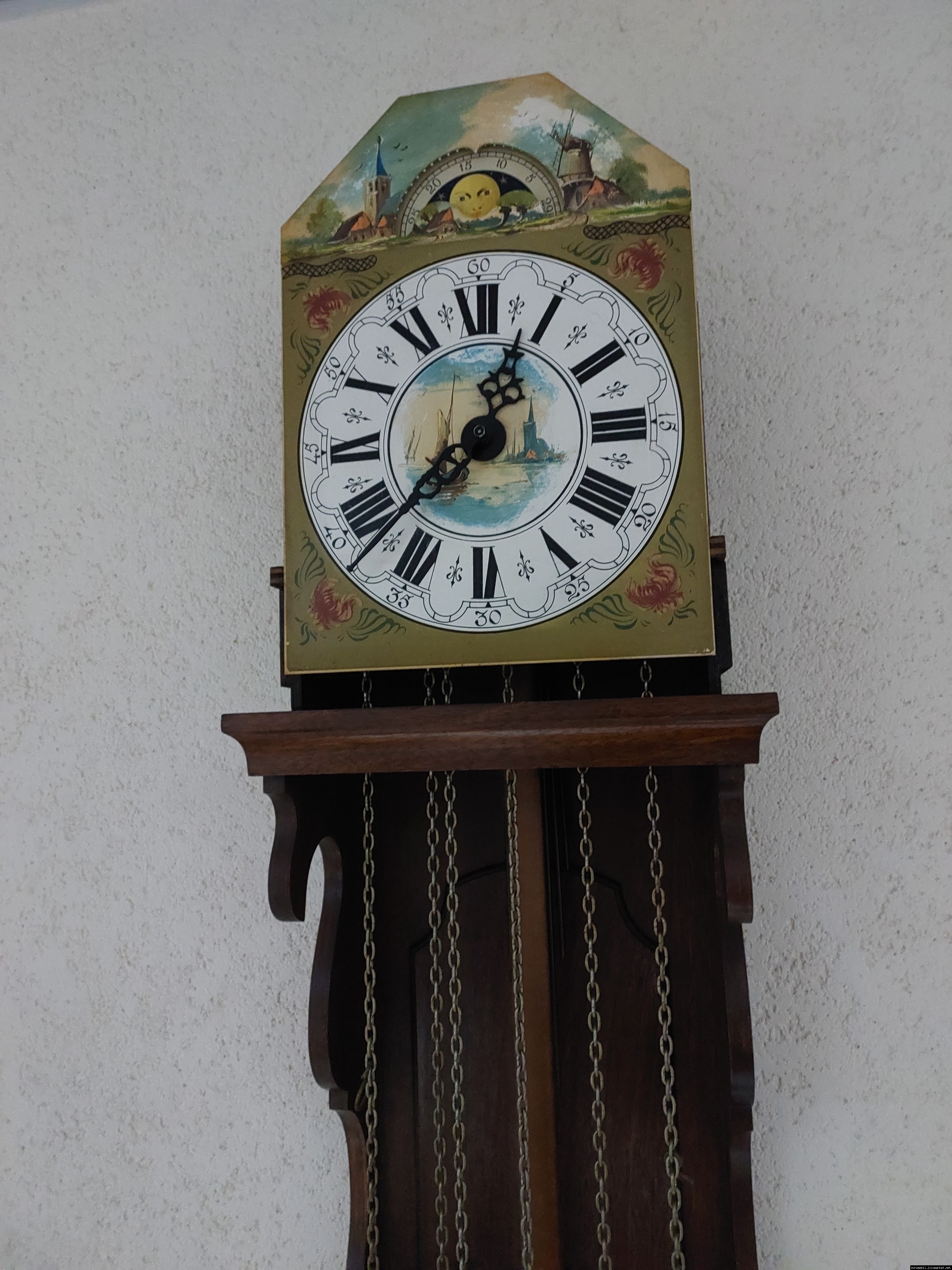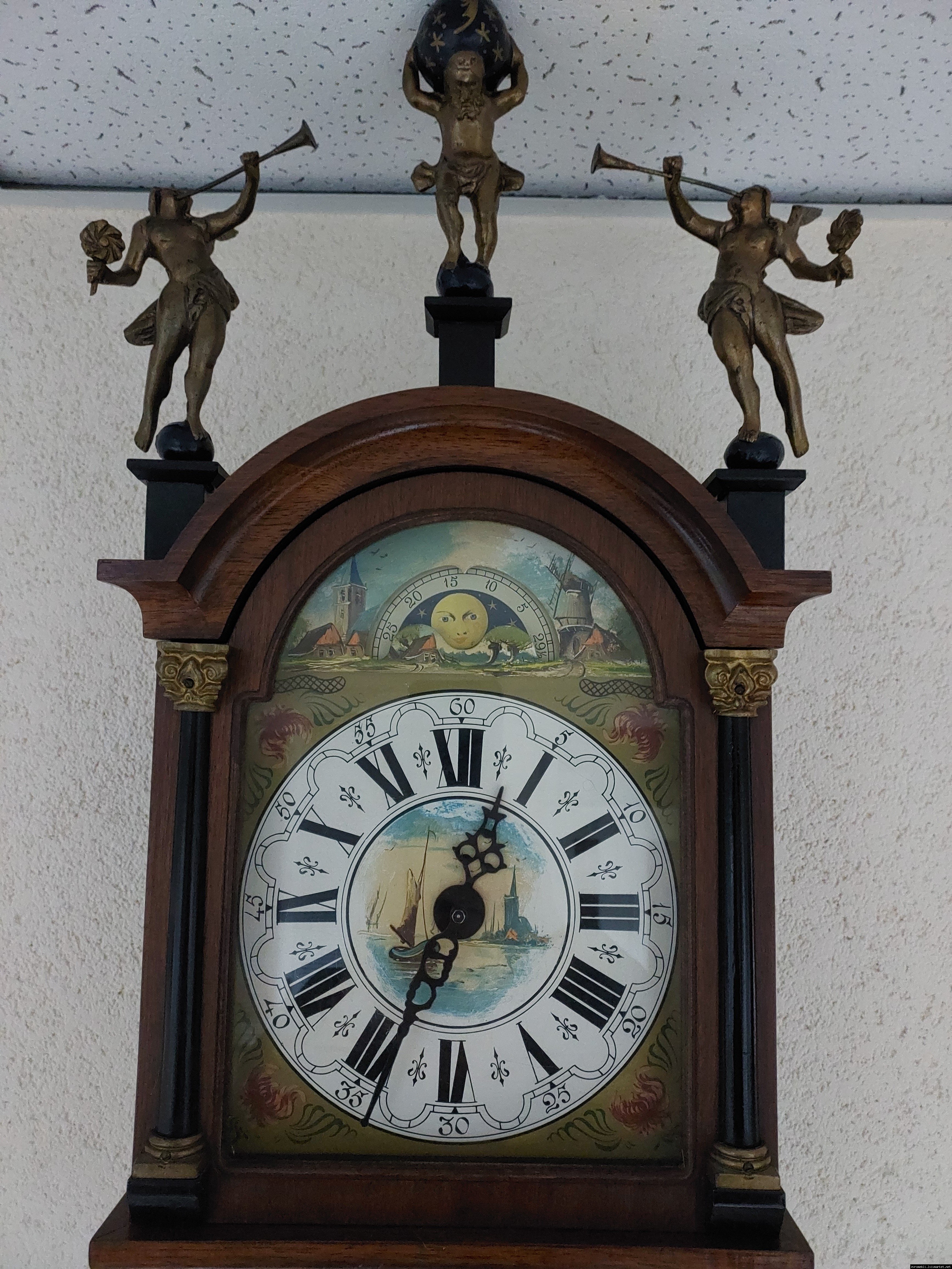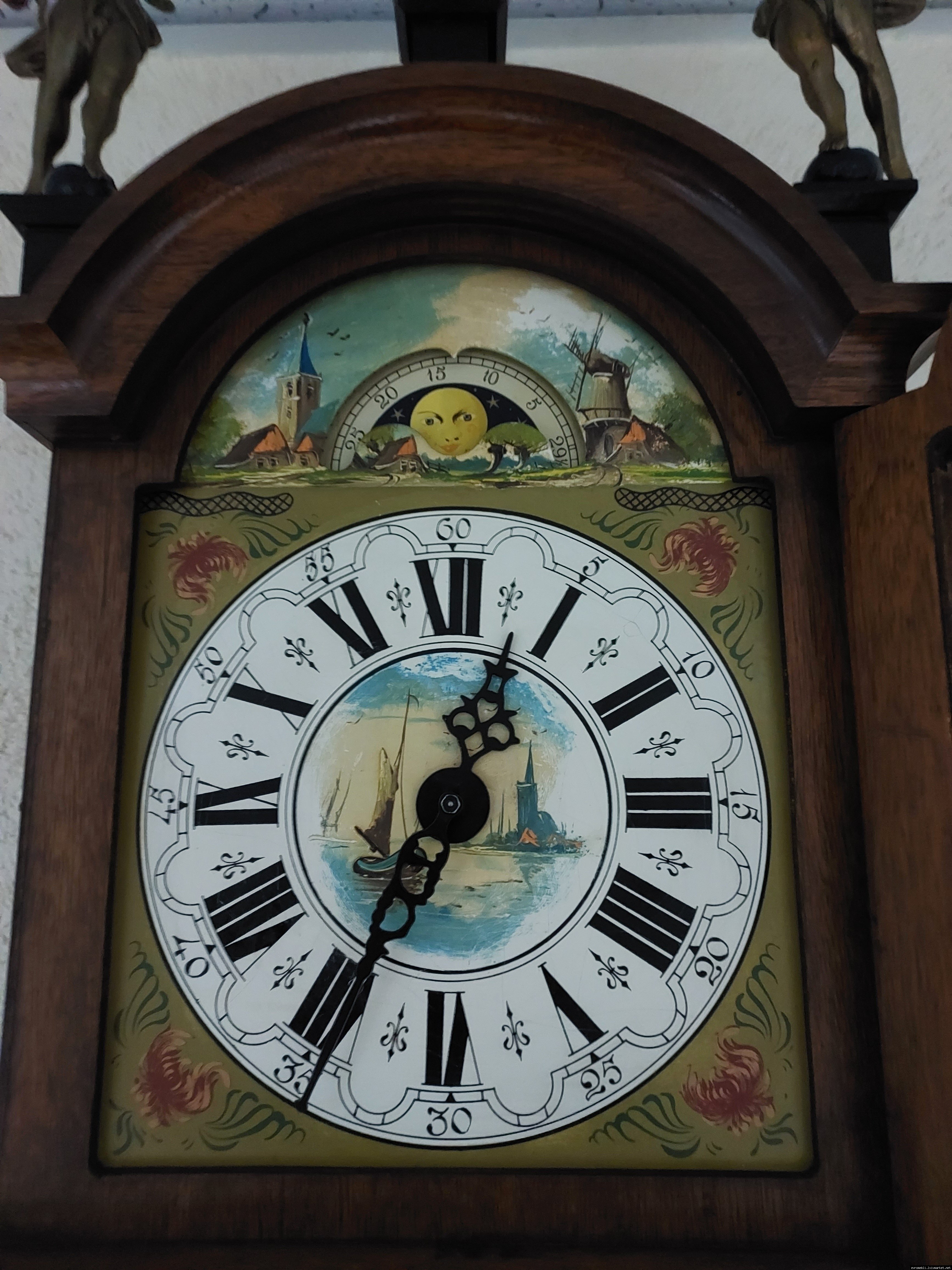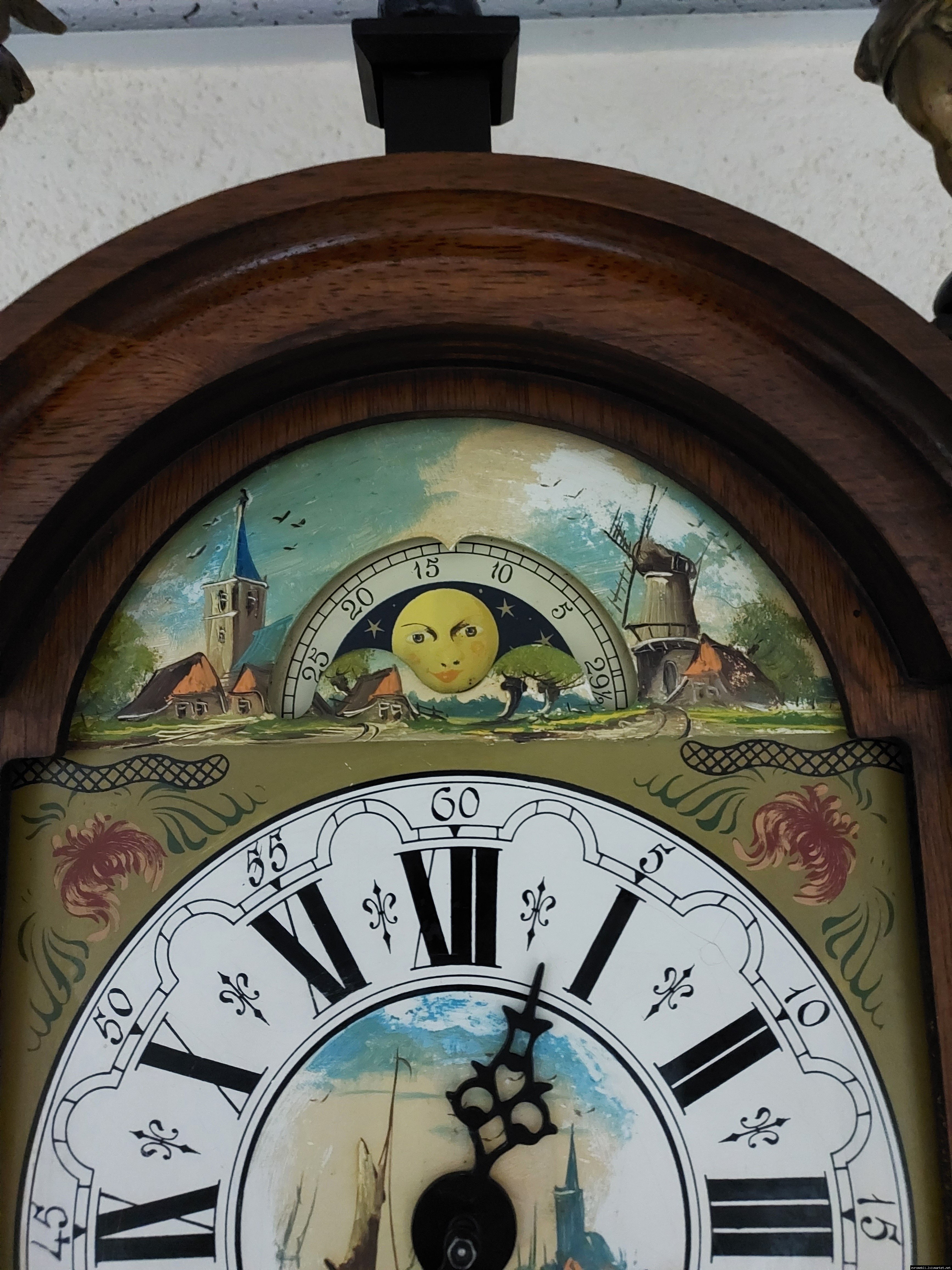 Старовинний настінний механічний годинник з боєм і місячним календарем. Годинник в деревяному корпусі, Голландія, механізм-Німеччина. Корпус годинника виготовлений з масиву натурального дерева, декорований литтям з латуні. На верхній частині корпусу розташовані масивні латунні фігурки. Циферблат металевий, декорований ручним розписом (голландські мотиви), під склом. Годинник в хорошому технічно справному стані, як по корпусу так і по механізму, з приємним боєм, відбиває кожні 15 хвилин.