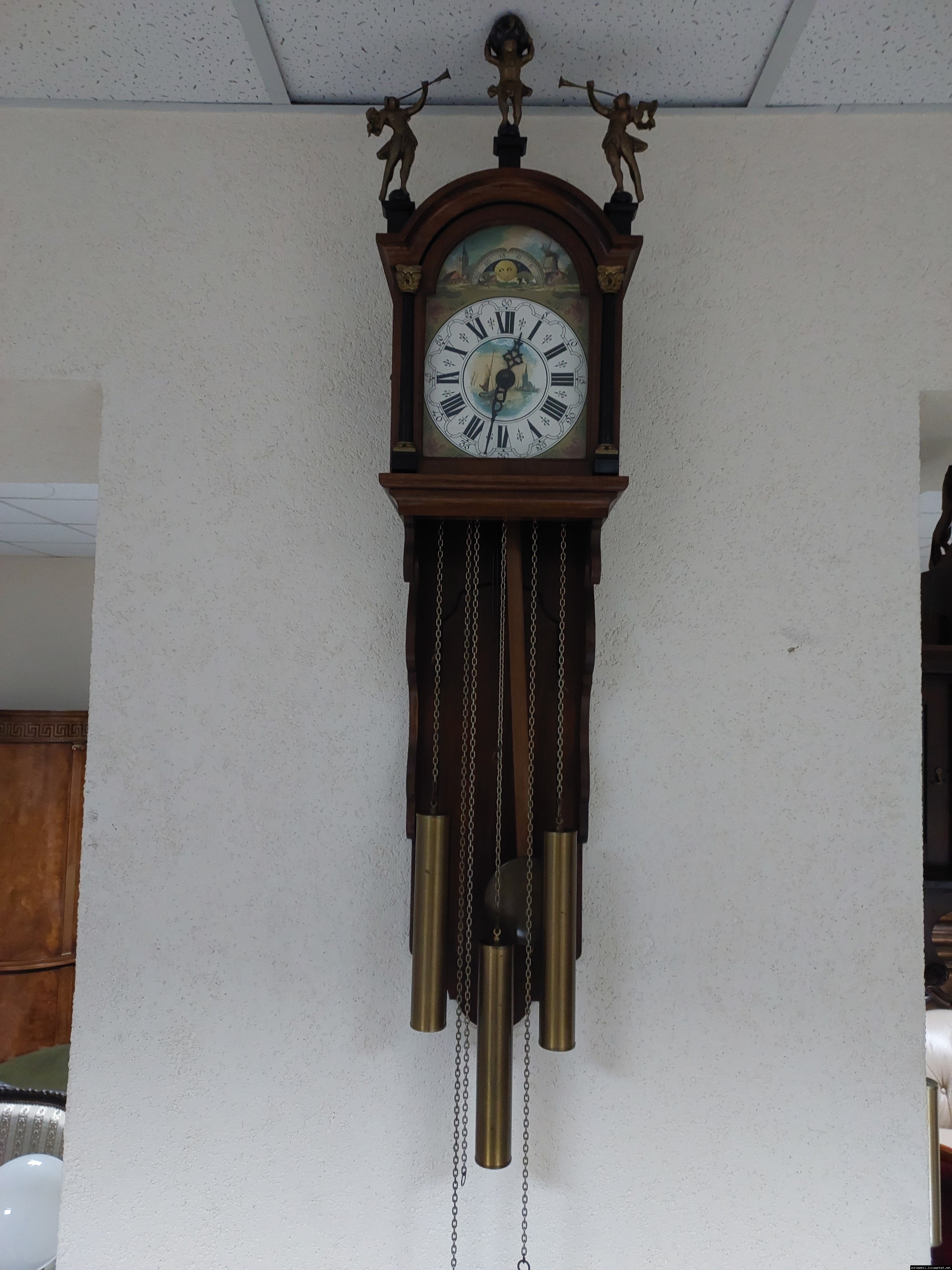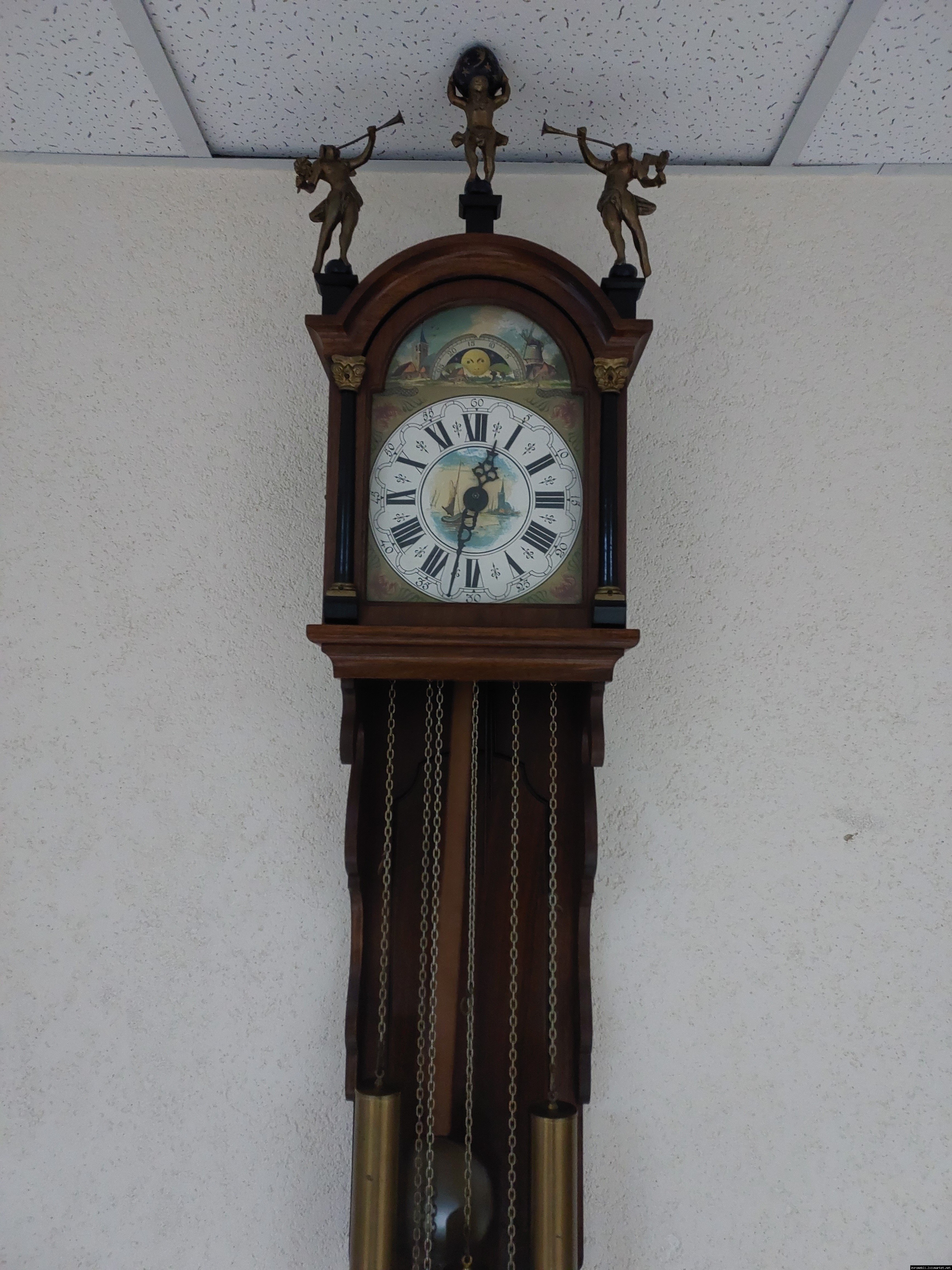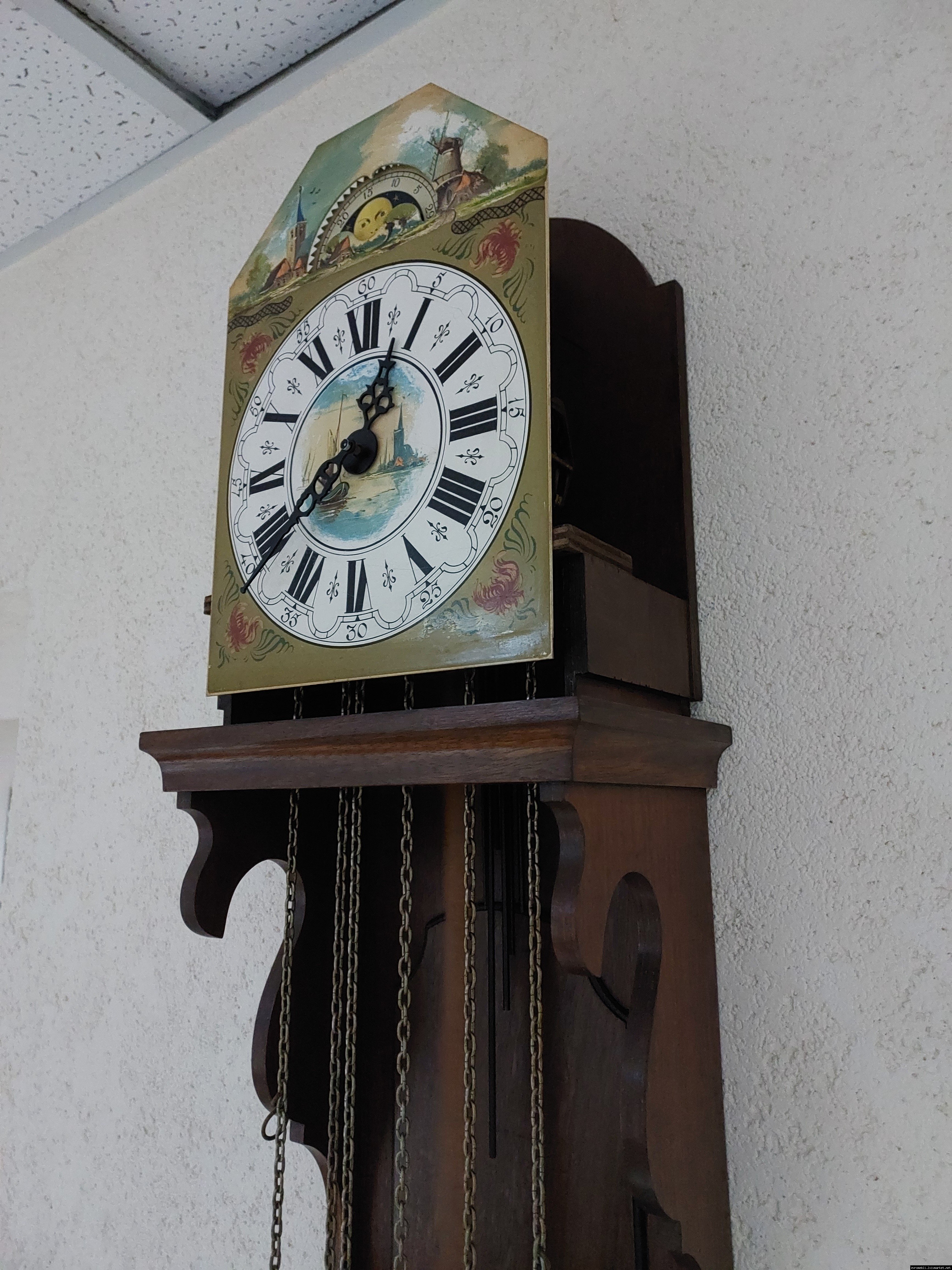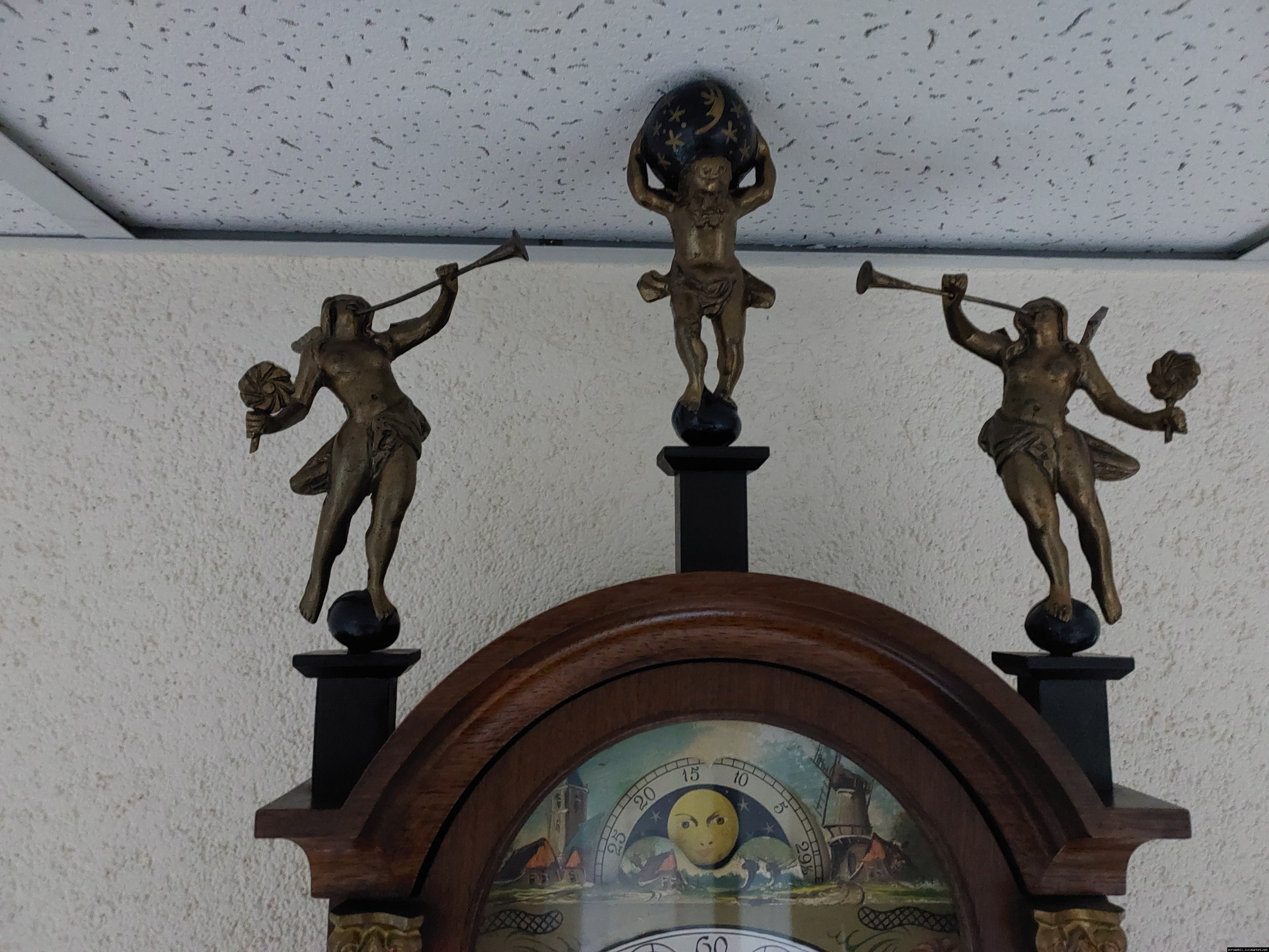 Старовинний настінний механічний годинник з боєм і місячним календарем. Годинник в деревяному корпусі, Голландія, механізм-Німеччина. Корпус годинника виготовлений з масиву натурального дерева, декорований литтям з латуні. На верхній частині корпусу розташовані масивні латунні фігурки. Циферблат металевий, декорований ручним розписом (голландські мотиви), під склом. Годинник в хорошому технічно справному стані, як по корпусу так і по механізму, з приємним боєм, відбиває кожні 15 хвилин.