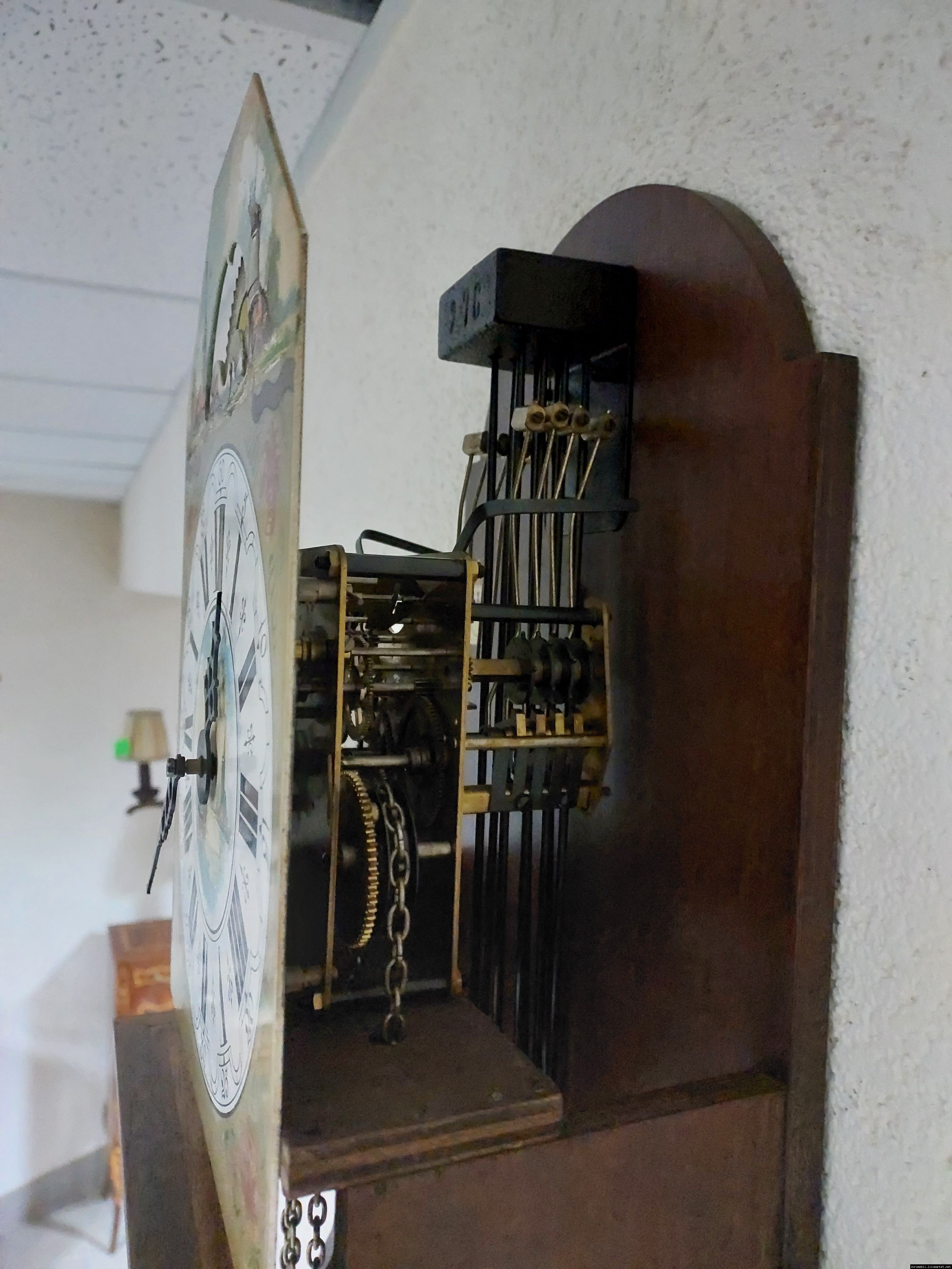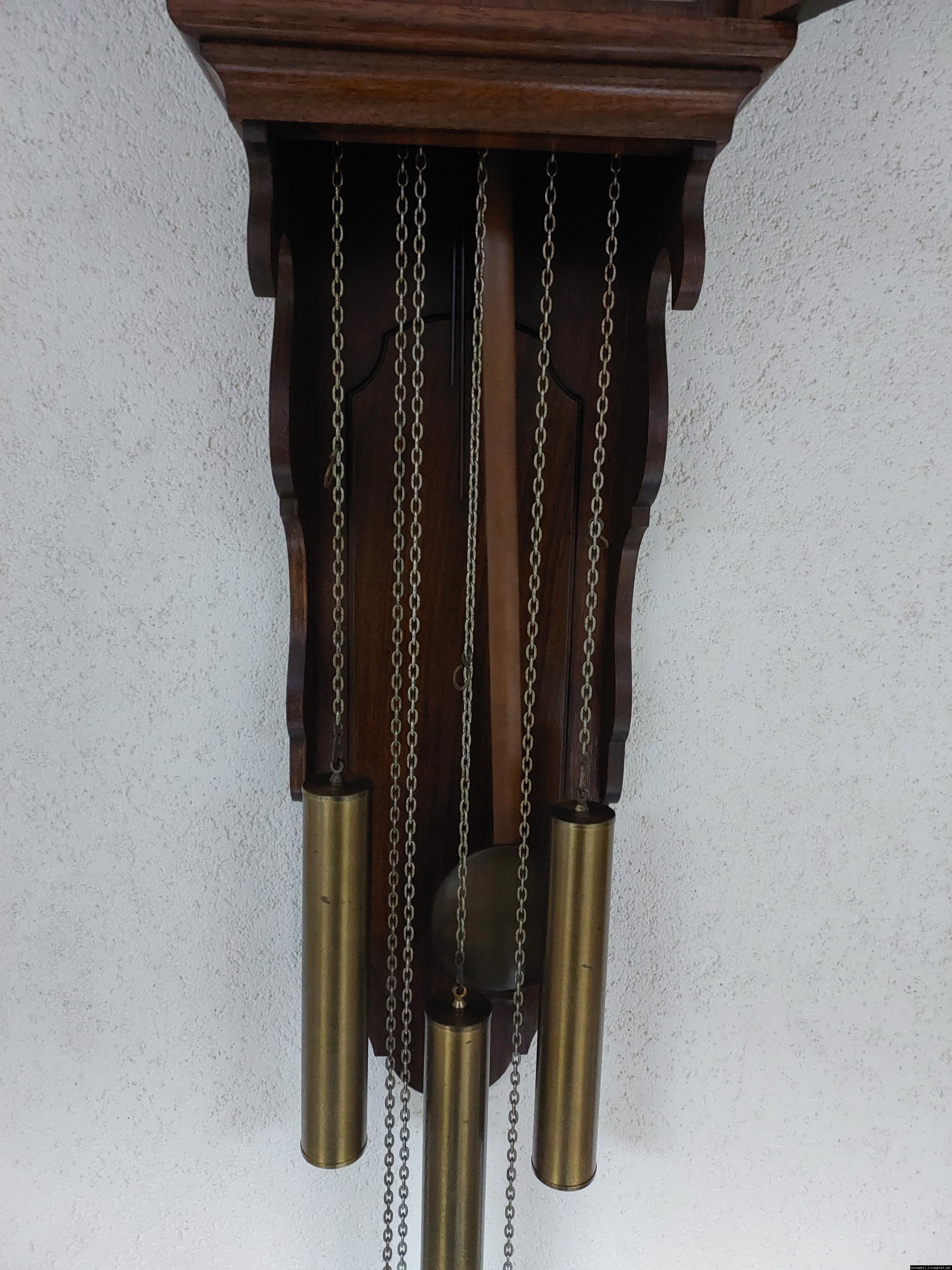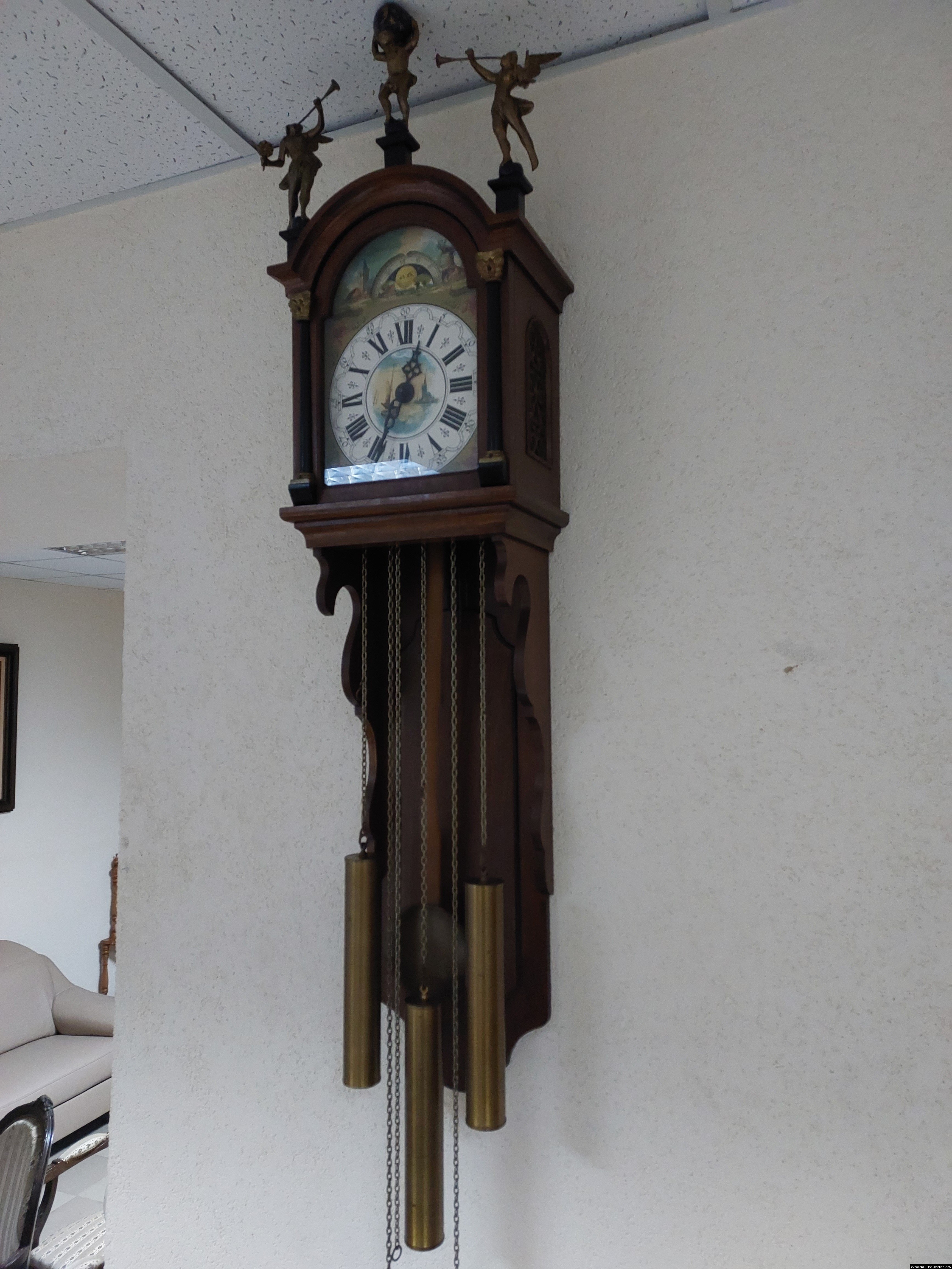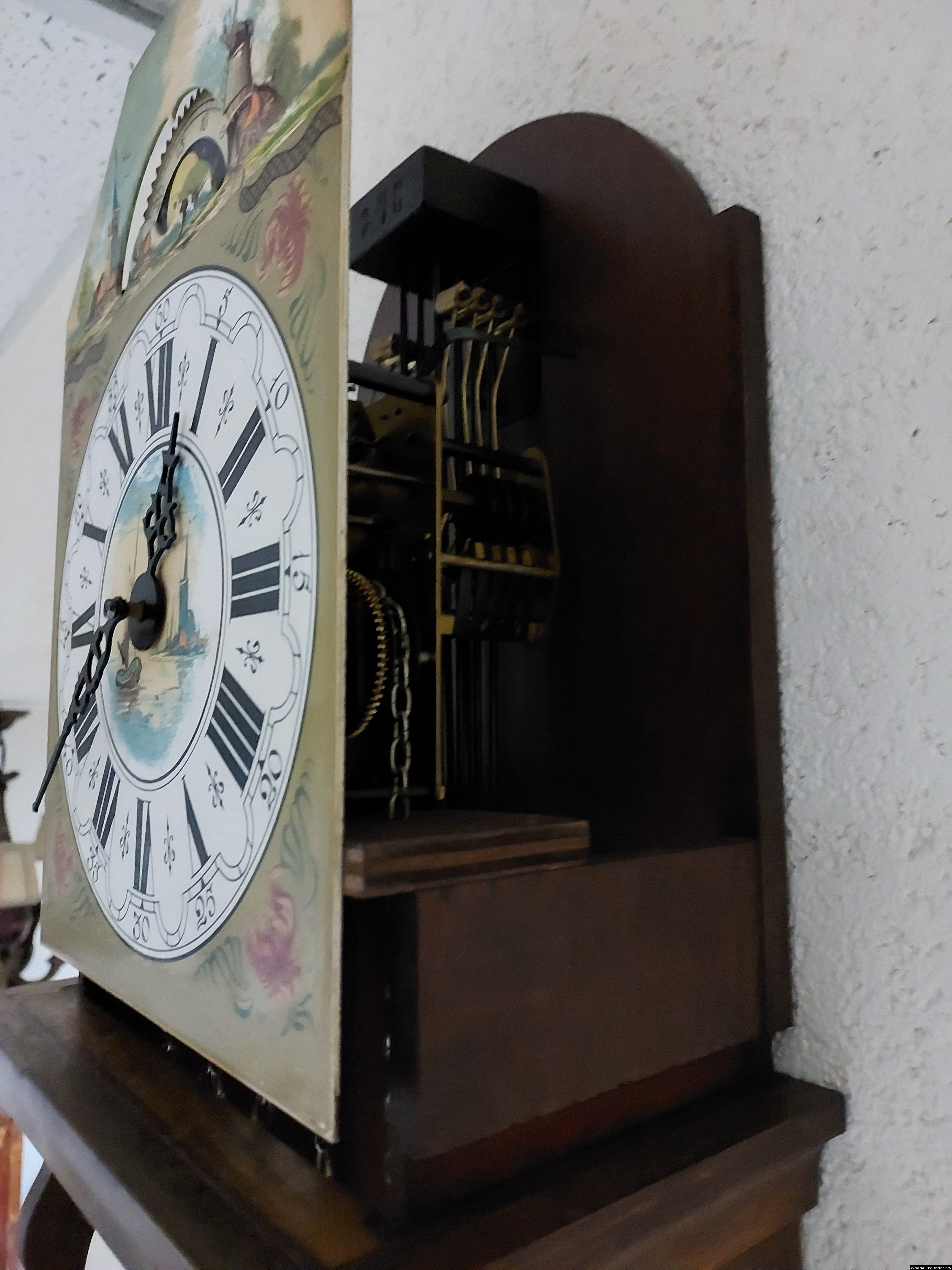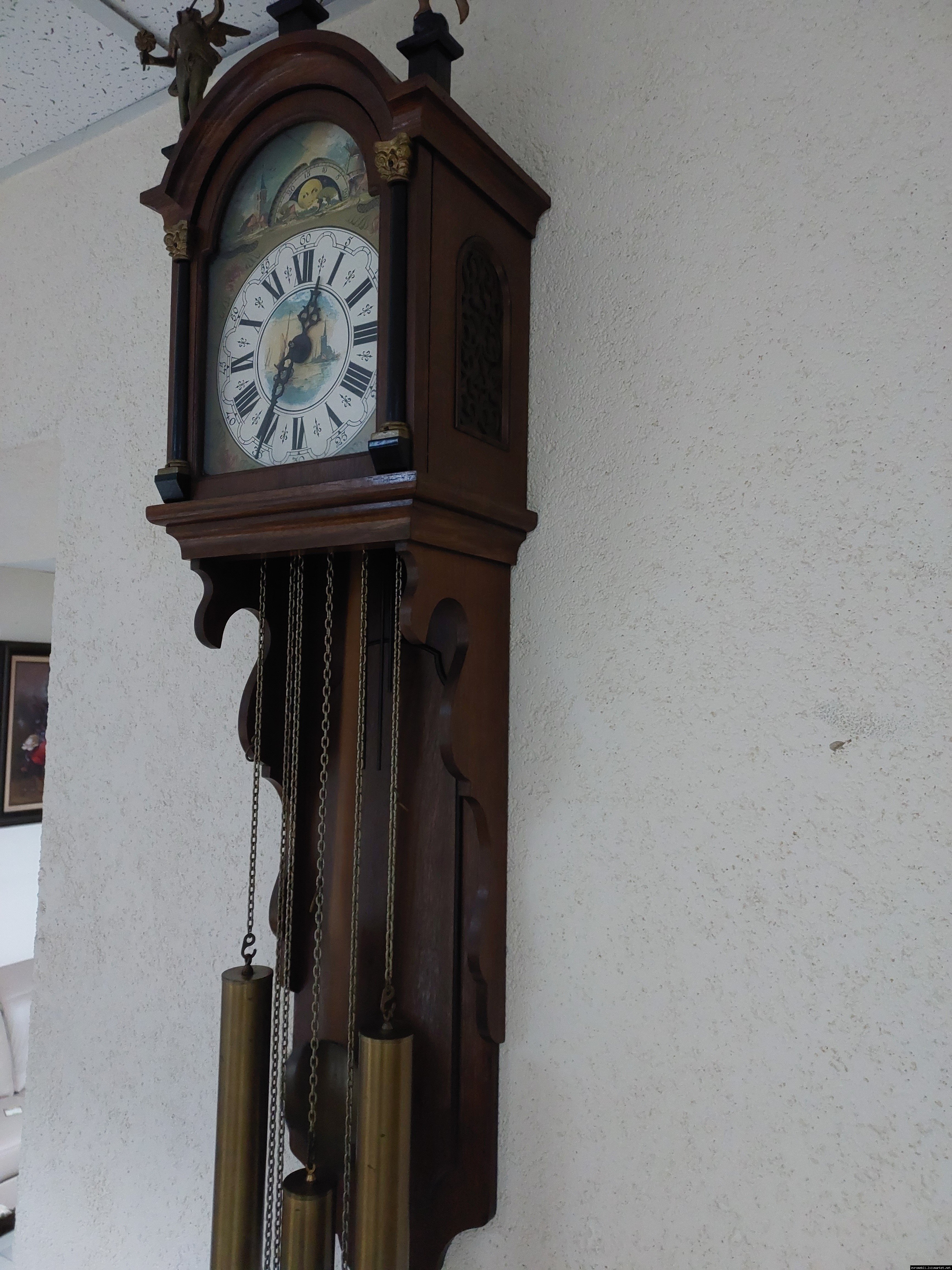 Старовинний настінний механічний годинник з боєм і місячним календарем. Годинник в деревяному корпусі, Голландія, механізм-Німеччина. Корпус годинника виготовлений з масиву натурального дерева, декорований литтям з латуні. На верхній частині корпусу розташовані масивні латунні фігурки. Циферблат металевий, декорований ручним розписом (голландські мотиви), під склом. Годинник в хорошому технічно справному стані, як по корпусу так і по механізму, з приємним боєм, відбиває кожні 15 хвилин.