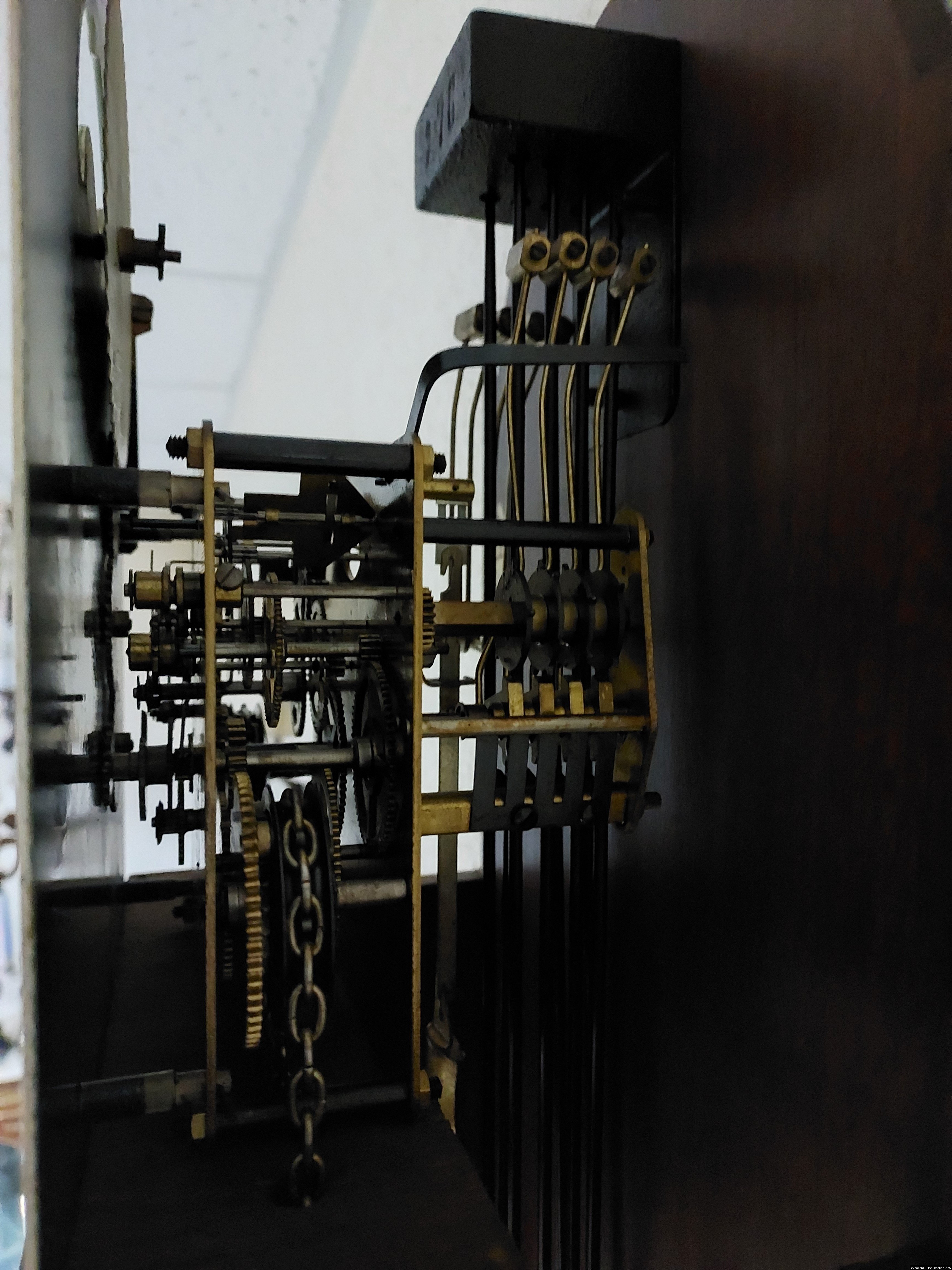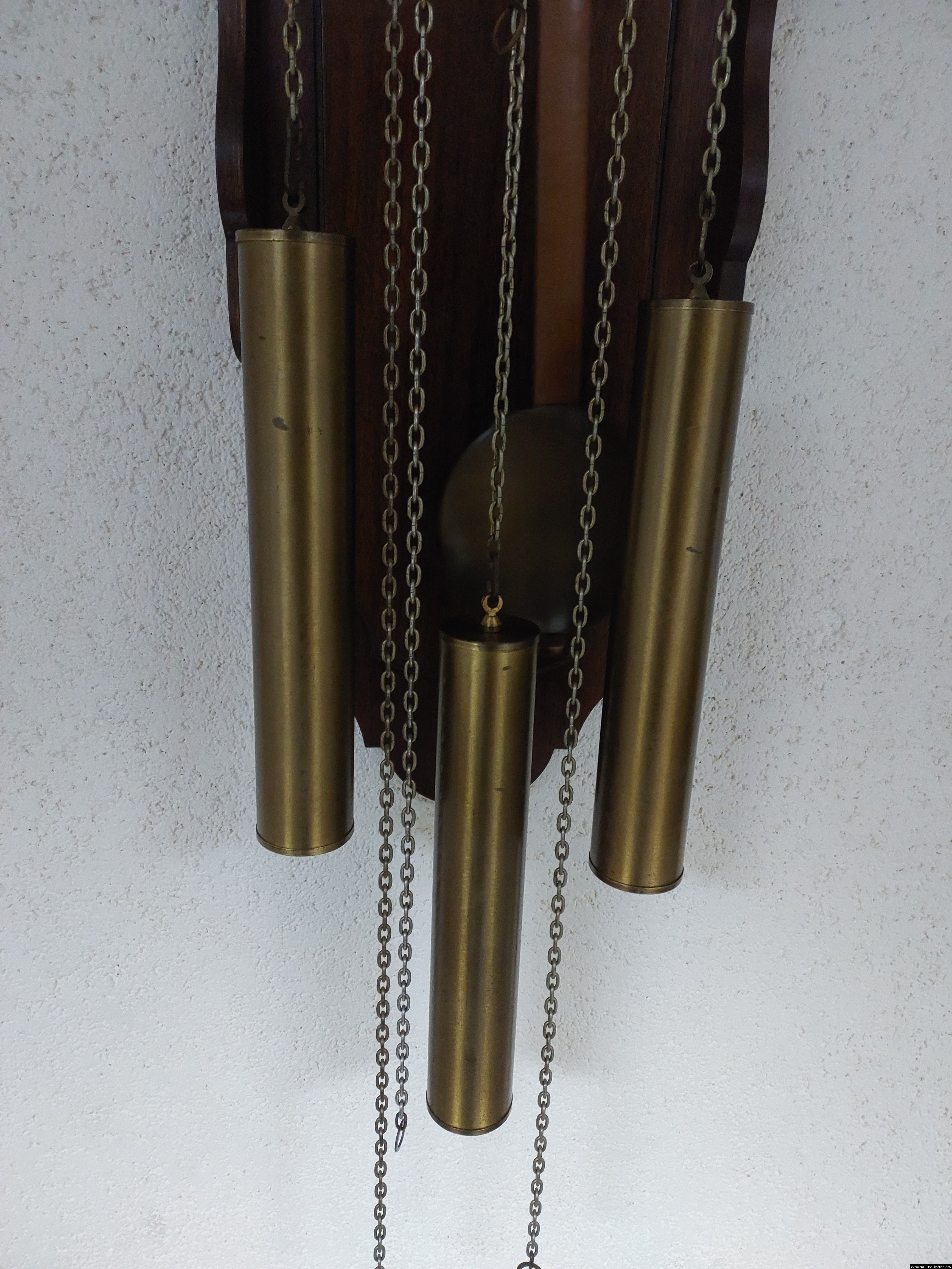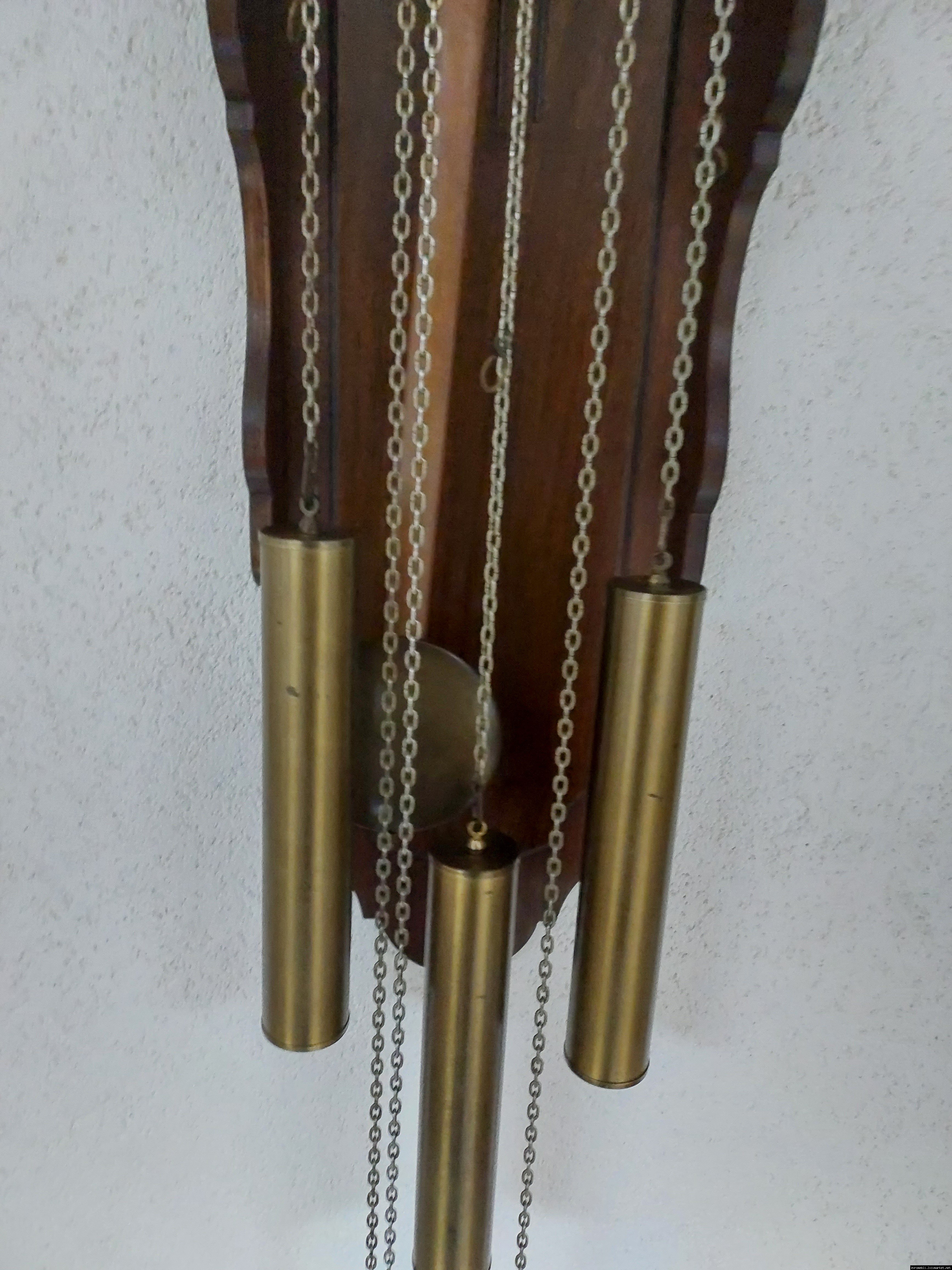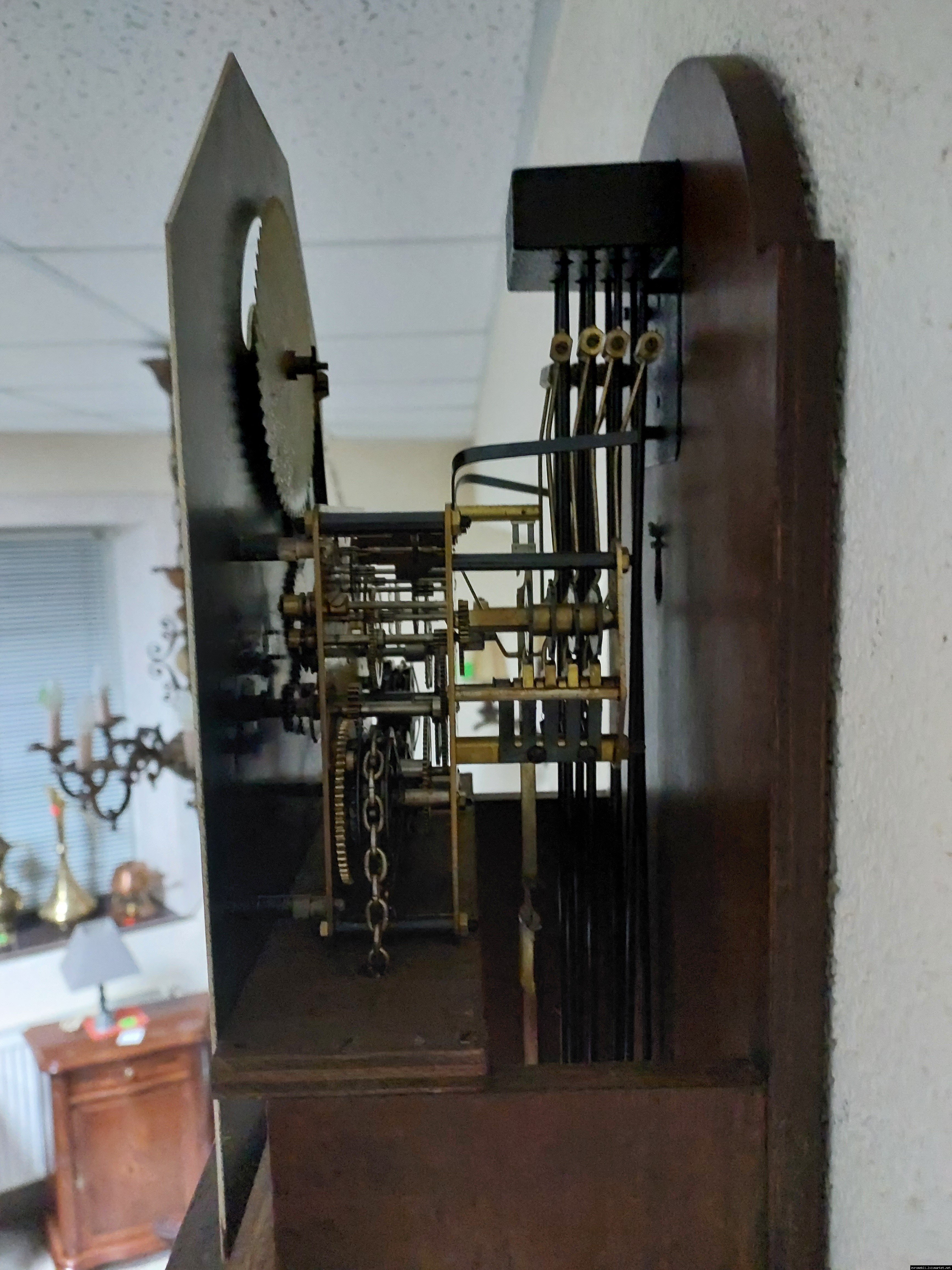 Старовинний настінний механічний годинник з боєм і місячним календарем. Годинник в деревяному корпусі, Голландія, механізм-Німеччина. Корпус годинника виготовлений з масиву натурального дерева, декорований литтям з латуні. На верхній частині корпусу розташовані масивні латунні фігурки. Циферблат металевий, декорований ручним розписом (голландські мотиви), під склом. Годинник в хорошому технічно справному стані, як по корпусу так і по механізму, з приємним боєм, відбиває кожні 15 хвилин.