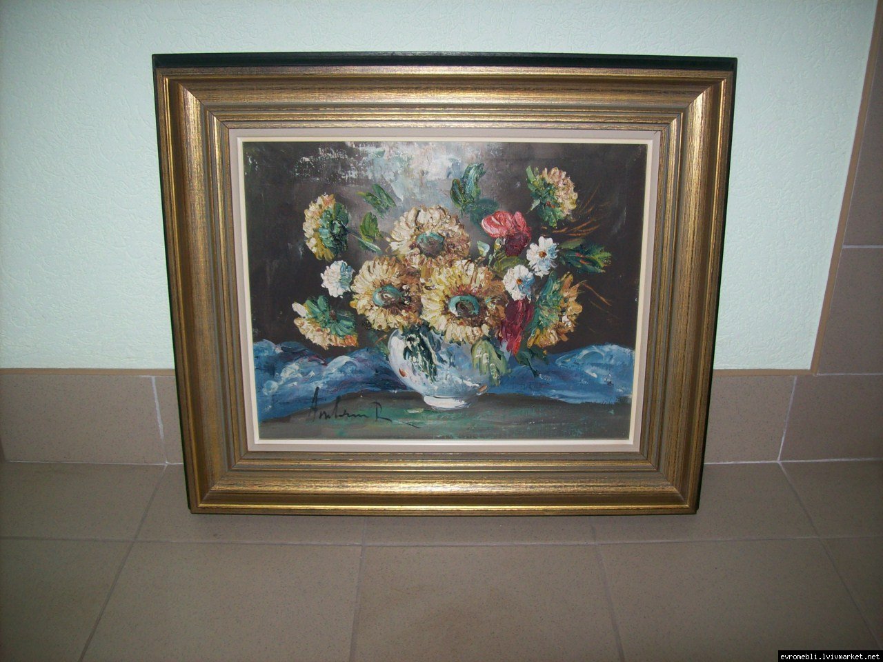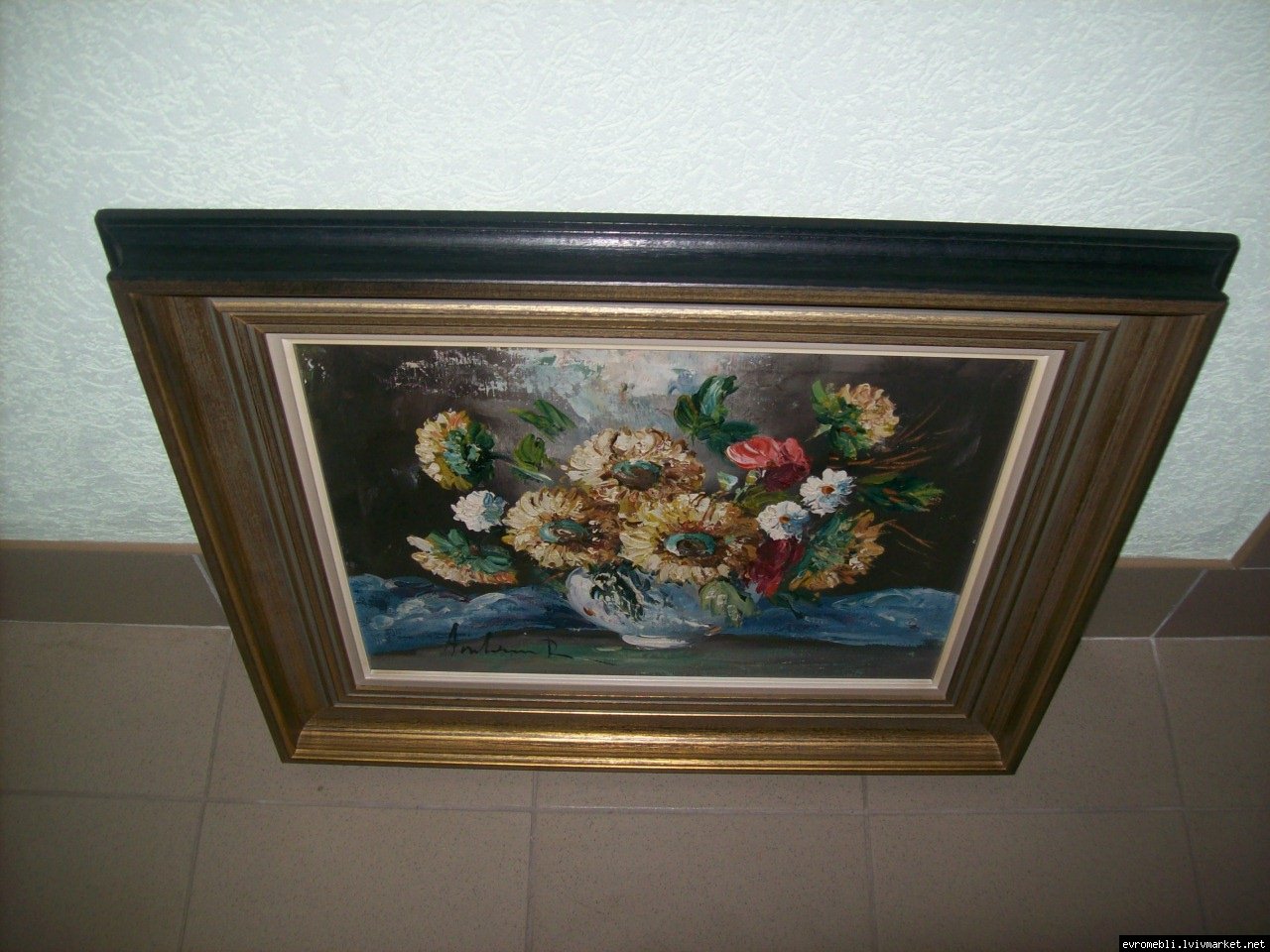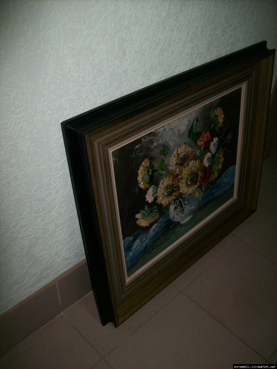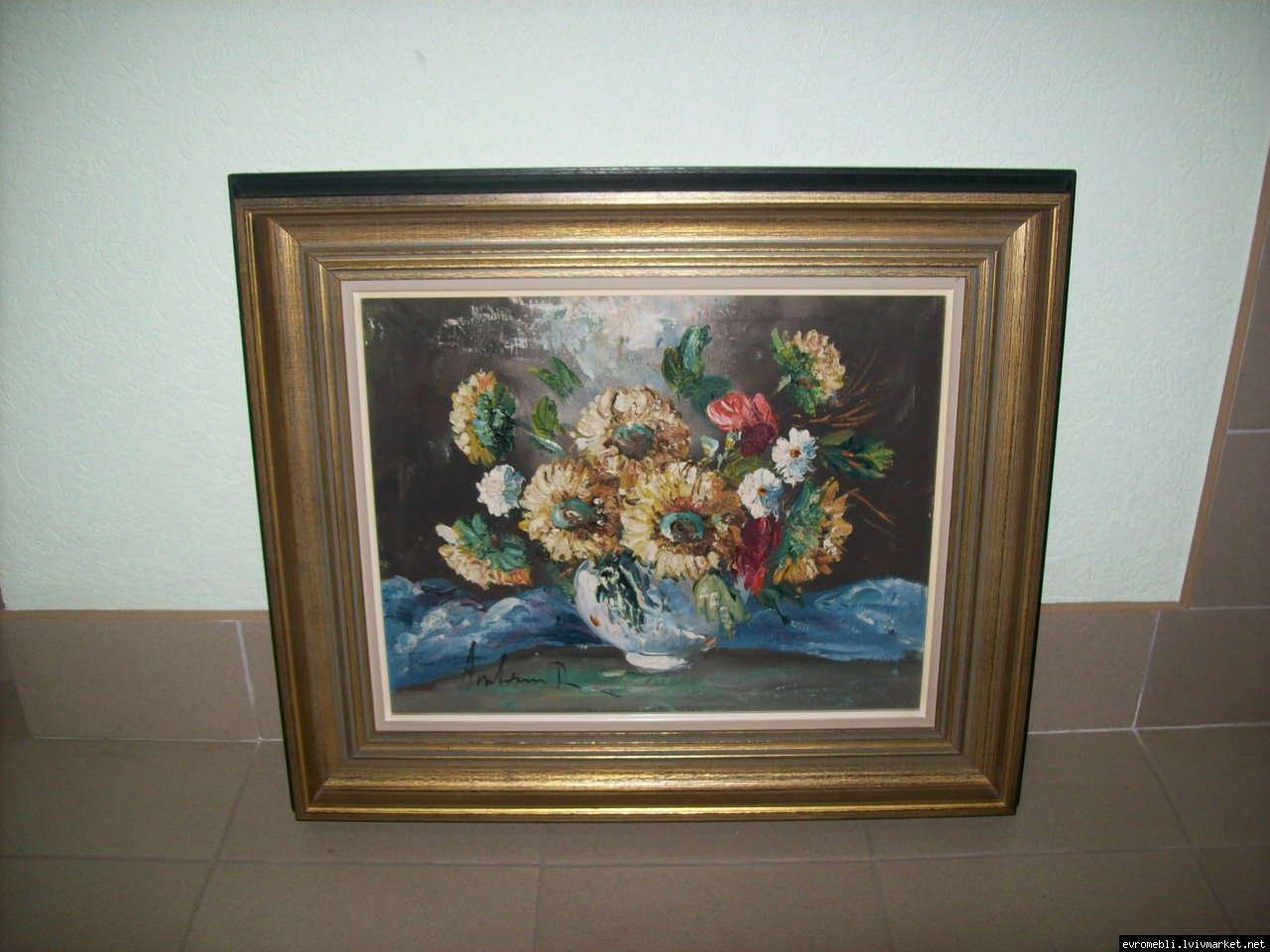 Картина мальована, масло, "Квіти в вазі". Картина в деревяній рамці золотистого кольору, в хорошому стані, привезена з Бельгії. Картина маслом - завершальний яскравий акцент в інтер'єрі, додасть затишку в будинок і подарує чудовий настрій.
