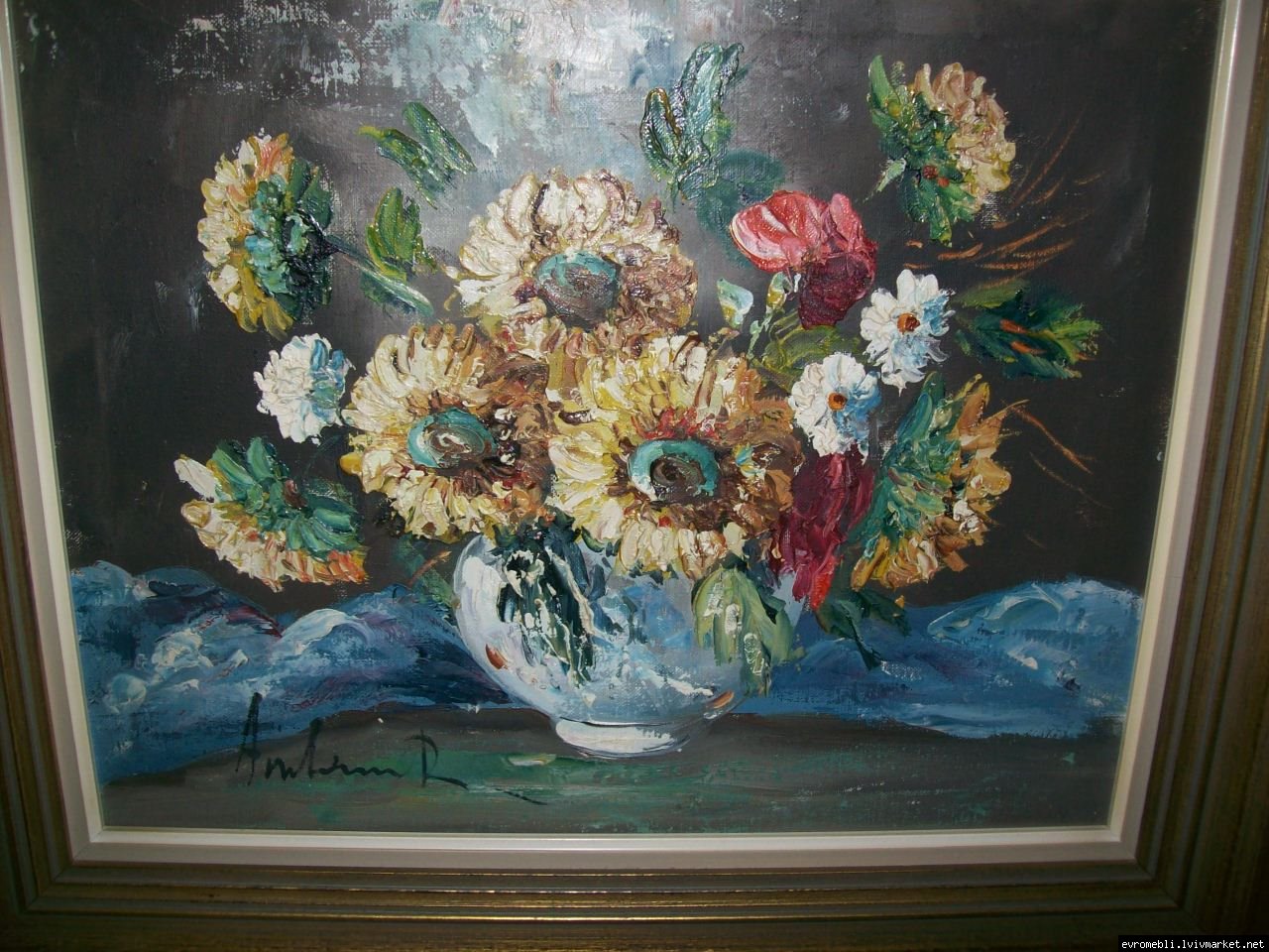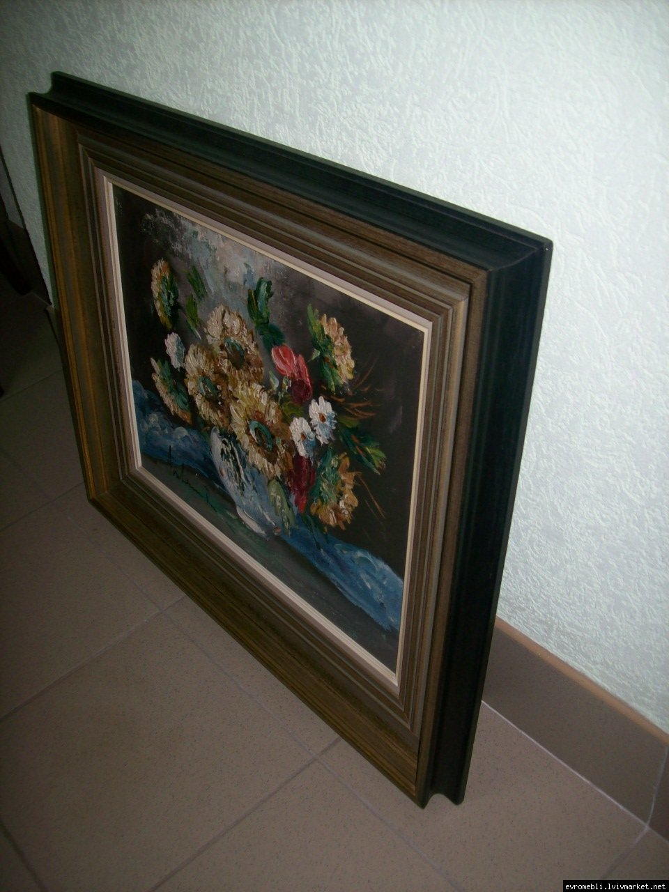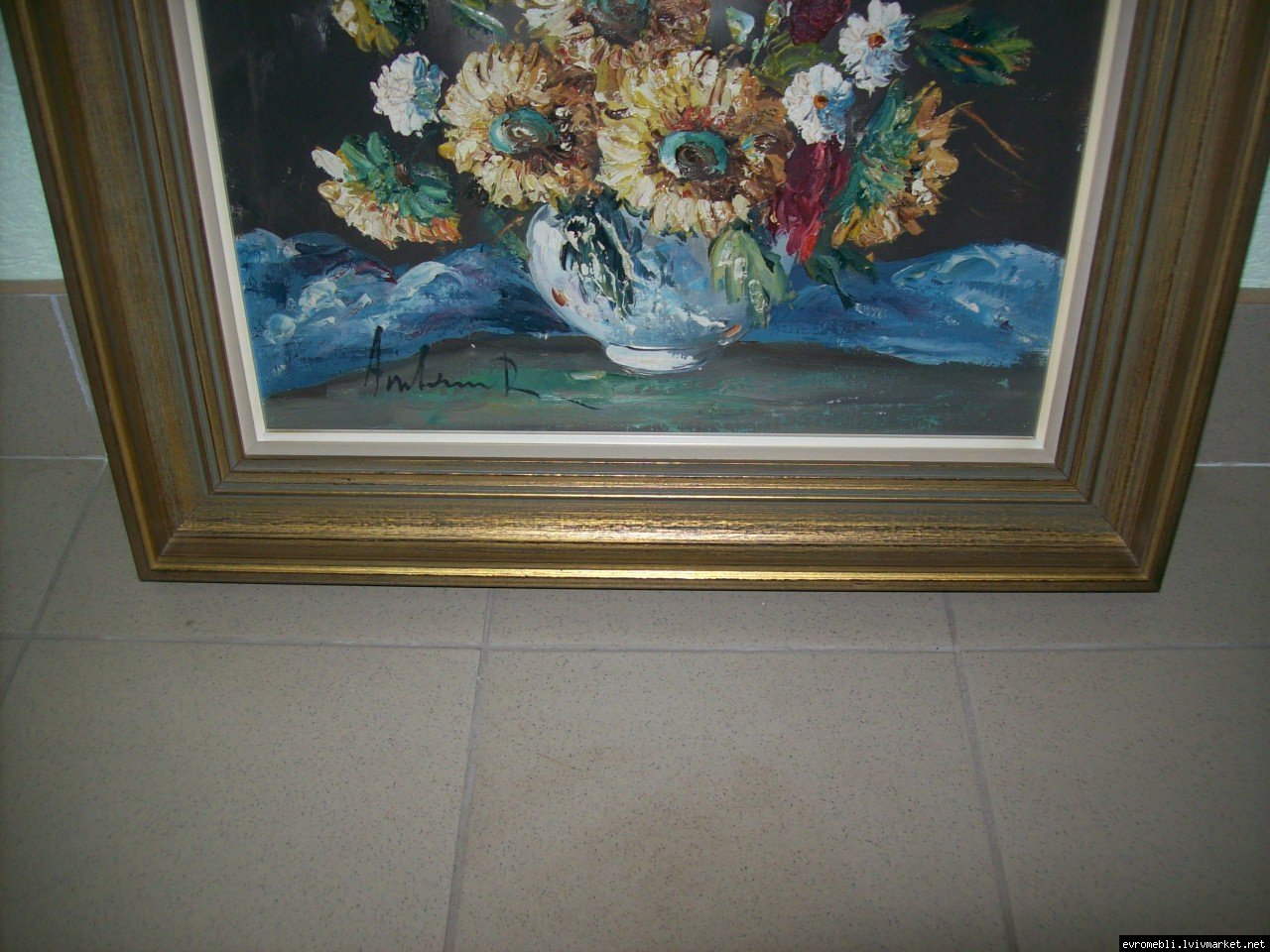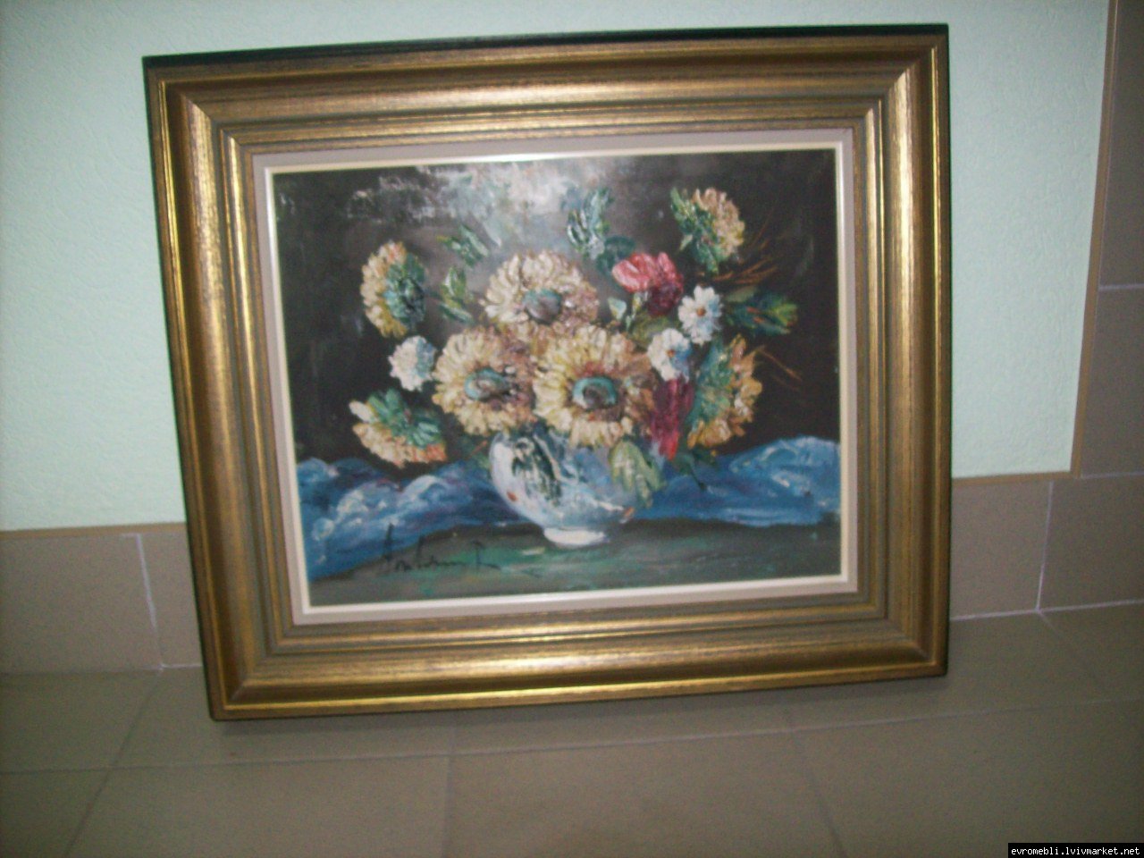 Картина мальована, масло, "Квіти в вазі". Картина в деревяній рамці золотистого кольору, в хорошому стані, привезена з Бельгії. Картина маслом - завершальний яскравий акцент в інтер'єрі, додасть затишку в будинок і подарує чудовий настрій.
