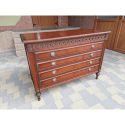 Красивий, раритетний, старовинний деревяний комод. Комод на чотирьох точених ніжках, виготовлений з масиву натурального червоного дерева, декорований елементами різьби, має чотири шухляди, ручки шухляд виготовлені з латуні та декоровані литтям. Комод повністю масивний,в хорошому стані, привезений з Бельгії.