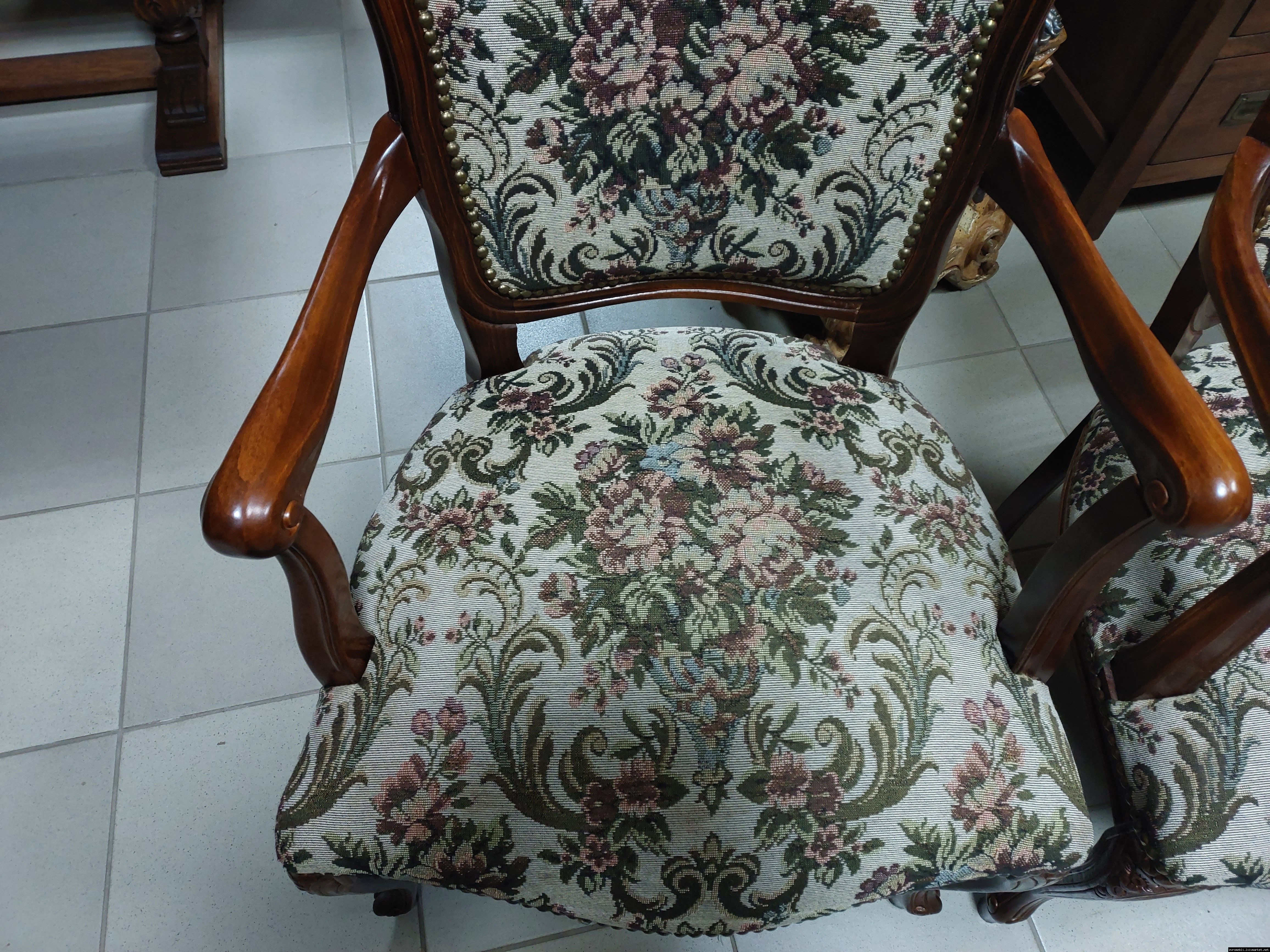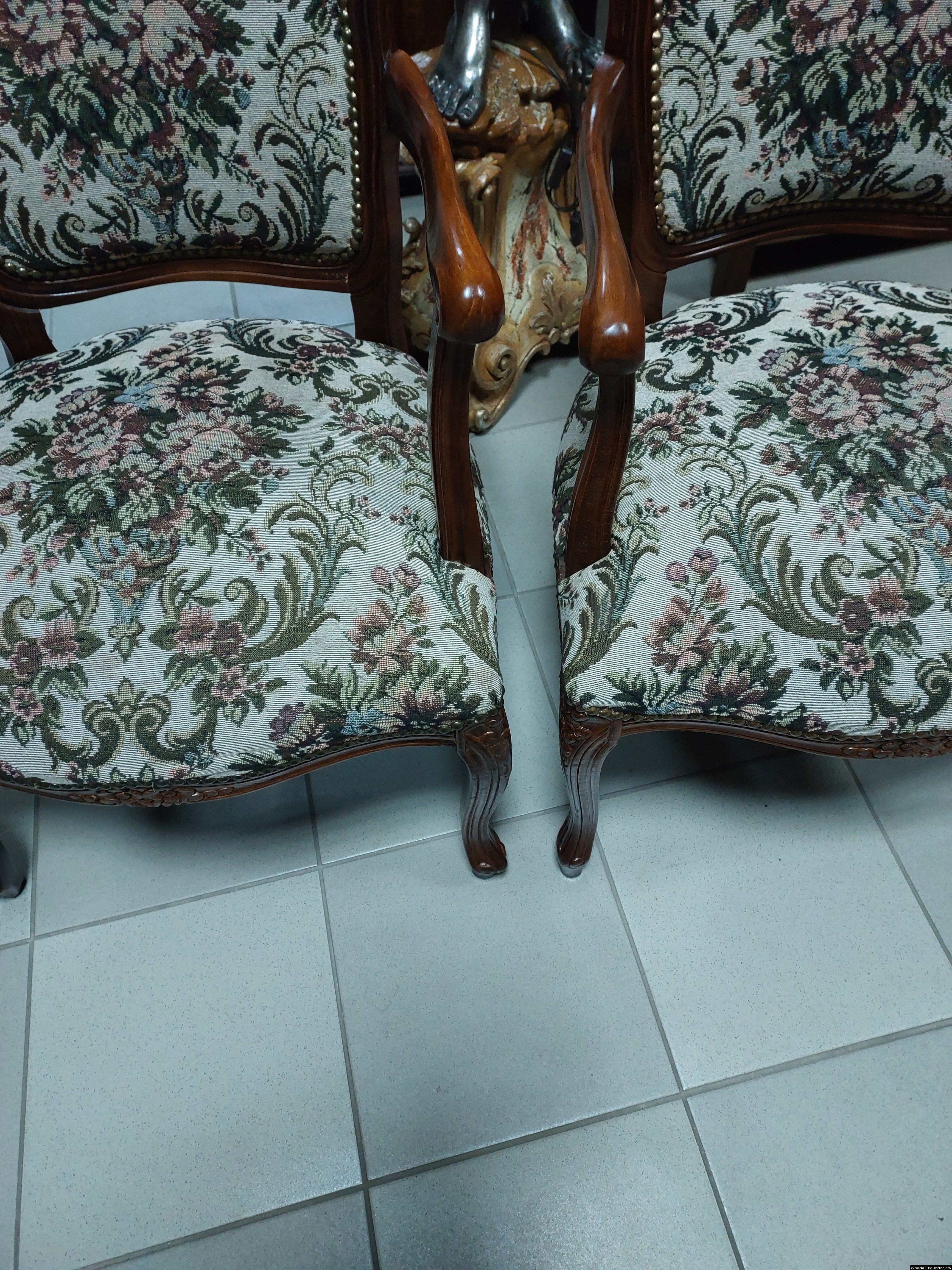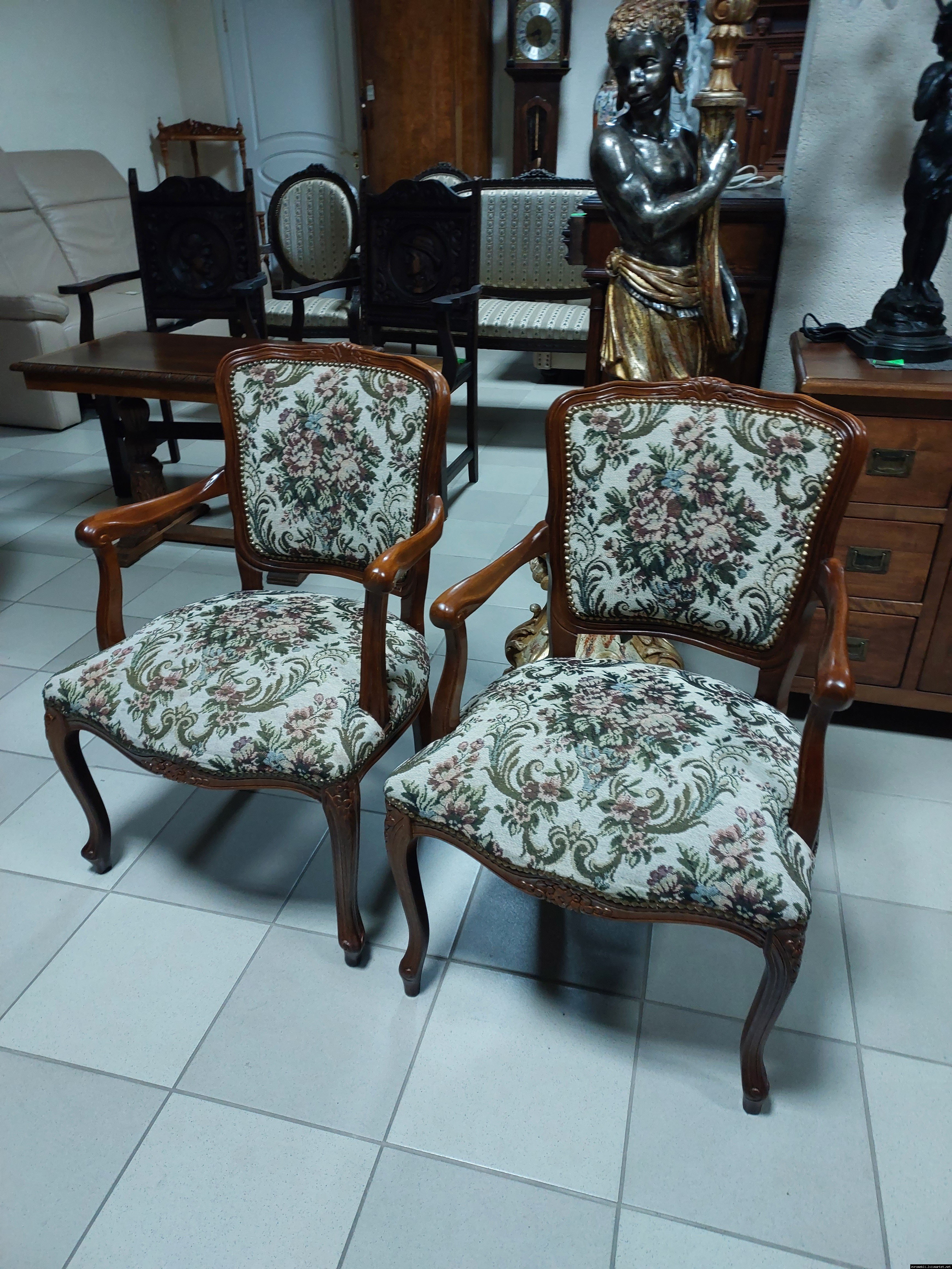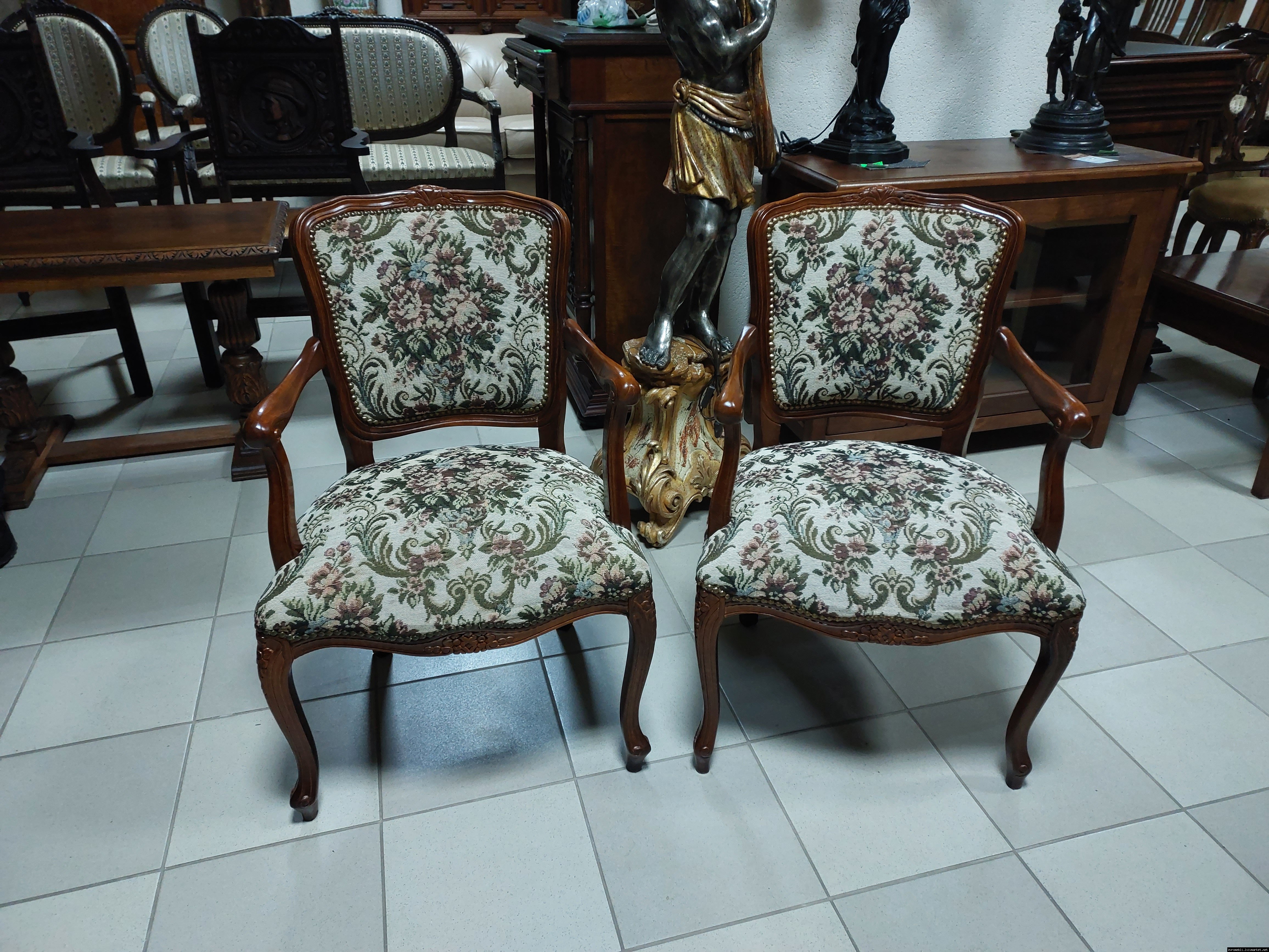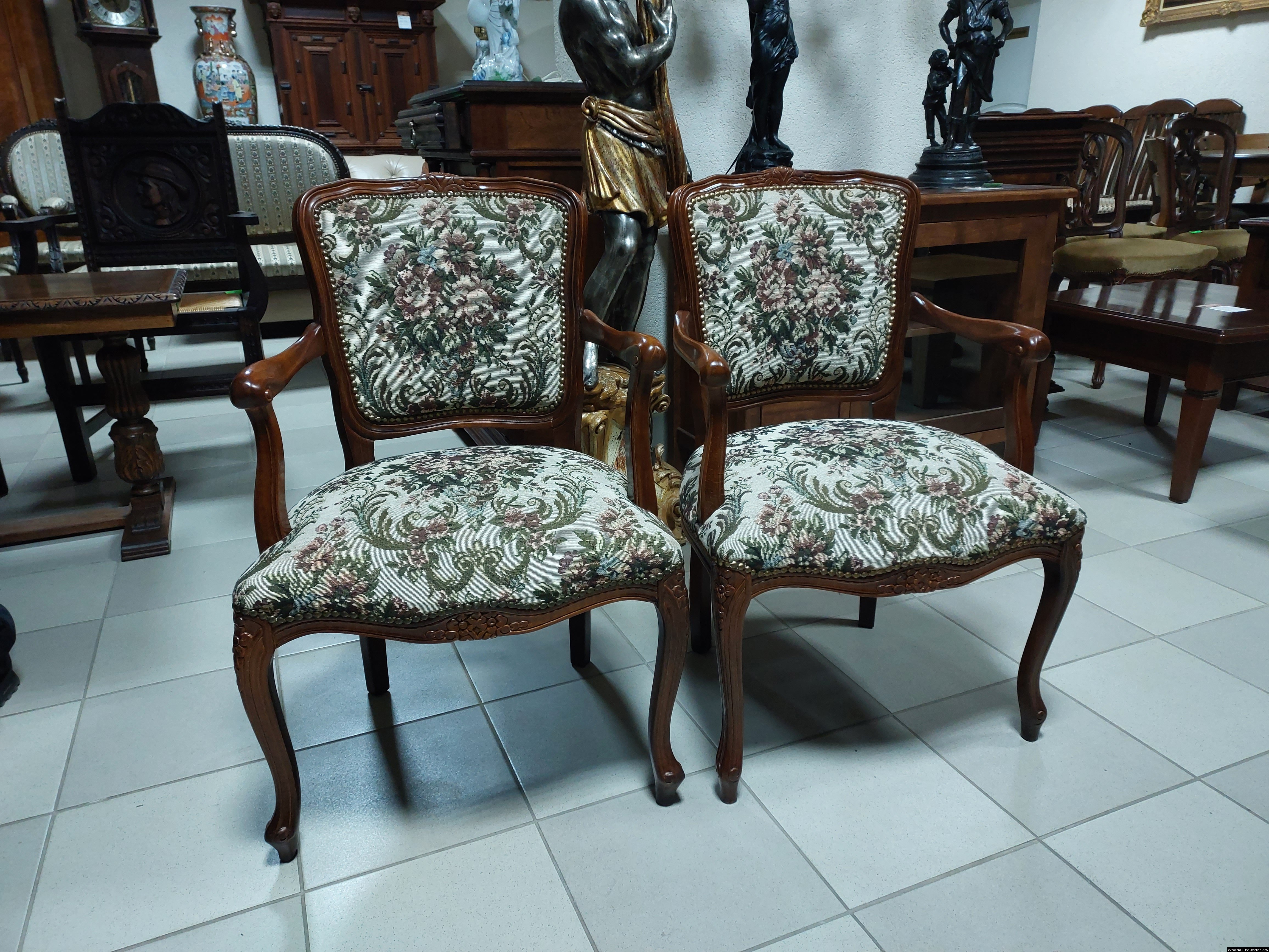 Пара красивих крісел з підлокотниками в стилі Луї XV, в комплекті дві штуки. Крісла виготовлені з натурального дерева, темно- золотистий дуб, масив, щедро декоровані елементами різьби ручної роботи, обшиті тканиною, тканина оздоблена вишивкою ручної роботи та декоративними цвяшками. Крісла зручні та комфортні, в хорошому стані, привезені з Бельгії.