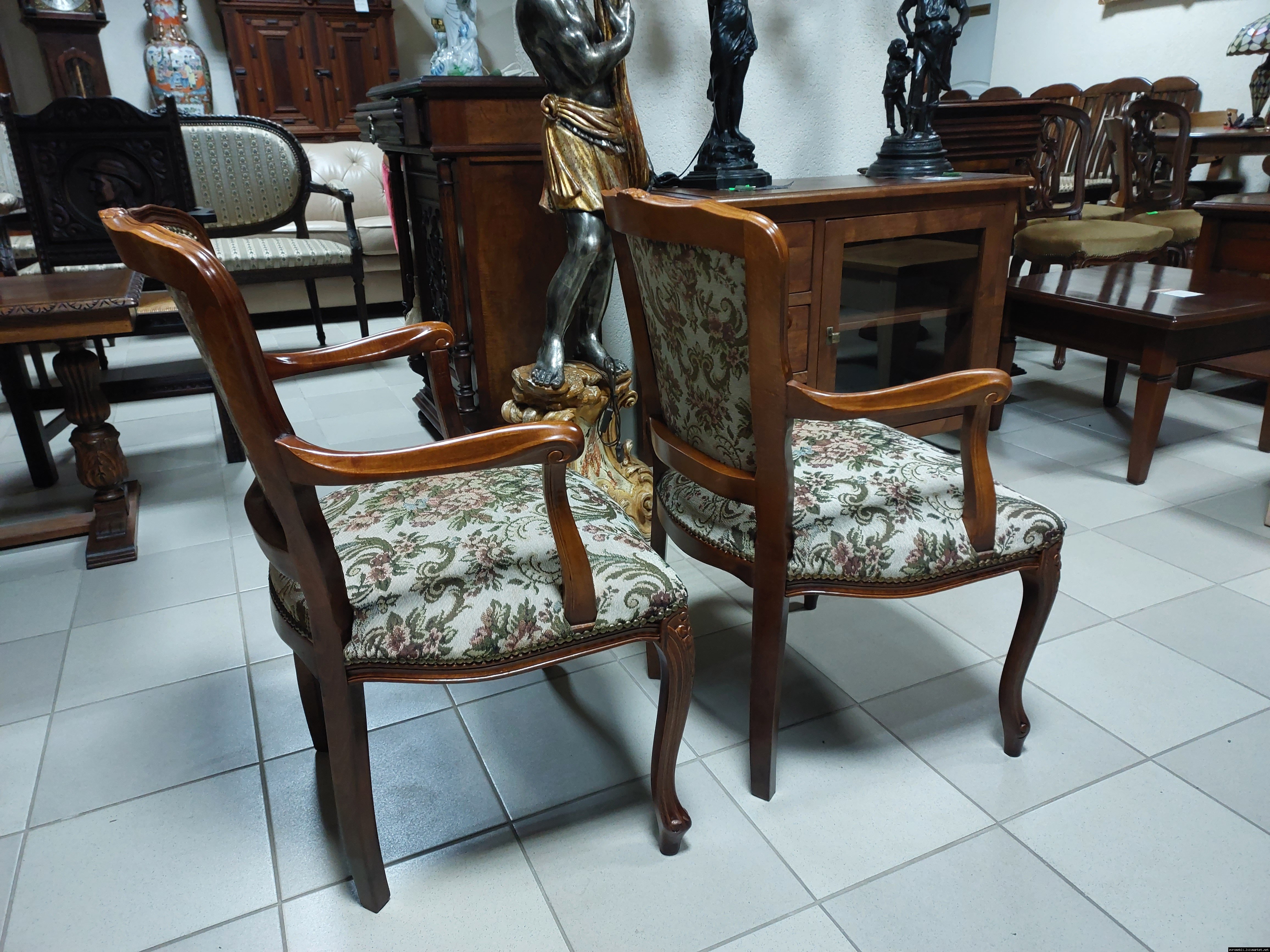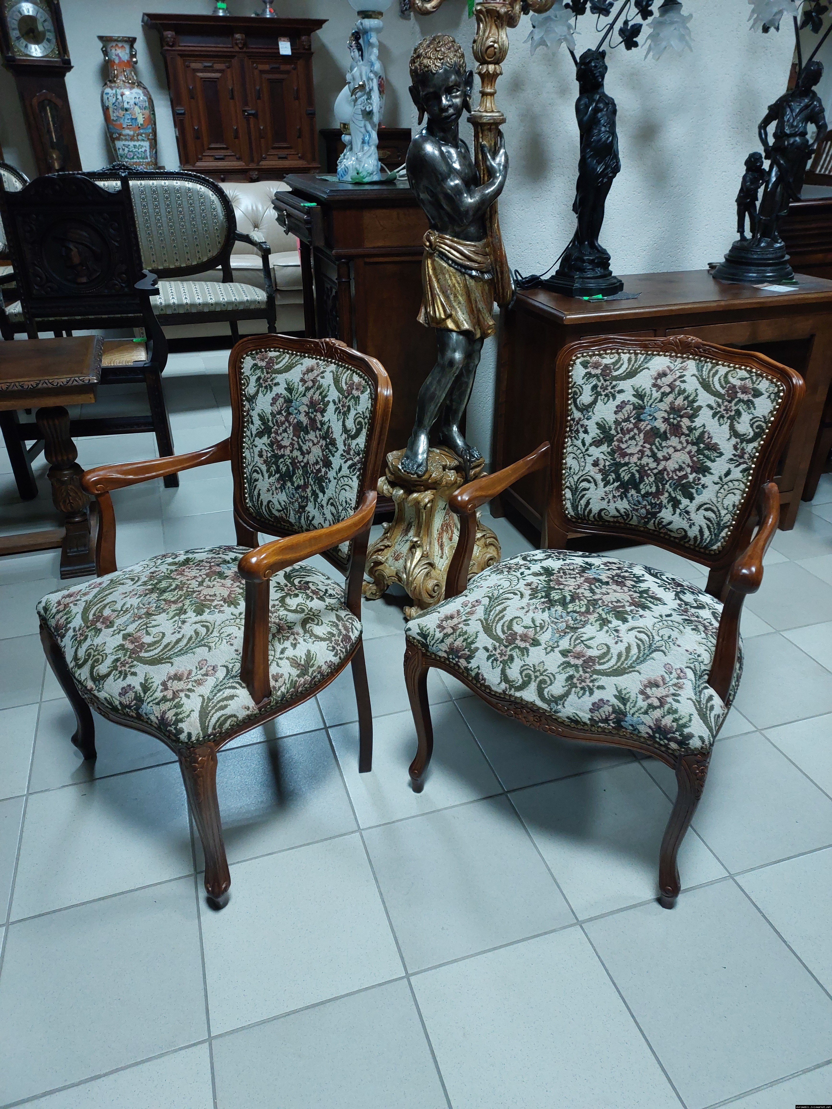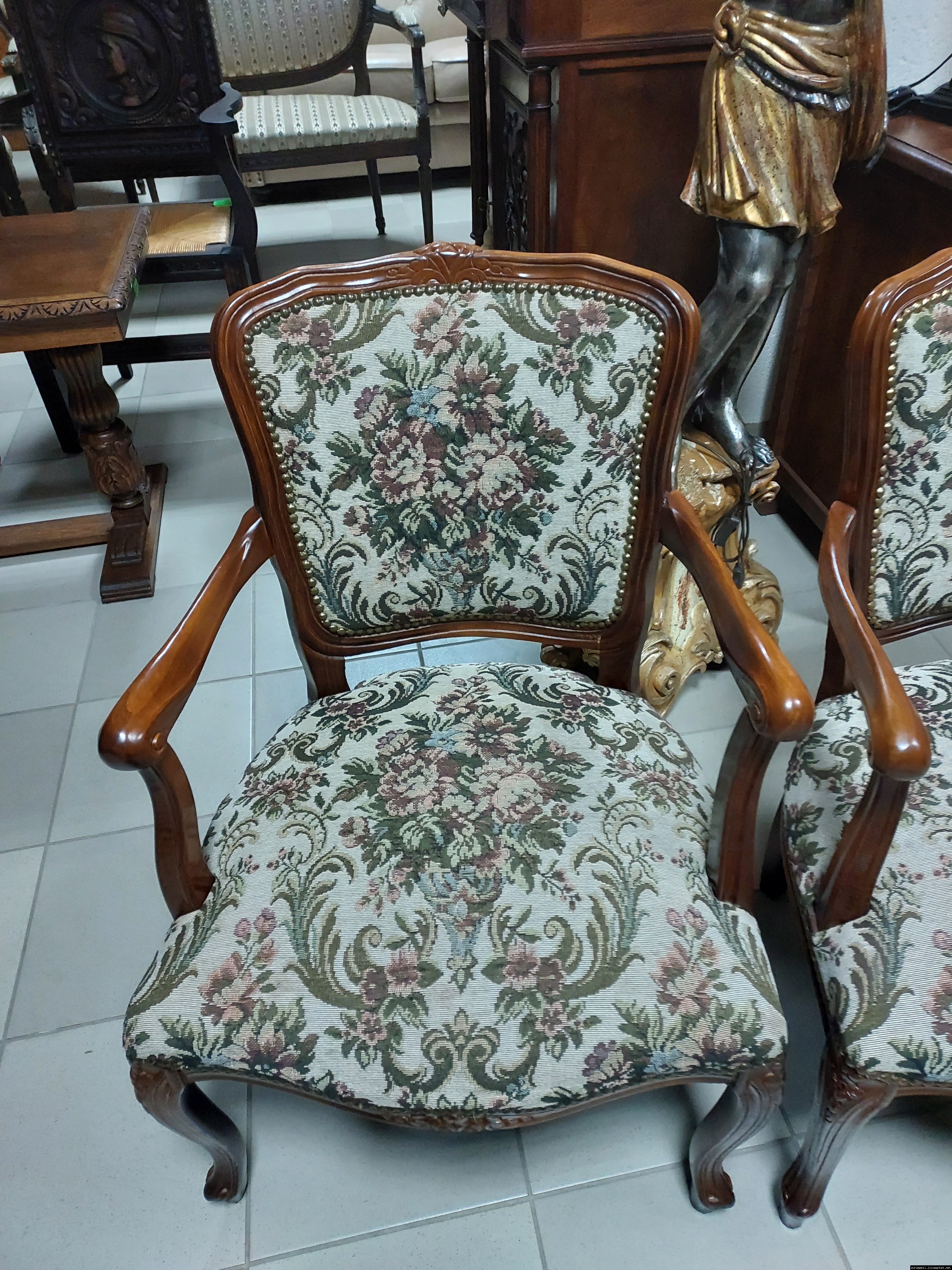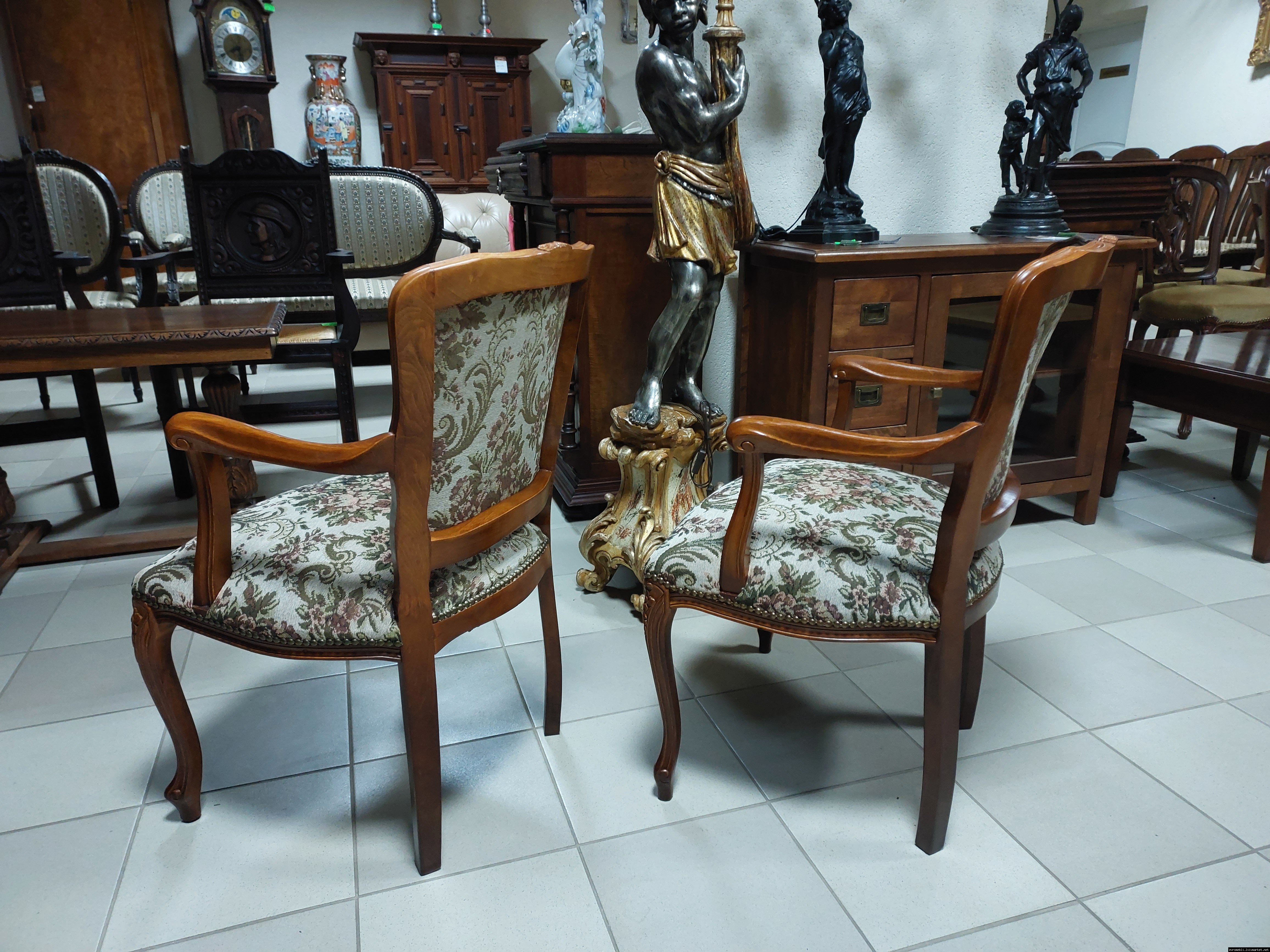 Пара красивих крісел з підлокотниками в стилі Луї XV, в комплекті дві штуки. Крісла виготовлені з натурального дерева, темно- золотистий дуб, масив, щедро декоровані елементами різьби ручної роботи, обшиті тканиною, тканина оздоблена вишивкою ручної роботи та декоративними цвяшками. Крісла зручні та комфортні, в хорошому стані, привезені з Бельгії.