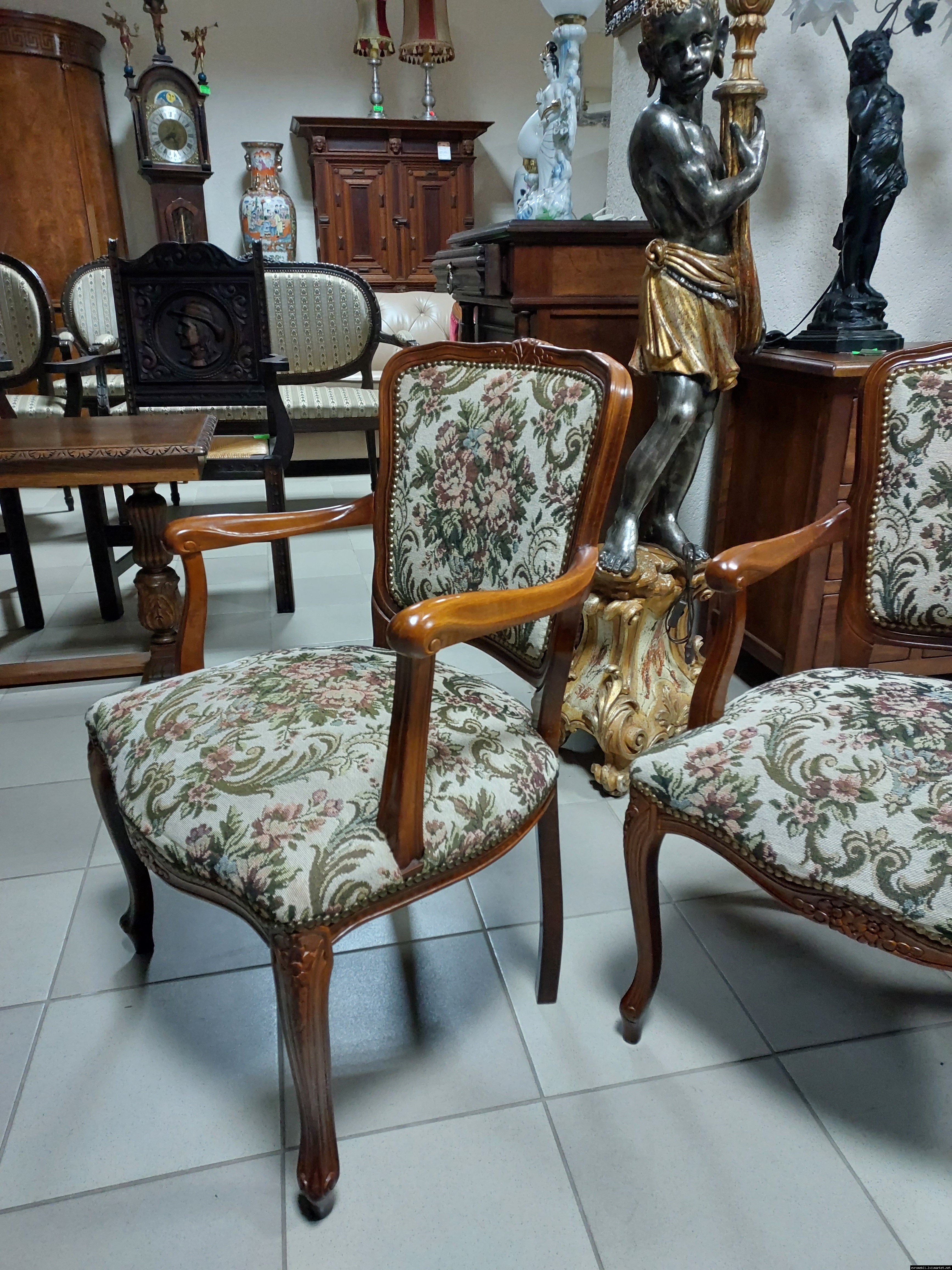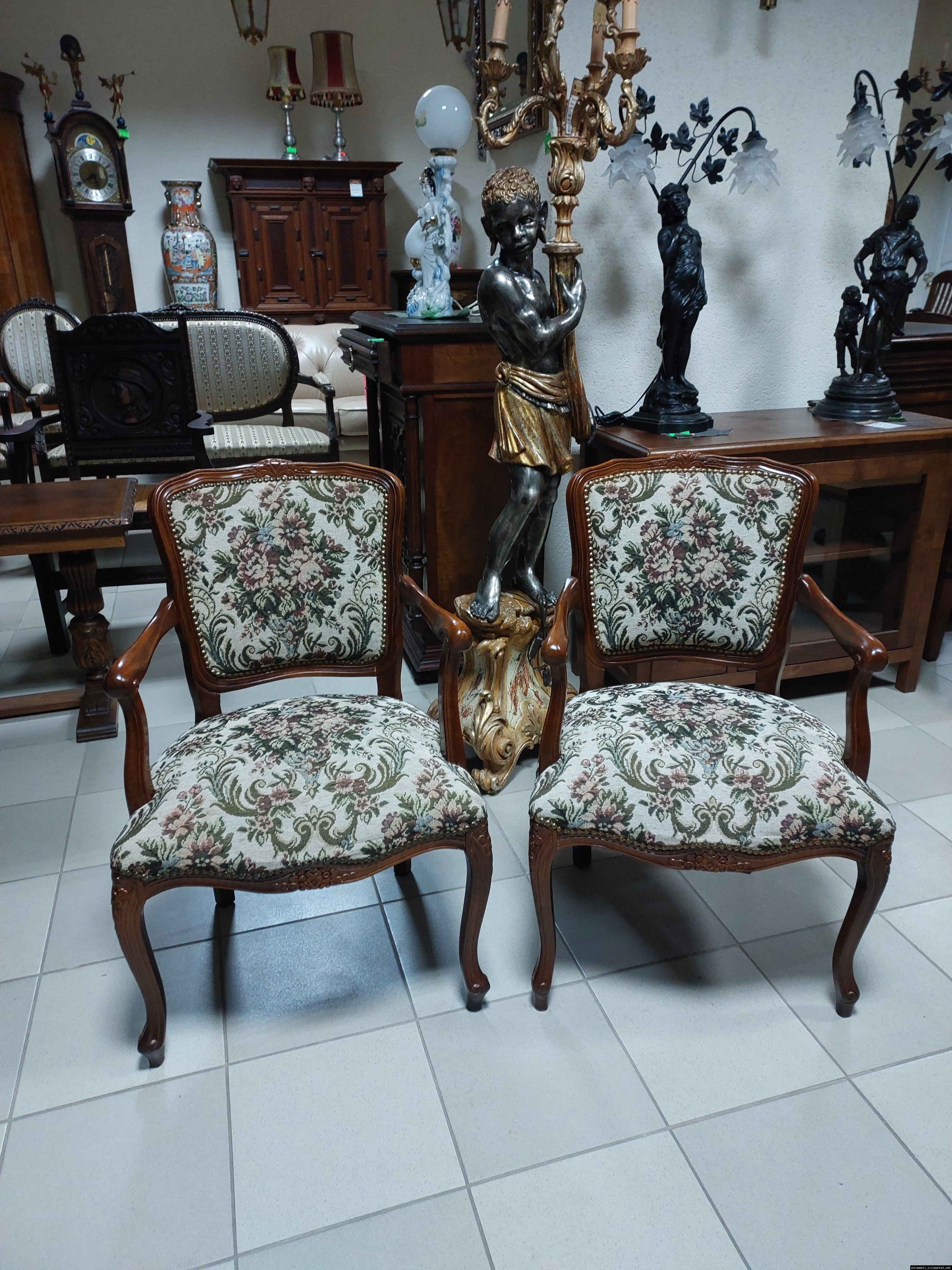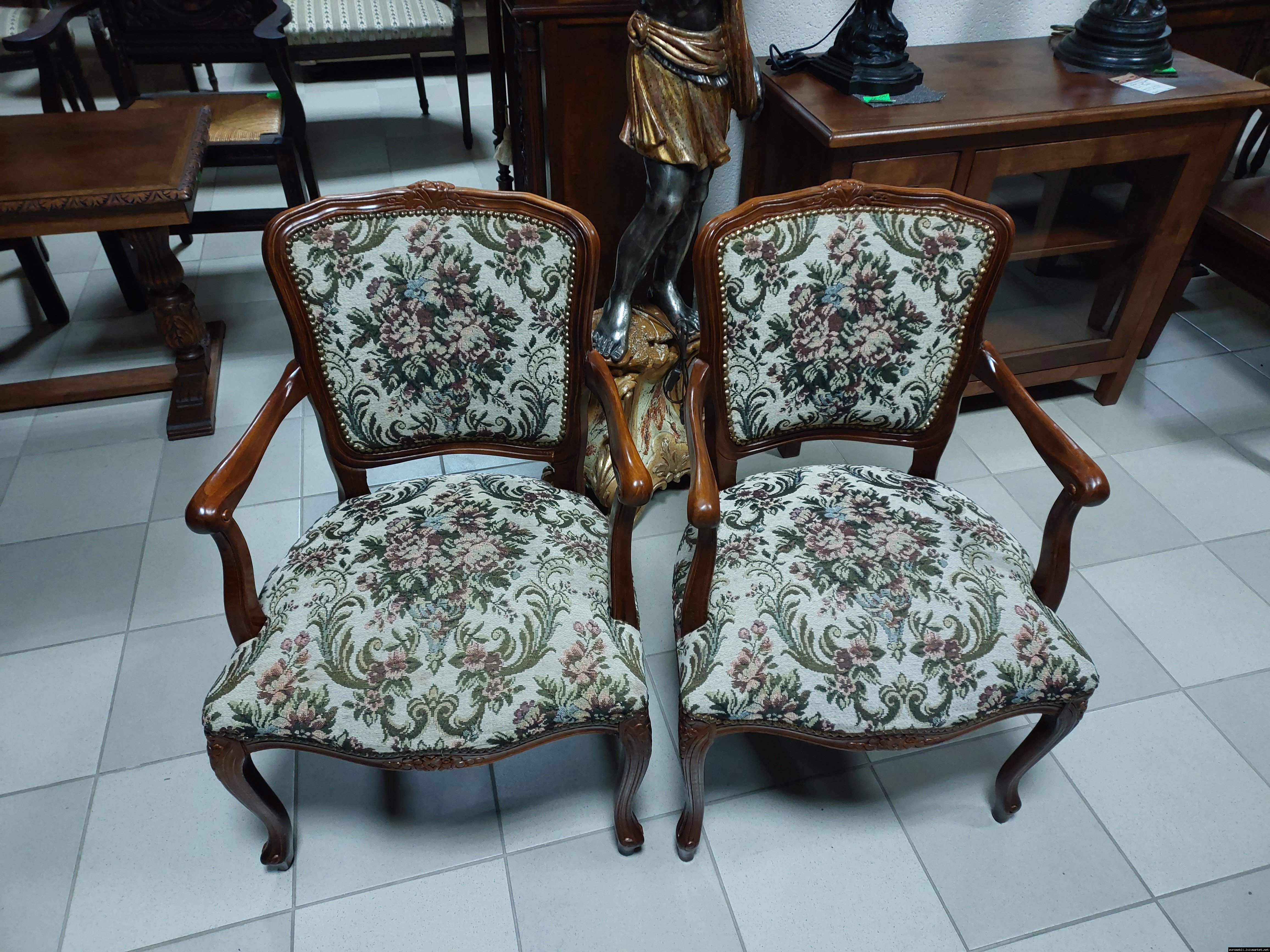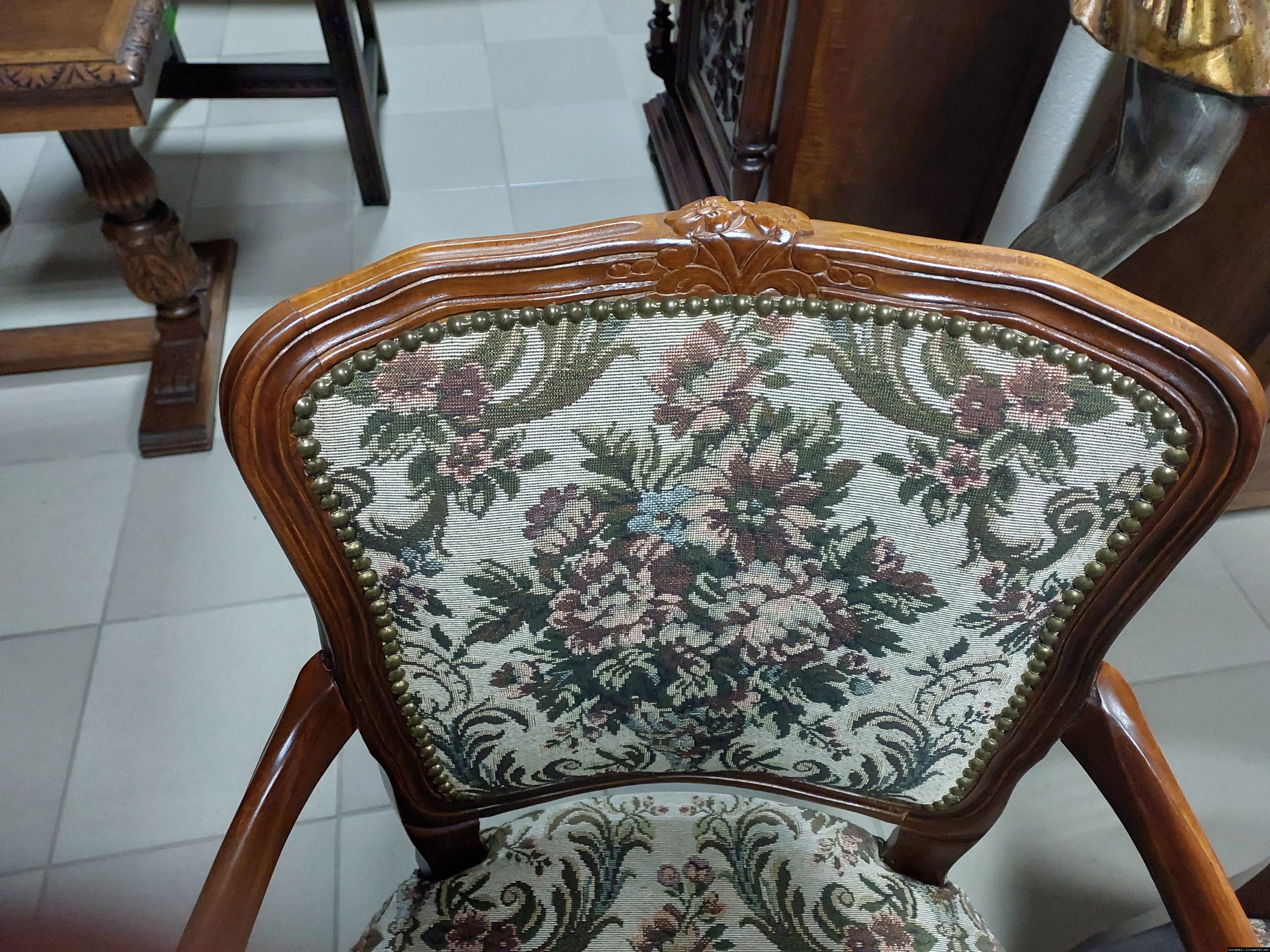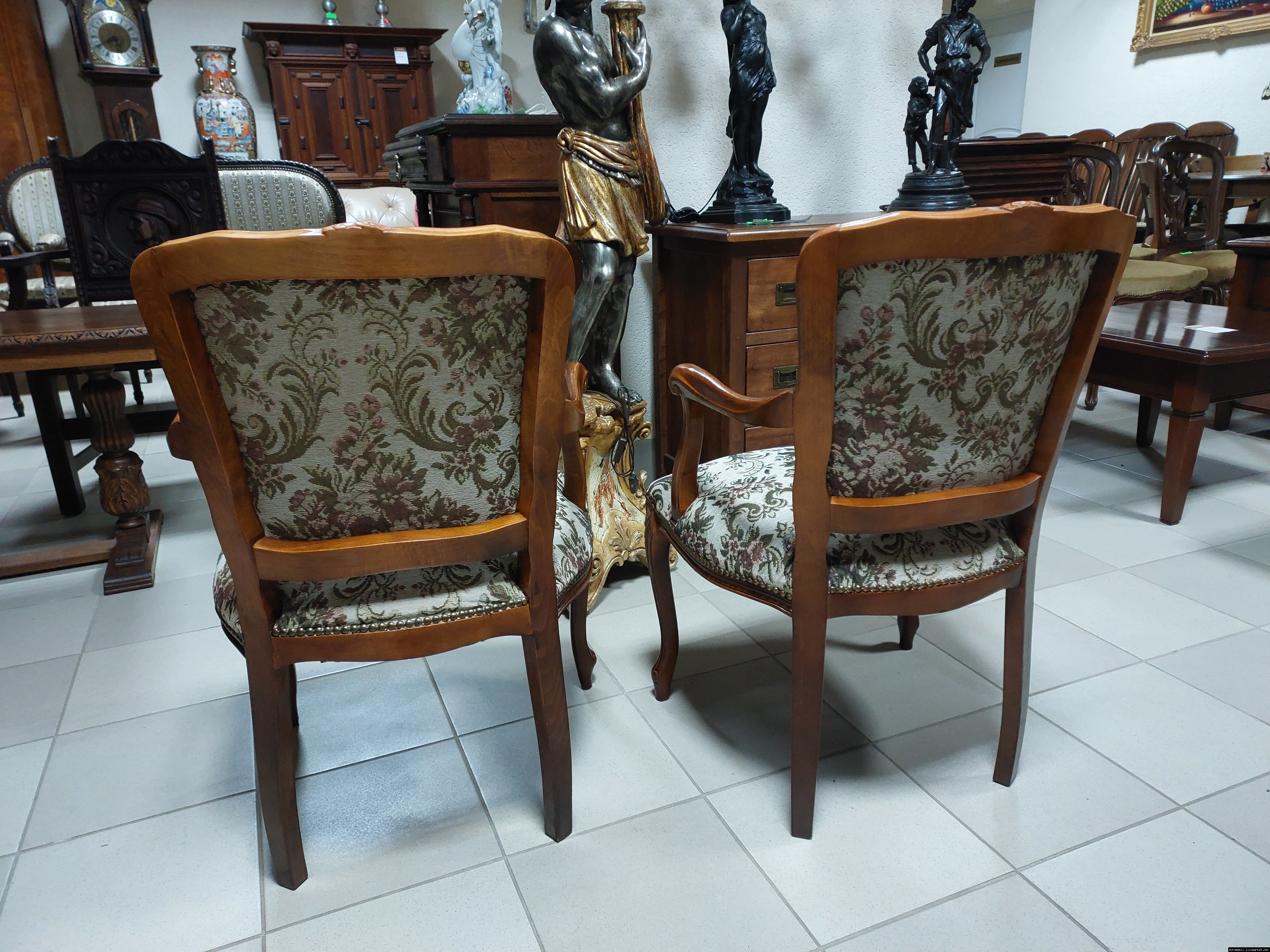 Пара красивих крісел з підлокотниками в стилі Луї XV, в комплекті дві штуки. Крісла виготовлені з натурального дерева, темно- золотистий дуб, масив, щедро декоровані елементами різьби ручної роботи, обшиті тканиною, тканина оздоблена вишивкою ручної роботи та декоративними цвяшками. Крісла зручні та комфортні, в хорошому стані, привезені з Бельгії.