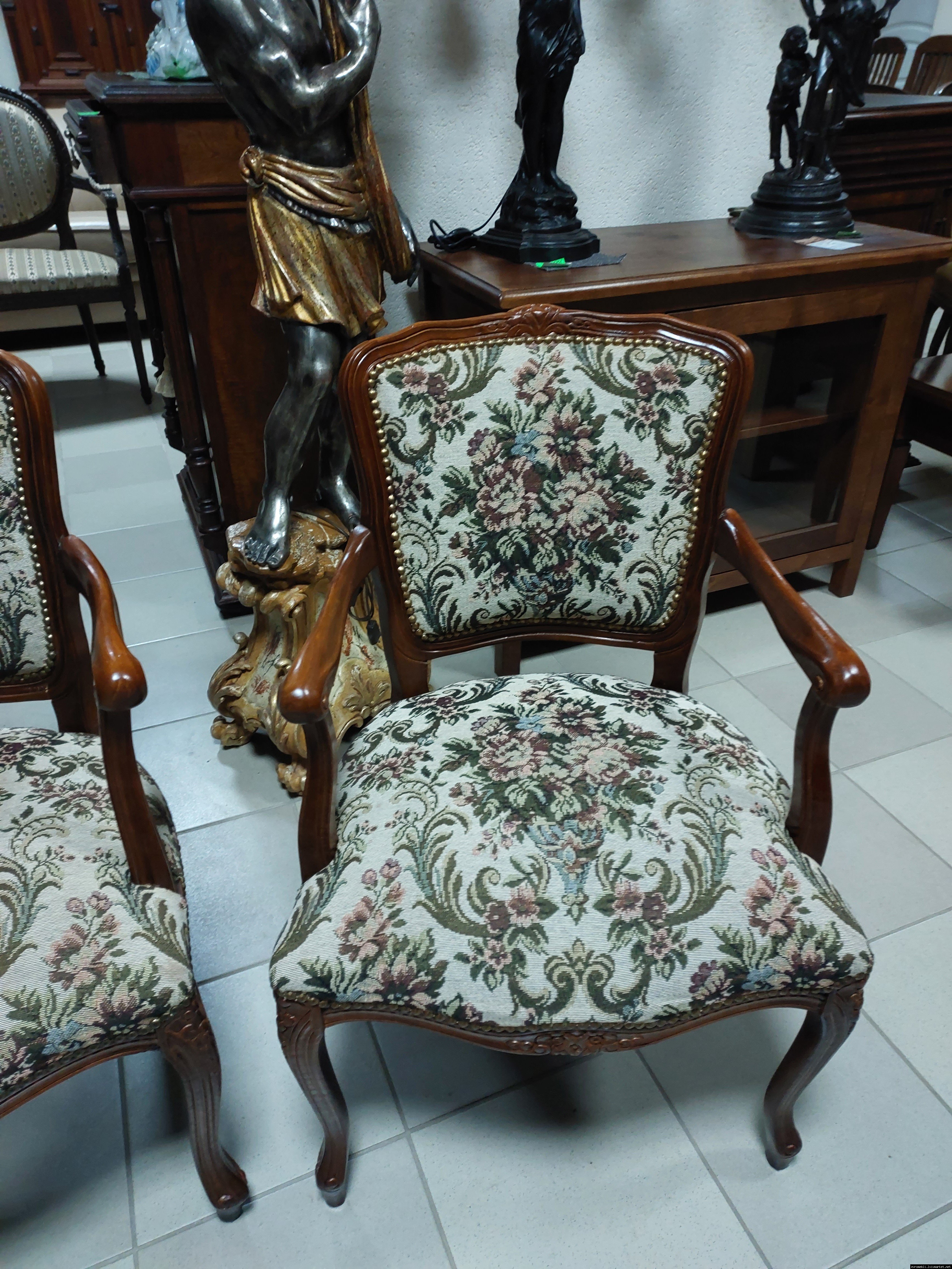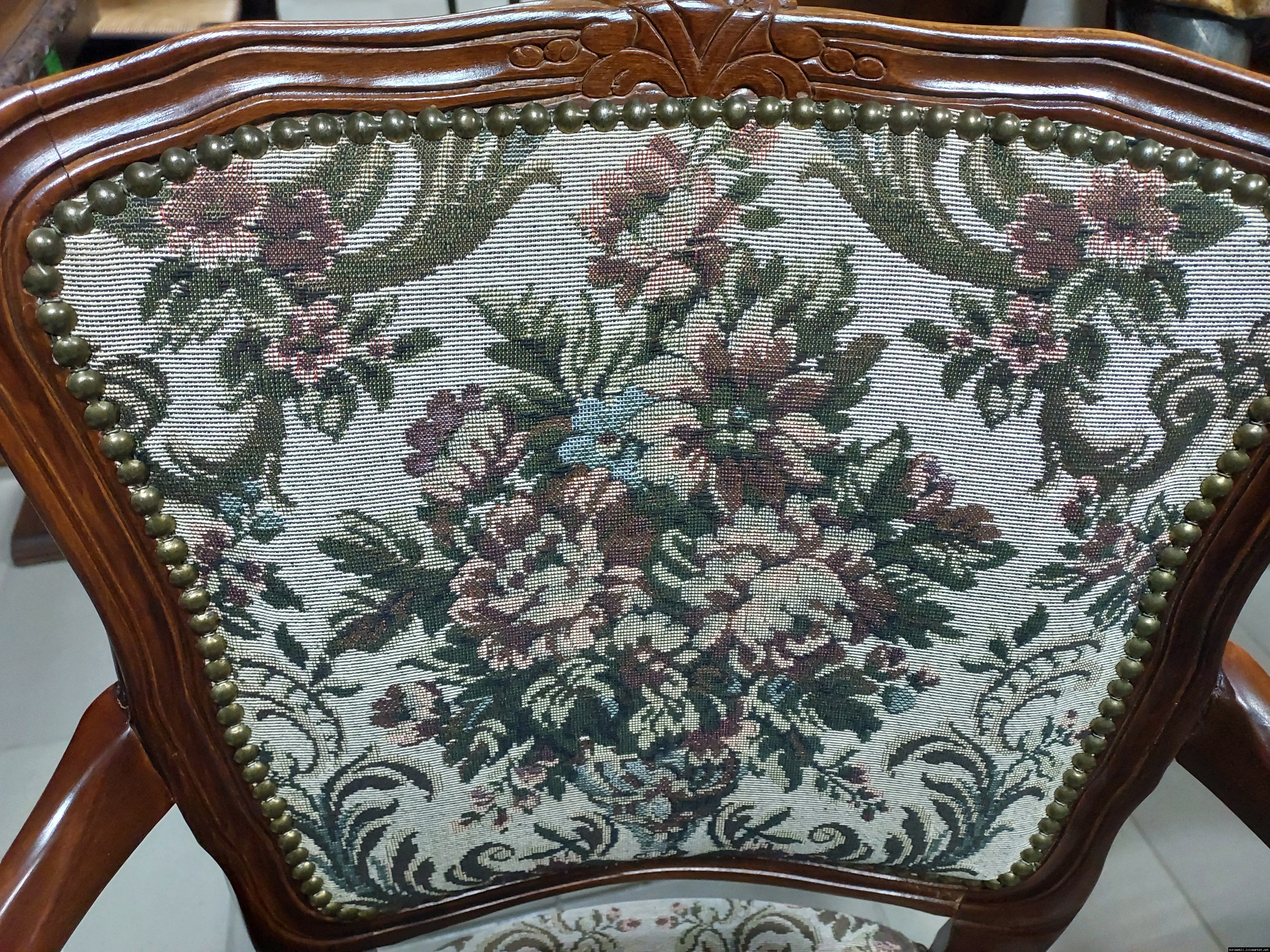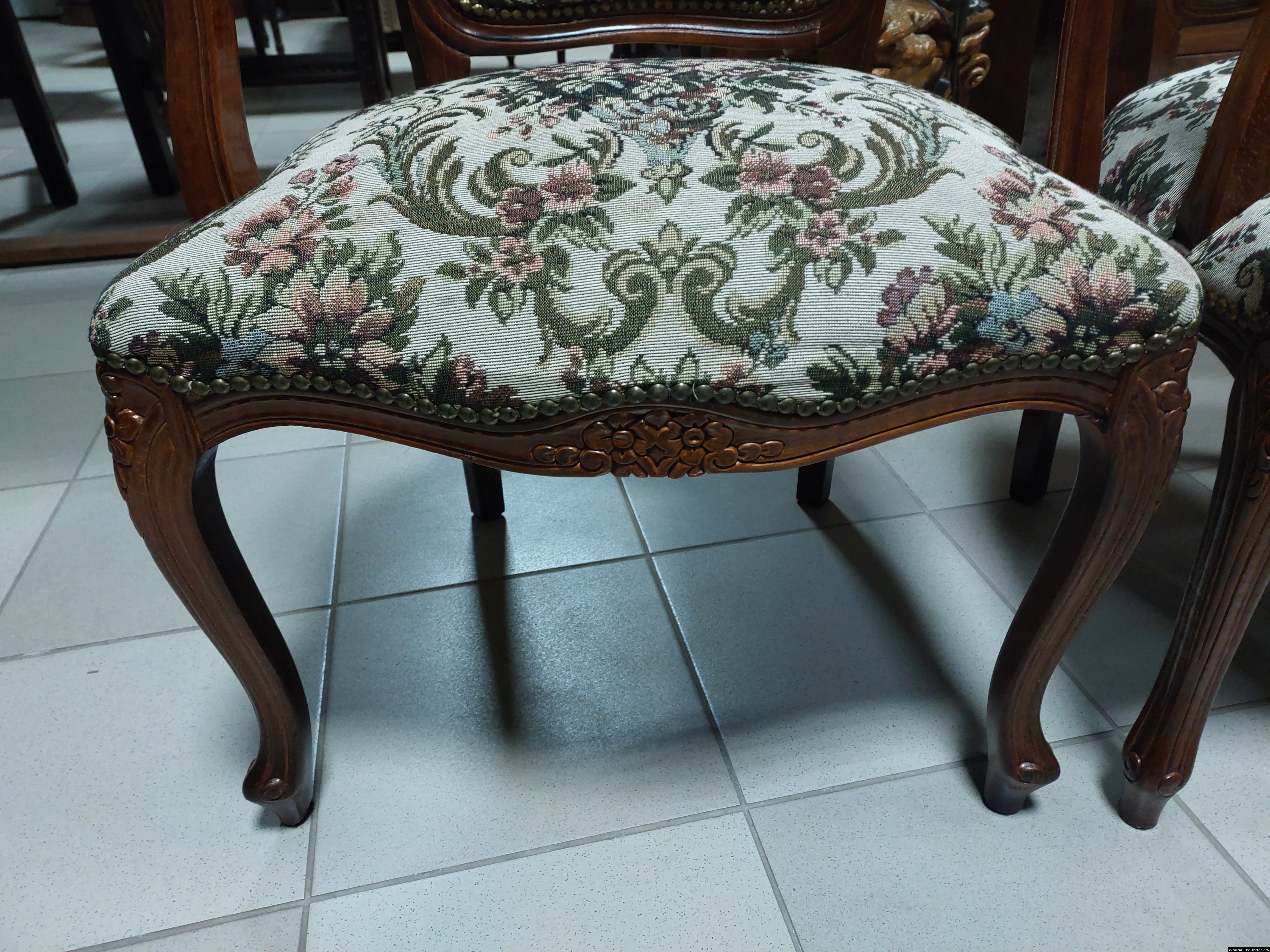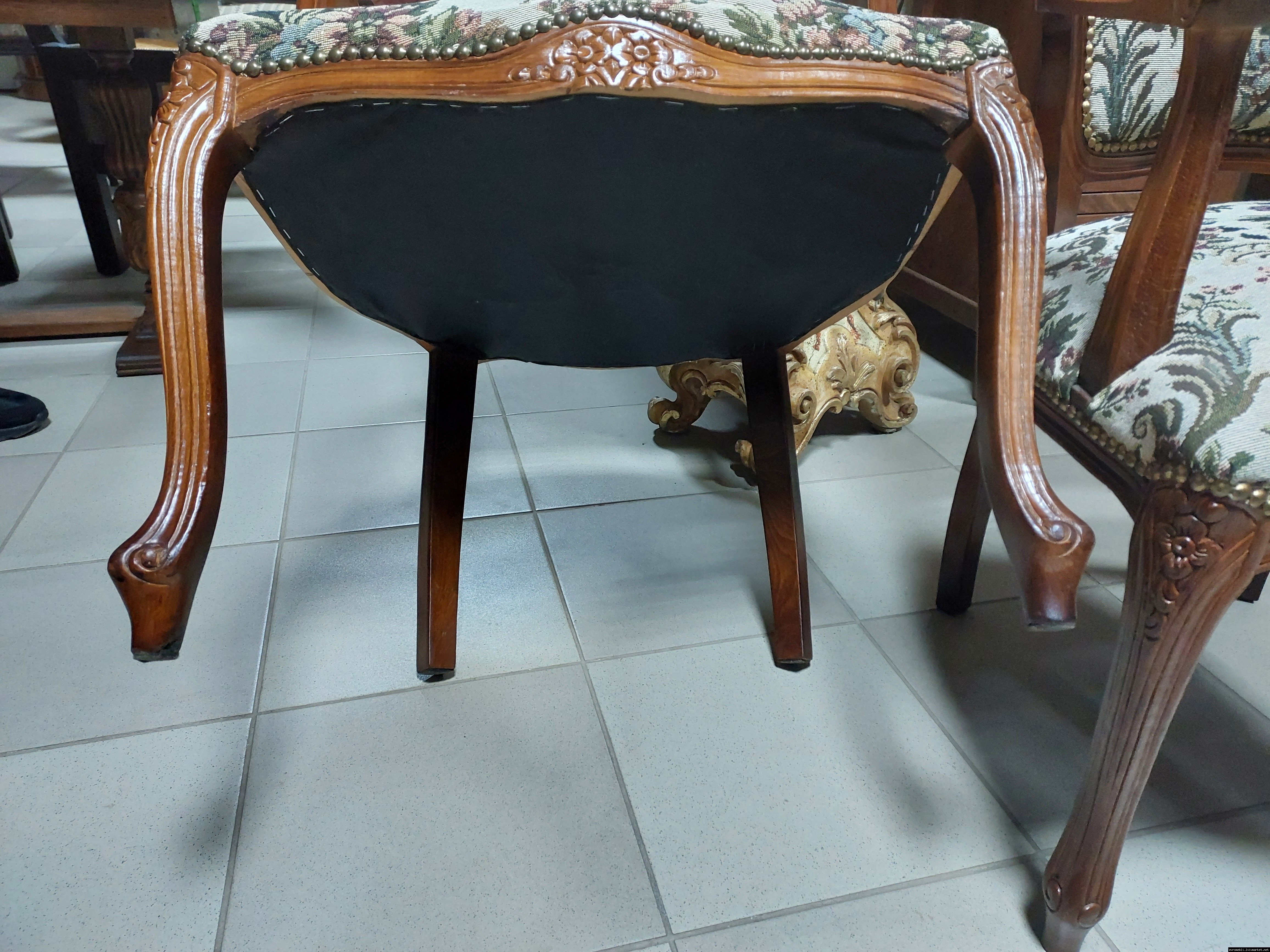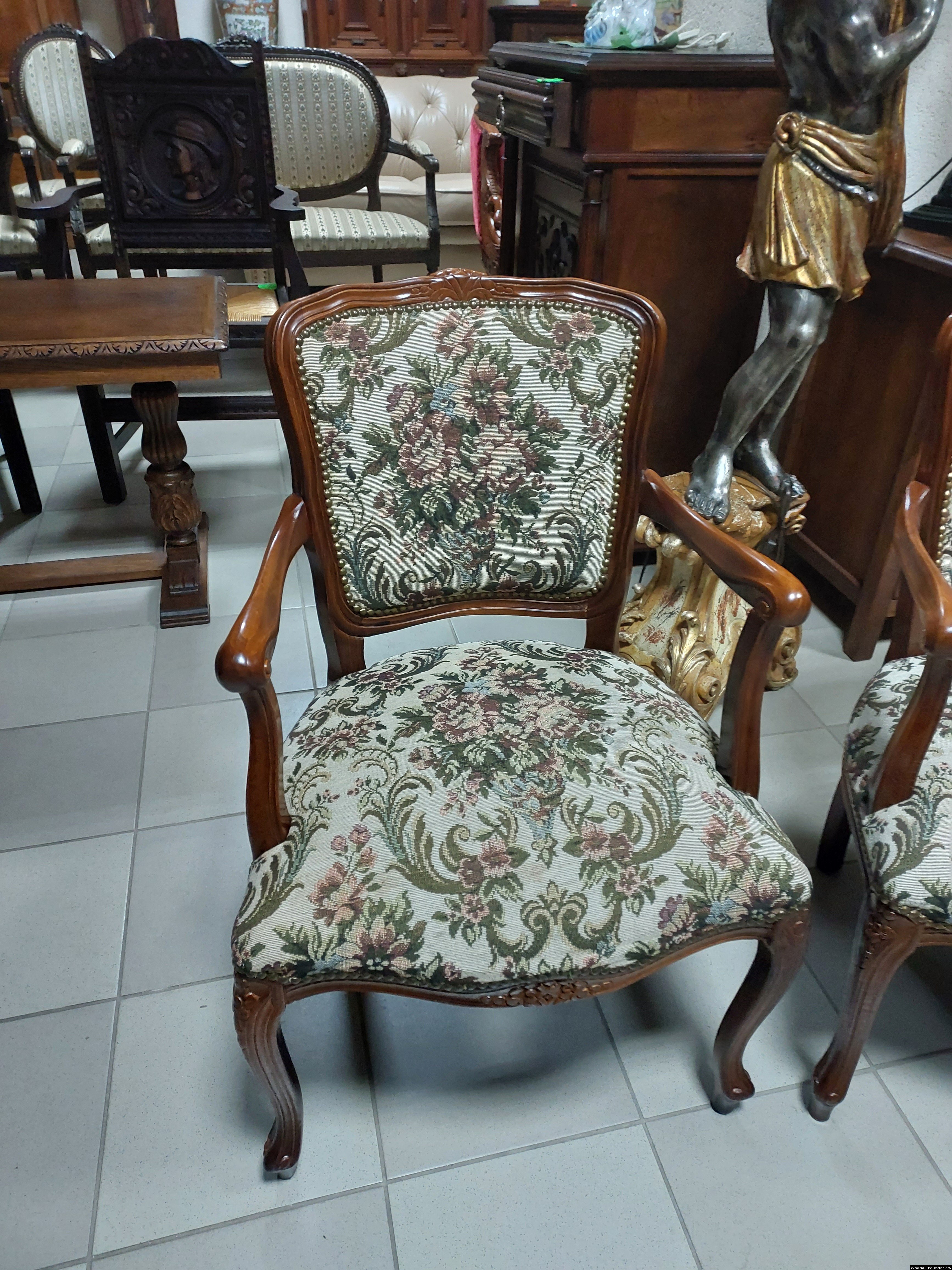 Пара красивих крісел з підлокотниками в стилі Луї XV, в комплекті дві штуки. Крісла виготовлені з натурального дерева, темно- золотистий дуб, масив, щедро декоровані елементами різьби ручної роботи, обшиті тканиною, тканина оздоблена вишивкою ручної роботи та декоративними цвяшками. Крісла зручні та комфортні, в хорошому стані, привезені з Бельгії.