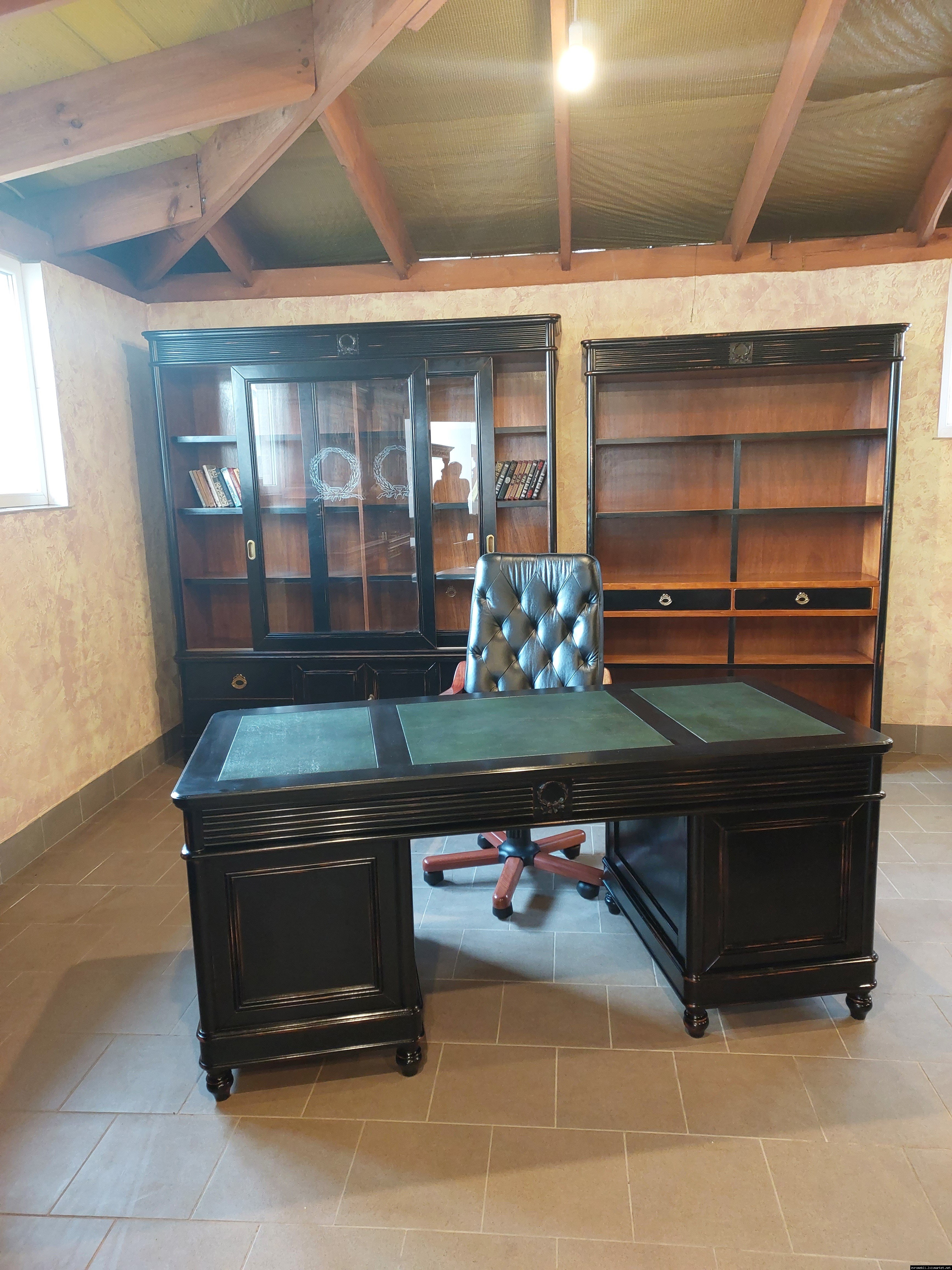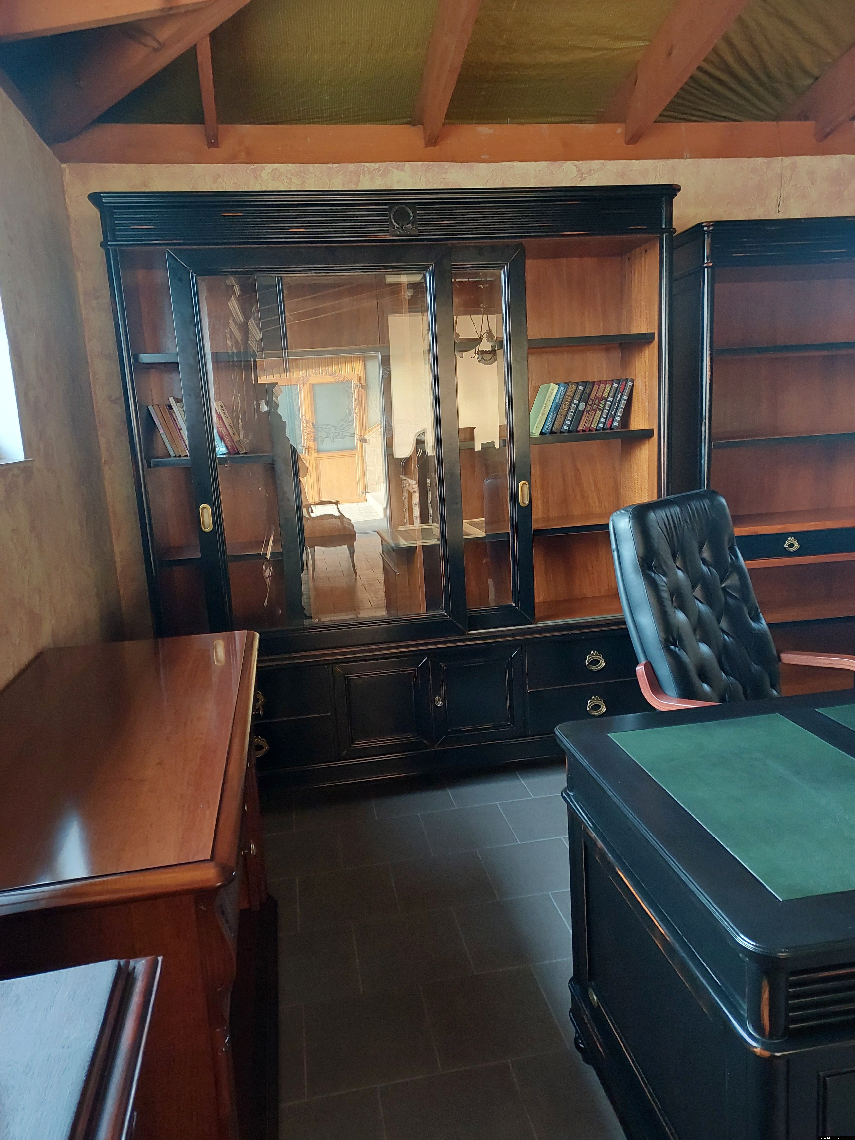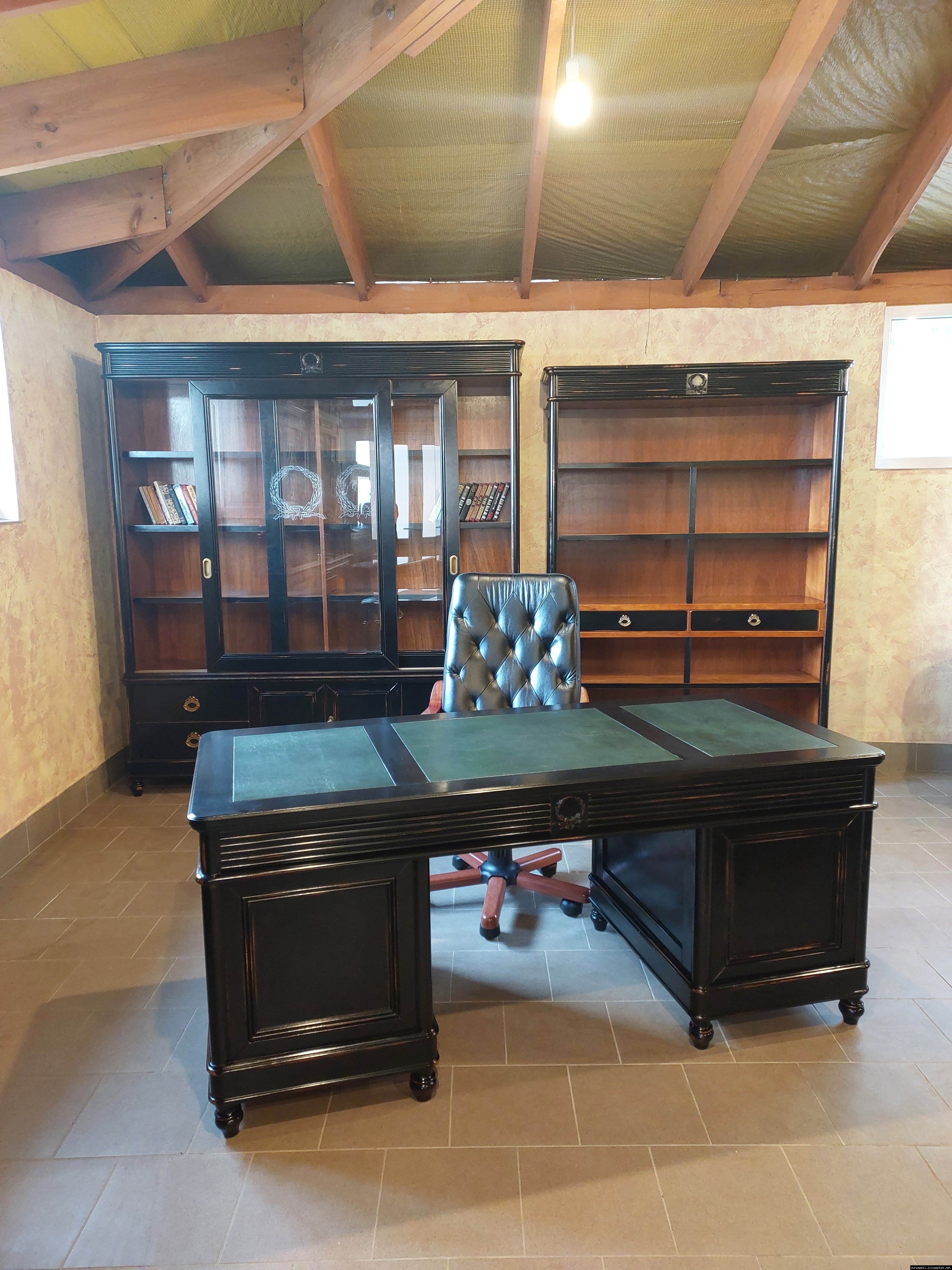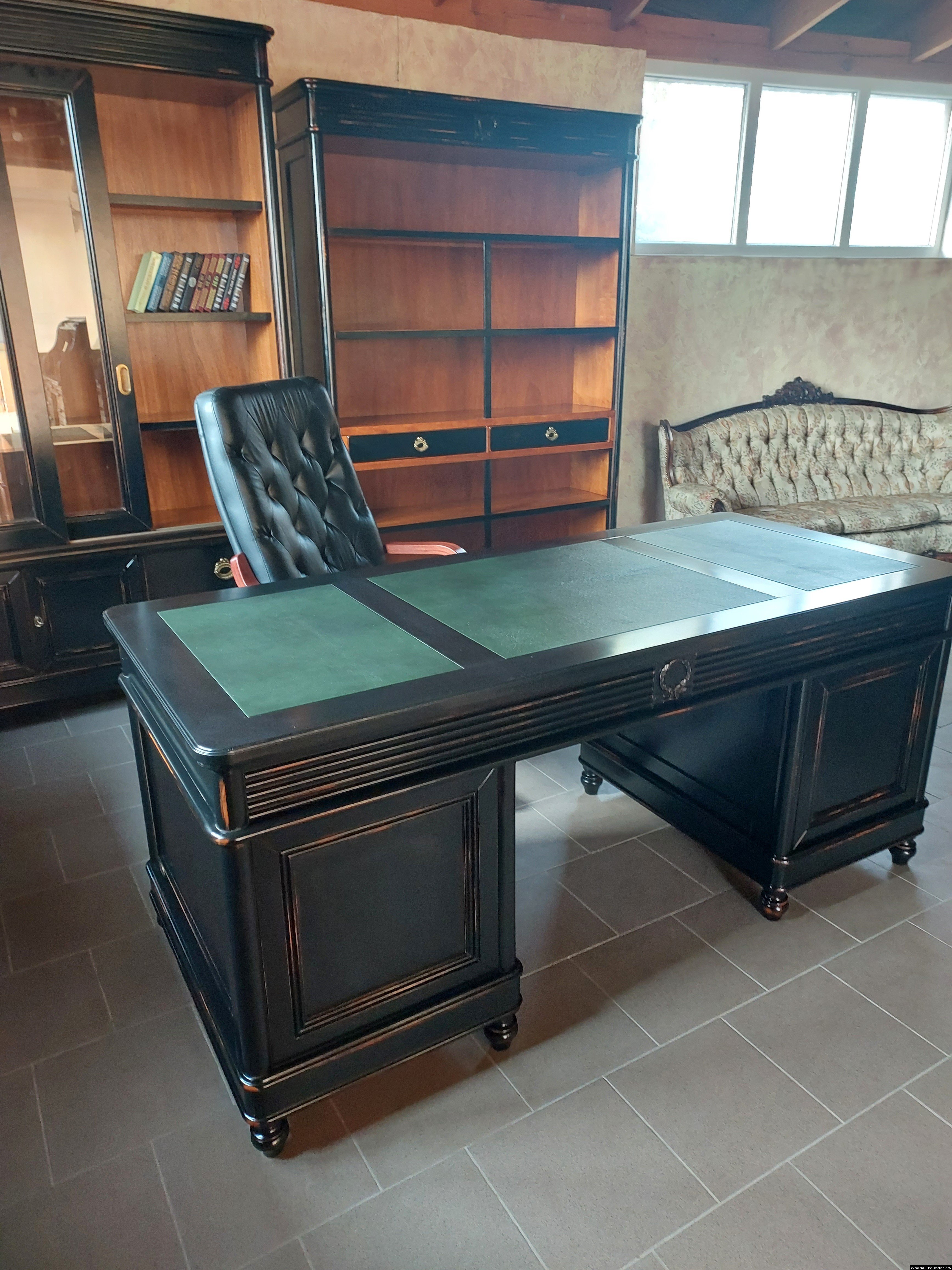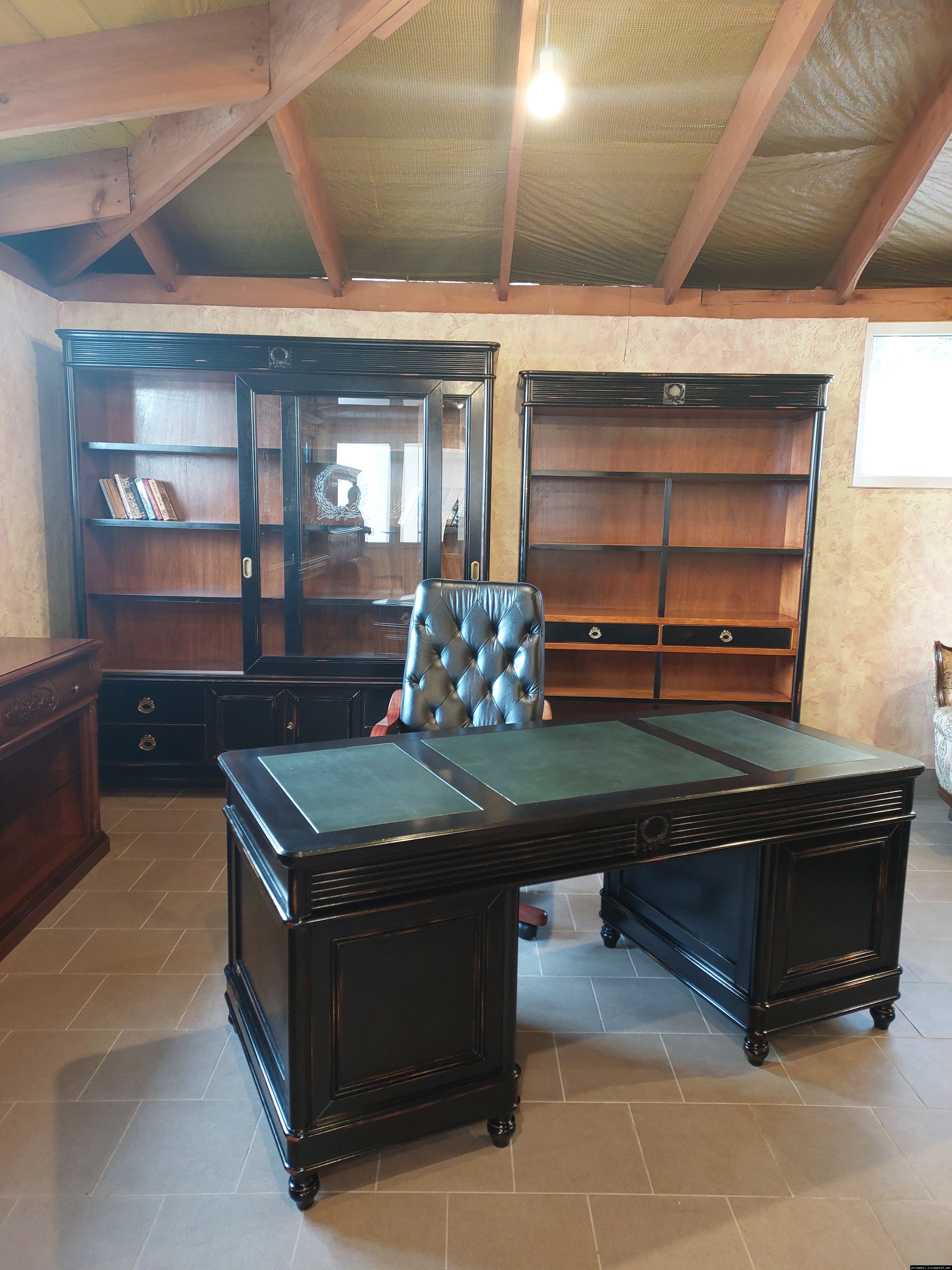 Комплект меблів для кабінету від фабрики Monte Cristo Mobili (Румунія) - розкішне рішення з гармонійними формами та вишуканим оздобленням для Вашого робочого кабінету. До комплекту входить: стіл письмовий, крісло, книжкова шафа та етажерка. Комплект виготовлений з масиву та шпону липи, що є запорукою відмінної якості та тривалого терміну служби. Аристократичність меблів підкреслюють фігурні карнизи, декоративне скло, металеві вставки та фасади декоровані емблемою компанії.