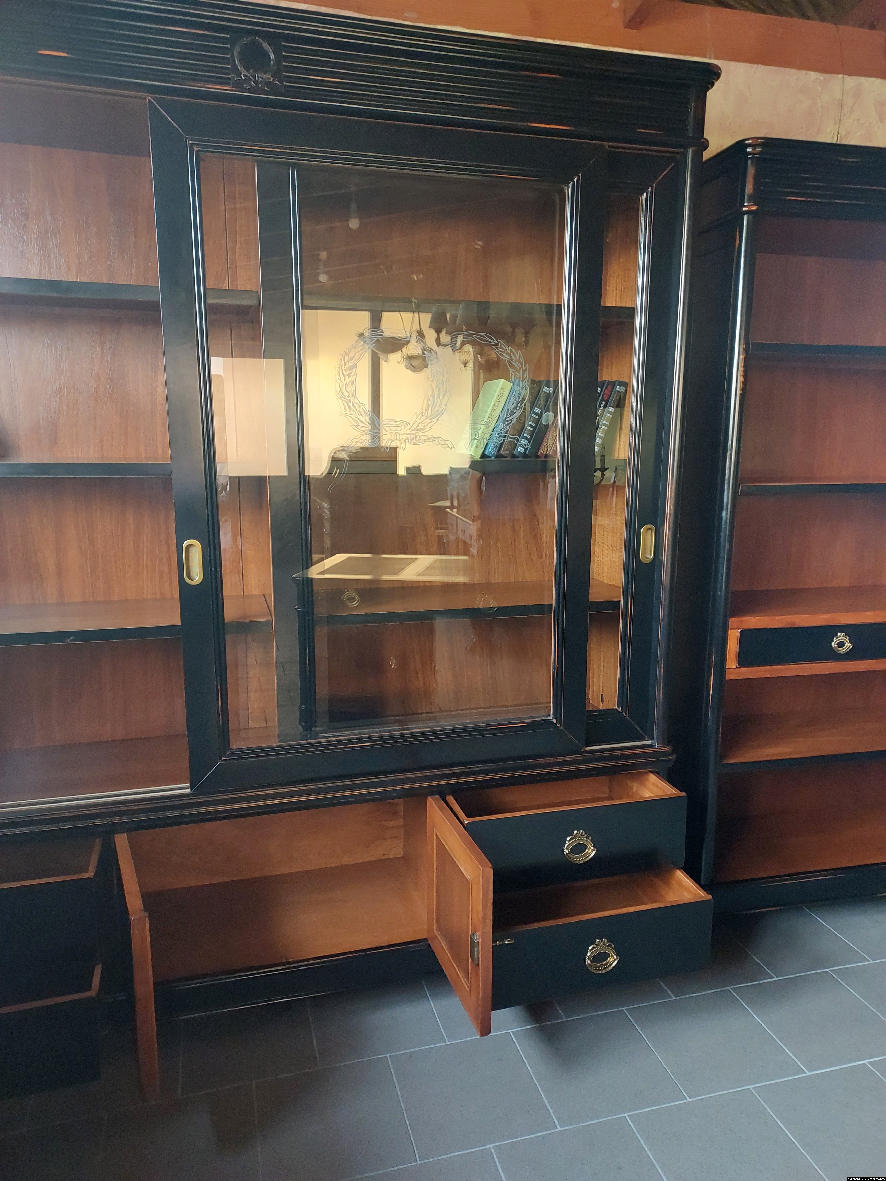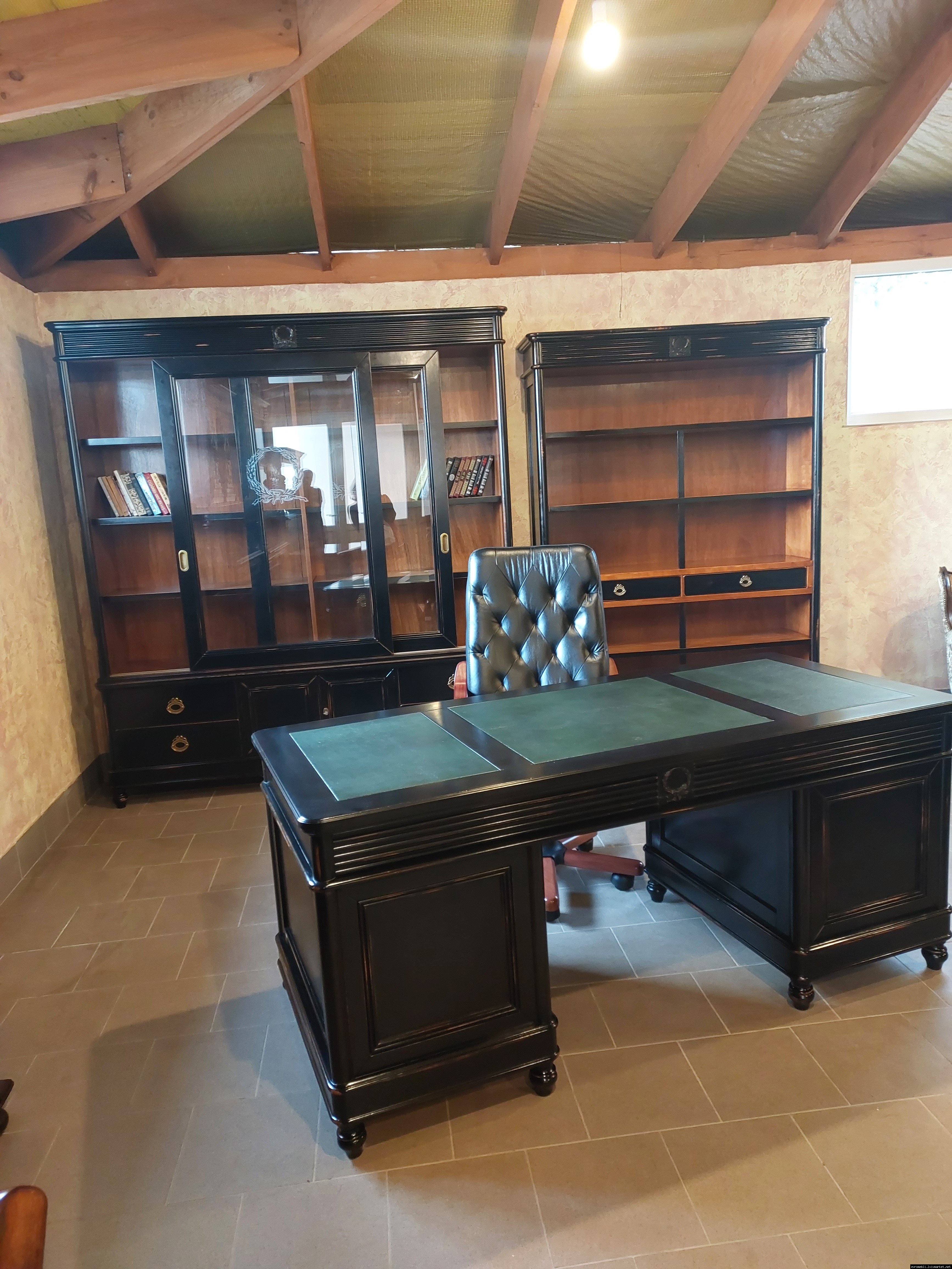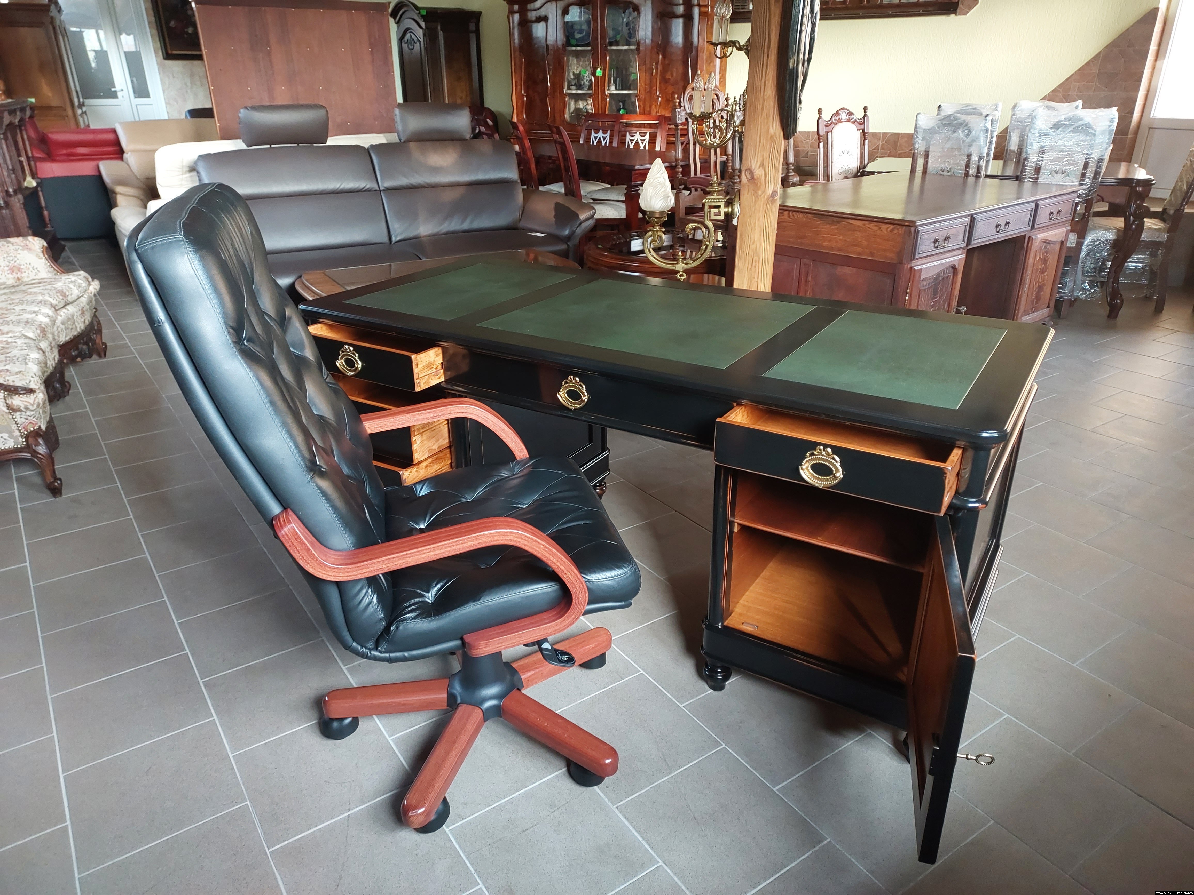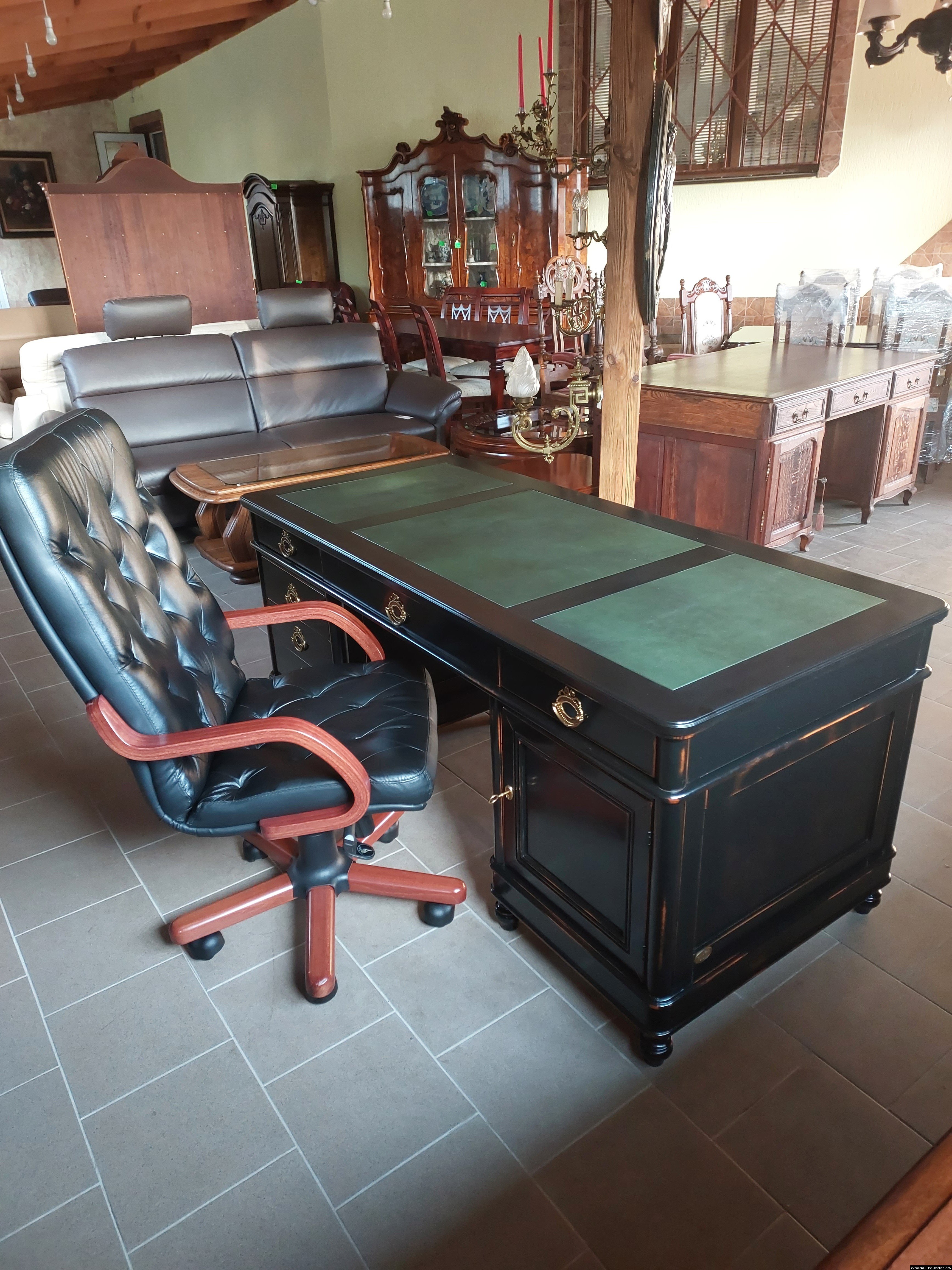 Комплект меблів для кабінету від фабрики Monte Cristo Mobili (Румунія) - розкішне рішення з гармонійними формами та вишуканим оздобленням для Вашого робочого кабінету. До комплекту входить: стіл письмовий, крісло, книжкова шафа та етажерка. Комплект виготовлений з масиву та шпону липи, що є запорукою відмінної якості та тривалого терміну служби. Аристократичність меблів підкреслюють фігурні карнизи, декоративне скло, металеві вставки та фасади декоровані емблемою компанії.