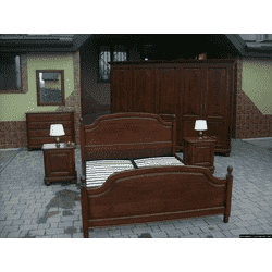 Комплект меблів для спальні в класичному стилі. До комплекту входить: шафа 5-ти дверна, комод на чотири шухляди + дзеркало, ліжко з ламелями, дві приліжкові тумбочки та дві настільні лампи. Усі меблі, що входять до складу комплекту виготовлені з натурального дерева, темно- червонястий дуб, масив. Комплект меблів для спальні великий і масивний, вишуканий та елегантний, в хорошому стані, країна виробник- Німеччина.