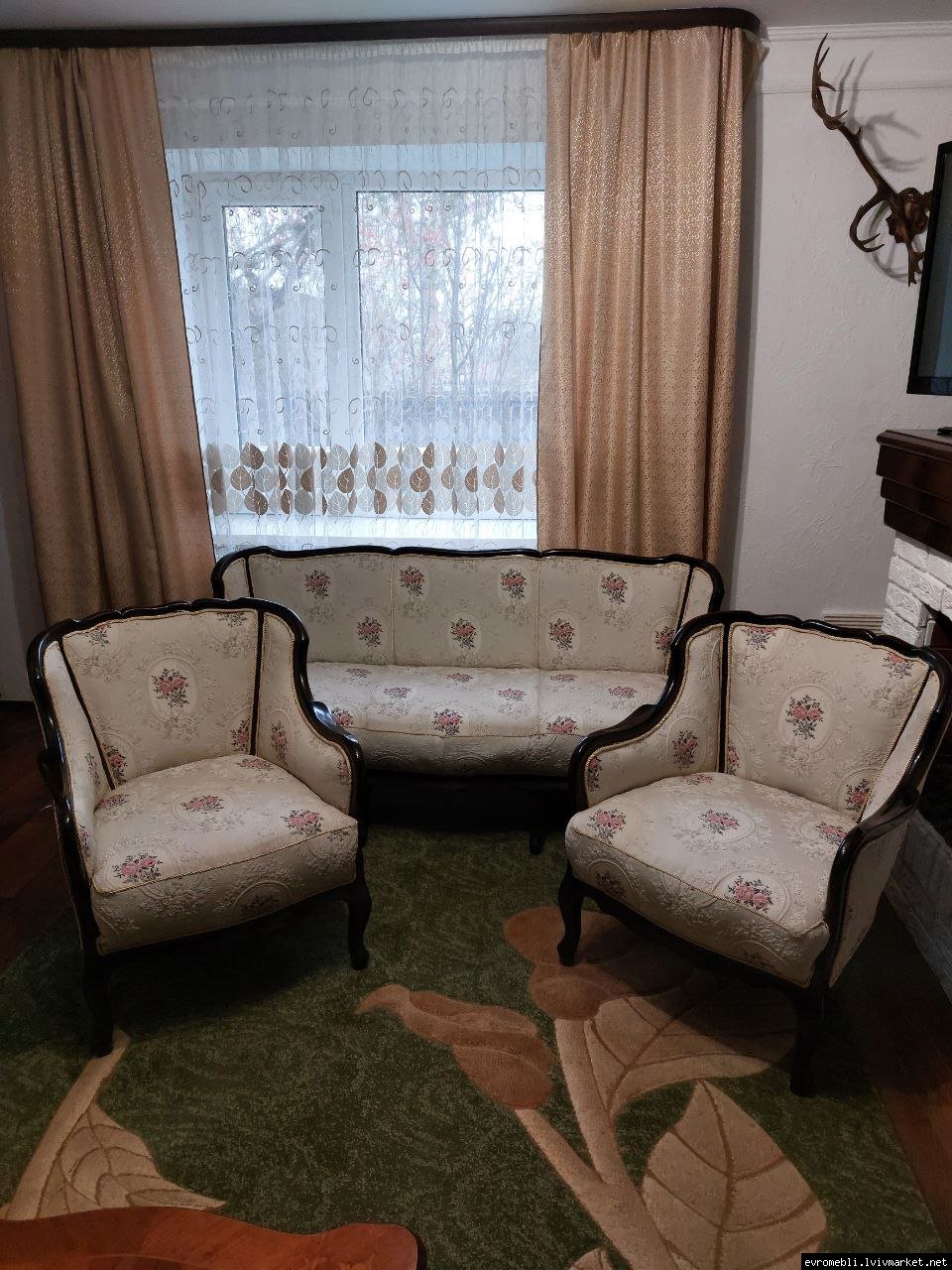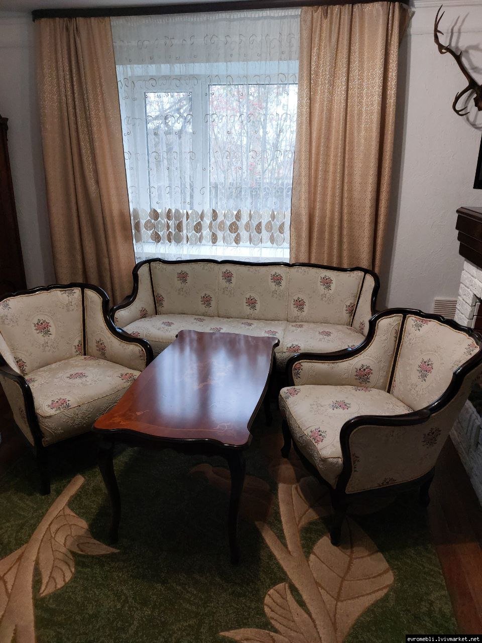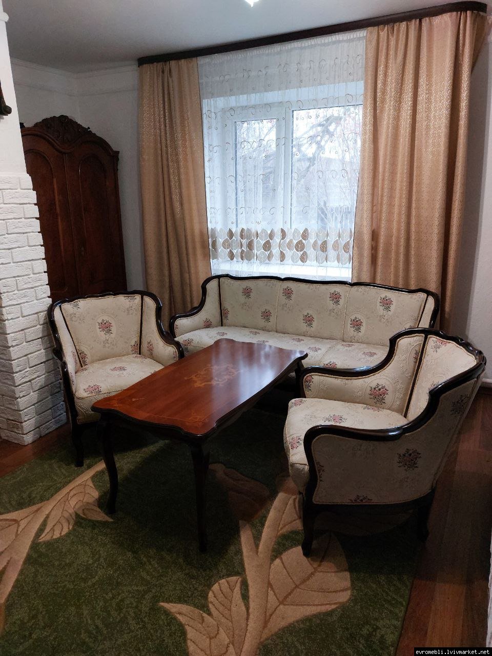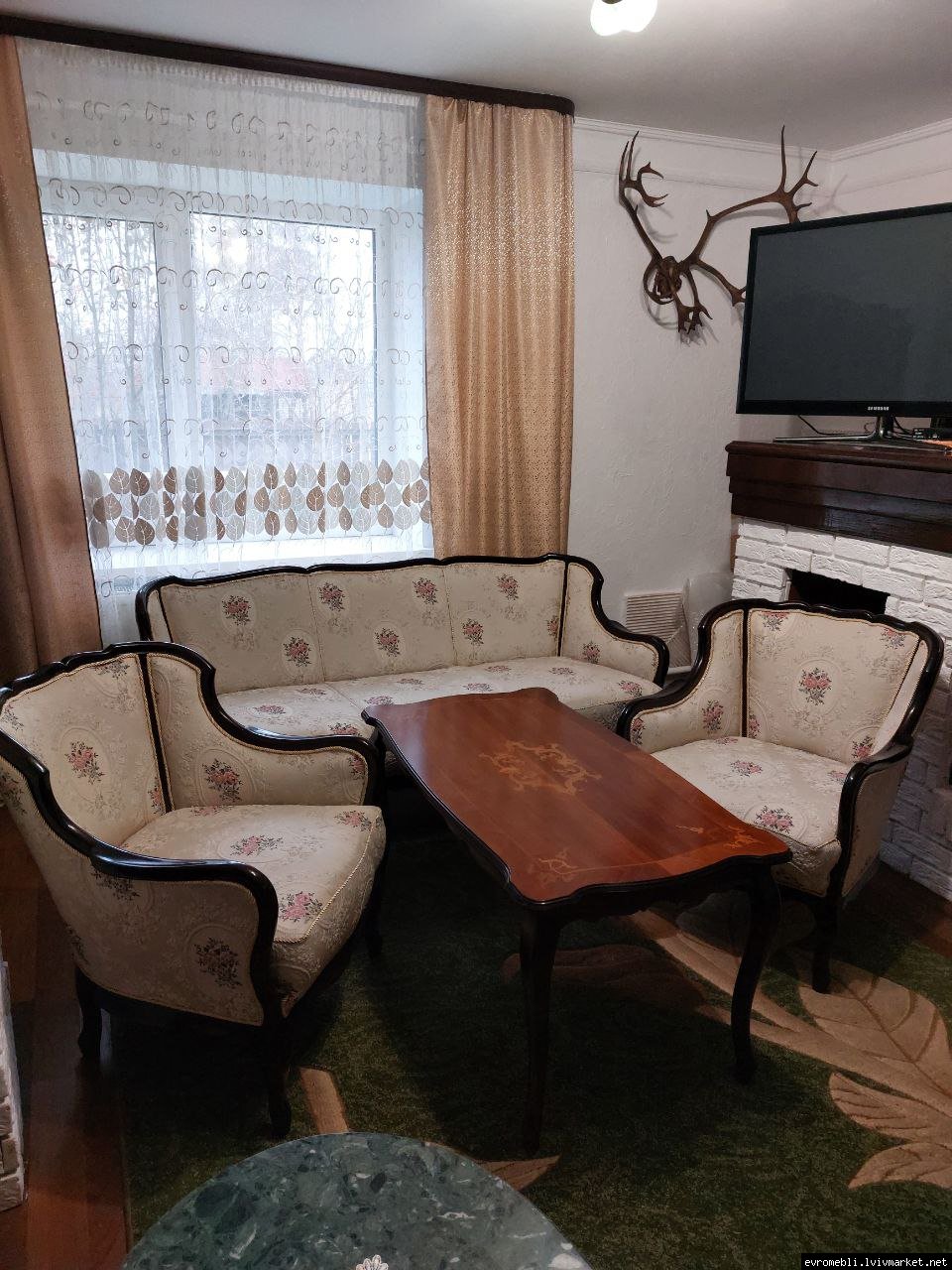 Комплект мяких меблів на деревяній основі в стилі Балатон. До комплекту входить диванчик та два крісла з підлокотниками і журнальний столик. Комплект виготовлений з натурального дерева, перетягнутий тканиною.