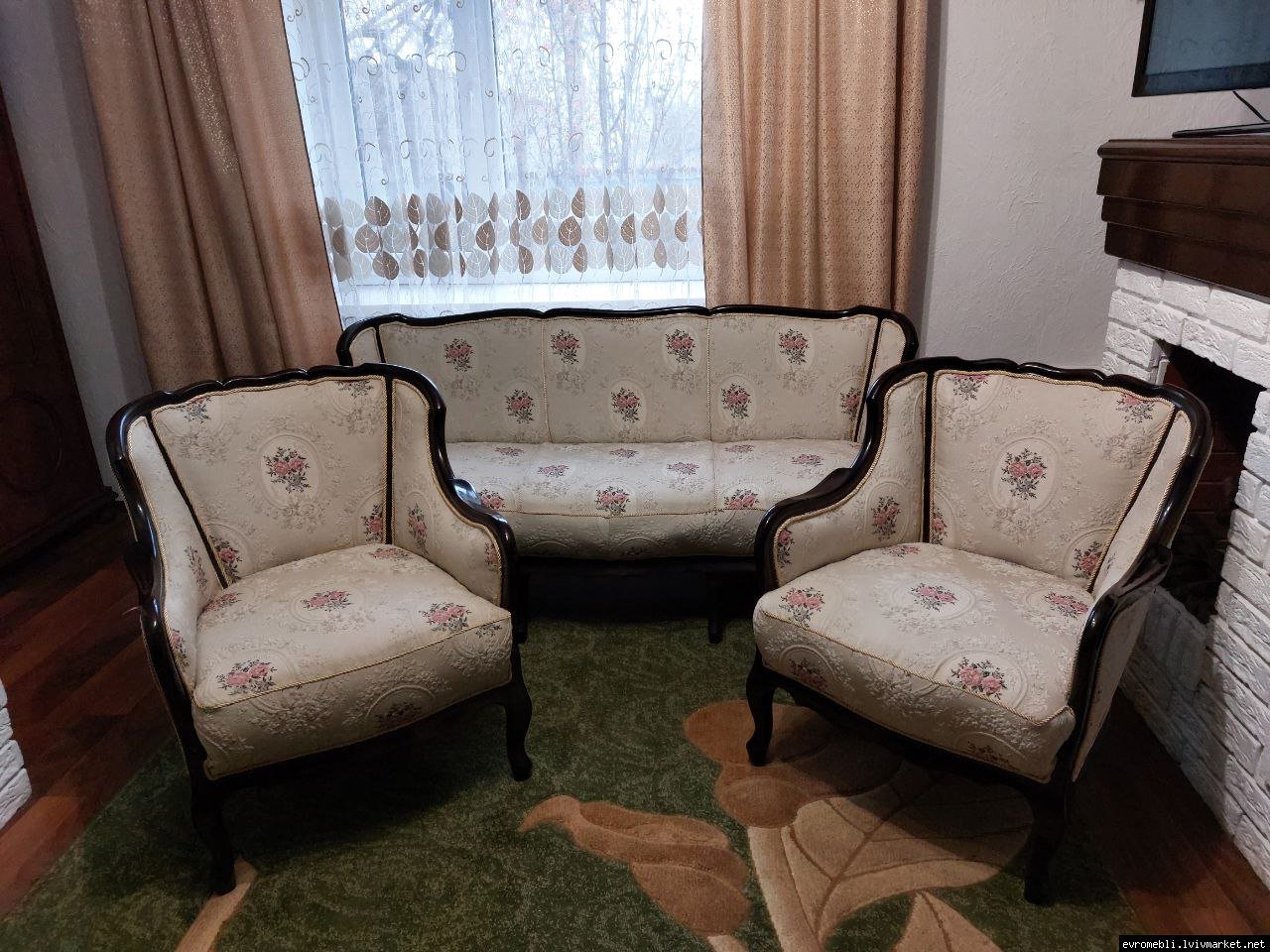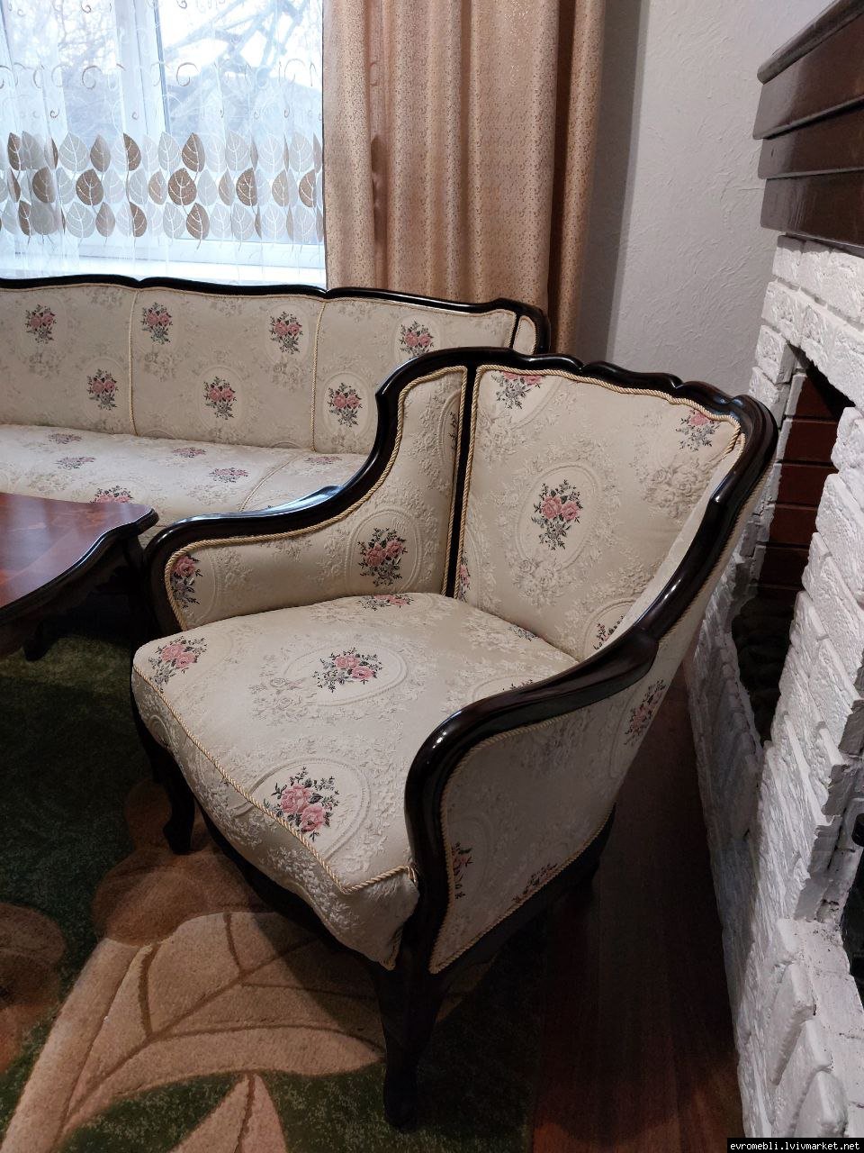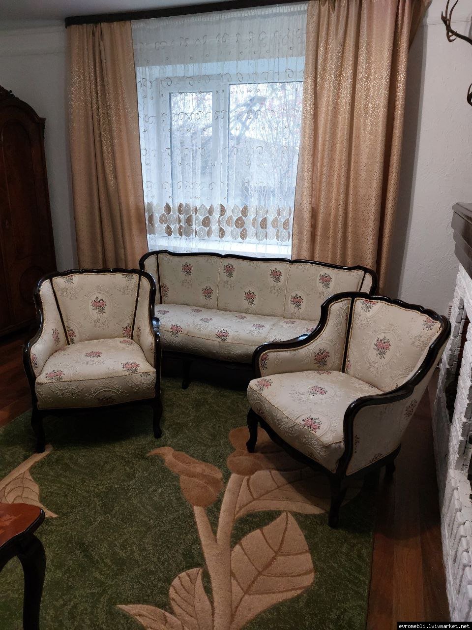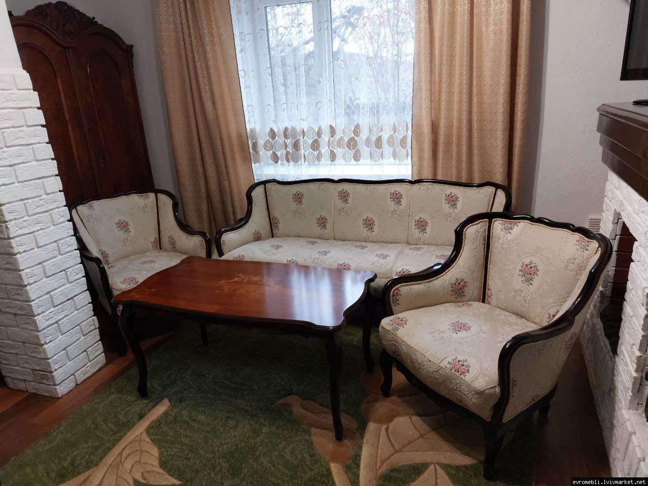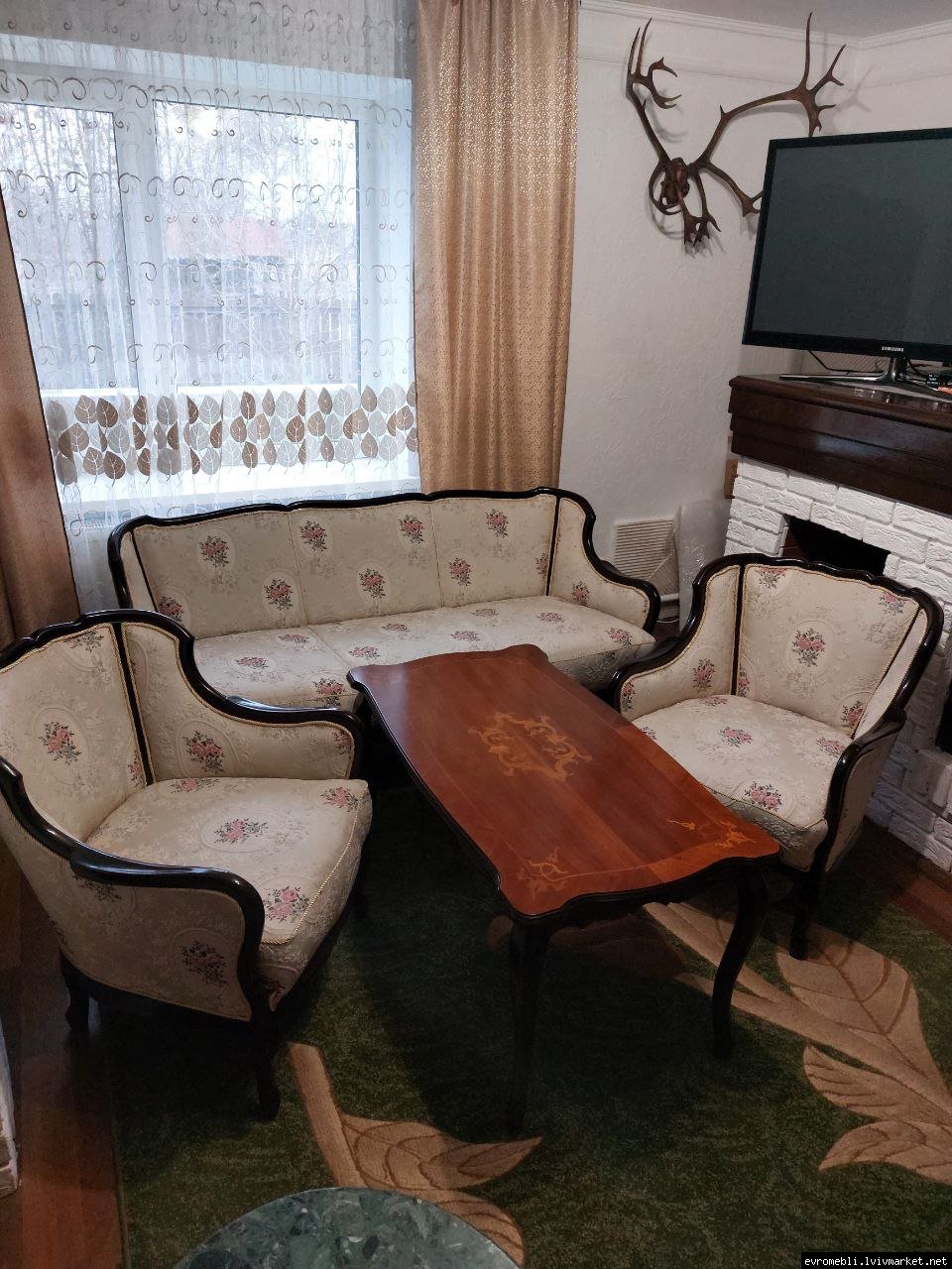 Комплект мяких меблів на деревяній основі в стилі Балатон. До комплекту входить диванчик та два крісла з підлокотниками і журнальний столик. Комплект виготовлений з натурального дерева, перетягнутий тканиною.