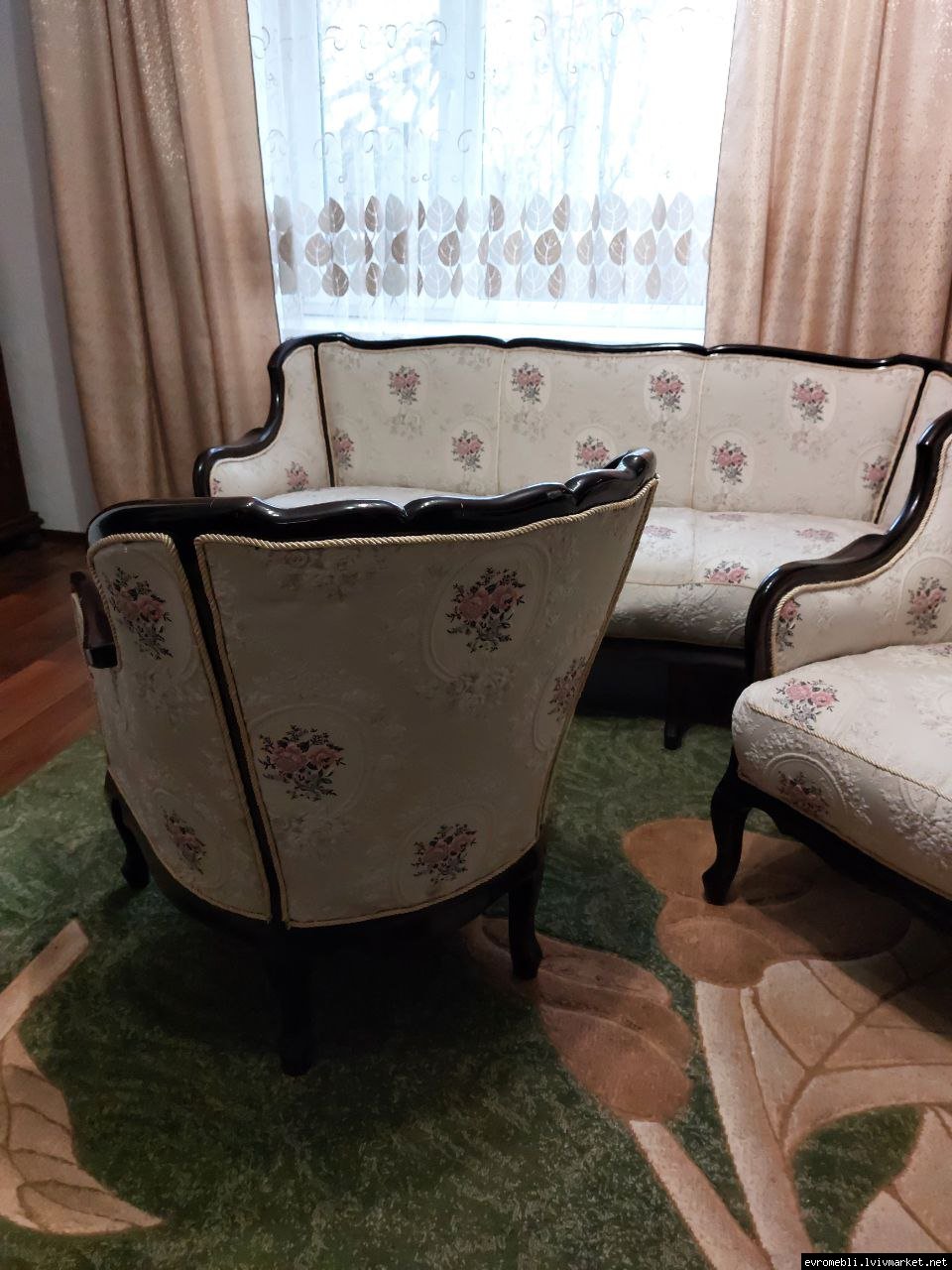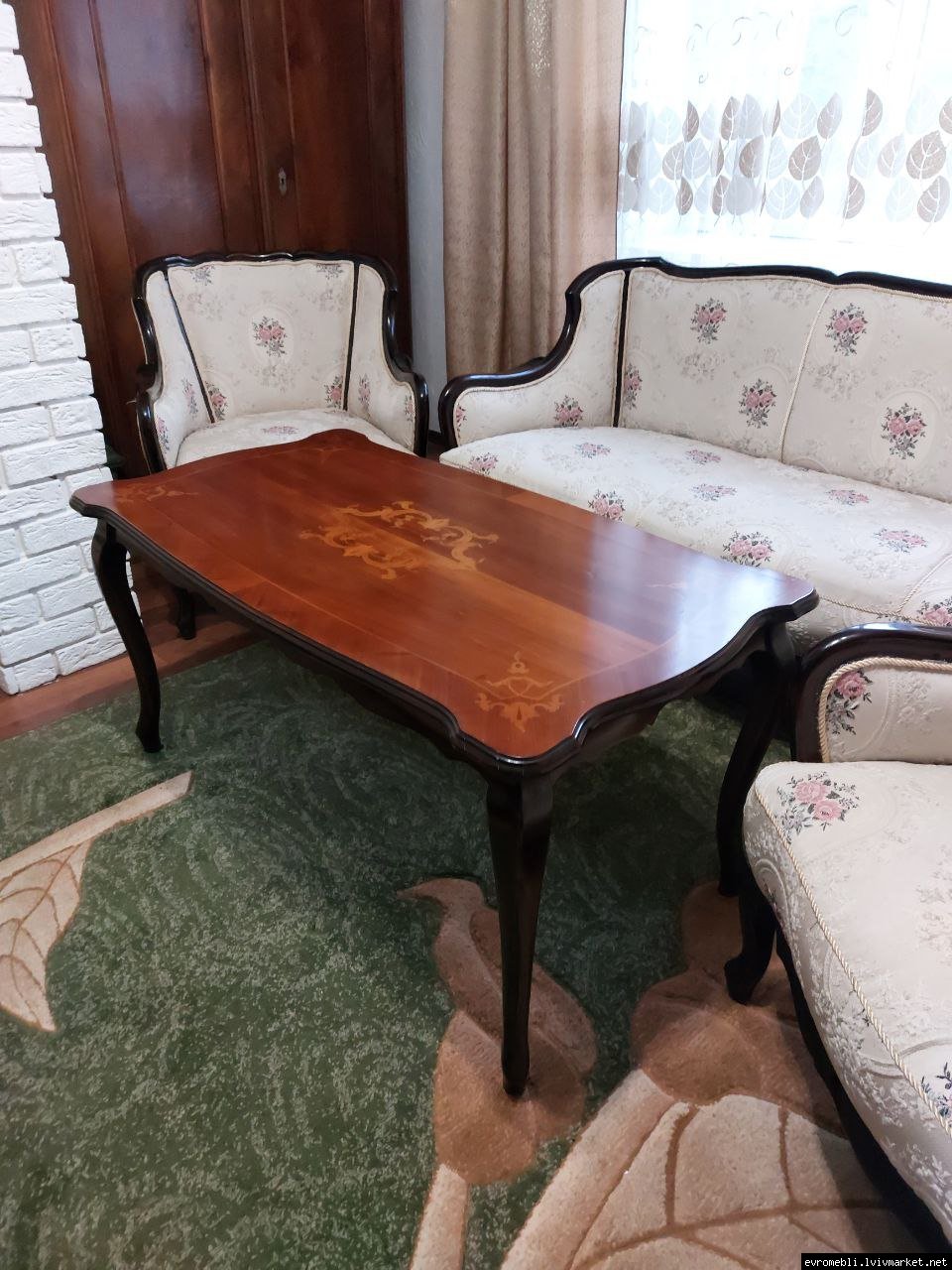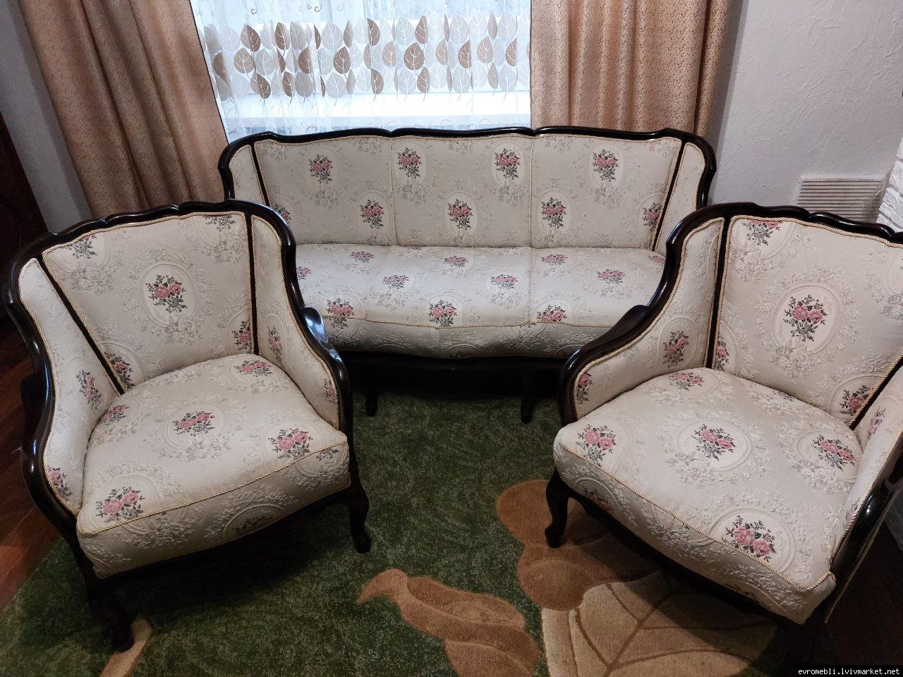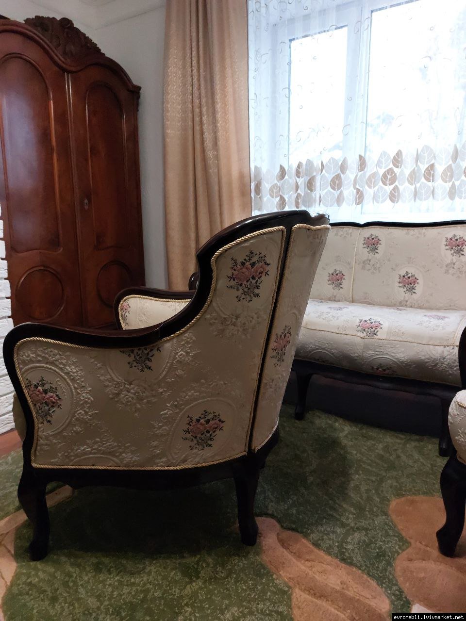 Комплект мяких меблів на деревяній основі в стилі Балатон. До комплекту входить диванчик та два крісла з підлокотниками і журнальний столик. Комплект виготовлений з натурального дерева, перетягнутий тканиною.